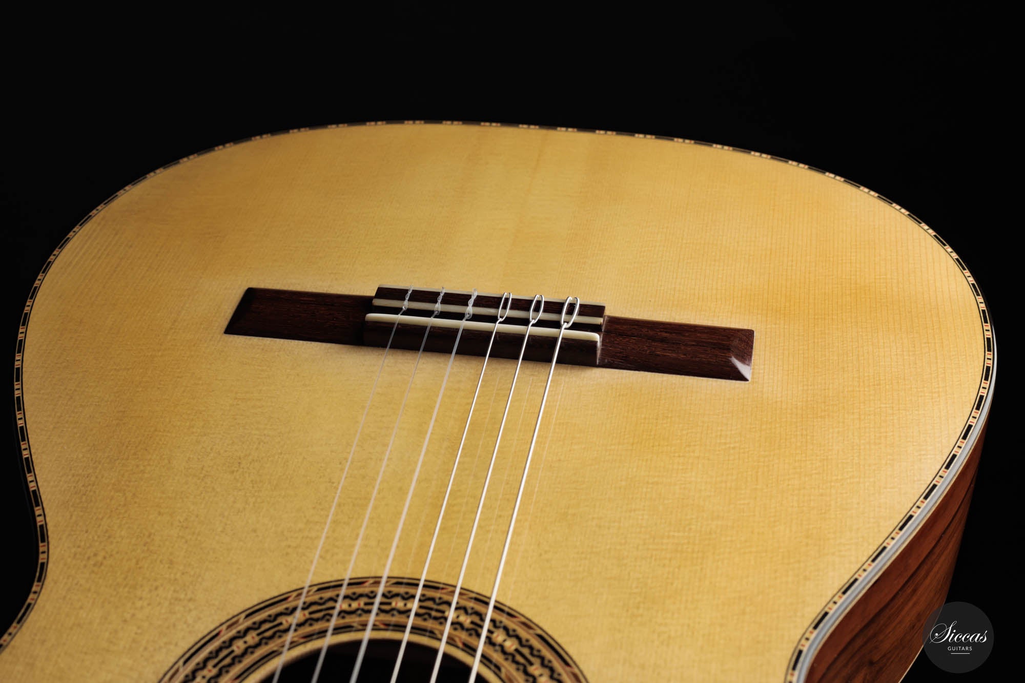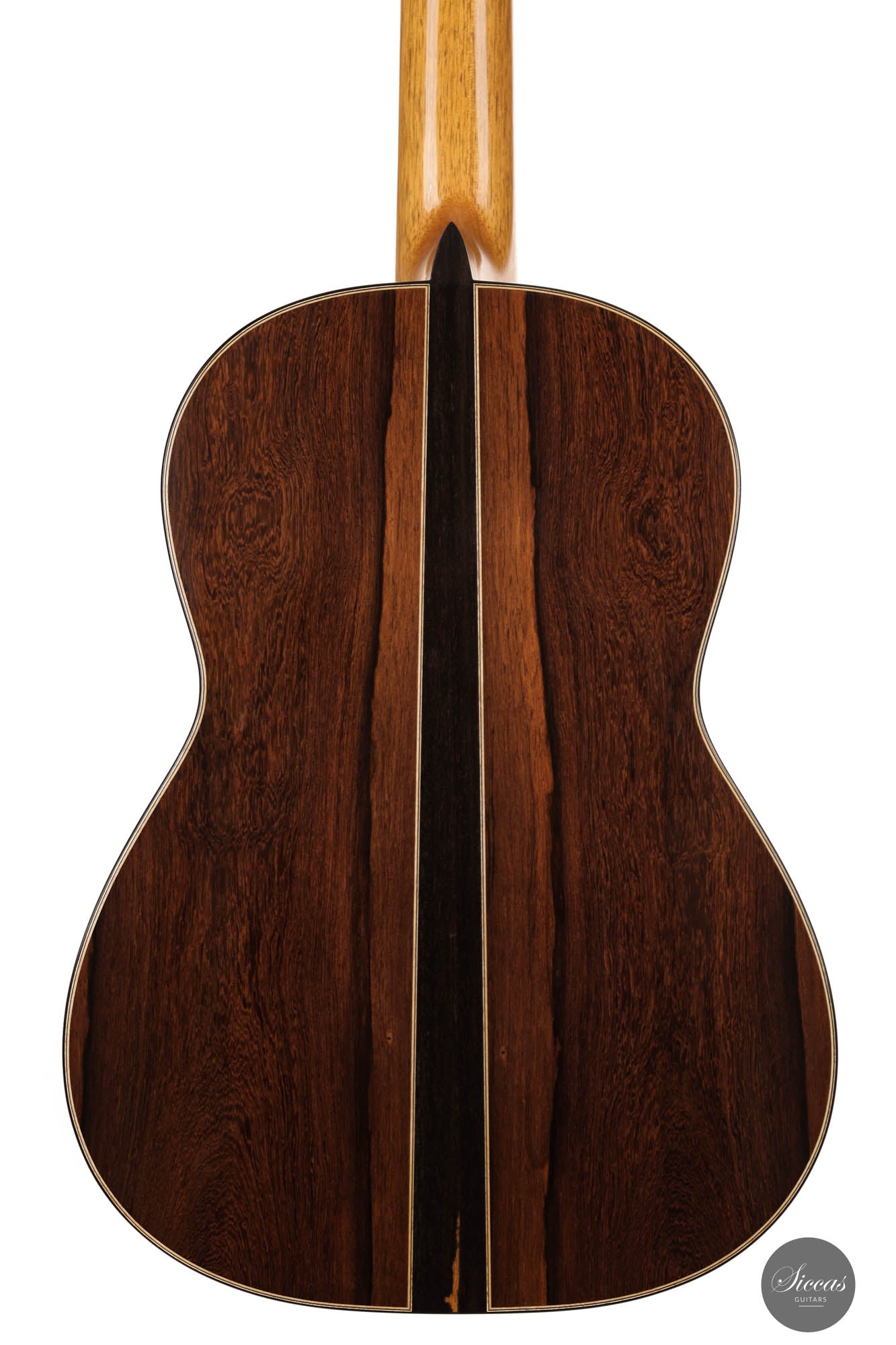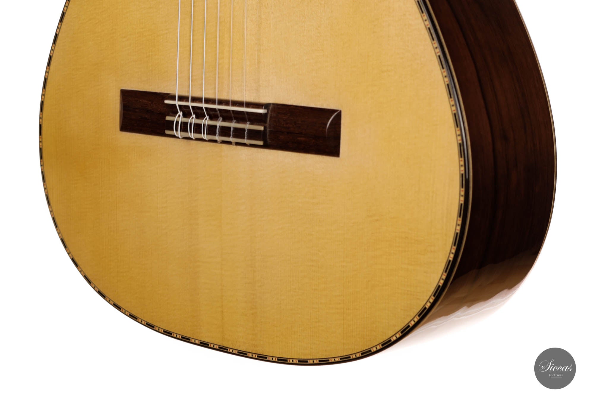 The 2023 Johannes T'Kindt "Romanillos" model guitar, inspired by the outstanding work of José Luis Romanillos, serves as an exemplary artifact of refined guitar craftsmanship. This instrument perfectly amalgamates aesthetics, functionality, and acoustics, illustrating the convergence of musicality and visual appeal. Lightness is the primary principle that drives the construction of this guitar, engendering a characteristic open resonance. This principle's implementation manifests a deep and vibrant acoustic environment engendered by a meticulously designed combination of beech, maple, and Indian rosewood inlays. These inlays enrich the tonal landscape of the instrument, inviting exploration of its sophisticated auditory layers. The ease of playability is another noteworthy attribute of this guitar model, attributable to a well-profiled neck and responsive string action. Each plucked string resonates with a rich, colorful sound that testifies to the instrument's immediate responsiveness, which enhances the playing experience regardless of the player's skill level. In terms of aesthetics, the instrument displays a striking visual appeal, underlined by a prominent Zebrano inlay within the rosette. In harmony with the natural wood grain, this feature provides a captivating visual contrast and meticulous detail, heightening the instrument's overall appeal. The 2023 Johannes T'Kindt "Romanillos" model guitar is an aesthetically pleasing and acoustically exceptional instrument and provides outstanding value. The synergy of expert craftsmanship, superior tonal properties, and remarkable aesthetics underscores its desirability. The instrument’s harmonious sound character and aesthetic intrigue are representatives of its great value proposition. This guitar presents an immersive musical experience, with every note resonating with its distinct tonal signature. Its design, sound, and craftsmanship reflect the esteemed Romanillos tradition, rendering the 2023 Johannes T'Kindt "Romanillos" model guitar a remarkable addition to any musical collection.
