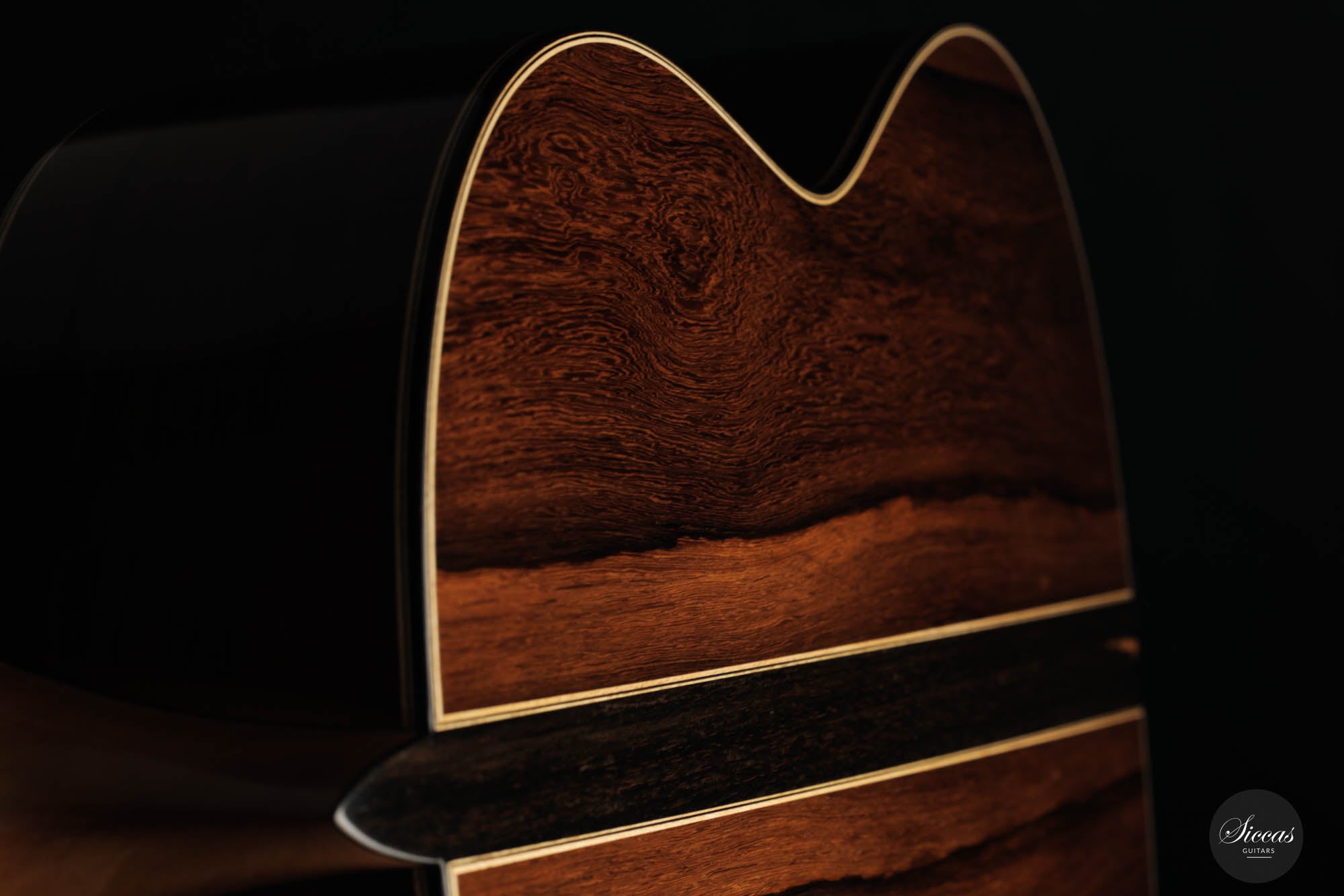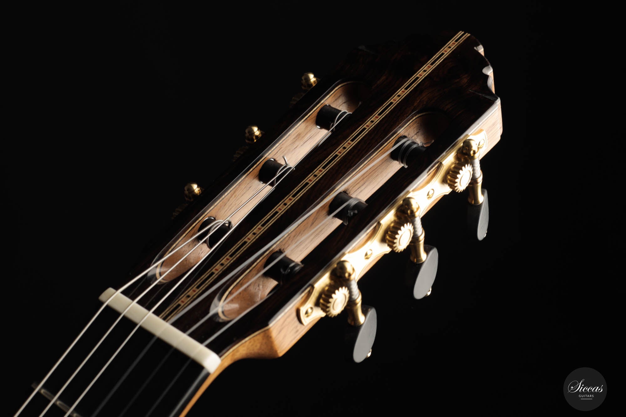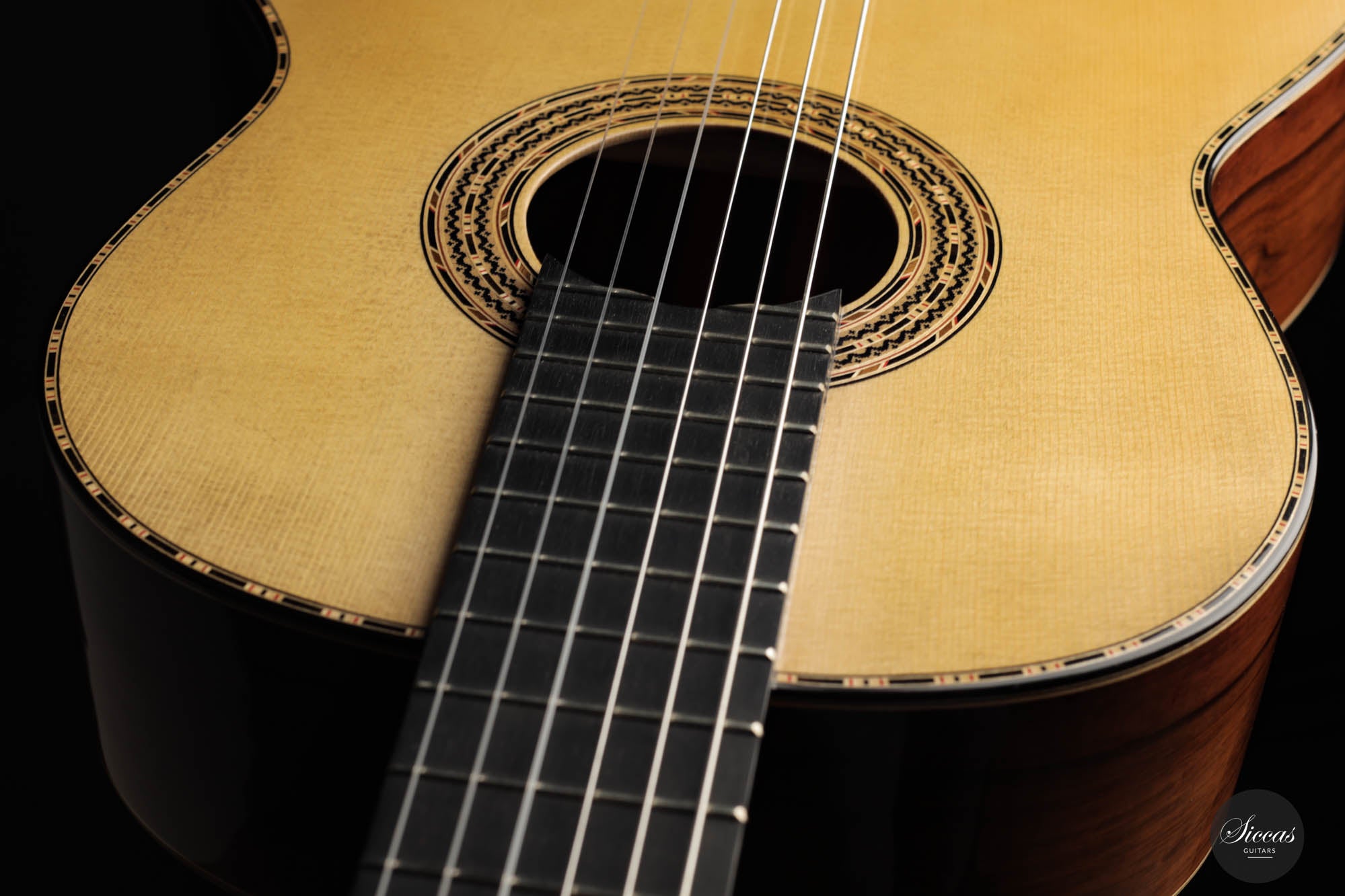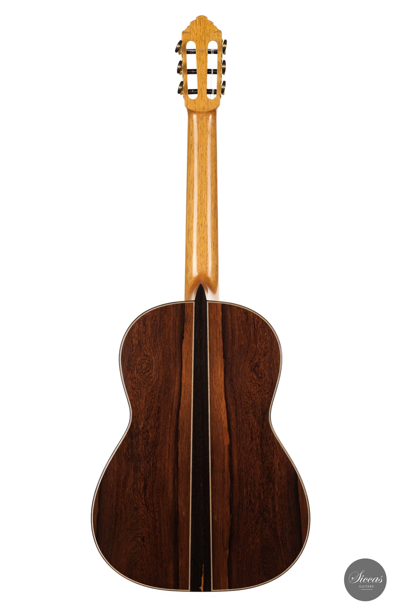 The 2023 Johannes T'Kindt "Romanillos" model guitar, inspired by the outstanding work of José Luis Romanillos, serves as an exemplary artifact of refined guitar craftsmanship. This instrument perfectly amalgamates aesthetics, functionality, and acoustics, illustrating the convergence of musicality and visual appeal. Lightness is the primary principle that drives the construction of this guitar, engendering a characteristic open resonance. This principle's implementation manifests a deep and vibrant acoustic environment engendered by a meticulously designed combination of beech, maple, and Indian rosewood inlays. These inlays enrich the tonal landscape of the instrument, inviting exploration of its sophisticated auditory layers. The ease of playability is another noteworthy attribute of this guitar model, attributable to a well-profiled neck and responsive string action. Each plucked string resonates with a rich, colorful sound that testifies to the instrument's immediate responsiveness, which enhances the playing experience regardless of the player's skill level. In terms of aesthetics, the instrument displays a striking visual appeal, underlined by a prominent Zebrano inlay within the rosette. In harmony with the natural wood grain, this feature provides a captivating visual contrast and meticulous detail, heightening the instrument's overall appeal. The 2023 Johannes T'Kindt "Romanillos" model guitar is an aesthetically pleasing and acoustically exceptional instrument and provides outstanding value. The synergy of expert craftsmanship, superior tonal properties, and remarkable aesthetics underscores its desirability. The instrument’s harmonious sound character and aesthetic intrigue are representatives of its great value proposition. This guitar presents an immersive musical experience, with every note resonating with its distinct tonal signature. Its design, sound, and craftsmanship reflect the esteemed Romanillos tradition, rendering the 2023 Johannes T'Kindt "Romanillos" model guitar a remarkable addition to any musical collection.