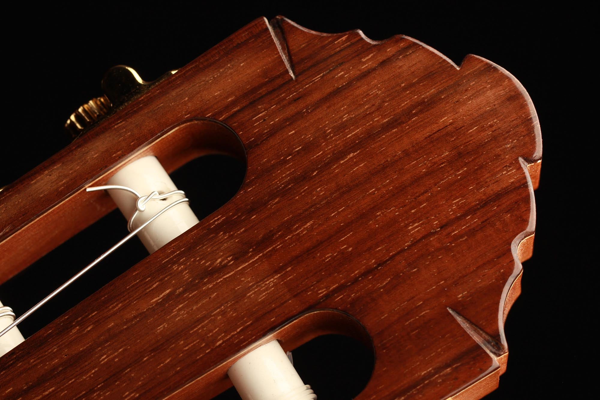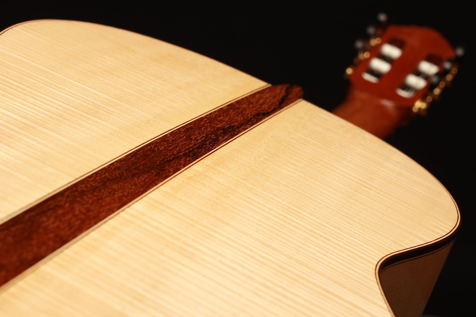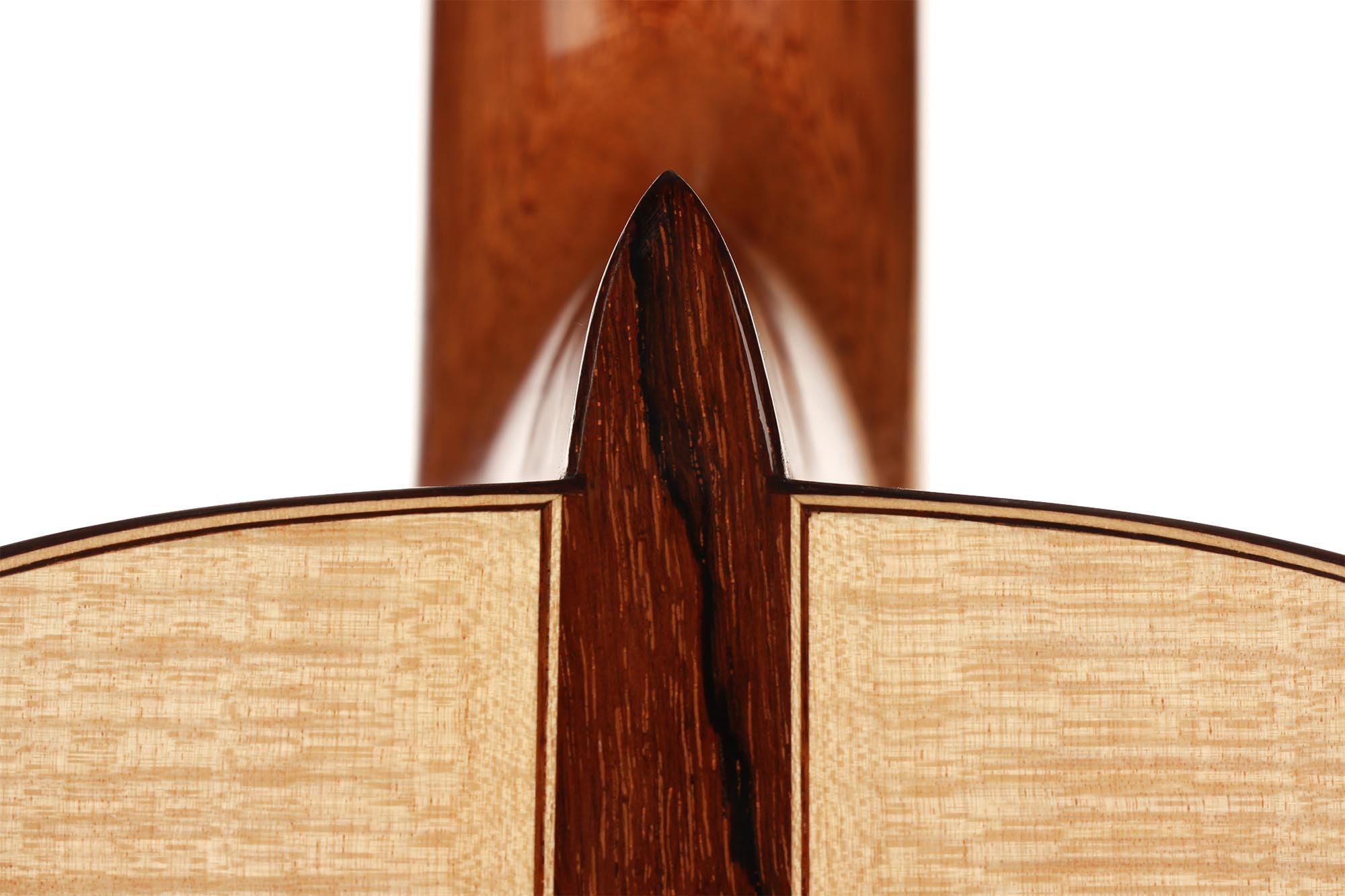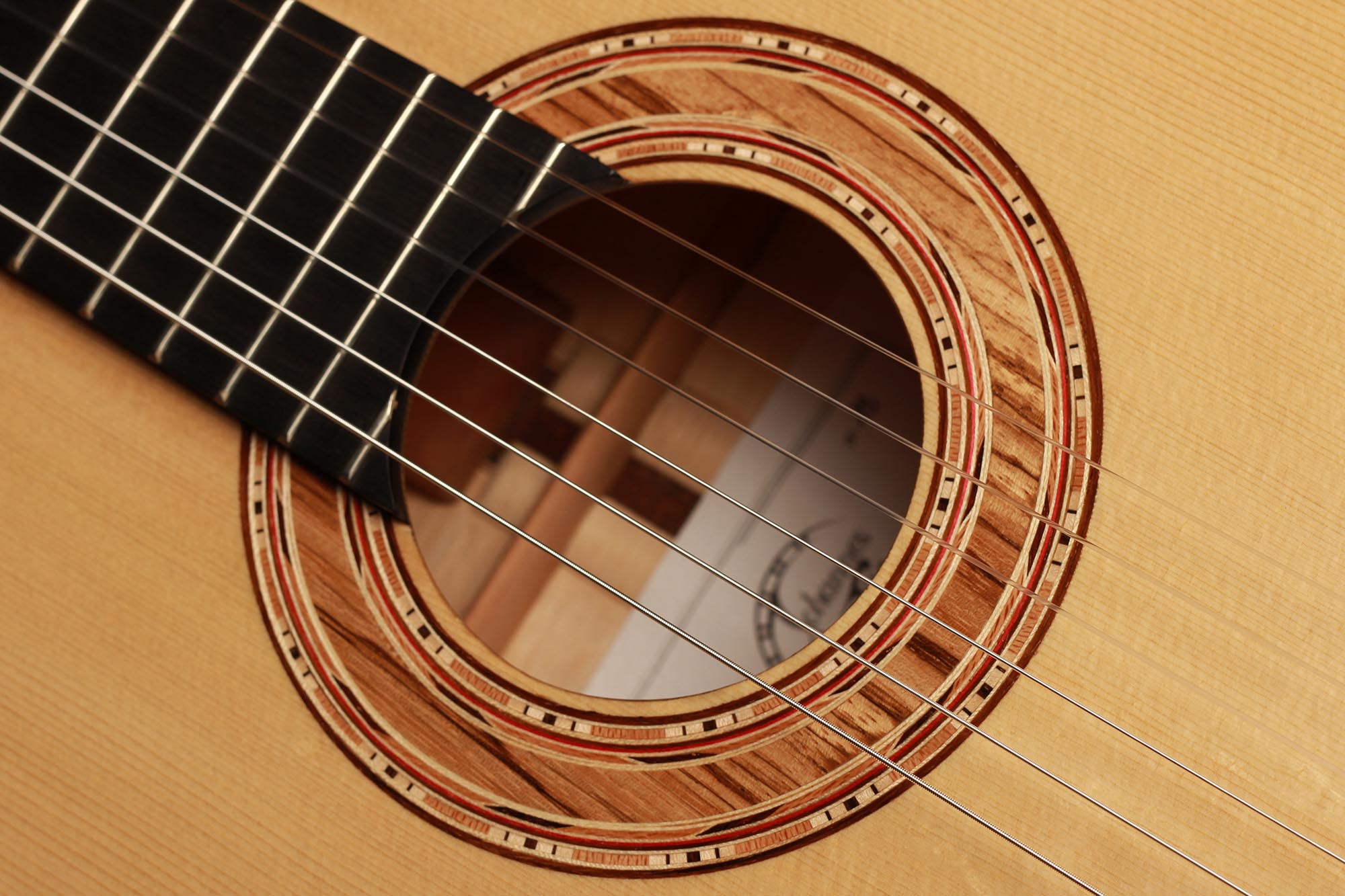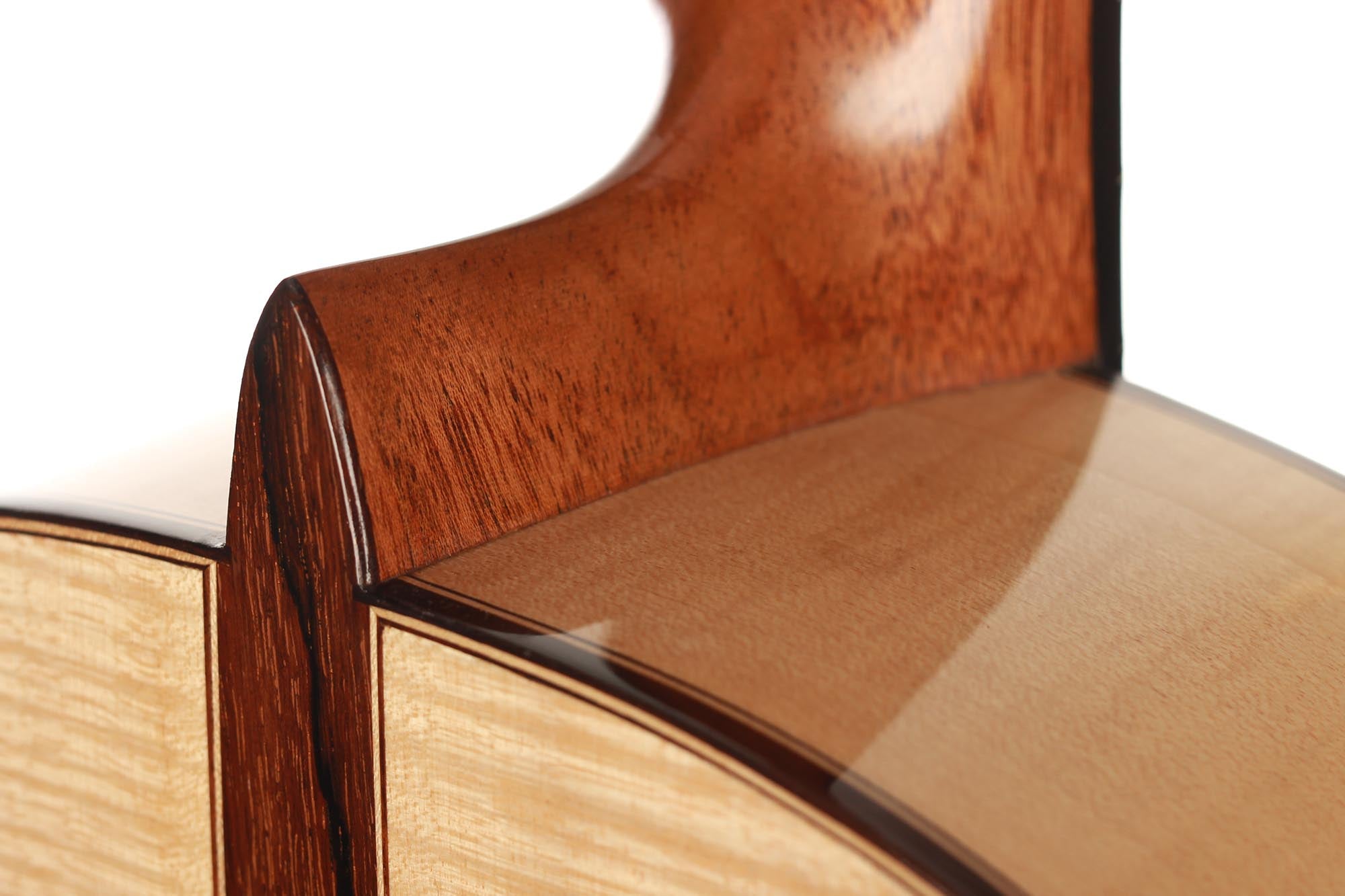 This José Luis Romanillos inspired guitar is just beautiful. It is built very light and sounds thus very airy and open. Due to its easy response and the pleasant neck profile it is also very easy to play. In addition, the instrument offers a rich and colourful tone, with great delicacy and present harmonics. The rosette has a beautiful massive Zebrano inlay, and the inlays are a combination of beech, maple and Indian rosewood. This instrument is really attractive. Not only because of the convincing and wonderfully singing sound character, but also because of the excellent value for money.