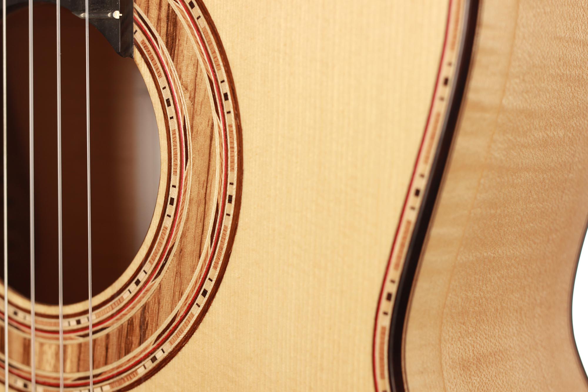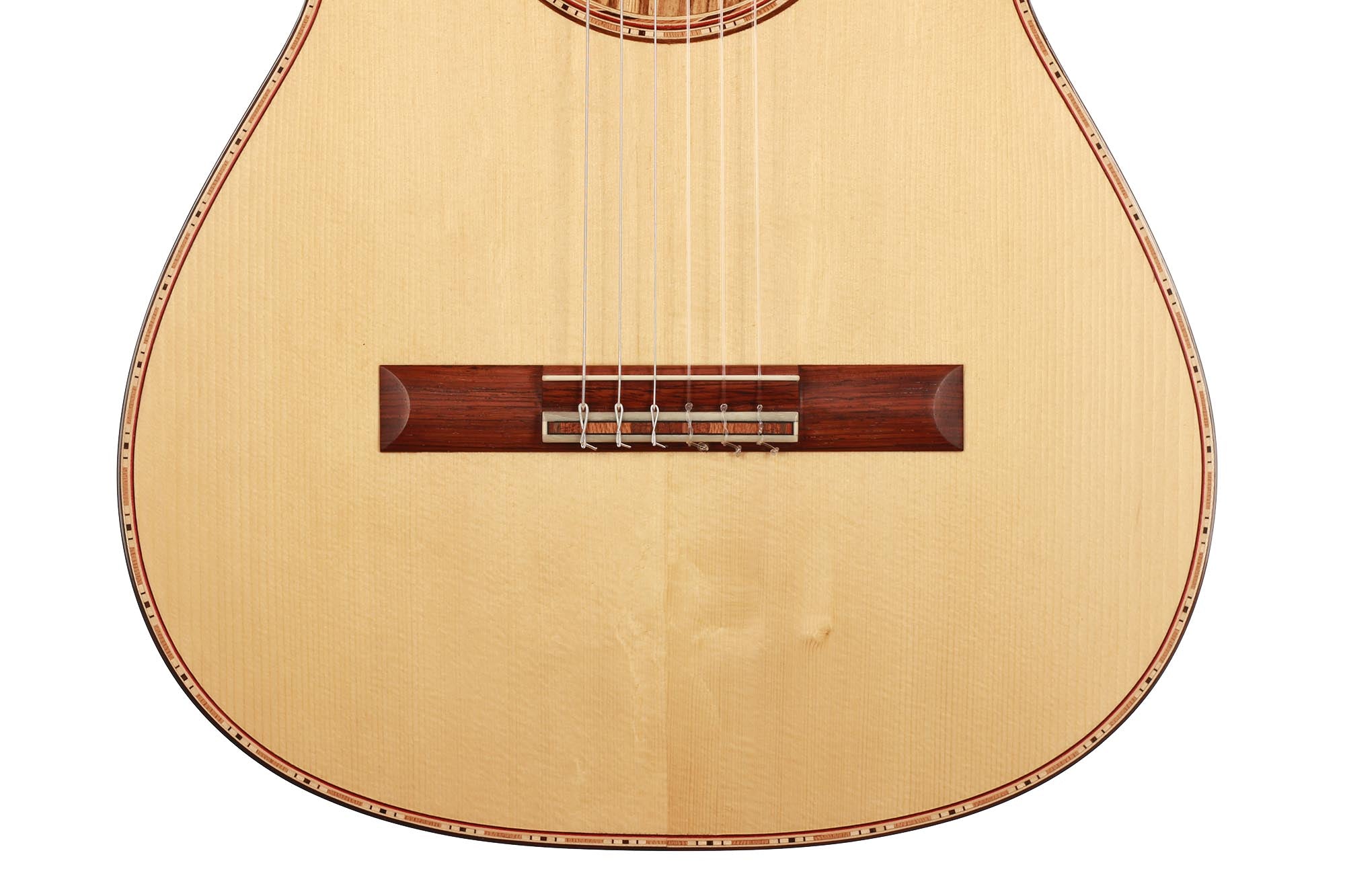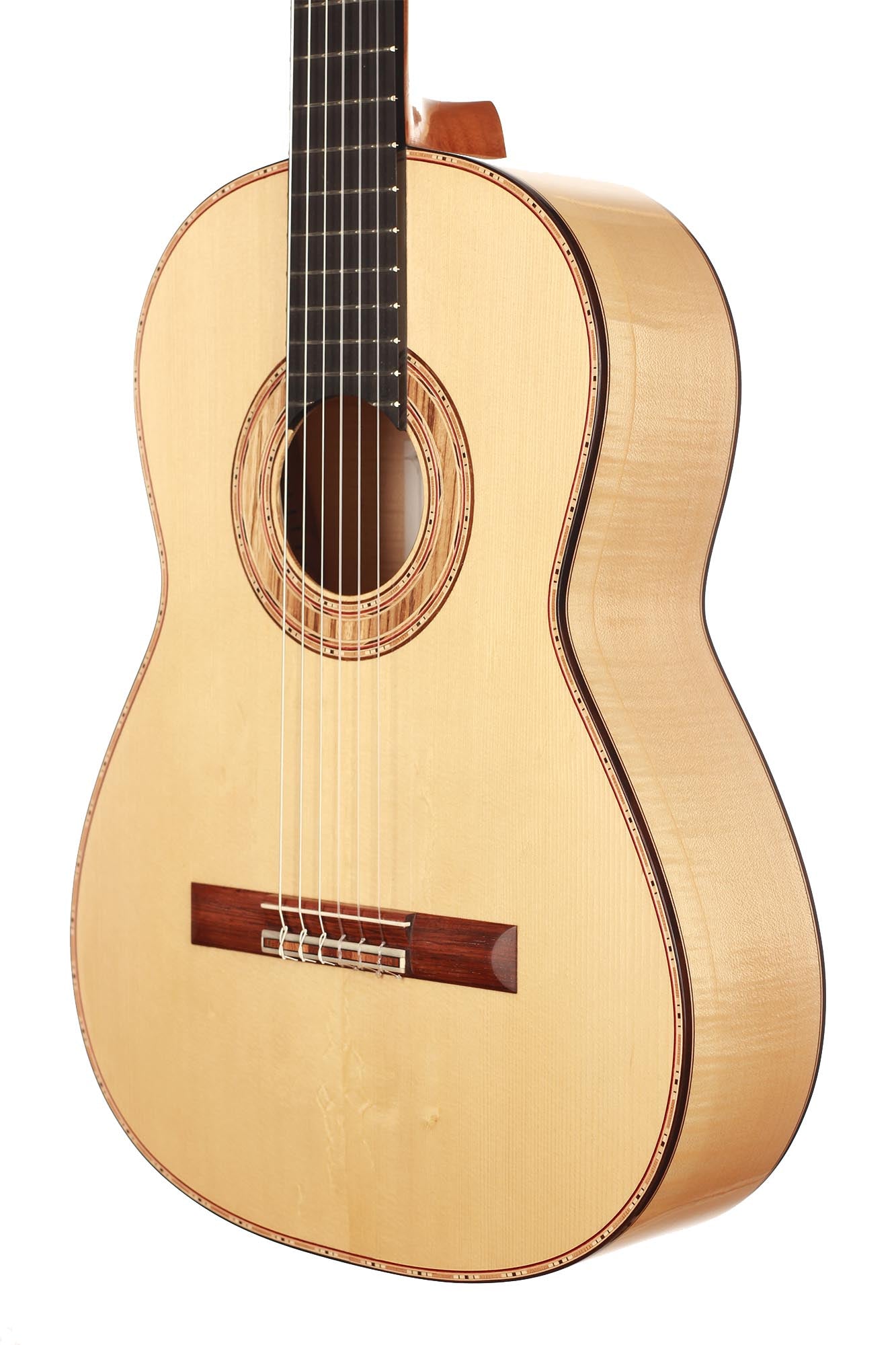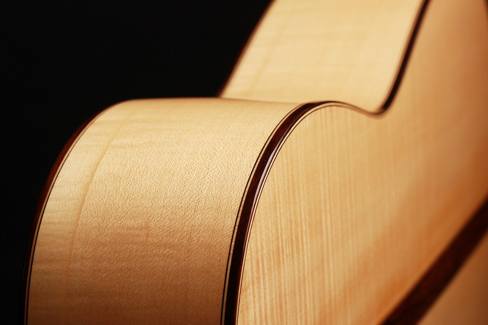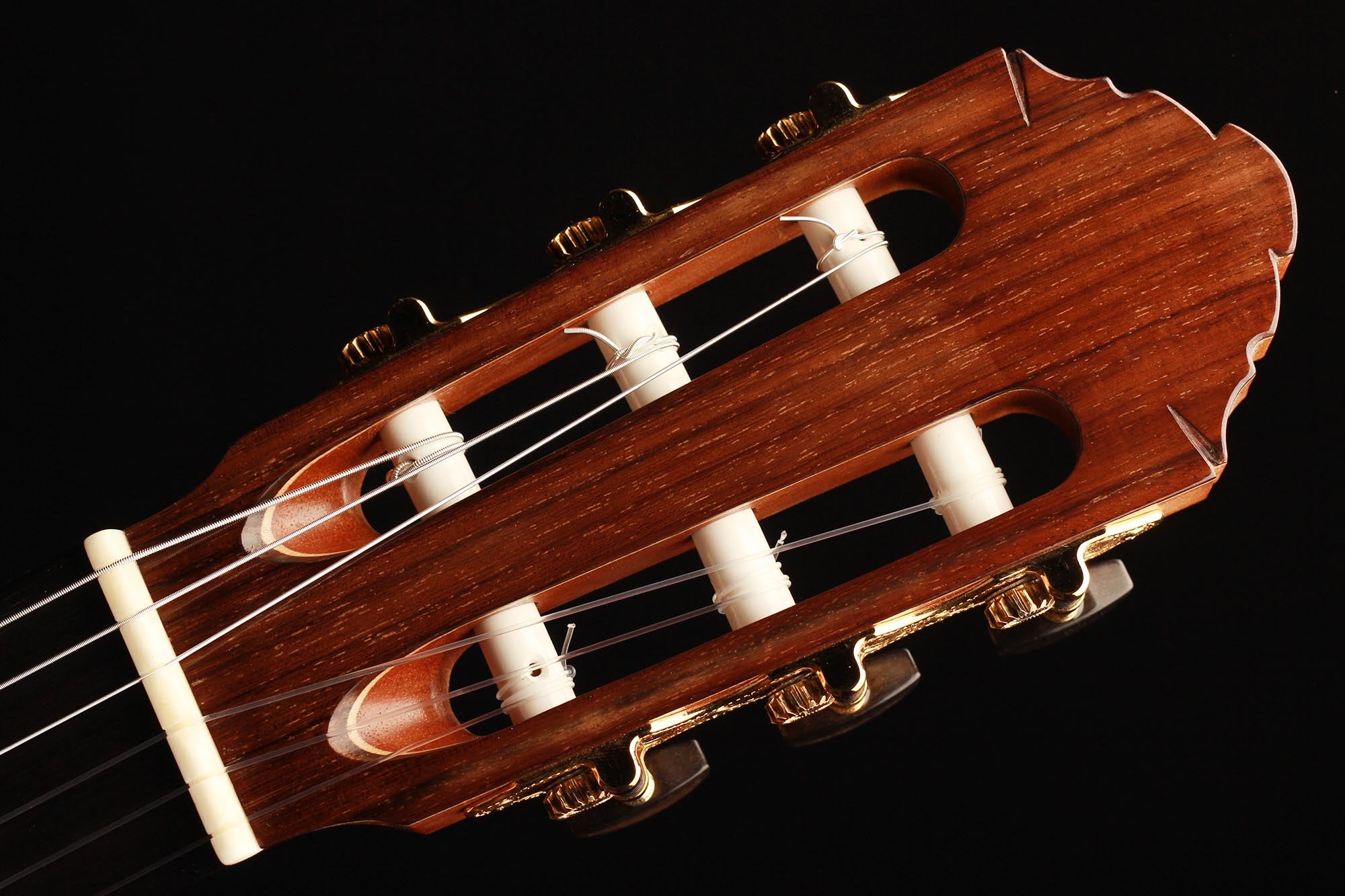 This José Luis Romanillos inspired guitar is just beautiful. It is built very light and sounds thus very airy and open. Due to its easy response and the pleasant neck profile it is also very easy to play. In addition, the instrument offers a rich and colourful tone, with great delicacy and present harmonics. The rosette has a beautiful massive Zebrano inlay, and the inlays are a combination of beech, maple and Indian rosewood. This instrument is really attractive. Not only because of the convincing and wonderfully singing sound character, but also because of the excellent value for money.