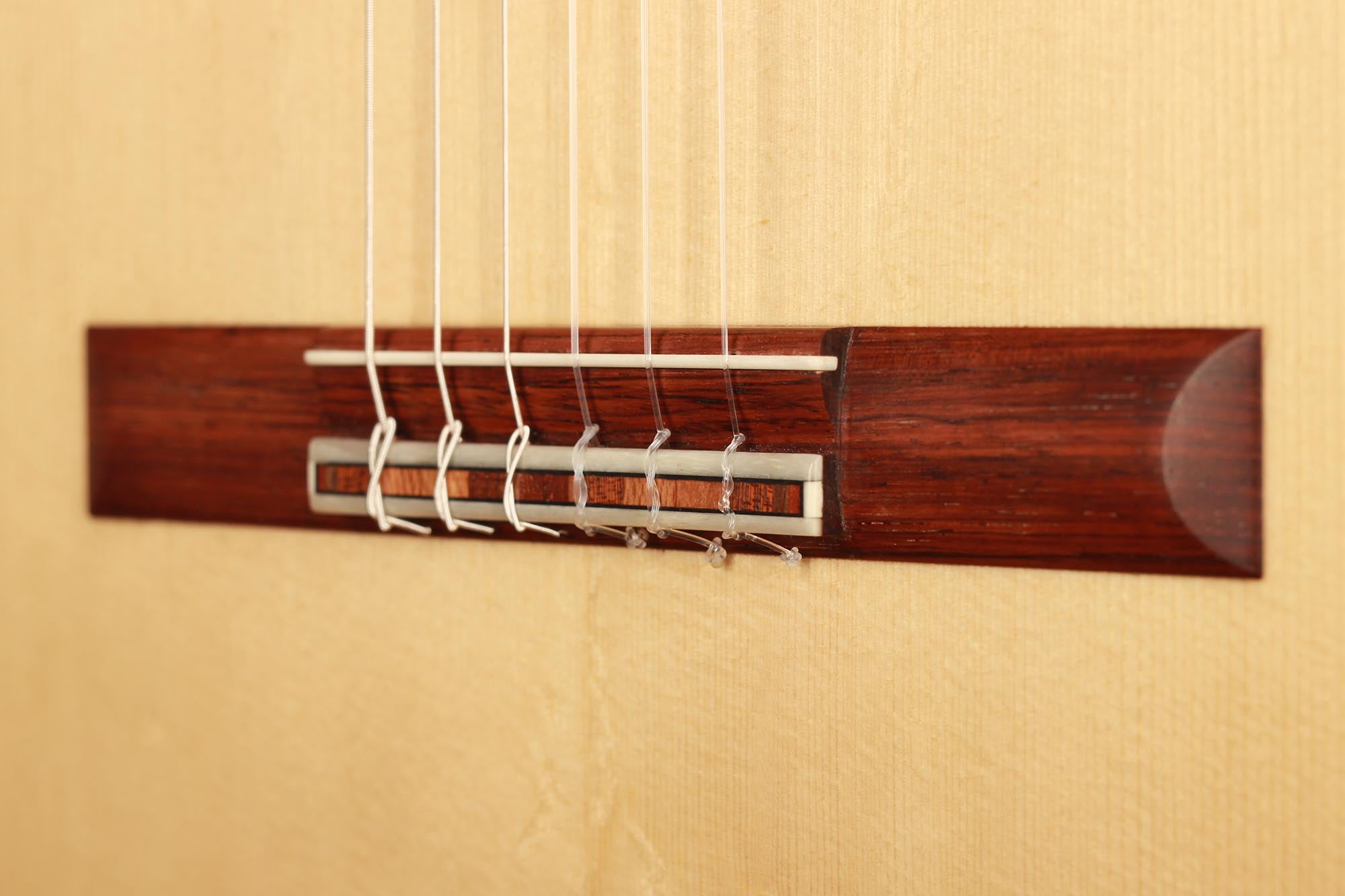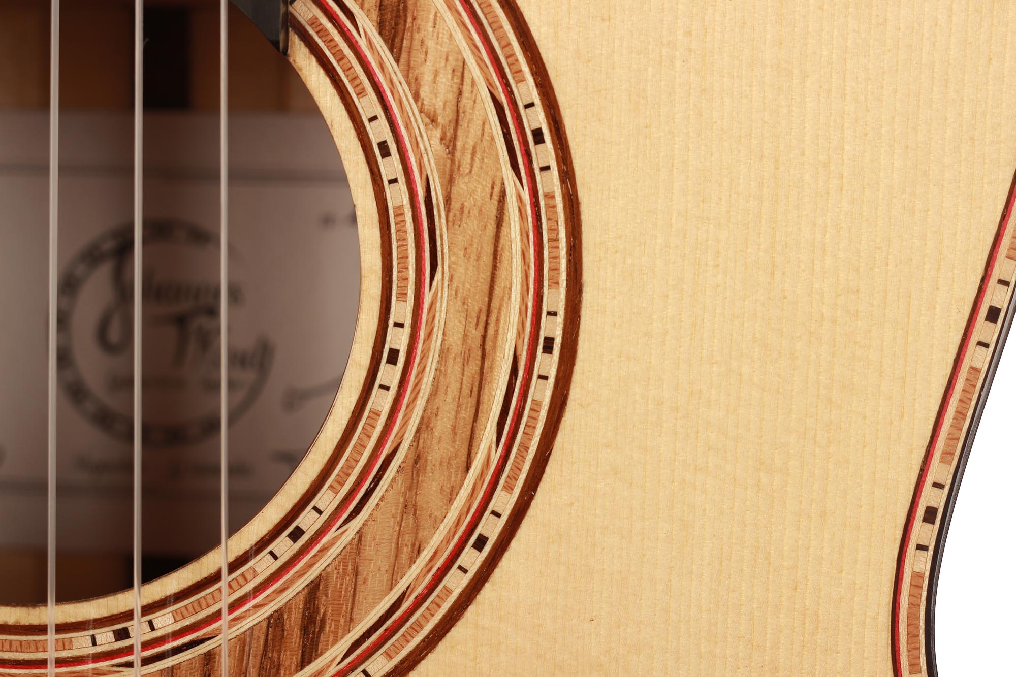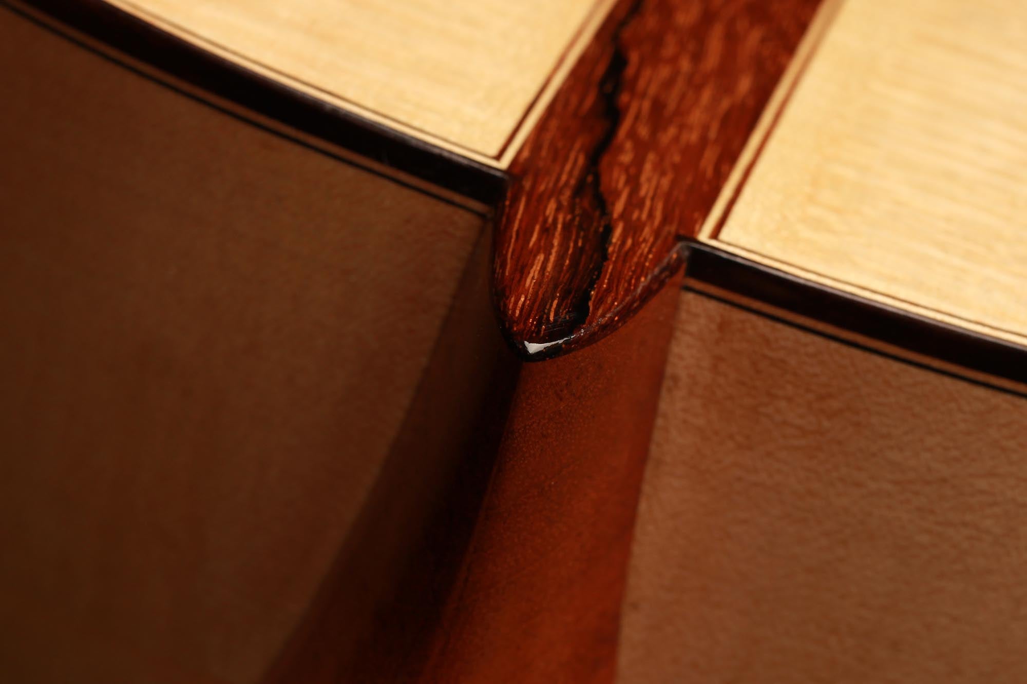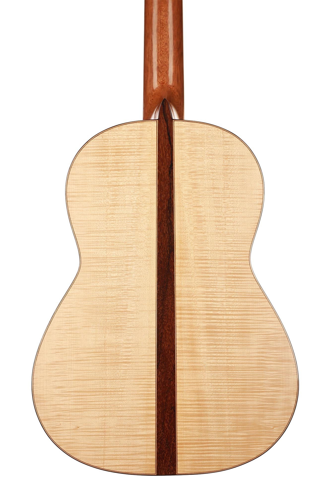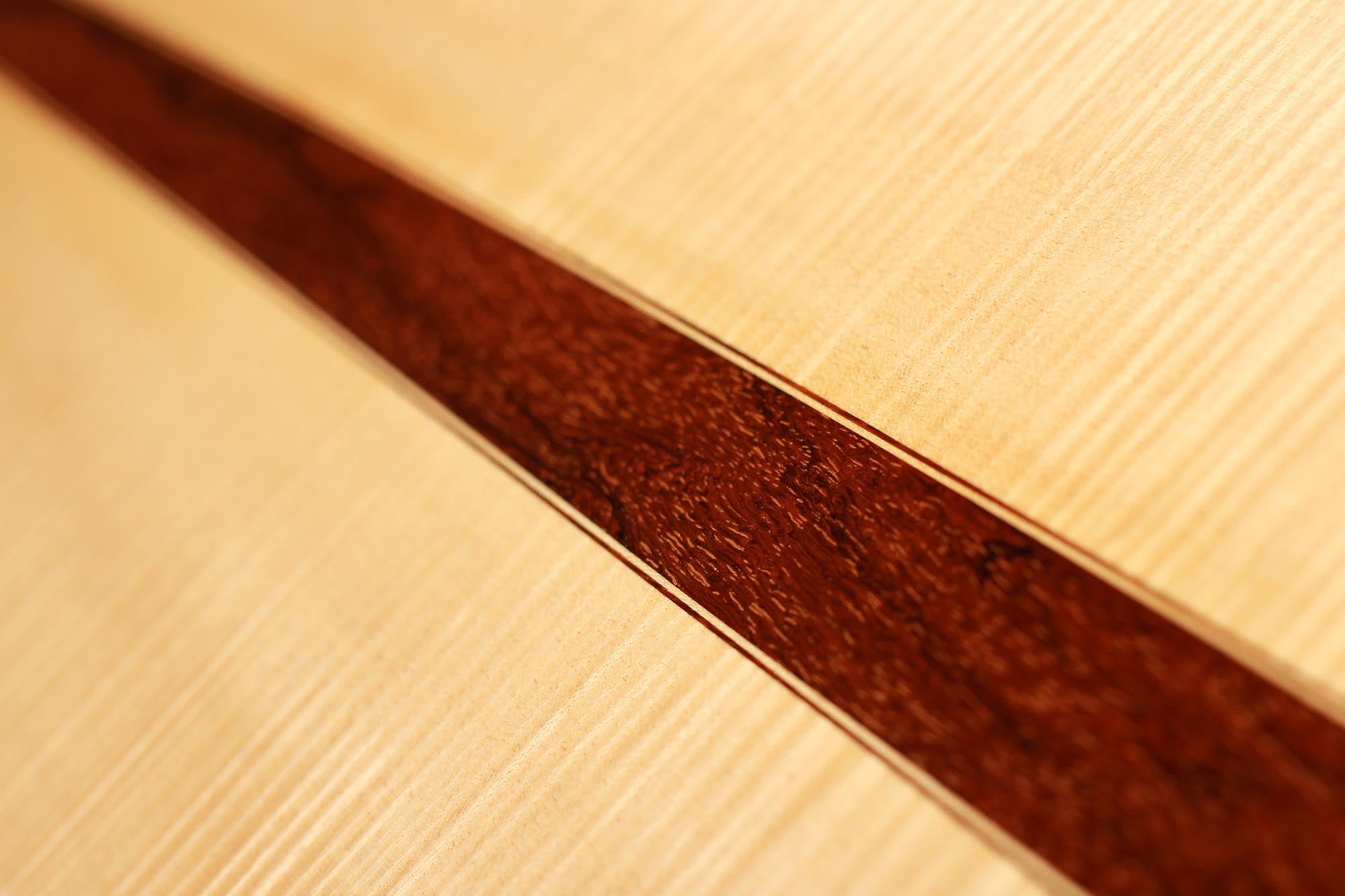 This José Luis Romanillos inspired guitar is just beautiful. It is built very light and sounds thus very airy and open. Due to its easy response and the pleasant neck profile it is also very easy to play. In addition, the instrument offers a rich and colourful tone, with great delicacy and present harmonics. The rosette has a beautiful massive Zebrano inlay, and the inlays are a combination of beech, maple and Indian rosewood. This instrument is really attractive. Not only because of the convincing and wonderfully singing sound character, but also because of the excellent value for money.