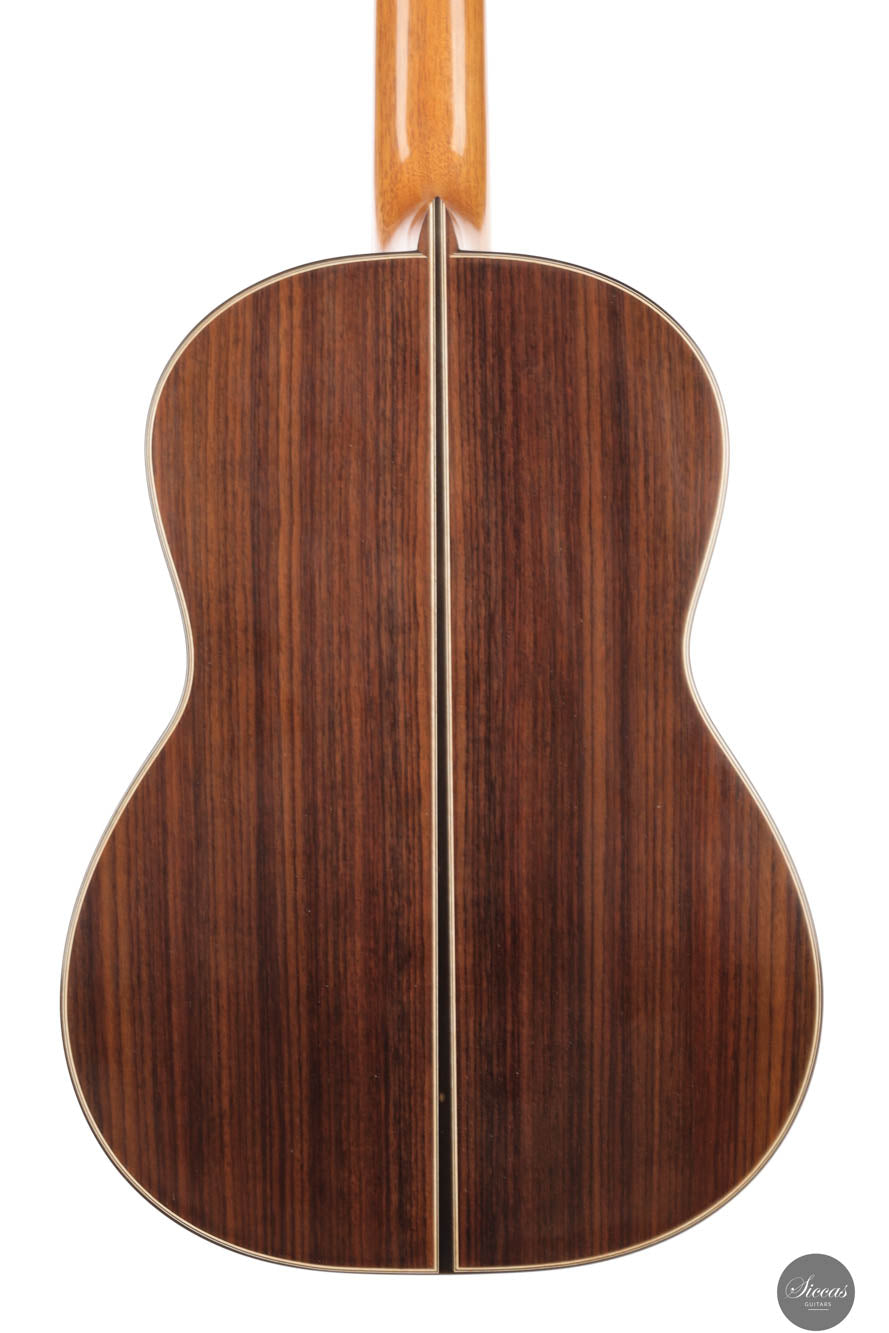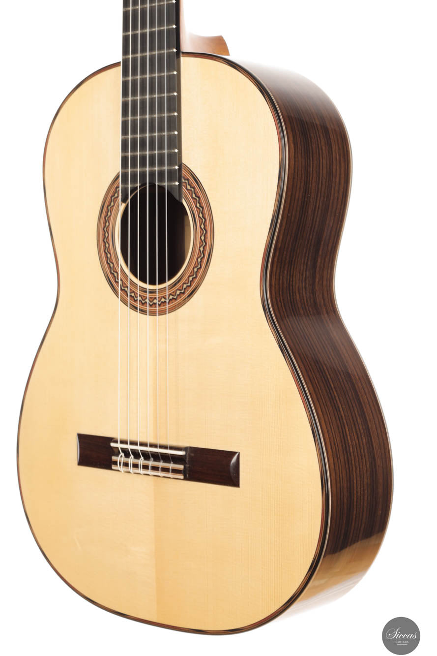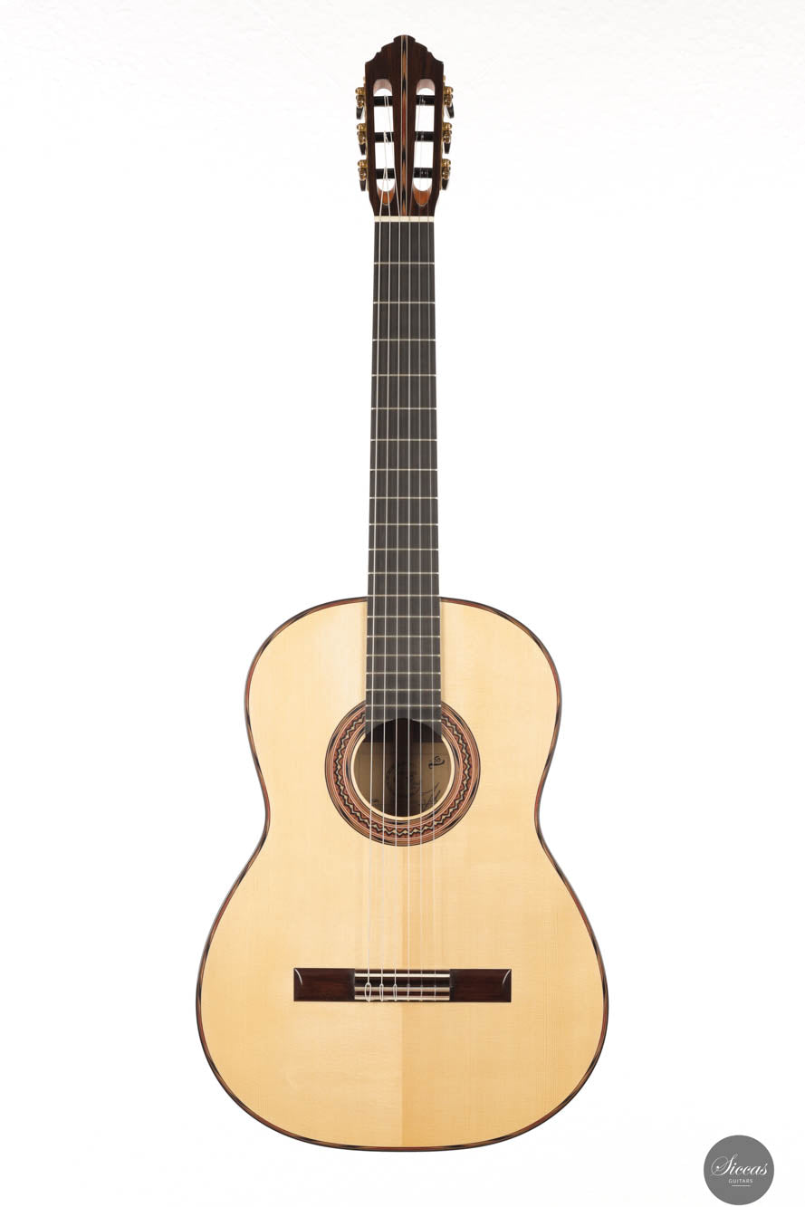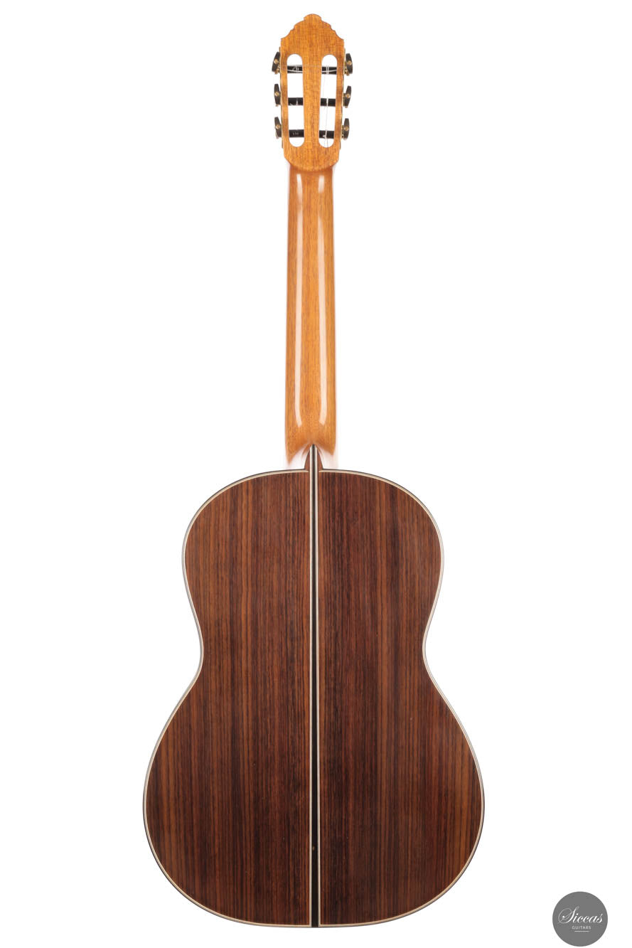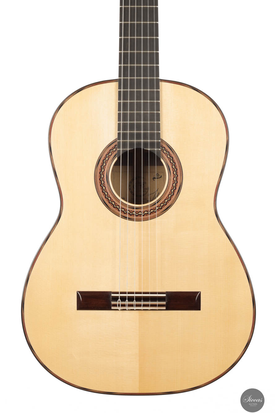 This classical guitar is based on Antonio de Torres' second-period plantilla. It features a traditional bracing pattern with seven fan struts, two closing bars, and a very light bridge bar, ensuring a well-balanced structure that enhances tonal richness. The top is made of Alpine spruce, while the back and sides are crafted from Indian rosewood, offering warmth, depth, and remarkable resonance. The neck is made of cedar, and the fingerboard of ebony, ensuring stability and comfort. The guitar is fitted with high-quality Barnett tuning machines, known for their precision and durability.