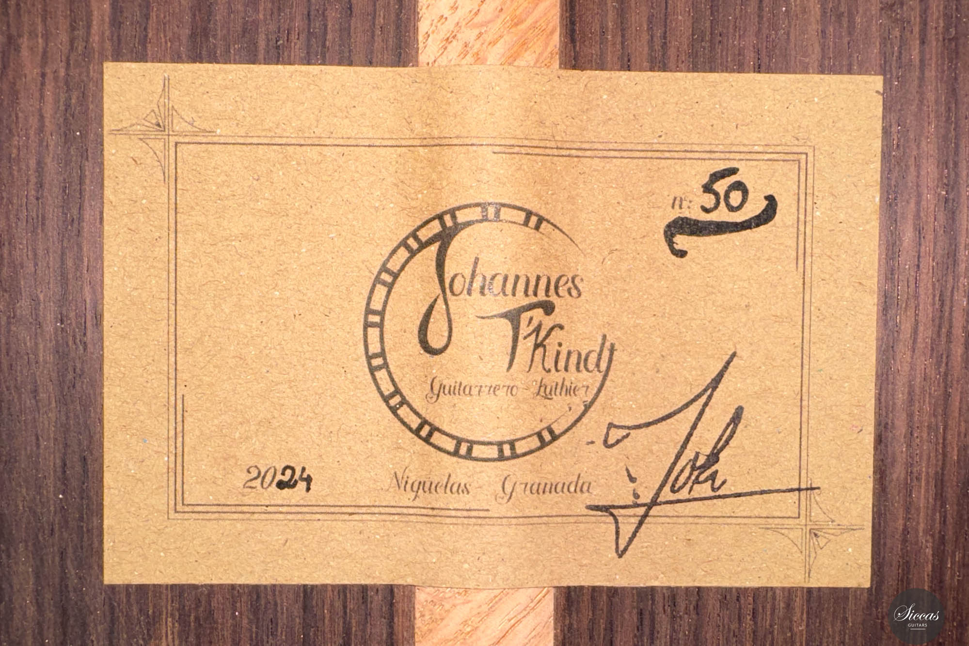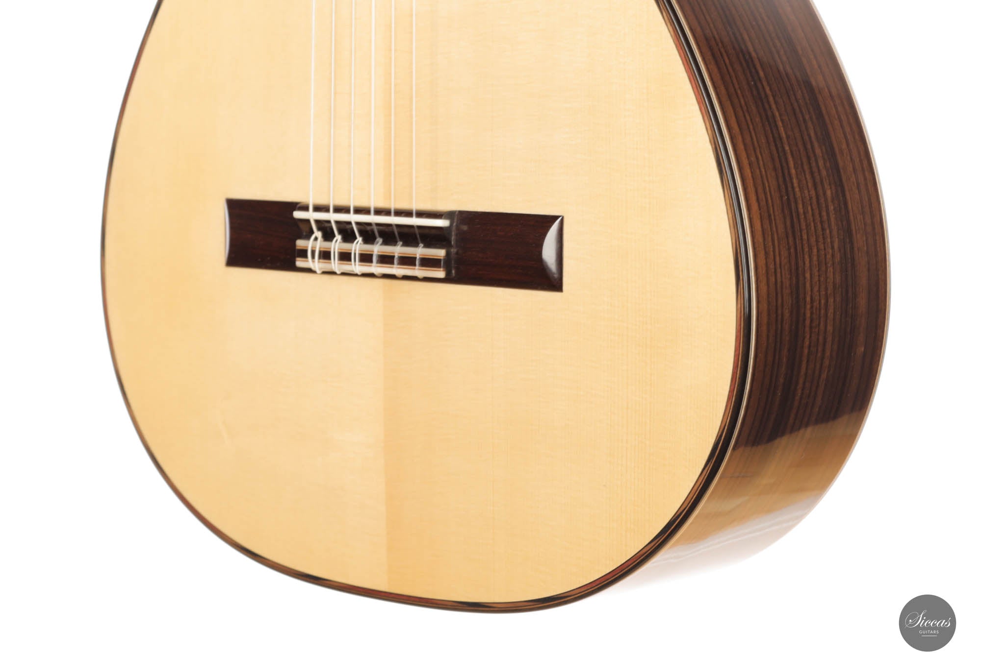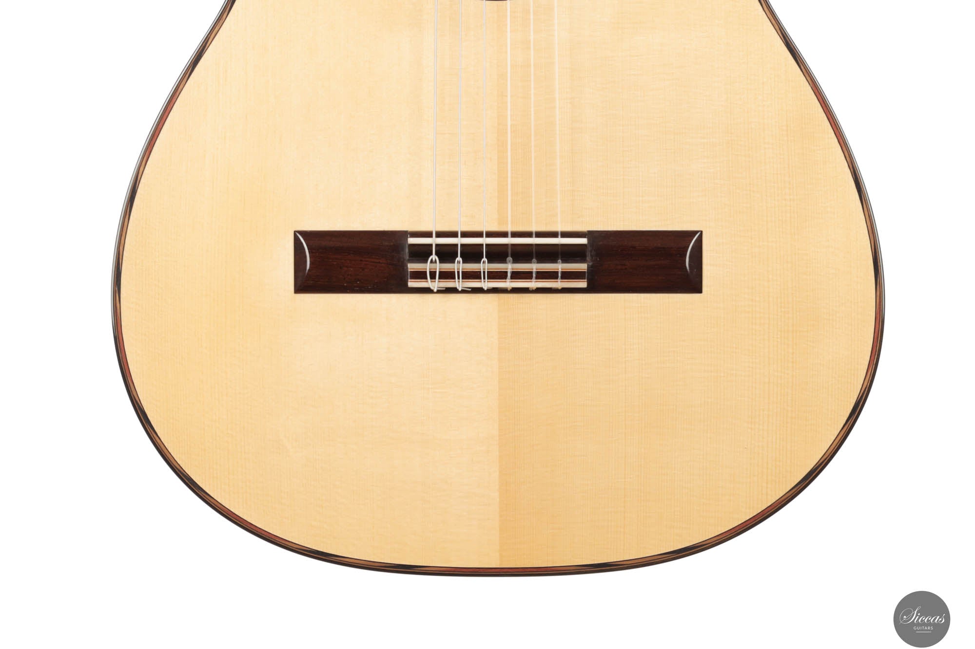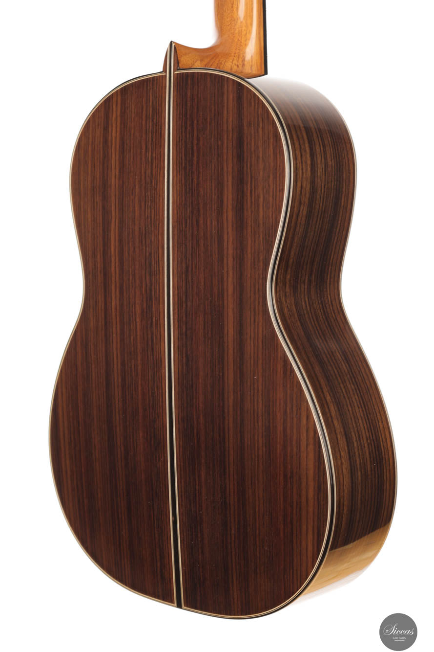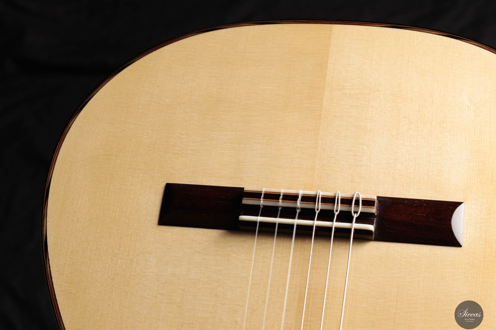 This classical guitar is based on Antonio de Torres' second-period plantilla. It features a traditional bracing pattern with seven fan struts, two closing bars, and a very light bridge bar, ensuring a well-balanced structure that enhances tonal richness. The top is made of Alpine spruce, while the back and sides are crafted from Indian rosewood, offering warmth, depth, and remarkable resonance. The neck is made of cedar, and the fingerboard of ebony, ensuring stability and comfort. The guitar is fitted with high-quality Barnett tuning machines, known for their precision and durability.