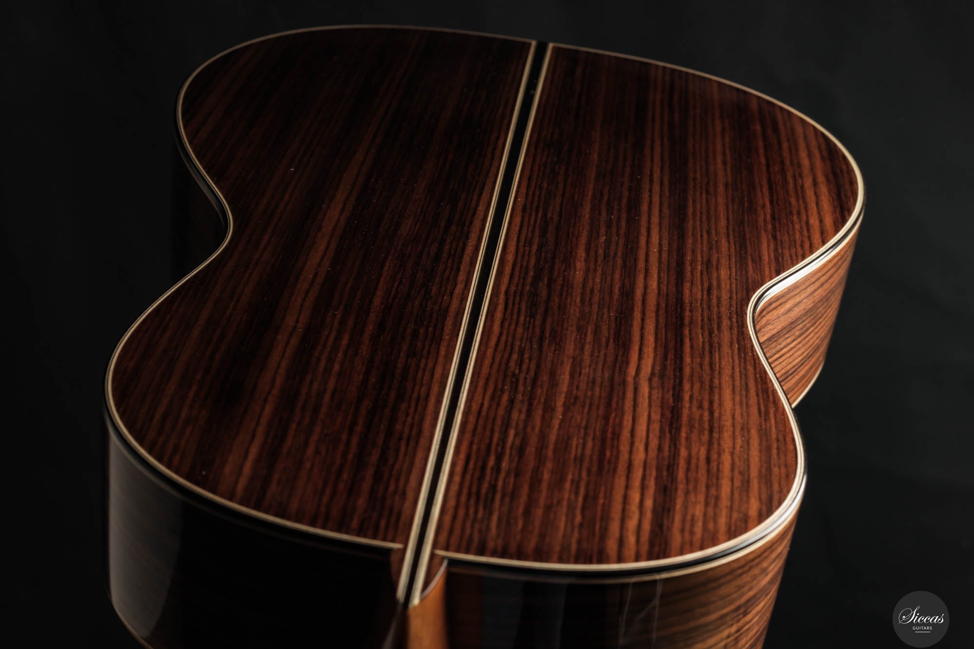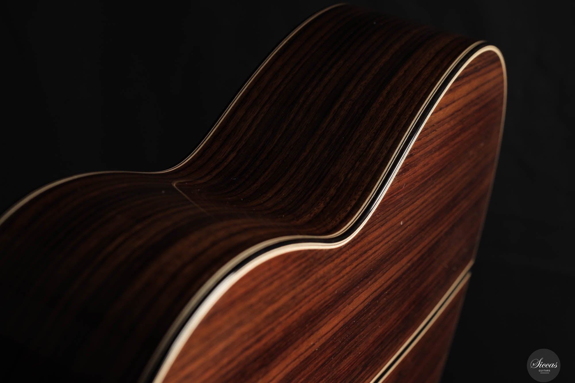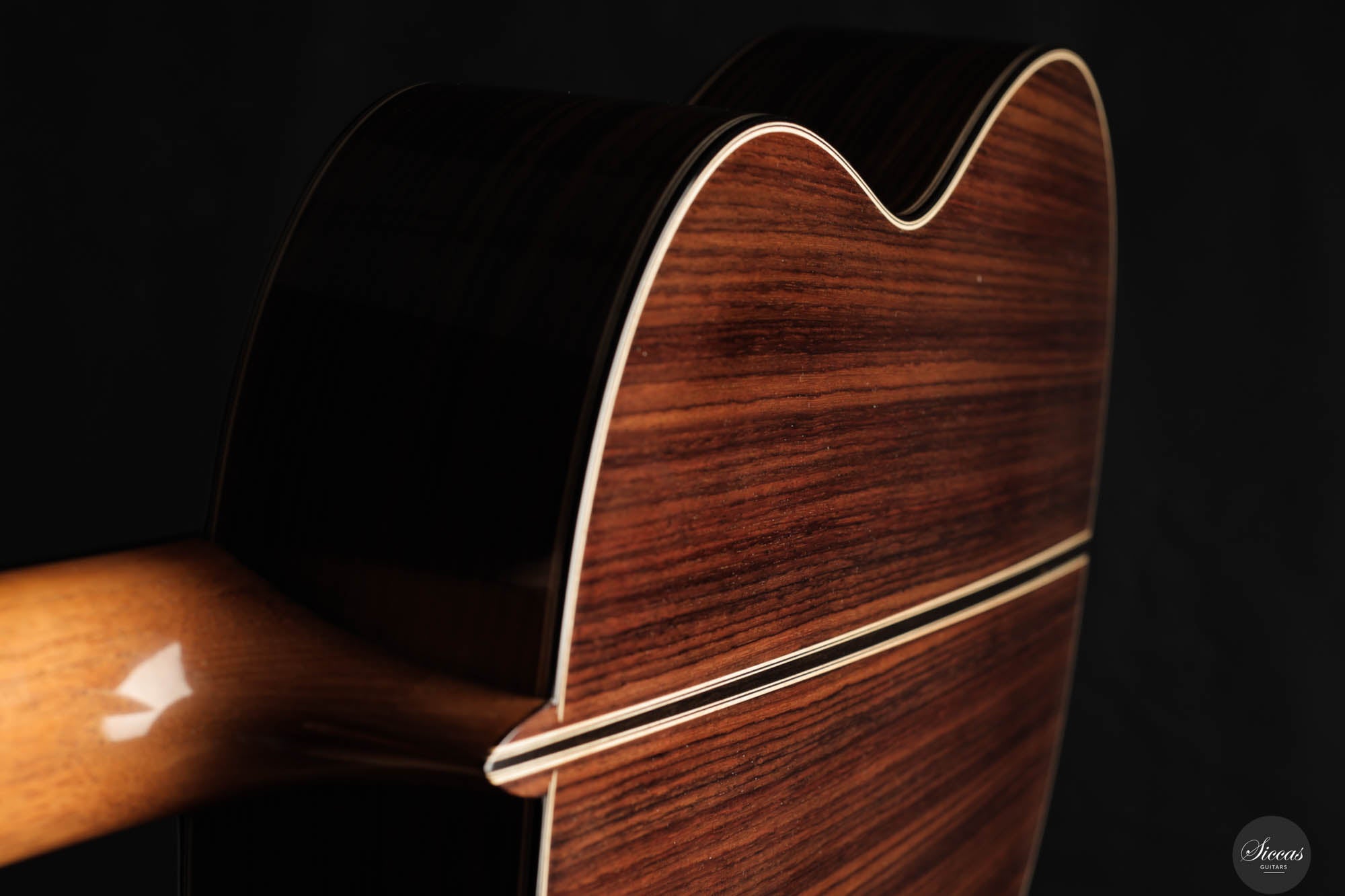 One of the most distinctive aspects of this guitar is its purfling and rosette, which feature a "random sequence" herringbone pattern. Unlike traditional herringbone designs that rely on a repetitive sequence of thin veneer layers, this technique uses solid wood pieces in an extended, non-repeating pattern. This design emerged from an early experiment where different wood pieces were assembled spontaneously, resulting in a visually striking aesthetic that was later refined into a more controlled and deliberate process. This instrument is a perfect blend of tradition and individuality, offering an expressive, refined sound with remarkable playability.