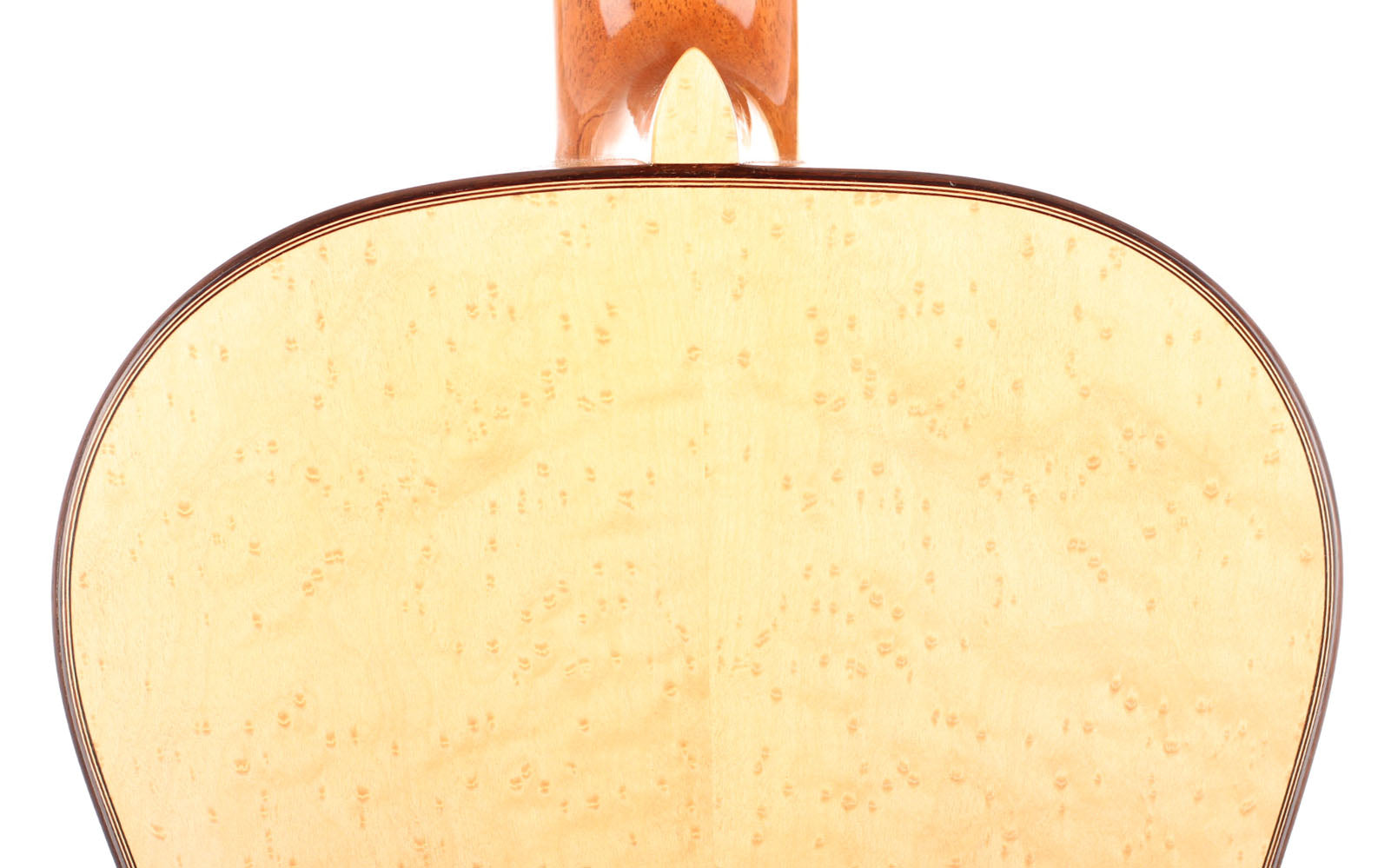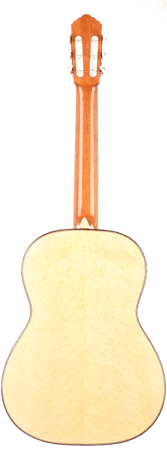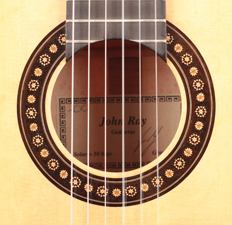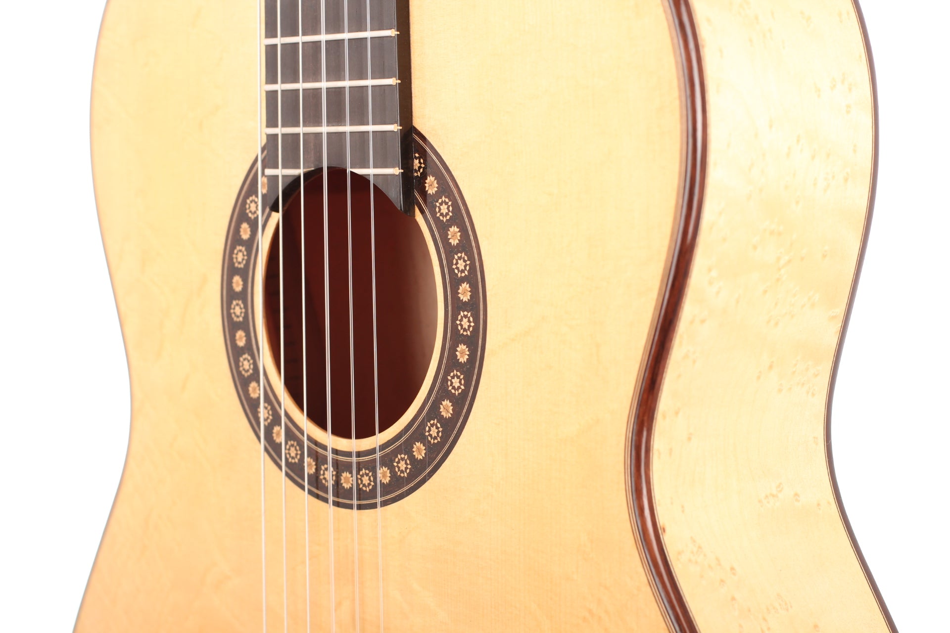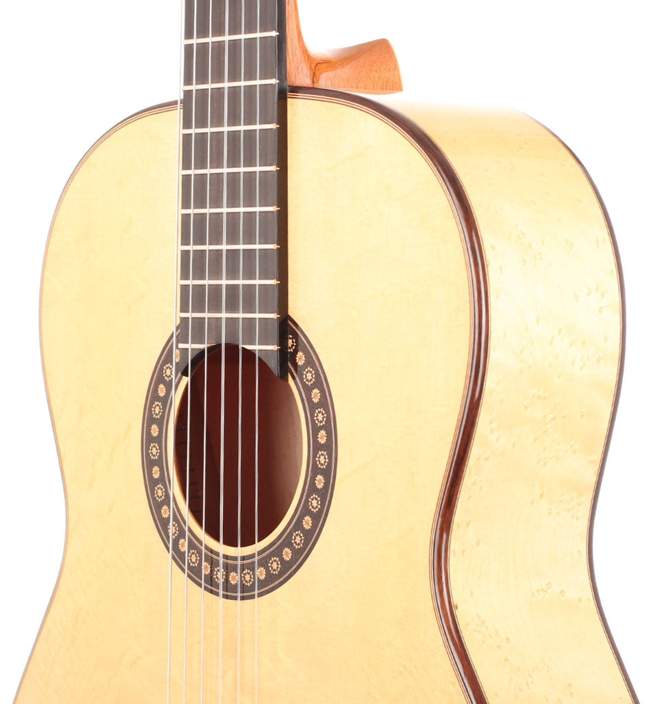 John Ray moved to Granada from his native Canada in 1989 in order to learn to build guitars. Since that time, he has benefitted from the generosity of the Granada guitar-makers, especially the late Rolf Eichinger. John has always been interested in historic guitars and is active in restorating and writing about these instruments. He has restored instruments by Miguel Rodriguez, Vicente Arias, Manuel Ramirez, Salvador Ibañez and others. The influence of the historic makers and the current makers have helped his guitars to become very popular among professional players and teachers. Guitarists find that they can shape the sound very easily with these guitars and that they are very easy to play. This guitar has a bear claw spruce top and bird’s eye maple back and sides. The tuners are made by Sloane.