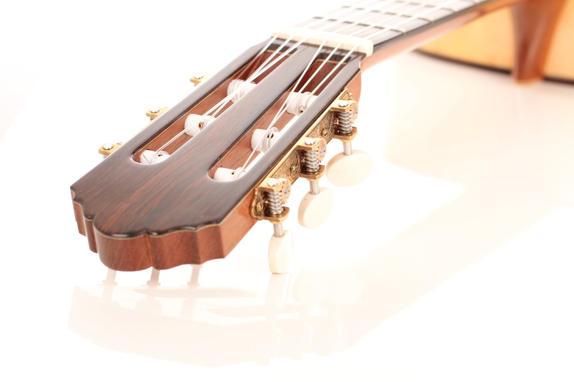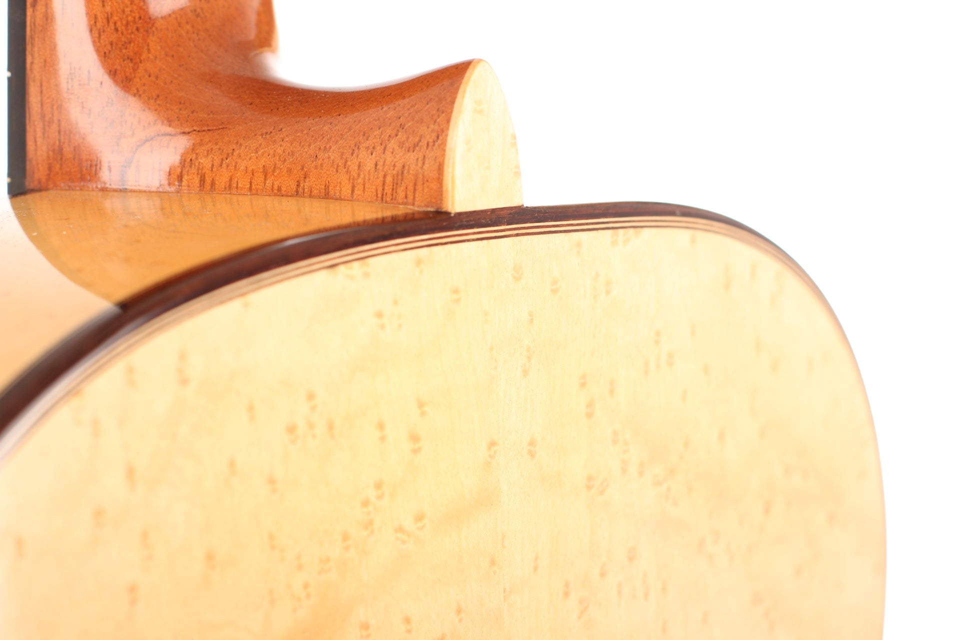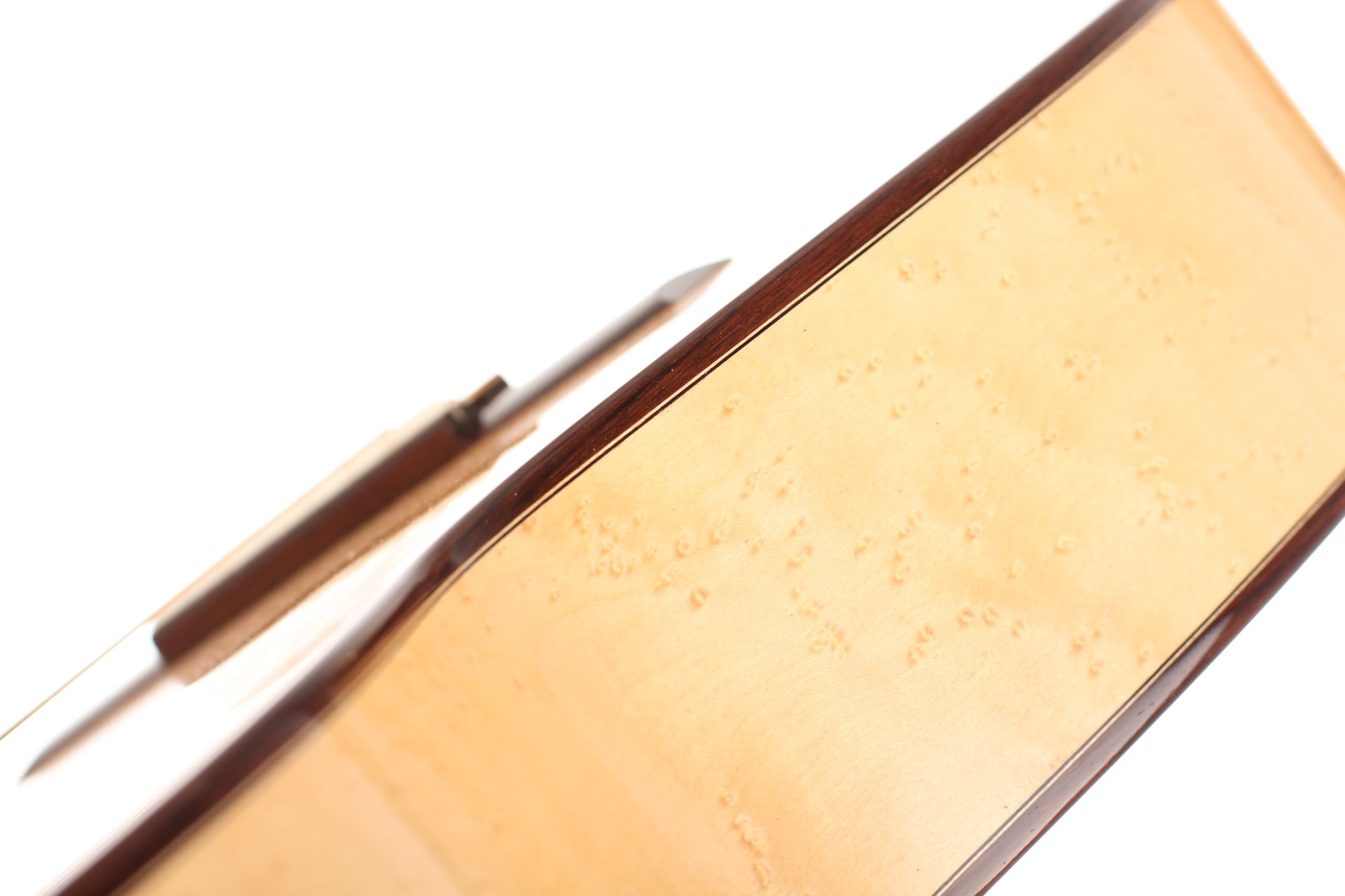 John Ray moved to Granada from his native Canada in 1989 in order to learn to build guitars. Since that time, he has benefitted from the generosity of the Granada guitar-makers, especially the late Rolf Eichinger. John has always been interested in historic guitars and is active in restorating and writing about these instruments. He has restored instruments by Miguel Rodriguez, Vicente Arias, Manuel Ramirez, Salvador Ibañez and others. The influence of the historic makers and the current makers have helped his guitars to become very popular among professional players and teachers. Guitarists find that they can shape the sound very easily with these guitars and that they are very easy to play. This guitar has a bear claw spruce top and bird’s eye maple back and sides. The tuners are made by Sloane.