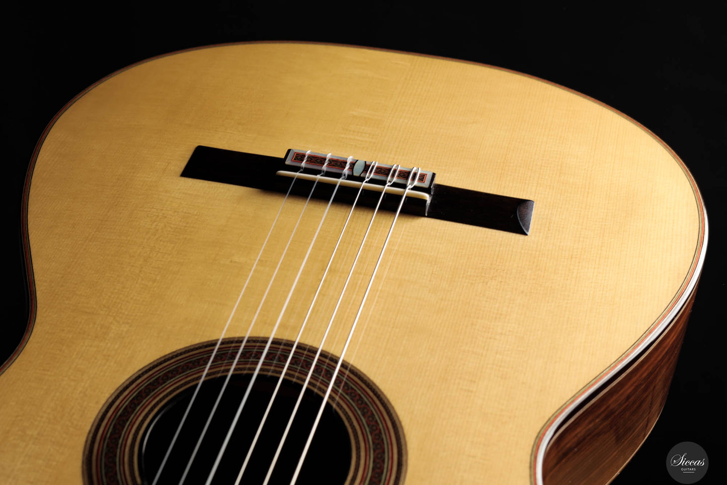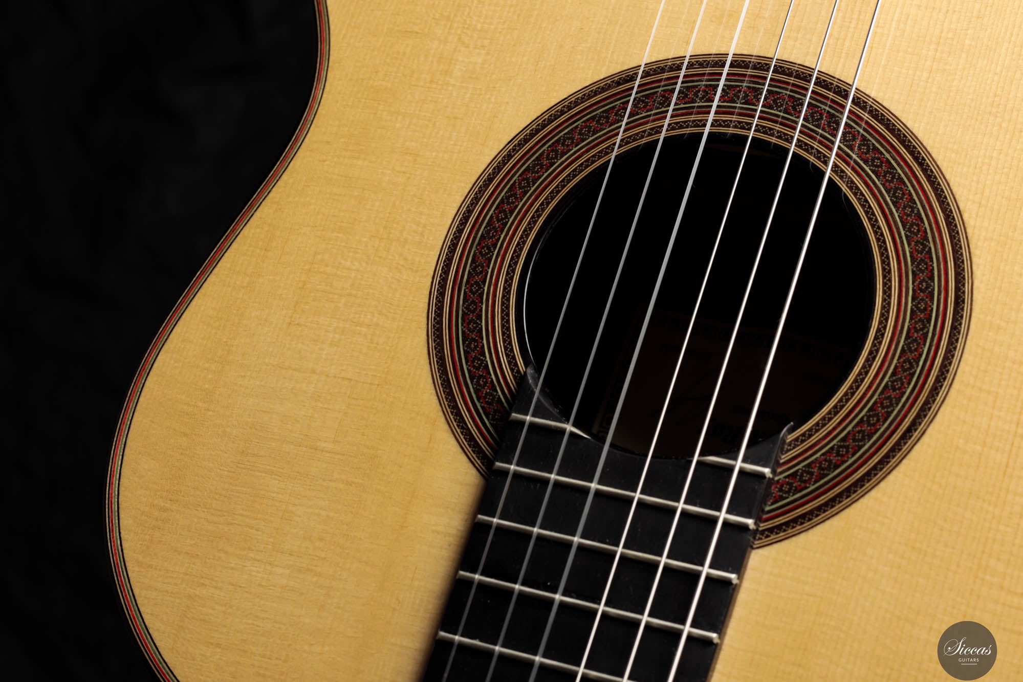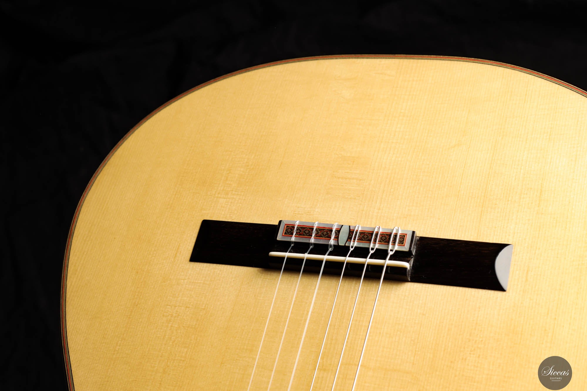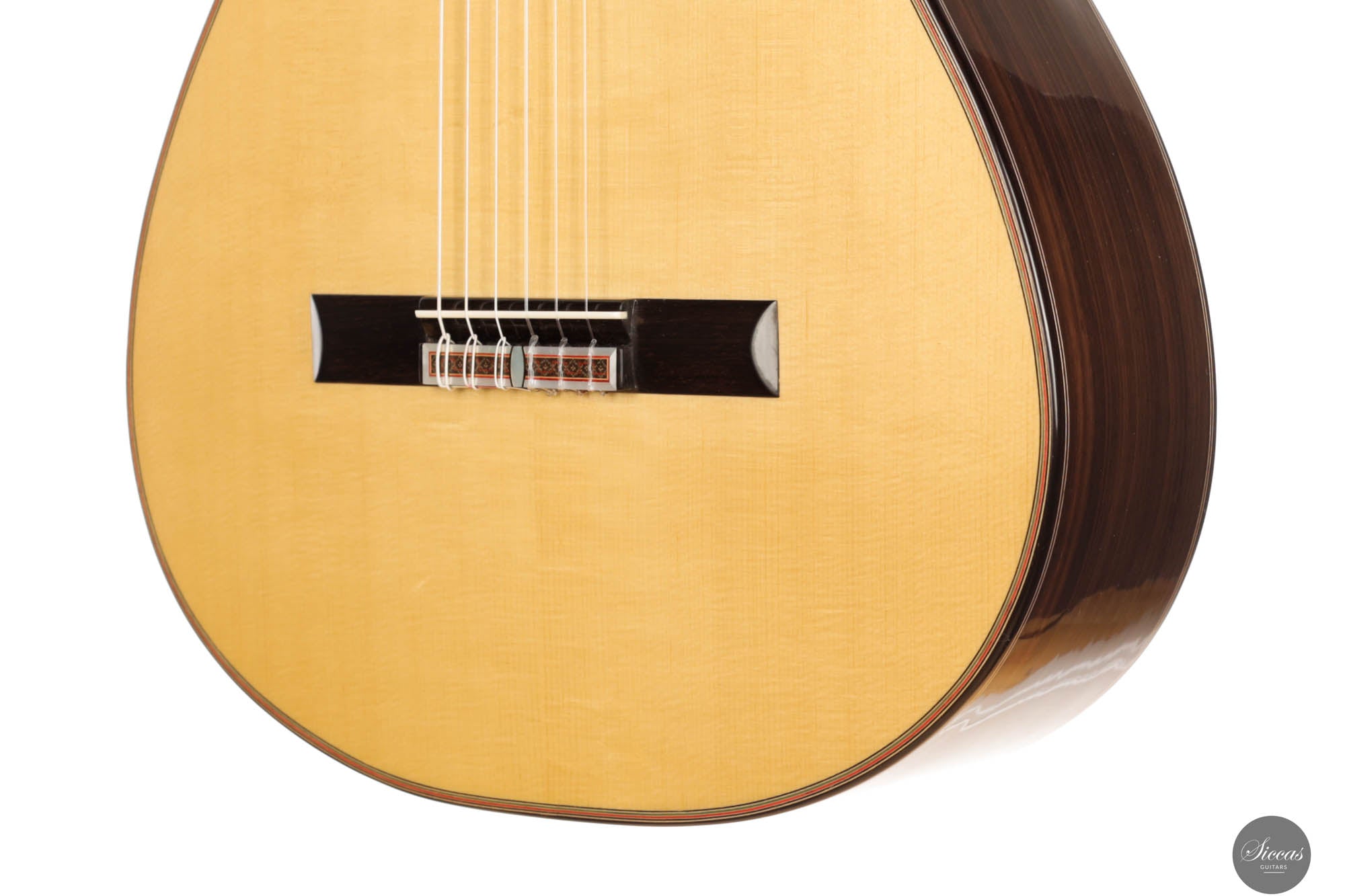 This beautiful guitar is a meticulously crafted replica of a Simplicio guitar. John's goal was not only to create an instrument that closely resembles the original aesthetically, but also one that adheres to the original dimensions, playability, and tonal qualites. The top of this guitar is made from spruce, while the back and sides are crafted from Indian rosewood. The sound is warmly inviting and mellow, with an exceptionally round and resonant mid-range that captivates the listener. The headstock is intricately carved and complemented by elegant Rodgers tuners, giving the instrument a refined beauty that echoes the work of master luthiers.