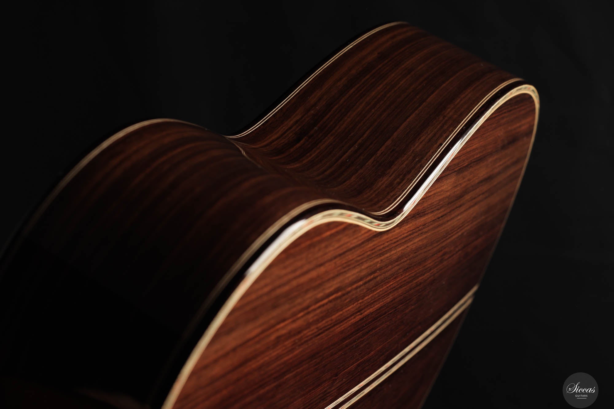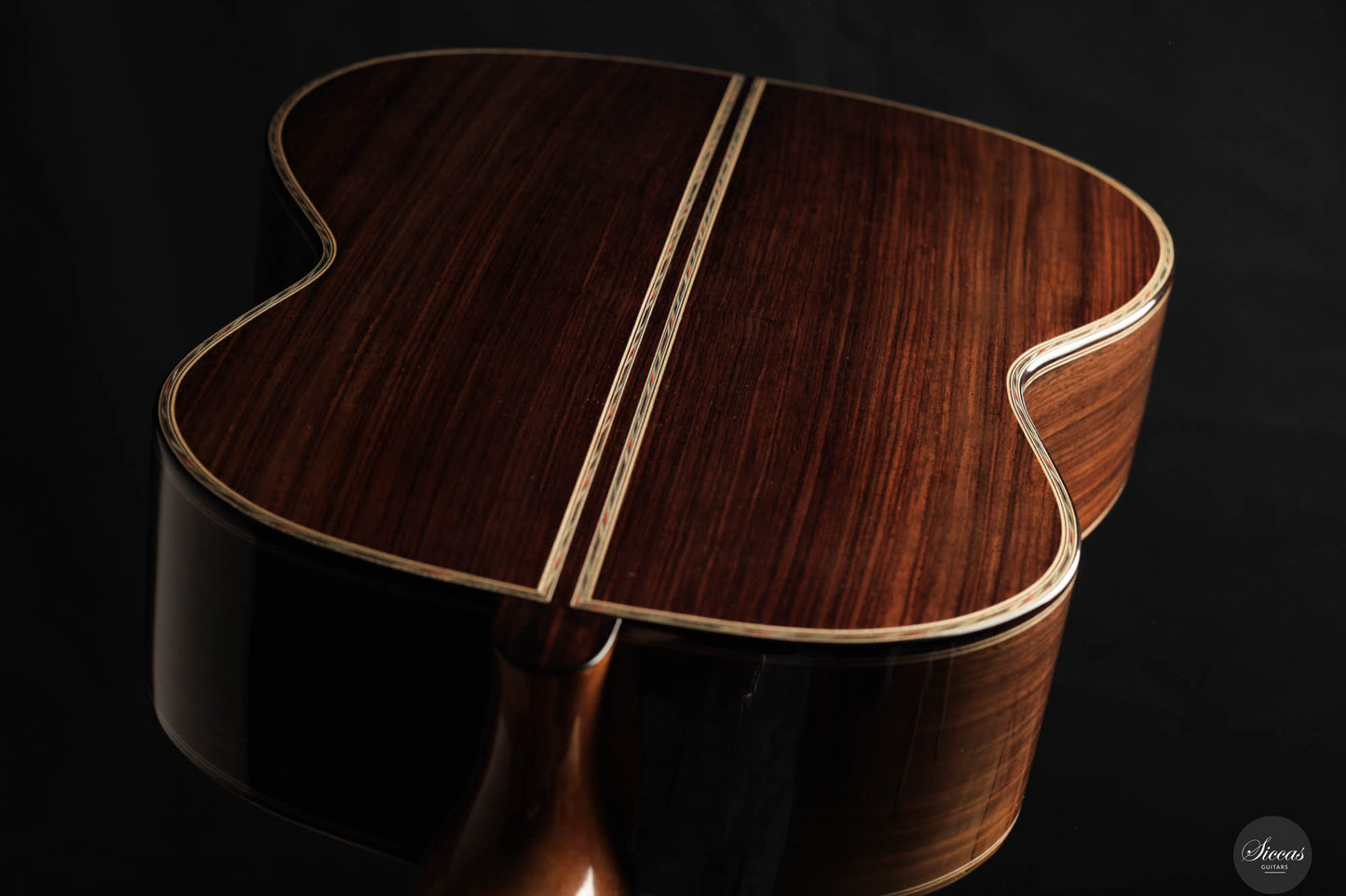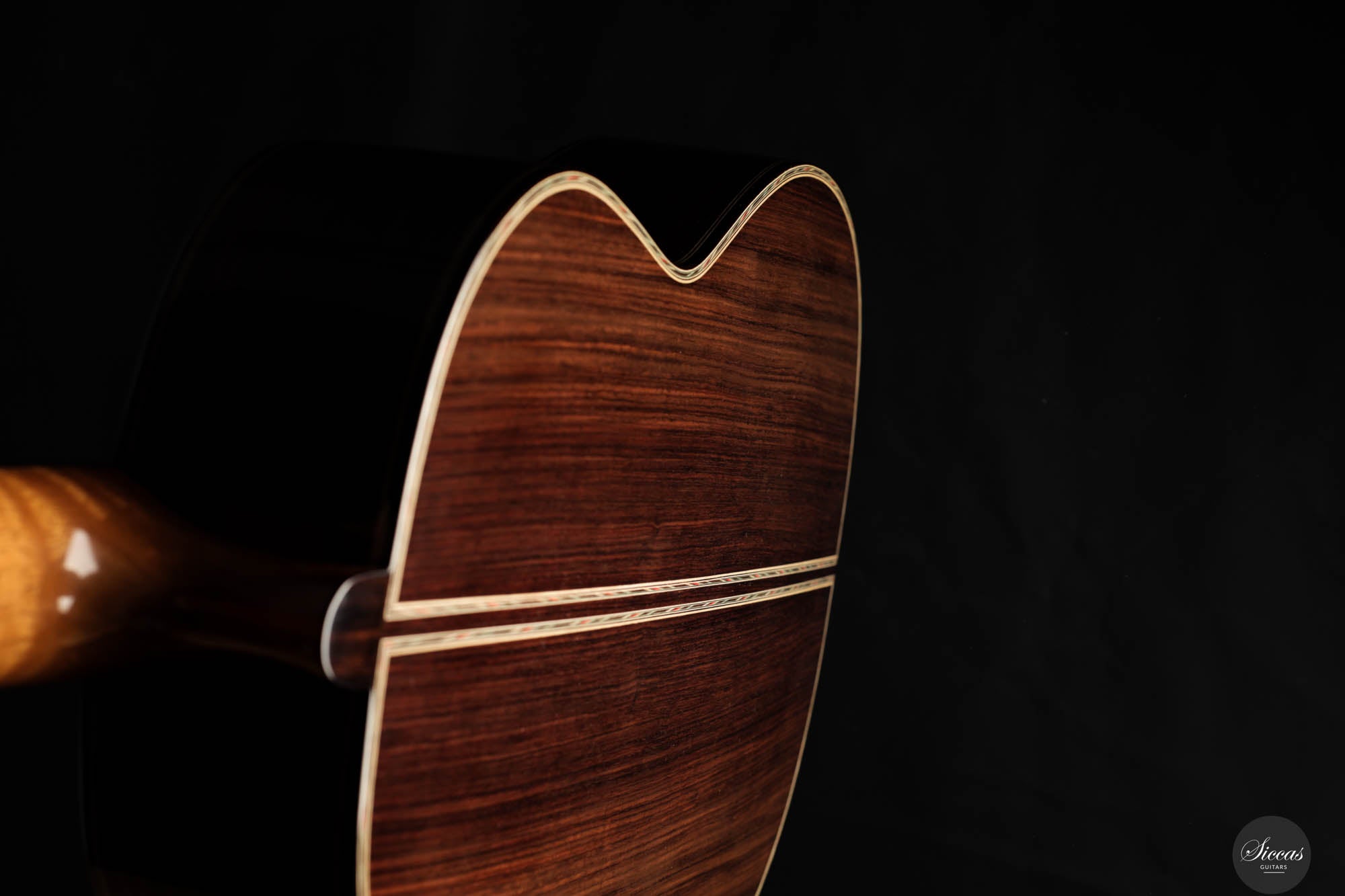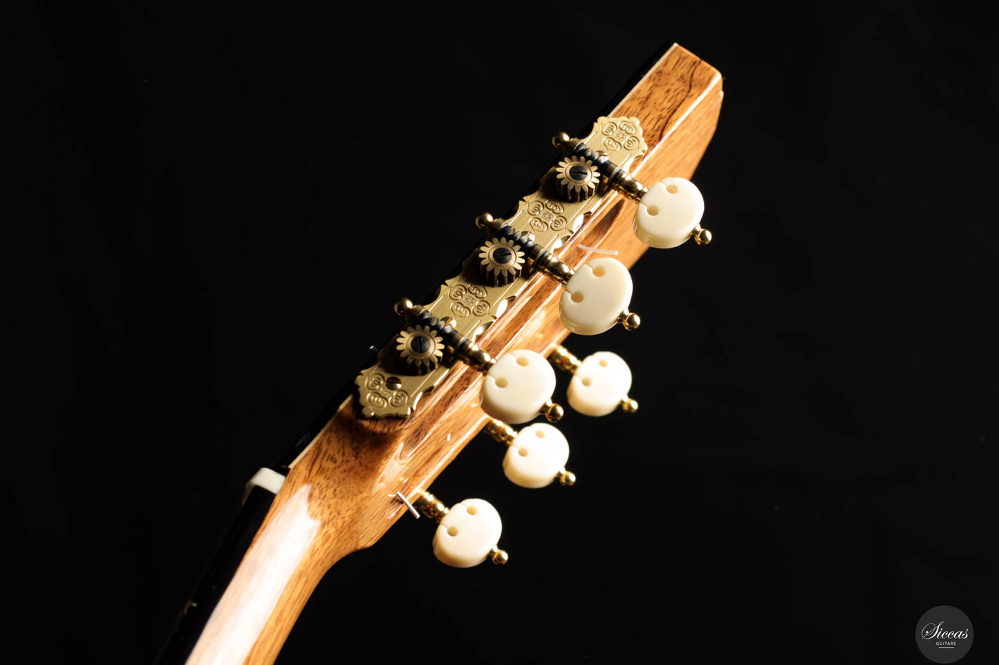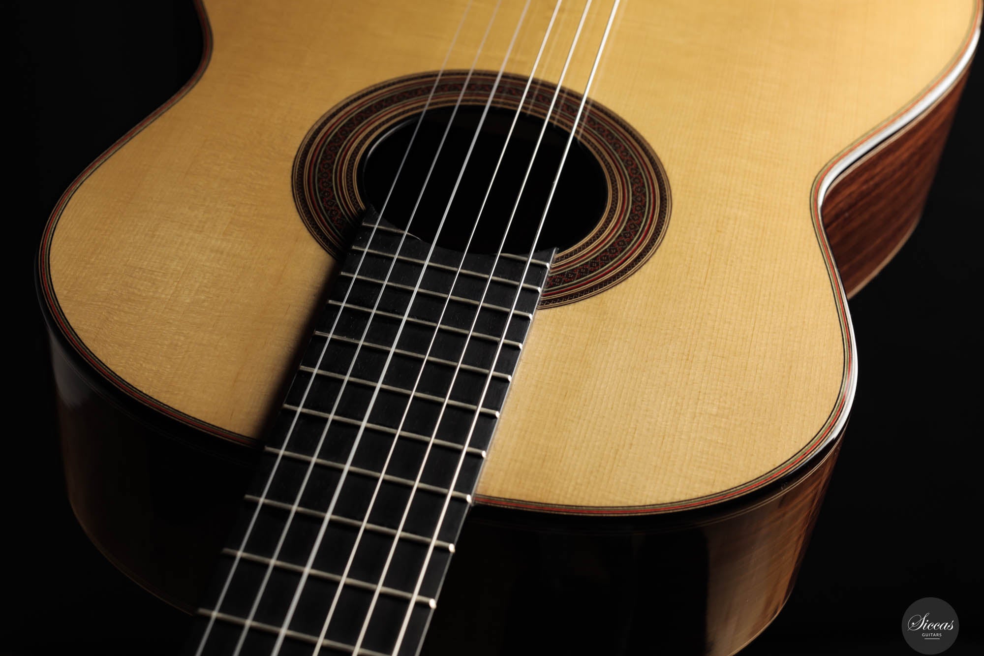 This beautiful guitar is a meticulously crafted replica of a Simplicio guitar. John's goal was not only to create an instrument that closely resembles the original aesthetically, but also one that adheres to the original dimensions, playability, and tonal qualites. The top of this guitar is made from spruce, while the back and sides are crafted from Indian rosewood. The sound is warmly inviting and mellow, with an exceptionally round and resonant mid-range that captivates the listener. The headstock is intricately carved and complemented by elegant Rodgers tuners, giving the instrument a refined beauty that echoes the work of master luthiers.