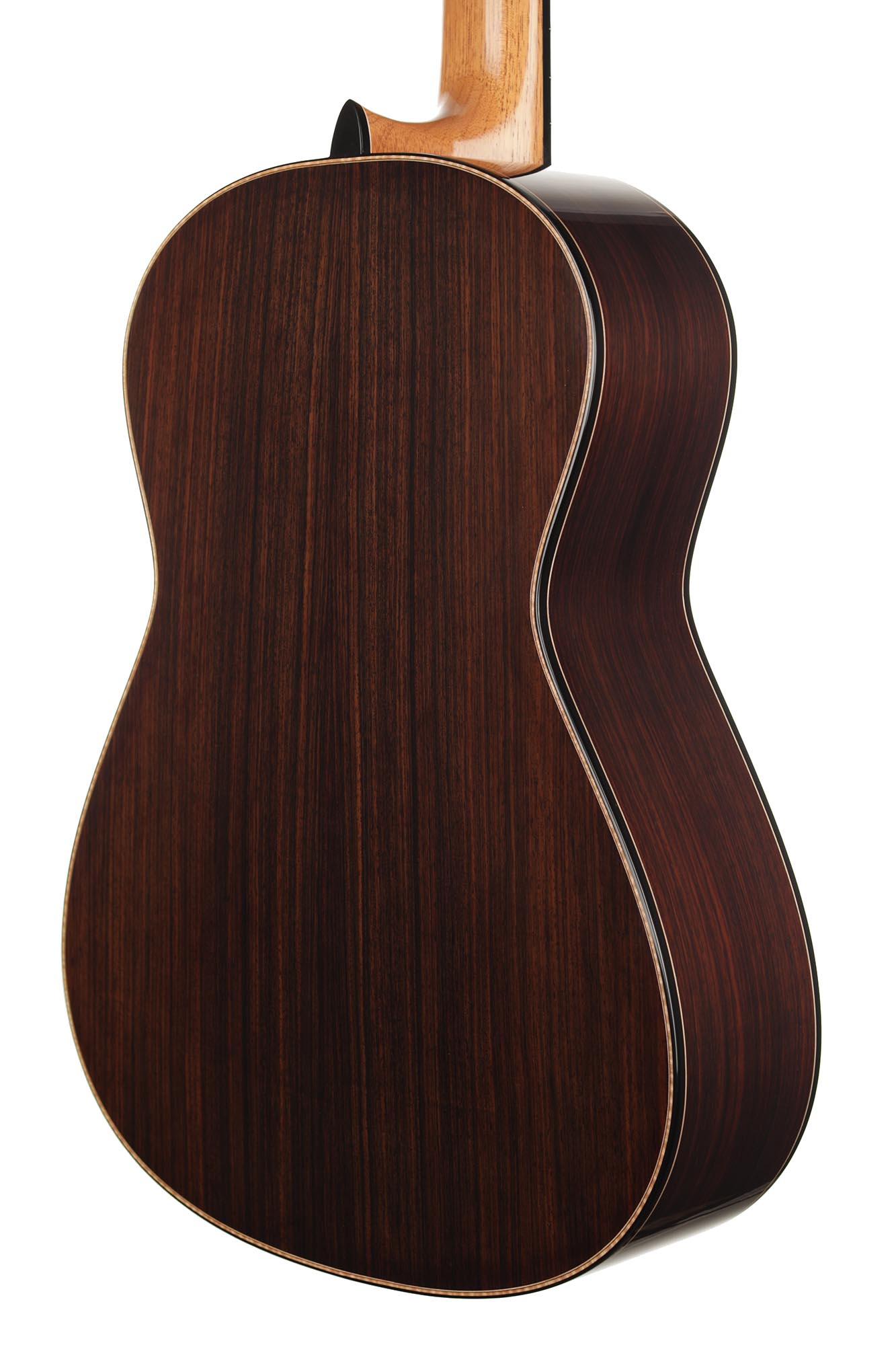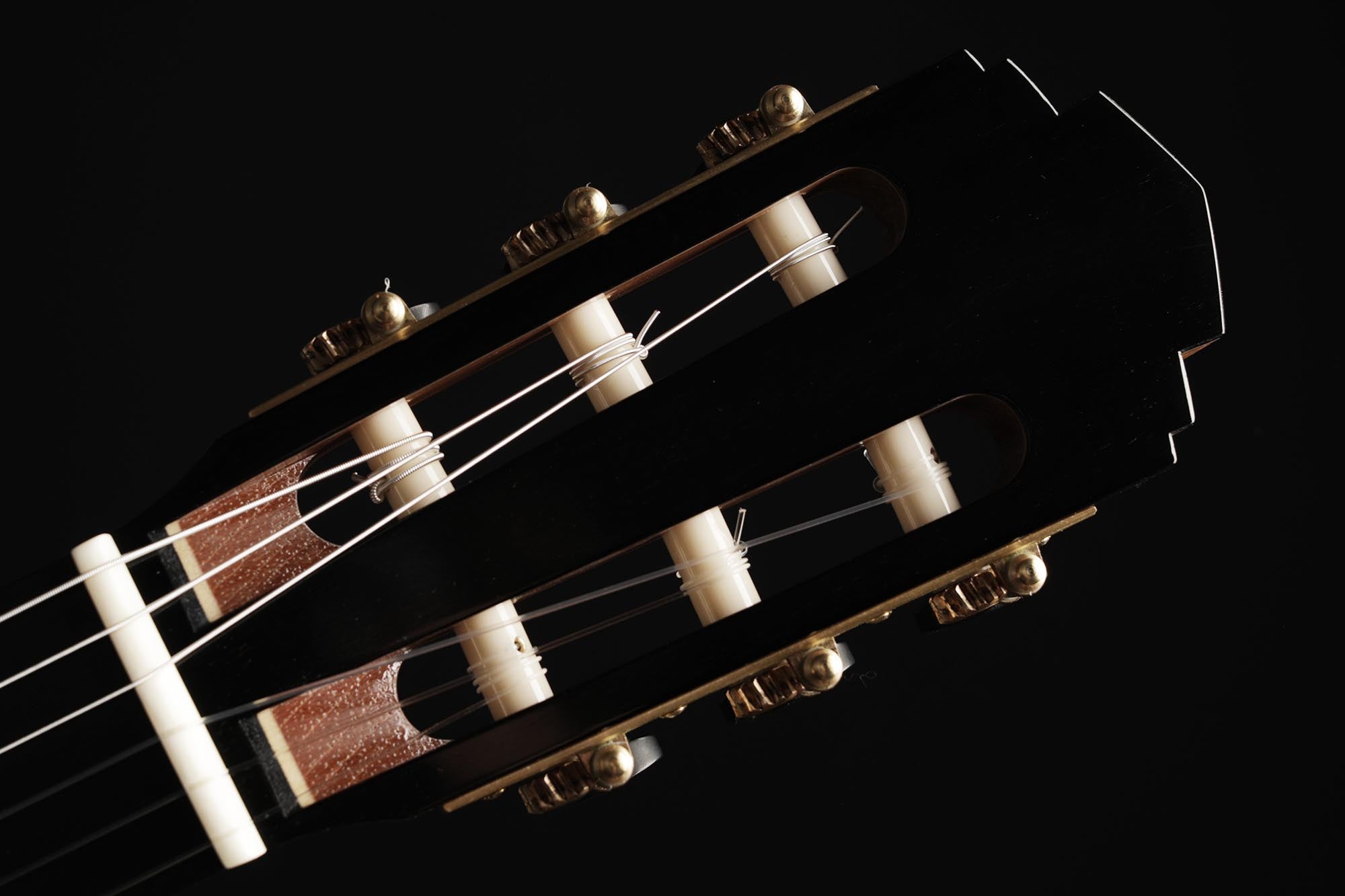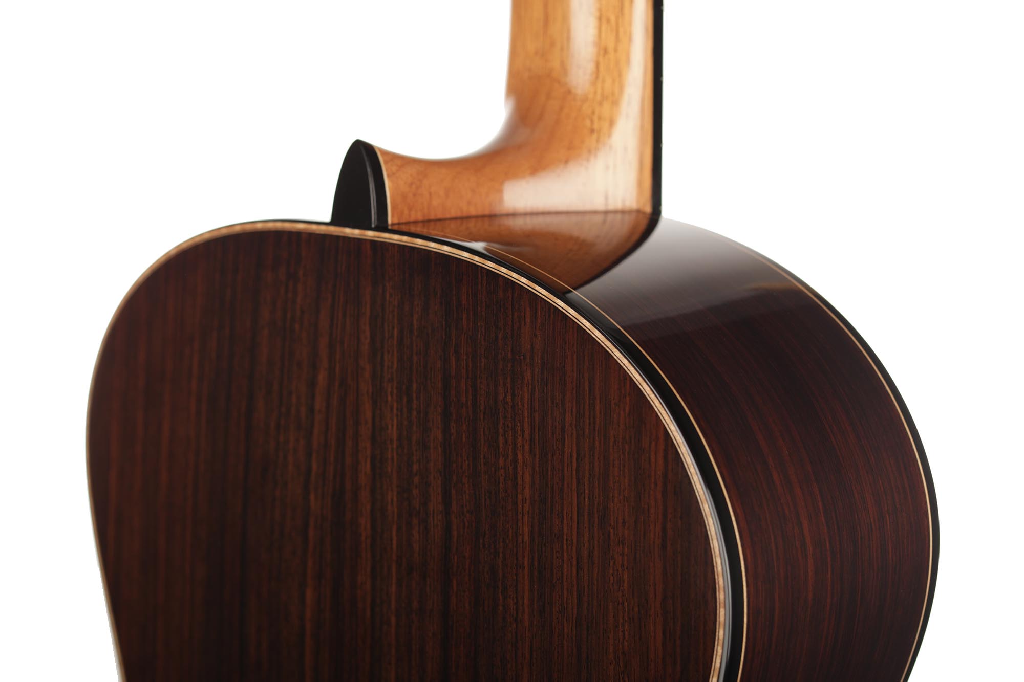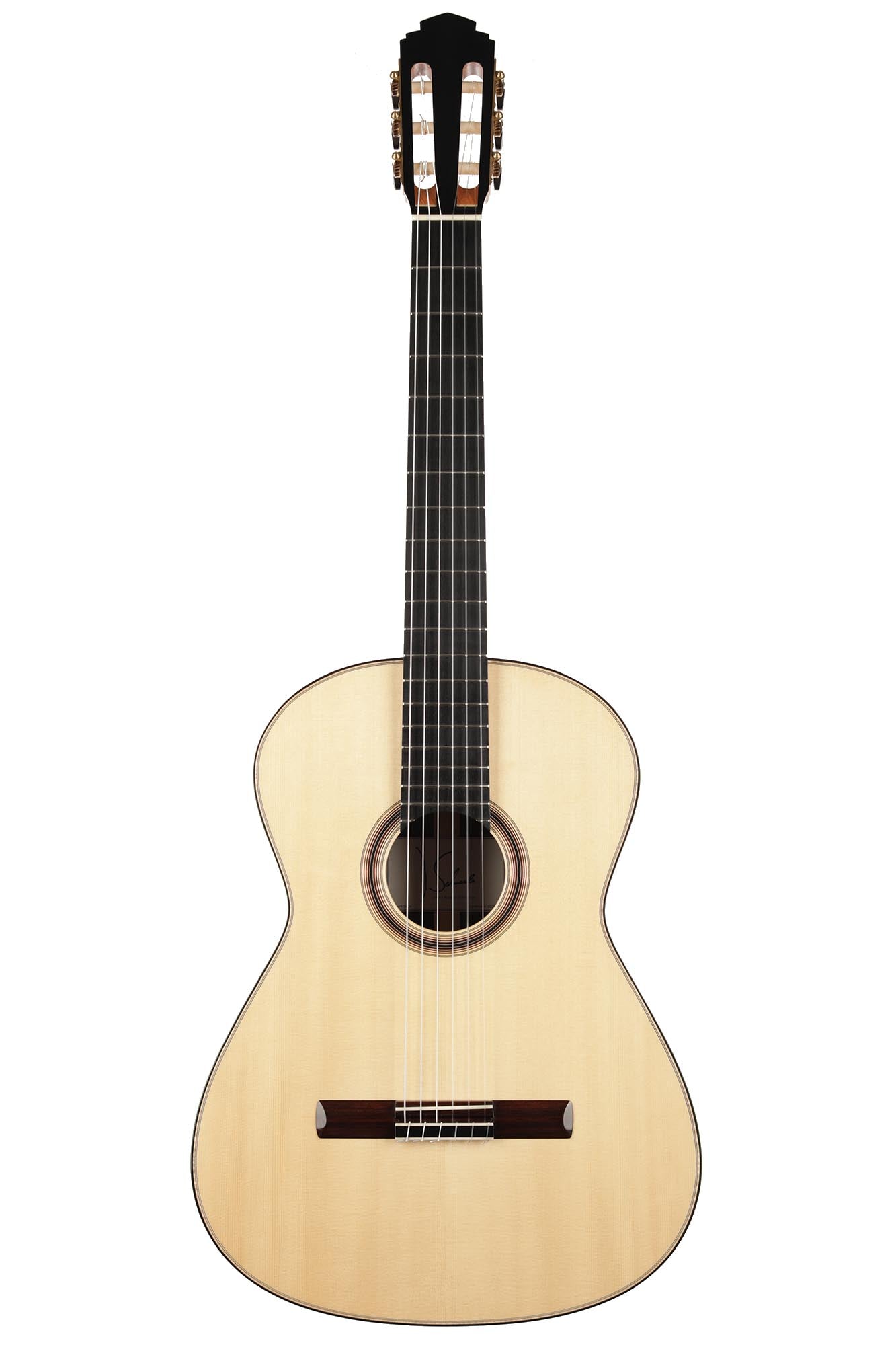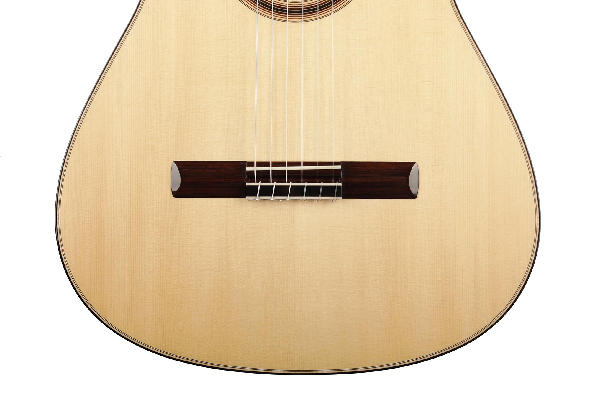 Many details such as the raised fingerboard, the slight radius of the fretboard, and the sober and thoughtful decoration show the modern commitment of this craftsman. Both the power of expression and the malleability of the tone are the main strengths of this guitar. It is truly an instrument that can impress in a concert hall and offers the guitarist complete freedom in terms of timbre, tone color, and dynamics. In addition, the compromise between responsiveness, sustain, and richness of tone is very well achieved. And finally, this instrument seduces and convinces even the most demanding guitarist with its impeccable playing comfort.