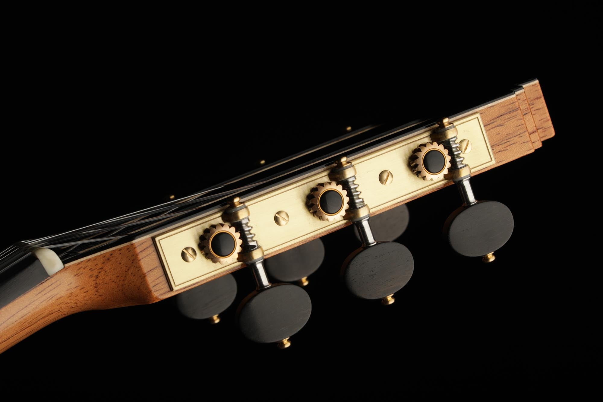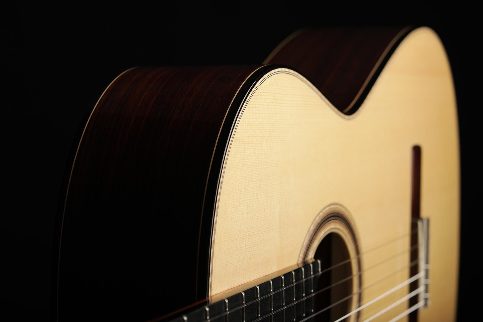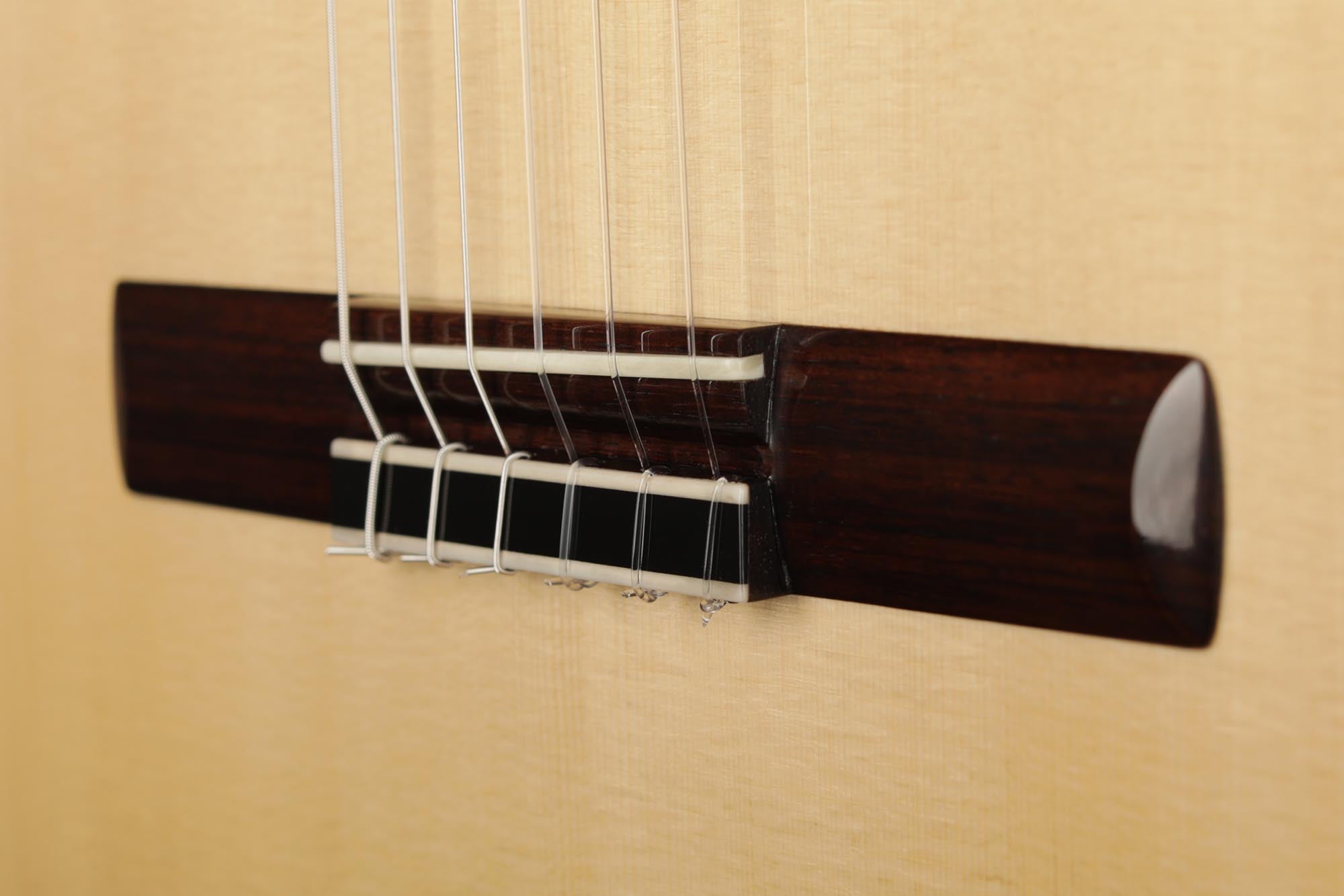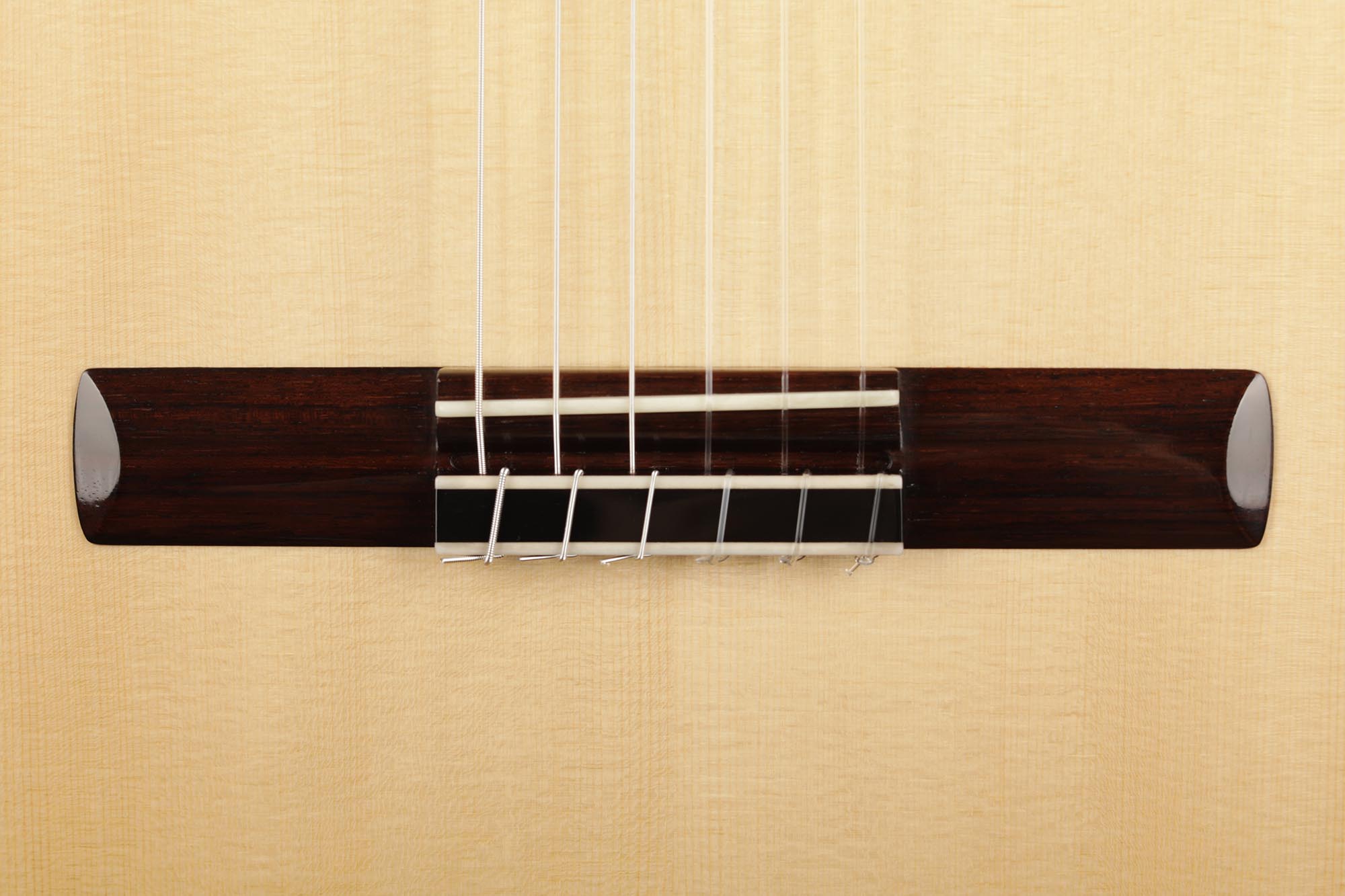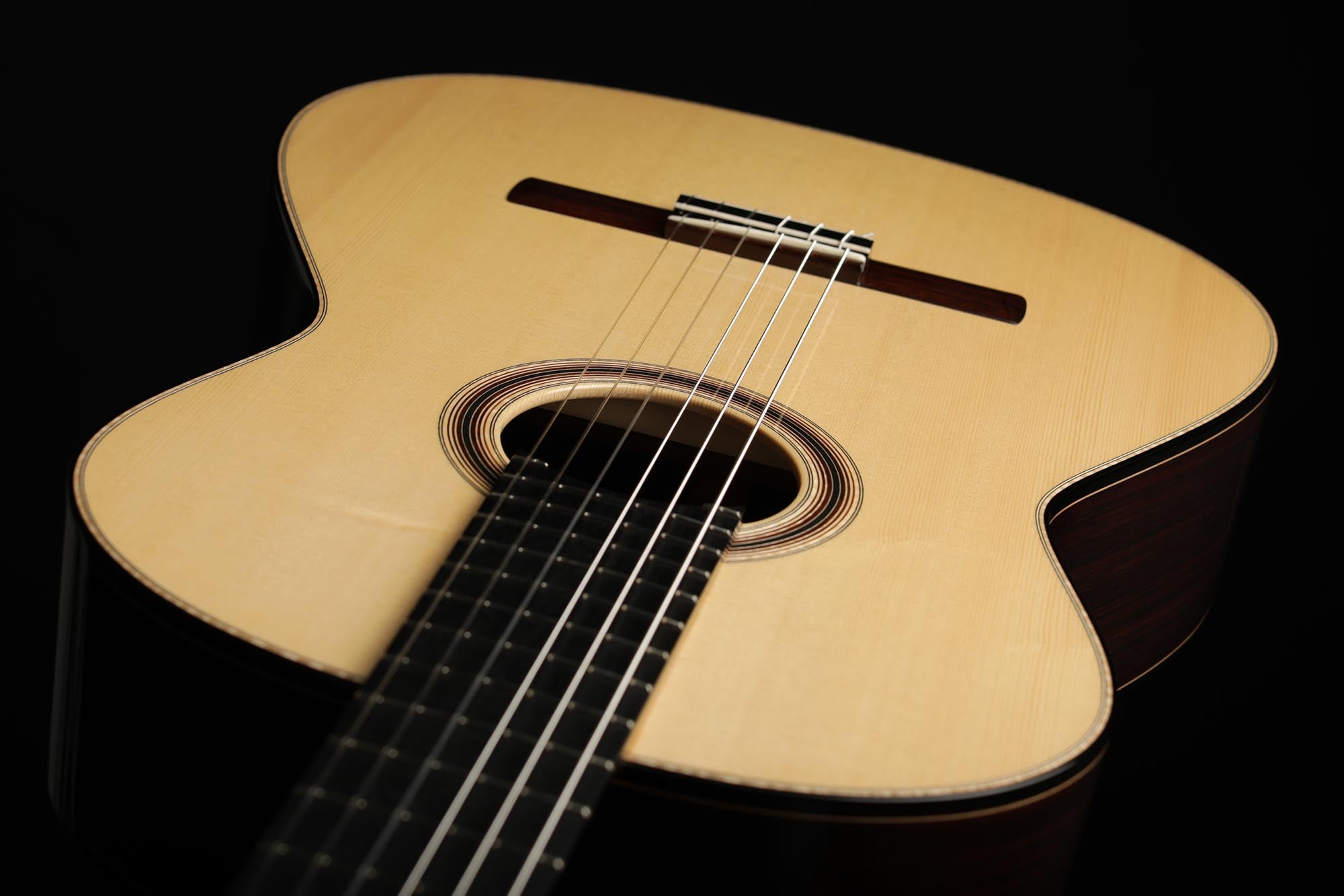 Many details such as the raised fingerboard, the slight radius of the fretboard, and the sober and thoughtful decoration show the modern commitment of this craftsman. Both the power of expression and the malleability of the tone are the main strengths of this guitar. It is truly an instrument that can impress in a concert hall and offers the guitarist complete freedom in terms of timbre, tone color, and dynamics. In addition, the compromise between responsiveness, sustain, and richness of tone is very well achieved. And finally, this instrument seduces and convinces even the most demanding guitarist with its impeccable playing comfort.