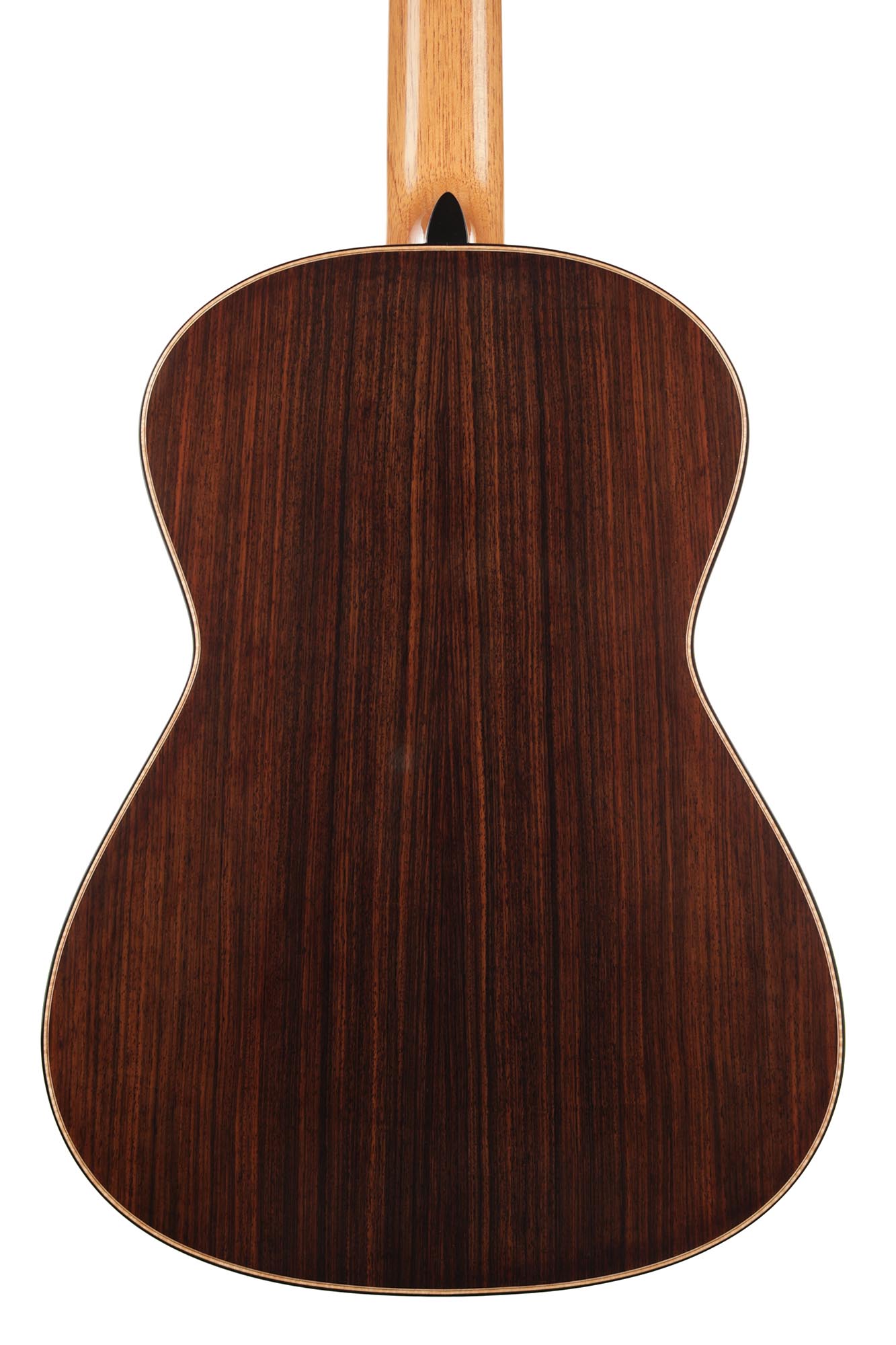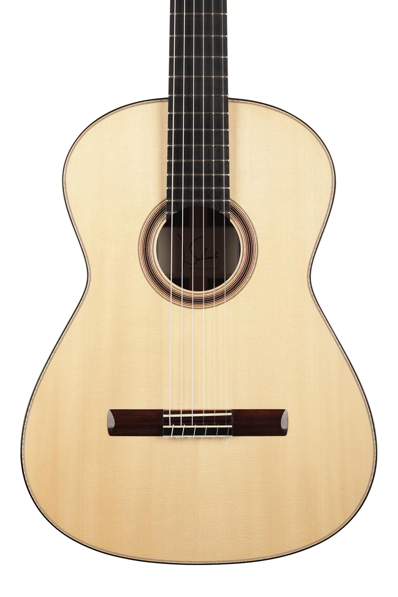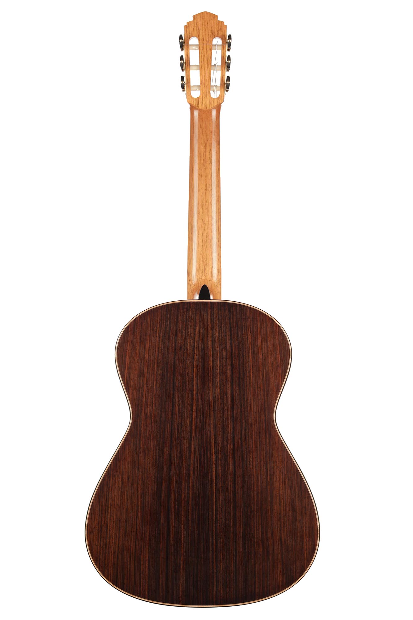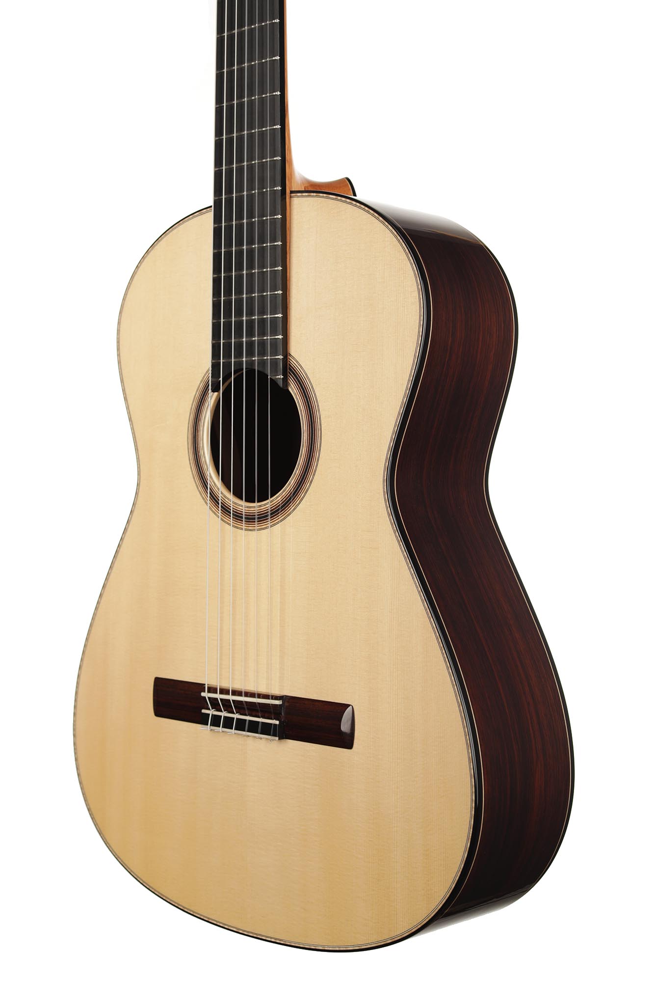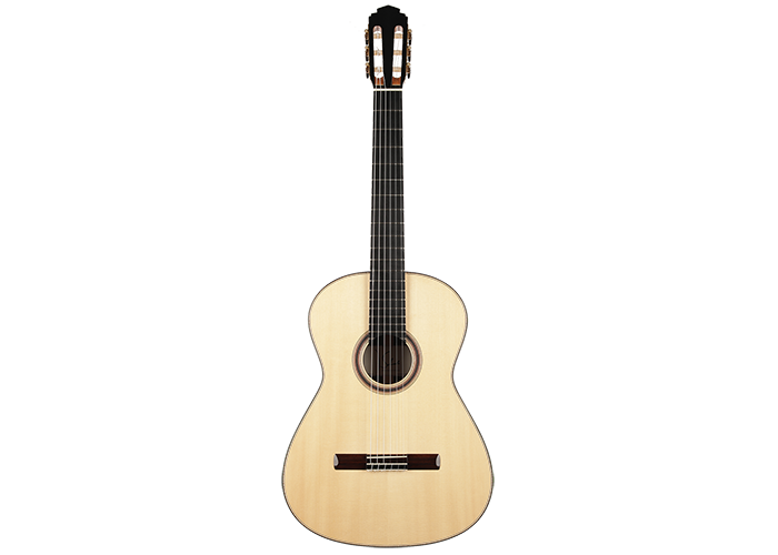 Many details such as the raised fingerboard, the slight radius of the fretboard, and the sober and thoughtful decoration show the modern commitment of this craftsman. Both the power of expression and the malleability of the tone are the main strengths of this guitar. It is truly an instrument that can impress in a concert hall and offers the guitarist complete freedom in terms of timbre, tone color, and dynamics. In addition, the compromise between responsiveness, sustain, and richness of tone is very well achieved. And finally, this instrument seduces and convinces even the most demanding guitarist with its impeccable playing comfort.