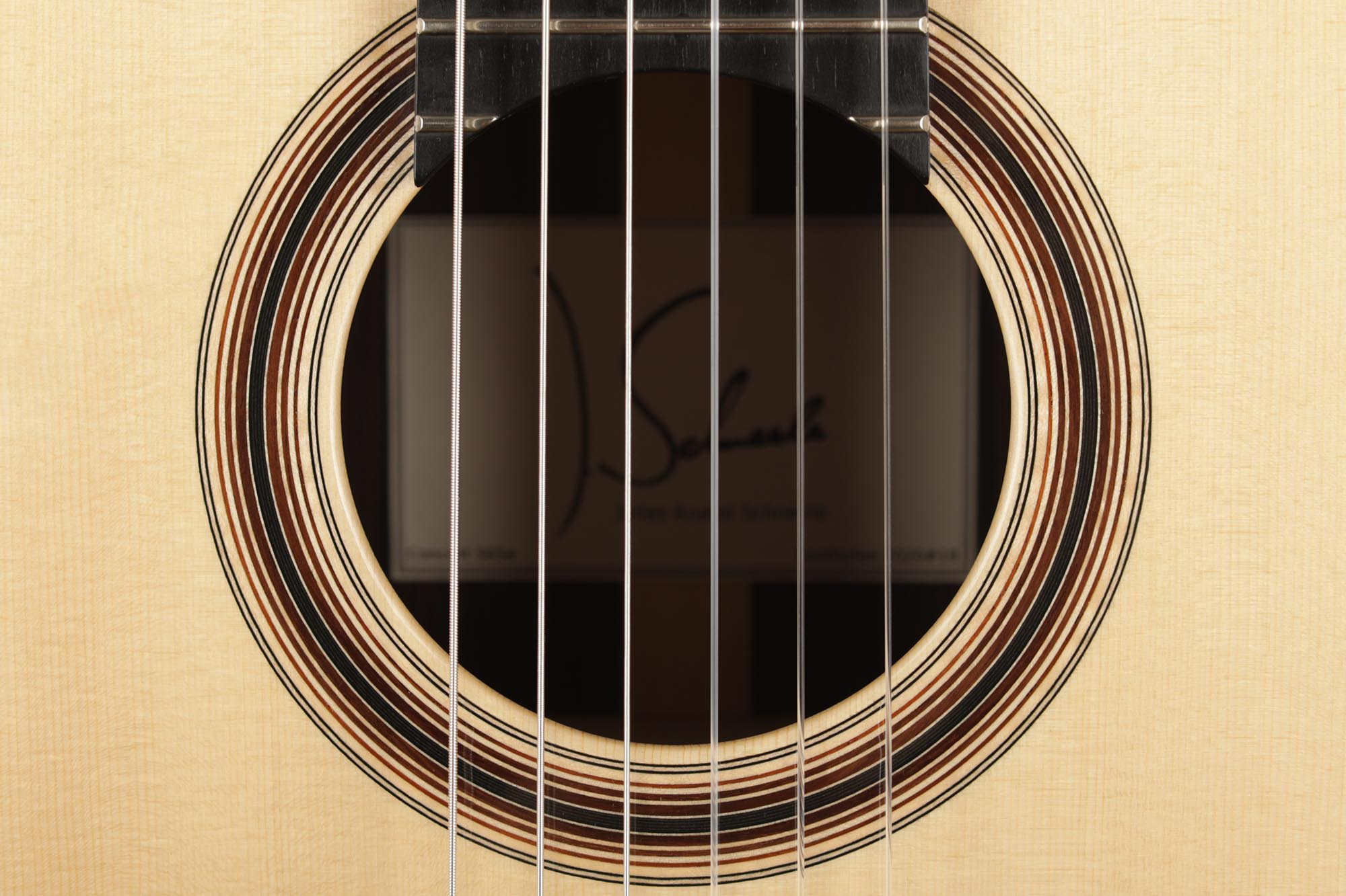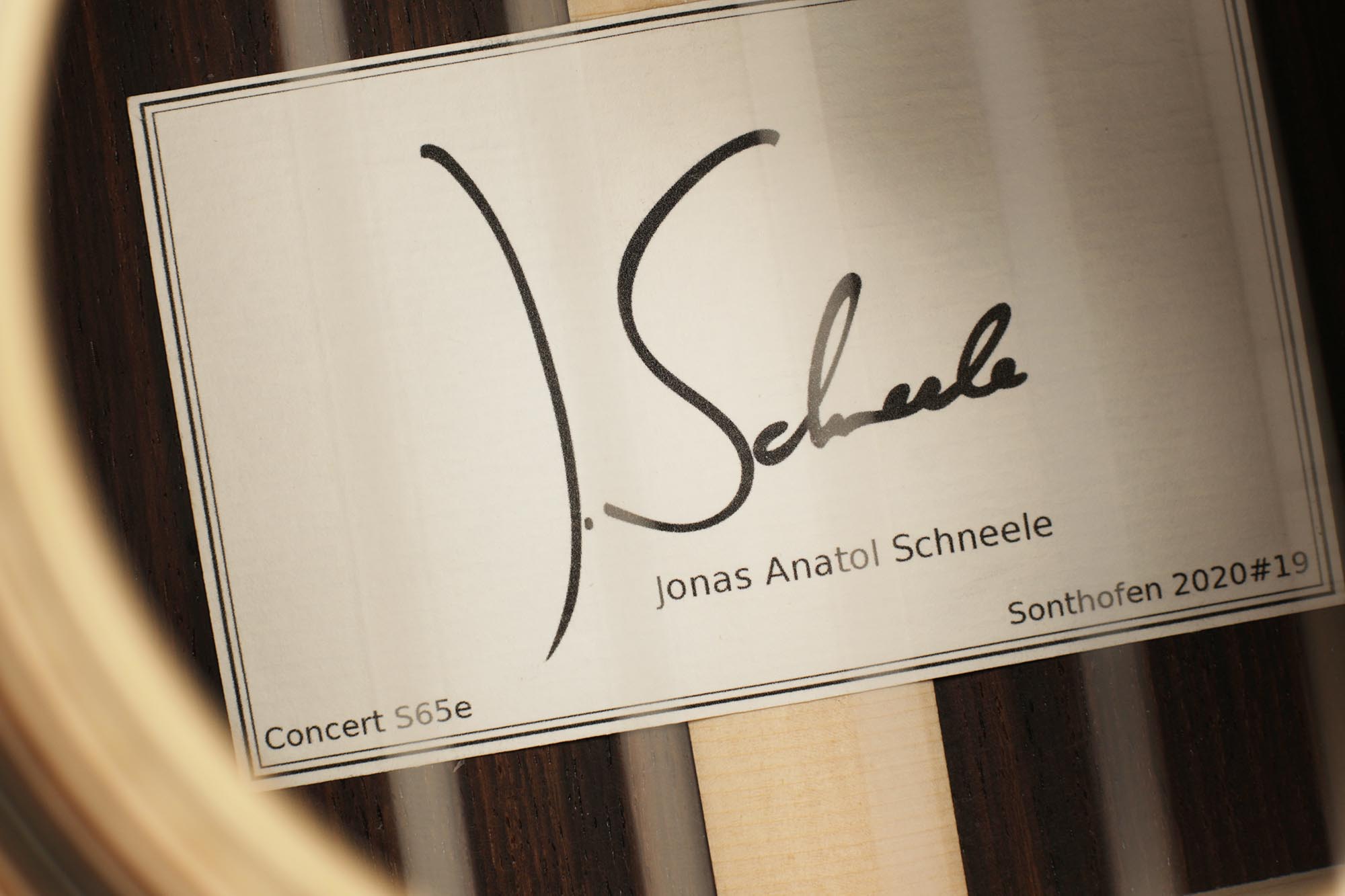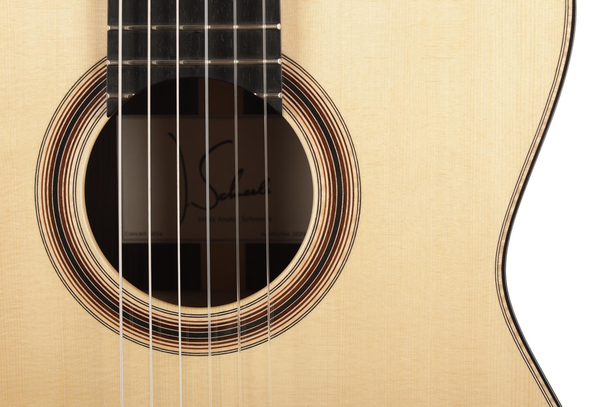 This guitar is constructed according to the Spanish construction method. The top is domed, especially light and stiff, and built with a 7-fan bracing. The instrument is the result of combining traditional Spanish guitar making with innovative methods of today's musical instrument building. It is the most precious model by J. Schneele and has a unique design. This Concert model is designed in the "Golden Ratio". The proportions of the body, the dimensions of the bridge, the head, and the rosette are related to the length of the scale. The bracing of the soundboard is structured in harmonious sounding proportions in order to create a sound image that is extremely balanced.