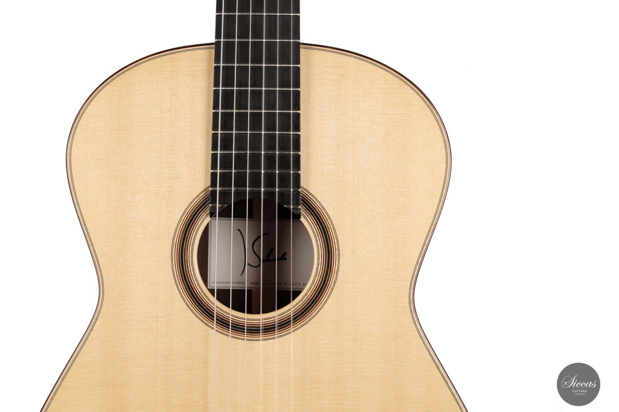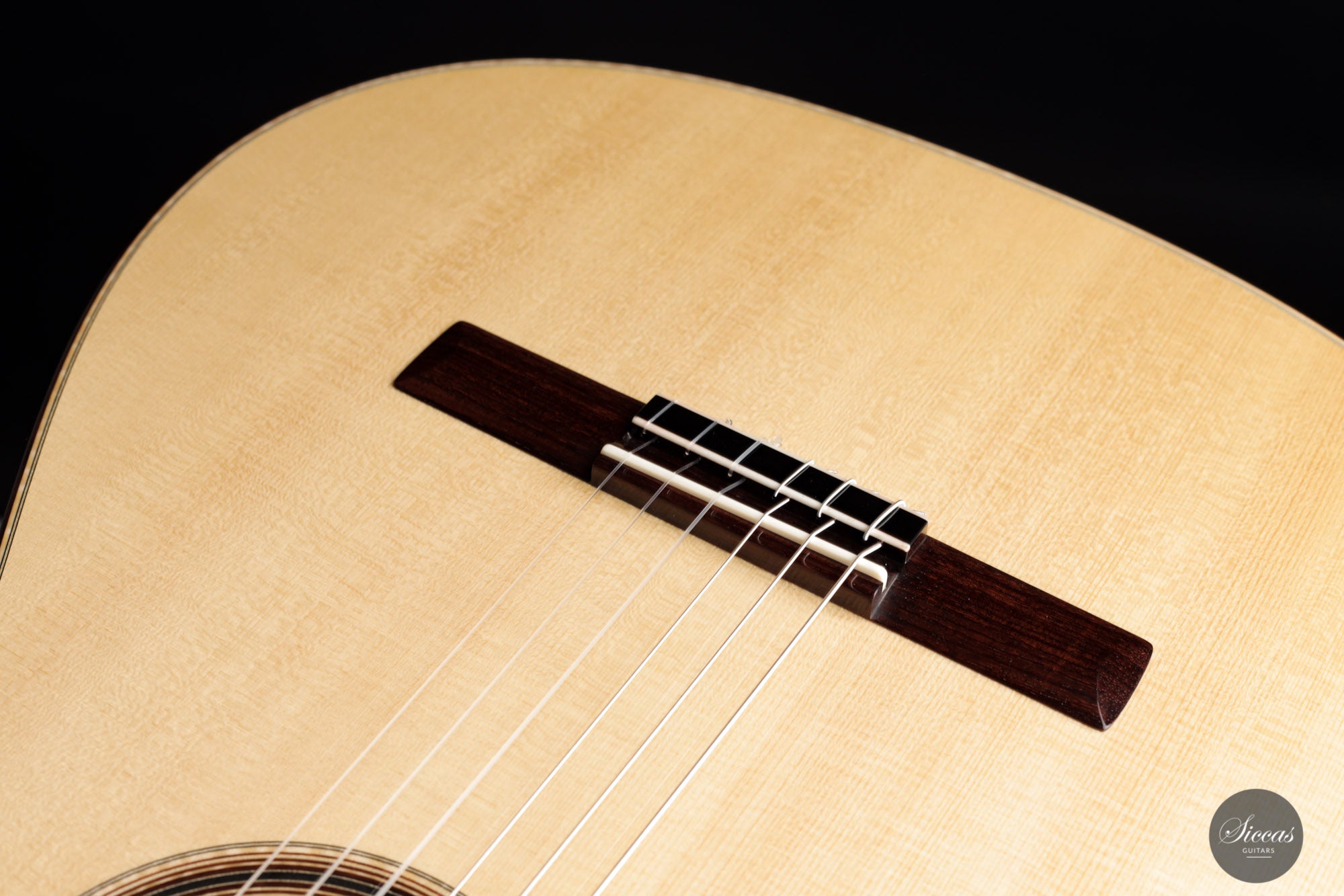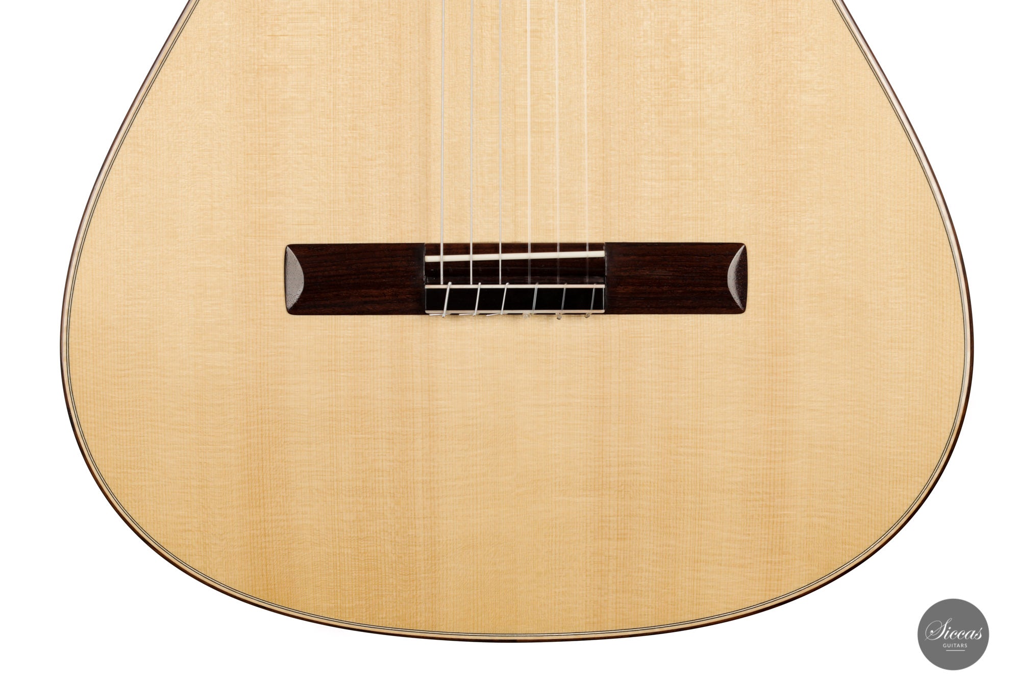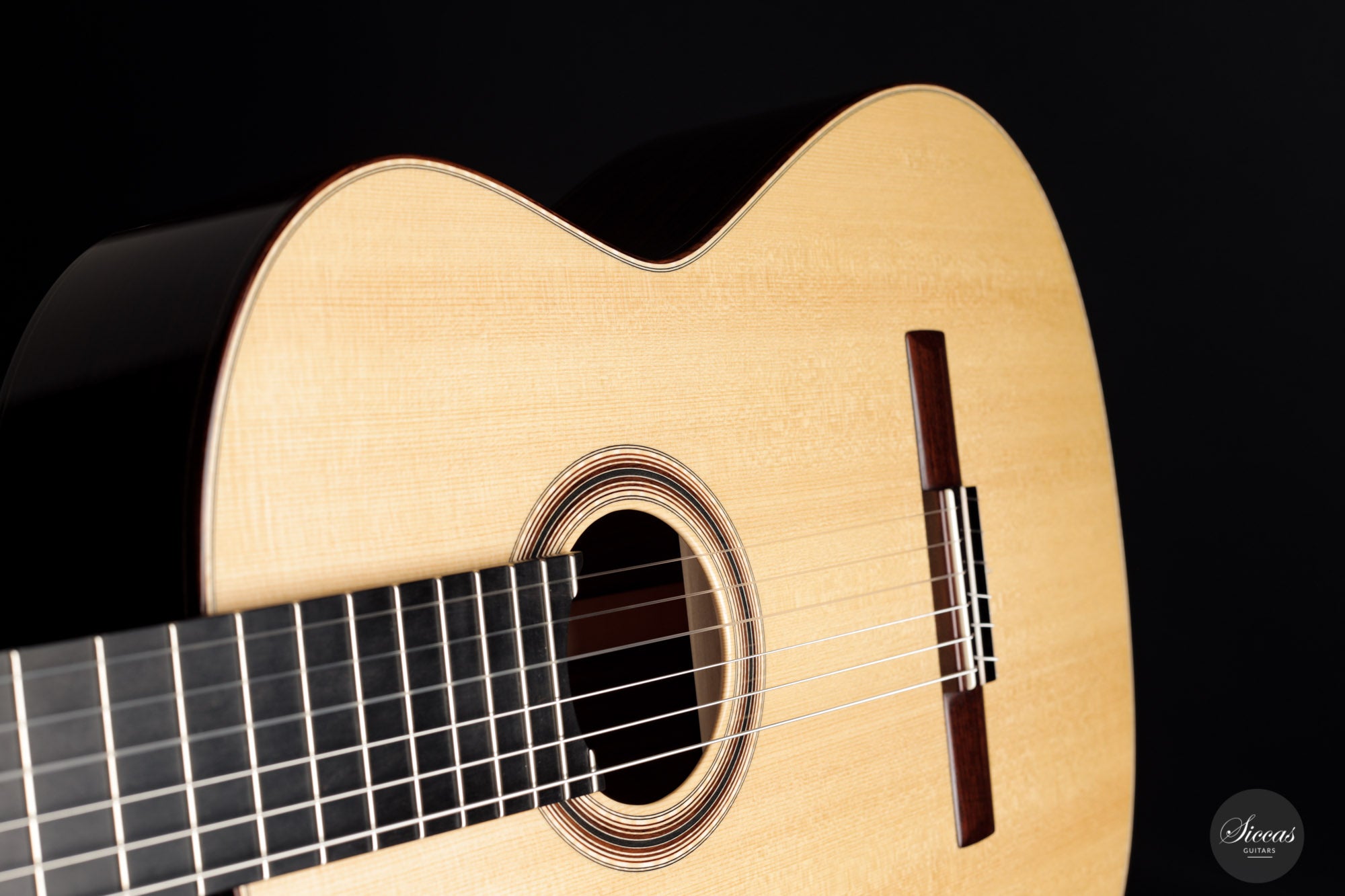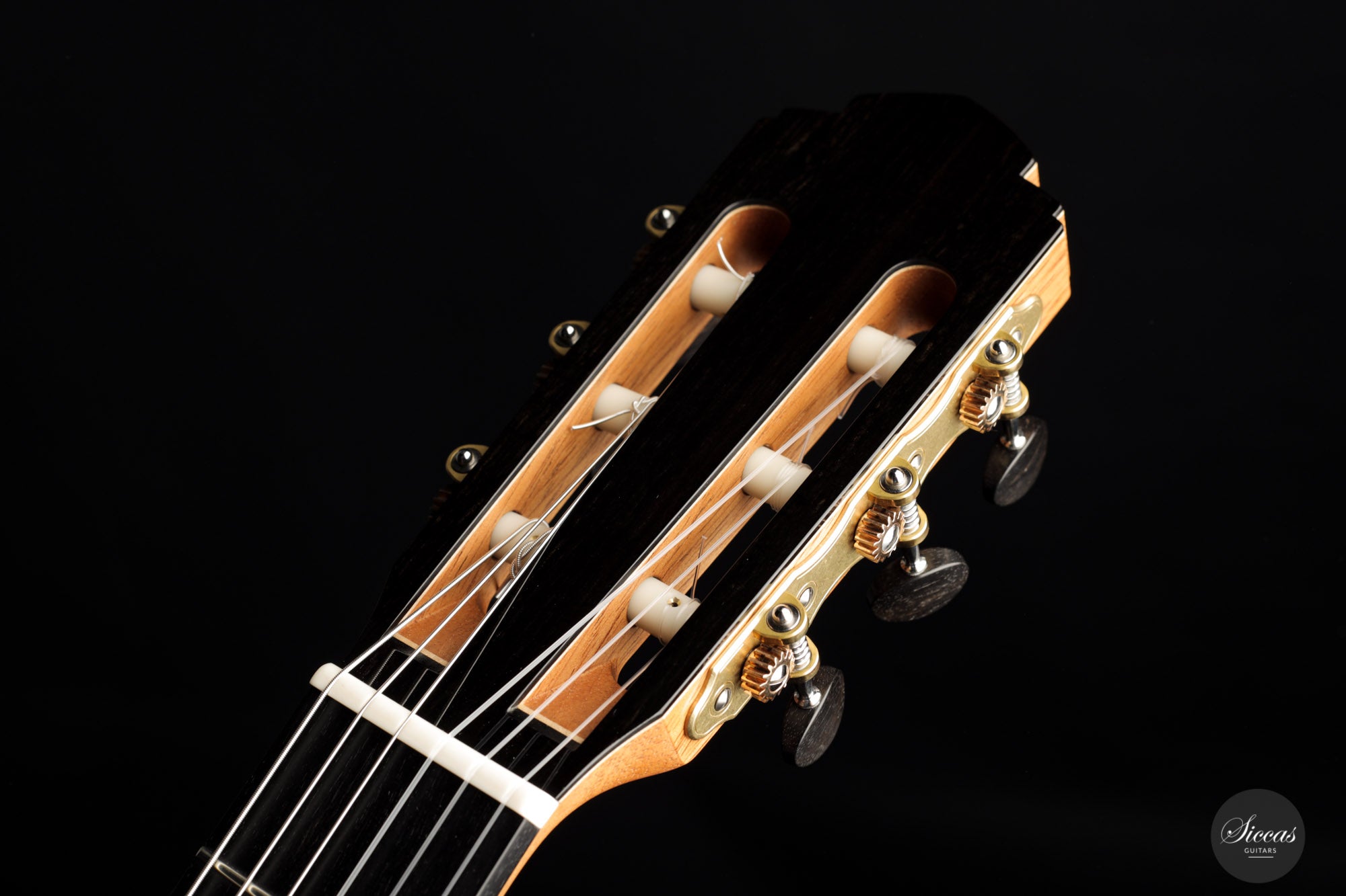 Many details such as the raised fingerboard, the slight radius of the fretboard, and the sober and thoughtful decoration show the modern commitment of this craftsman. Both the power of expression and the malleability of the tone are the main strengths of this guitar. It is truly an instrument that can impress in a concert hall and offers the guitarist complete freedom in terms of timbre, tone color, and dynamics. In addition, the compromise between responsiveness, sustain, and richness of tone is very well achieved. And finally, this instrument seduces and convinces even the most demanding guitarist with its impeccable playing comfort.