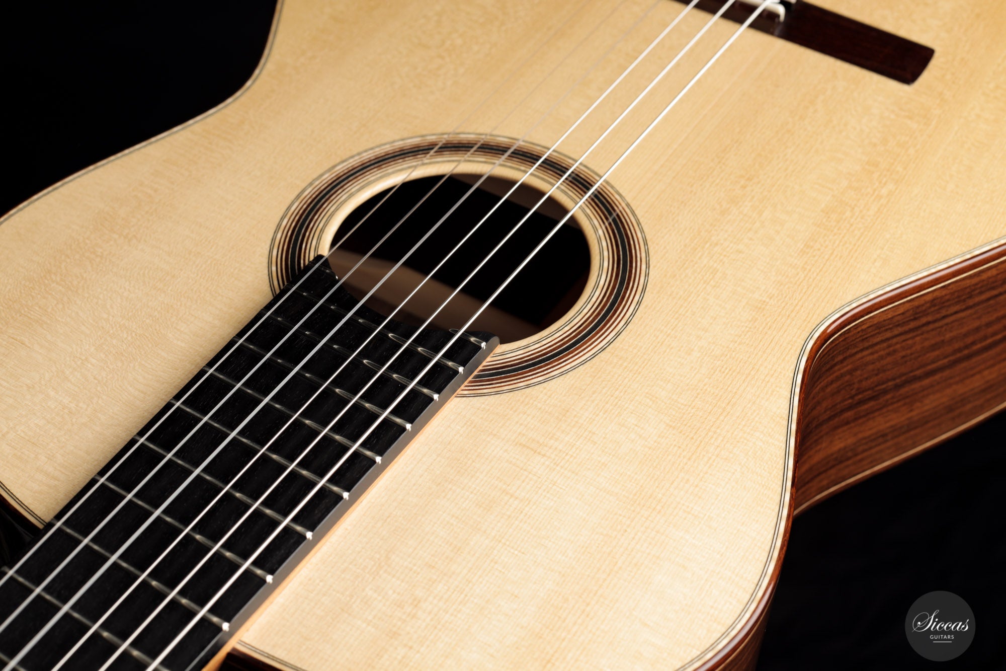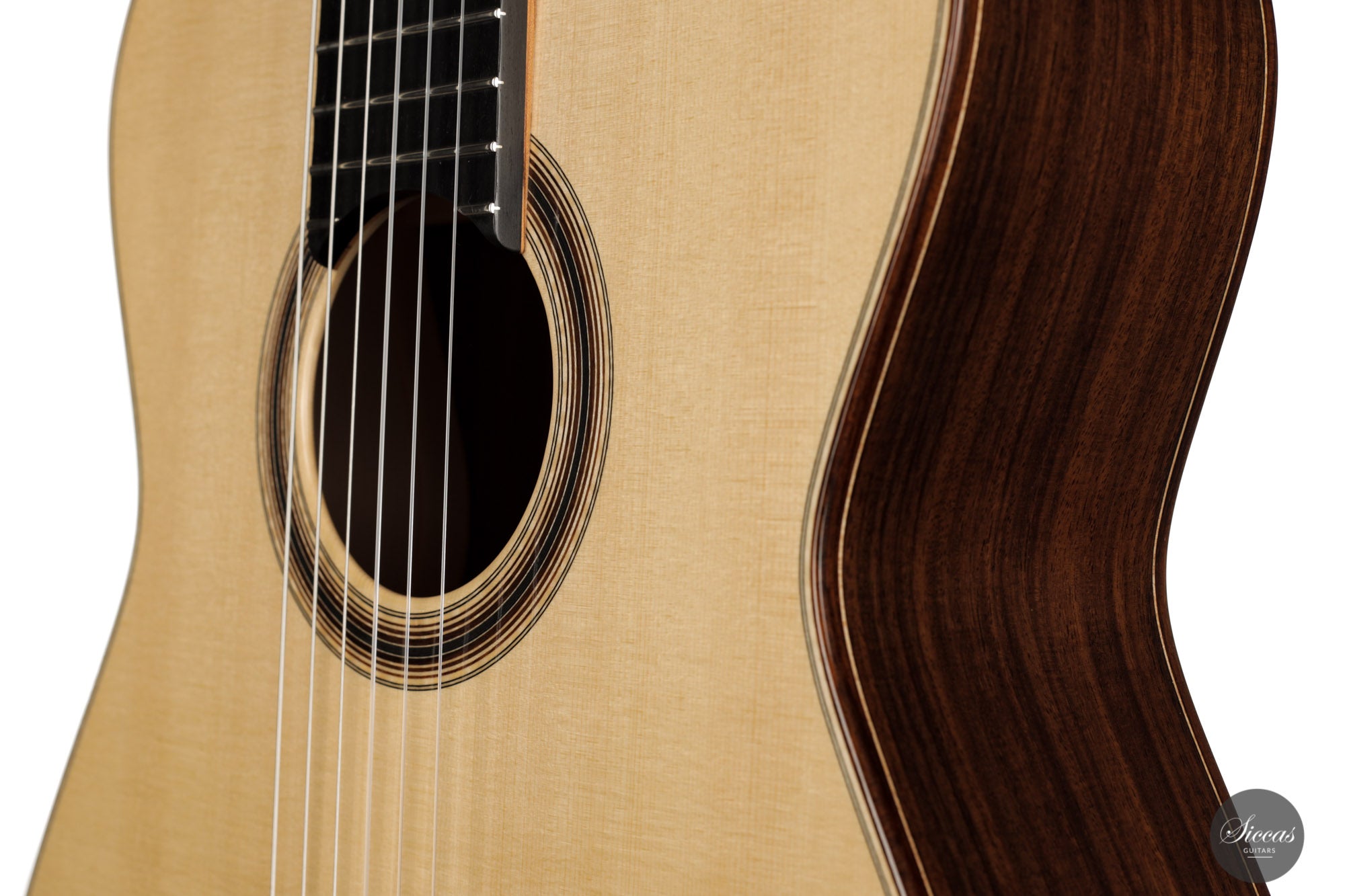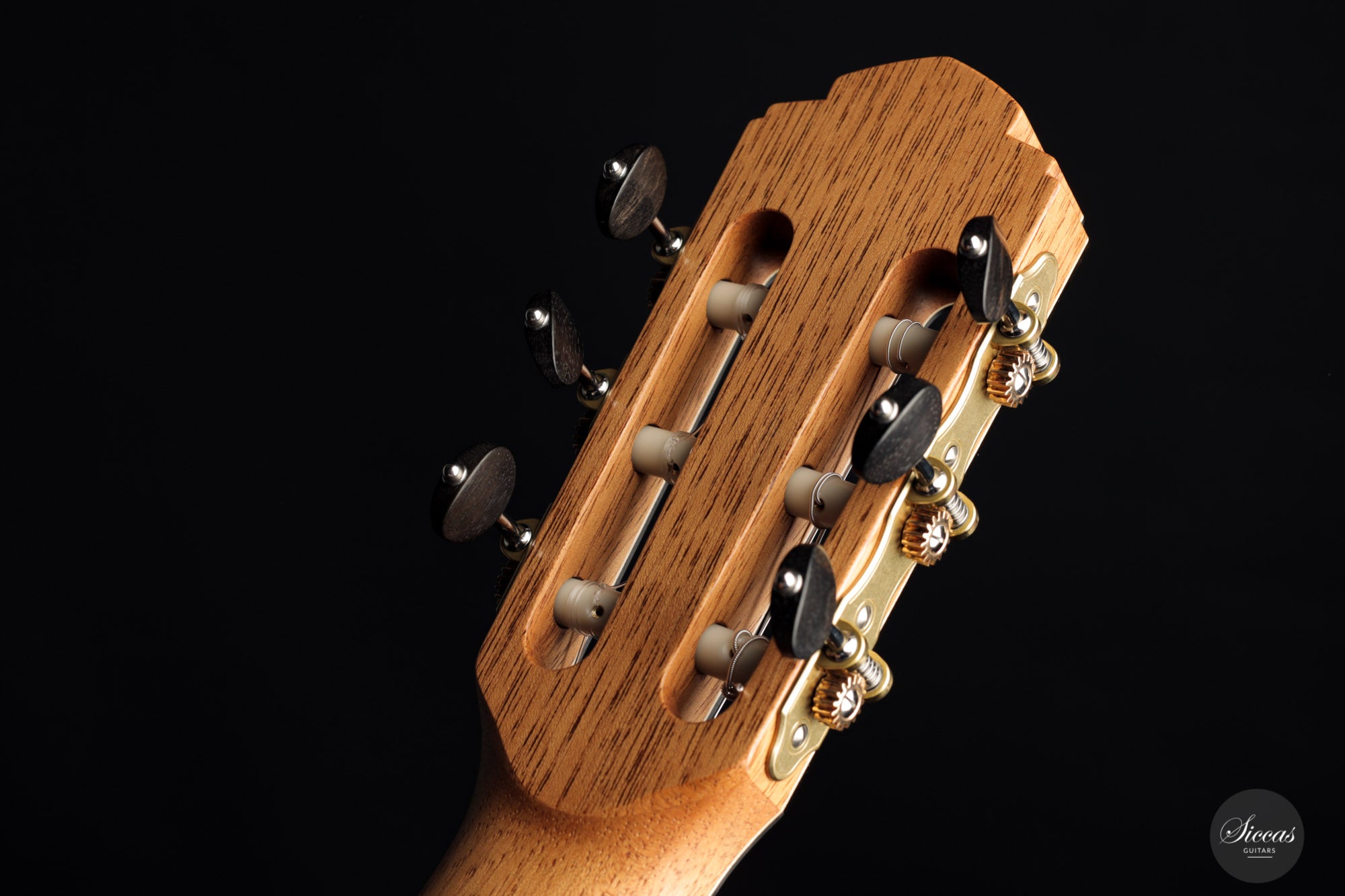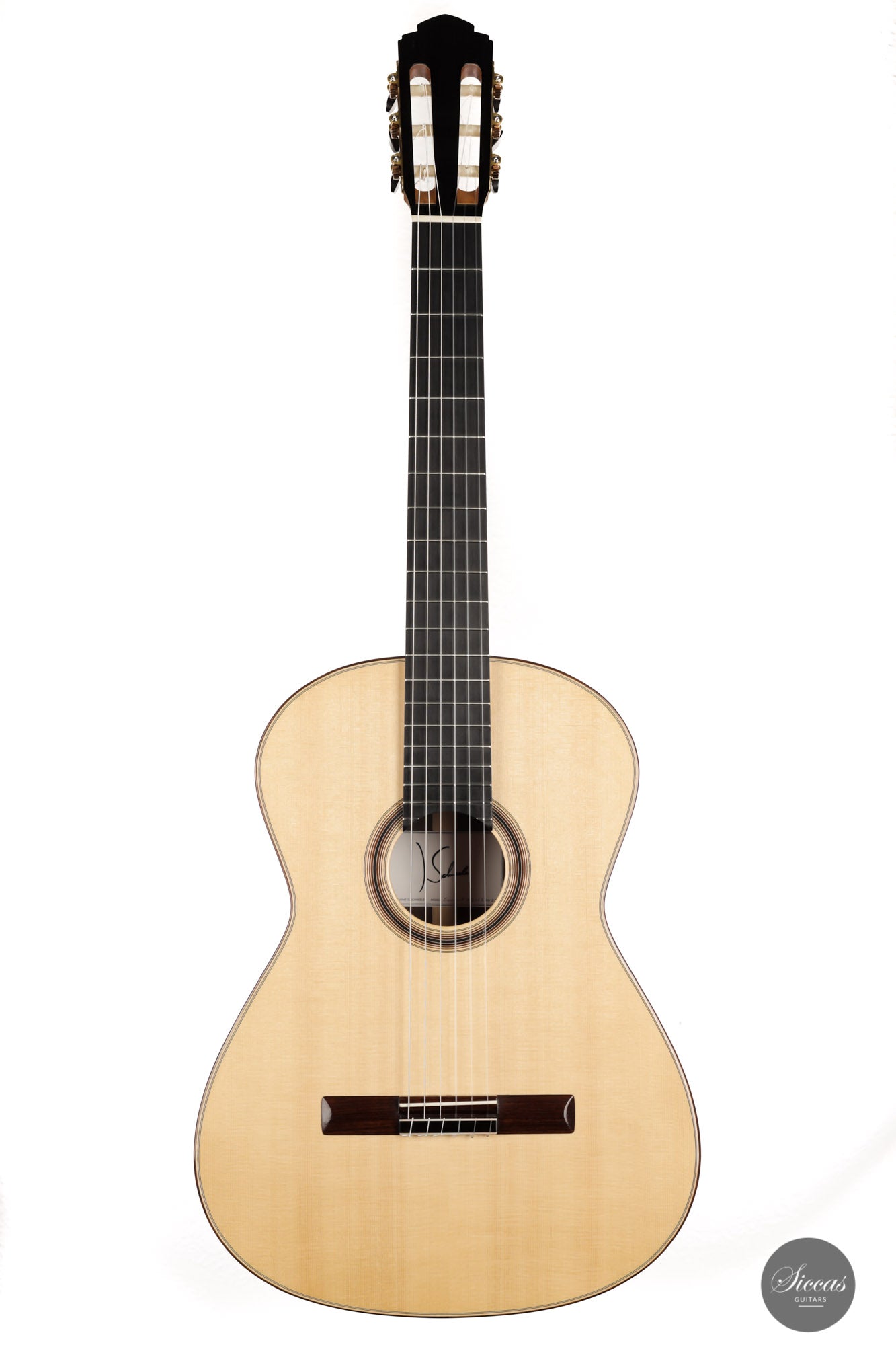 Many details such as the raised fingerboard, the slight radius of the fretboard, and the sober and thoughtful decoration show the modern commitment of this craftsman. Both the power of expression and the malleability of the tone are the main strengths of this guitar. It is truly an instrument that can impress in a concert hall and offers the guitarist complete freedom in terms of timbre, tone color, and dynamics. In addition, the compromise between responsiveness, sustain, and richness of tone is very well achieved. And finally, this instrument seduces and convinces even the most demanding guitarist with its impeccable playing comfort.