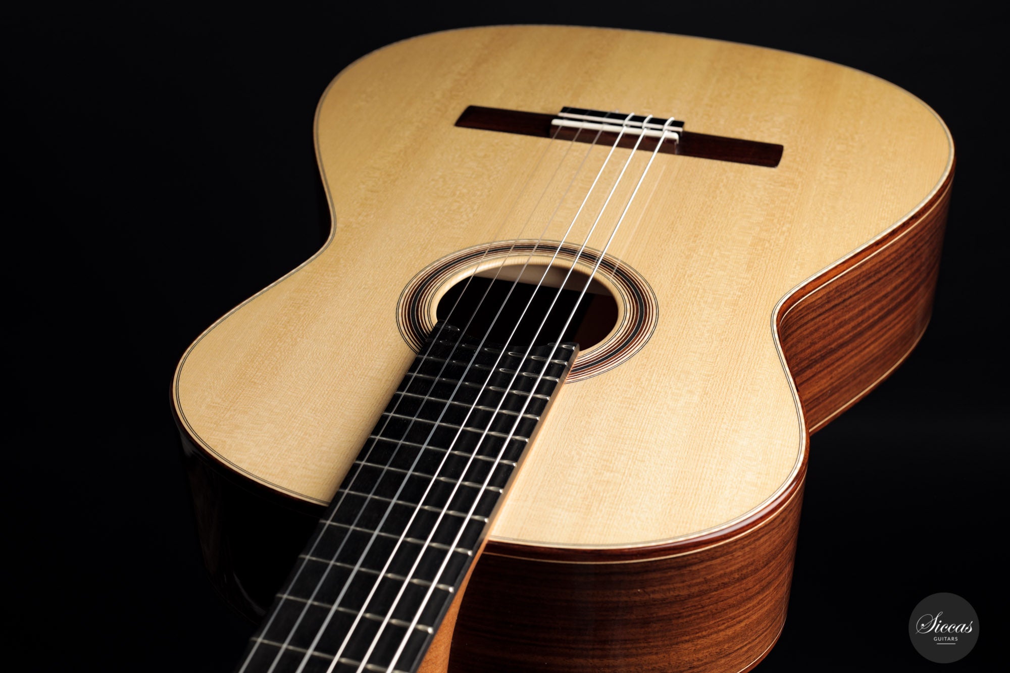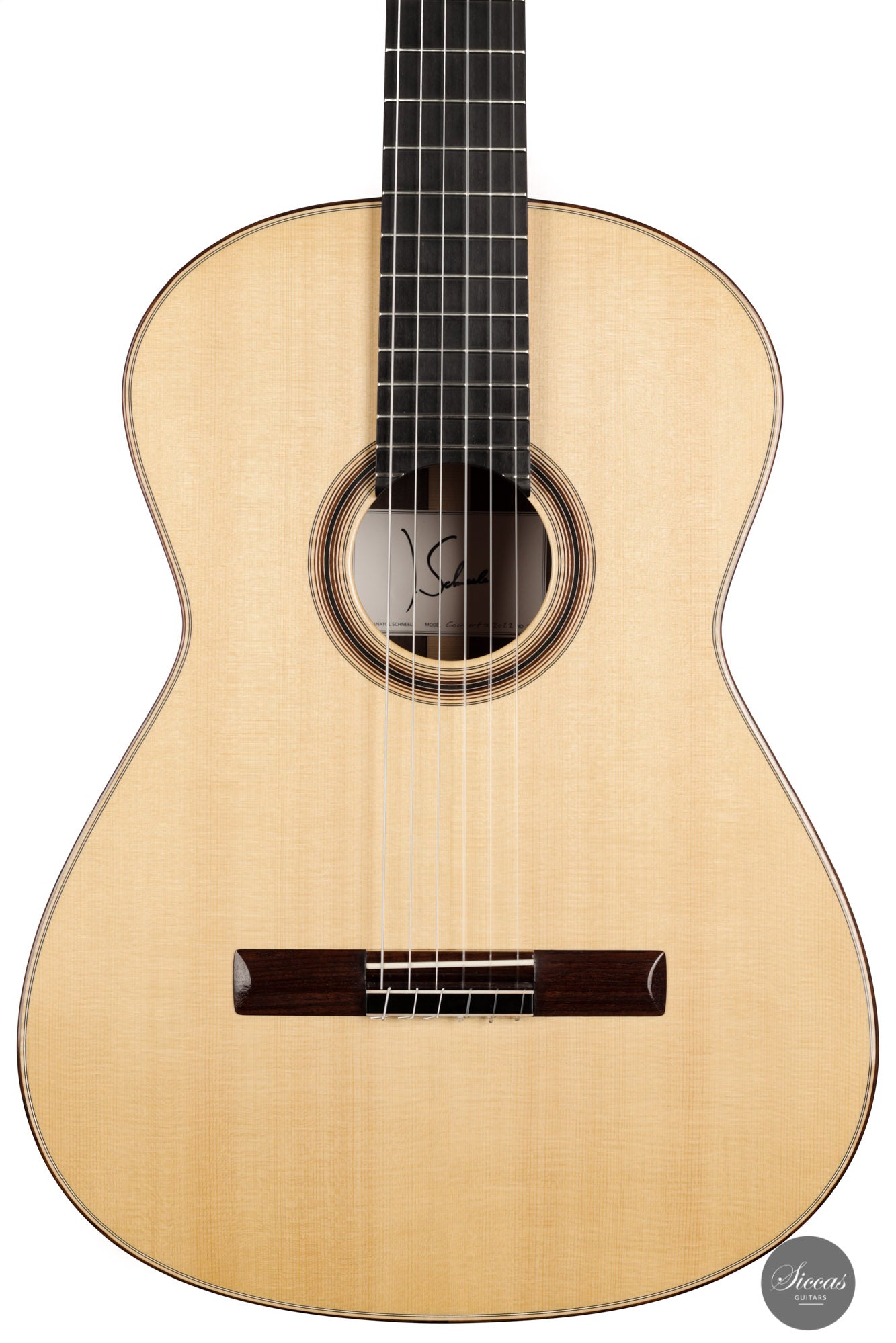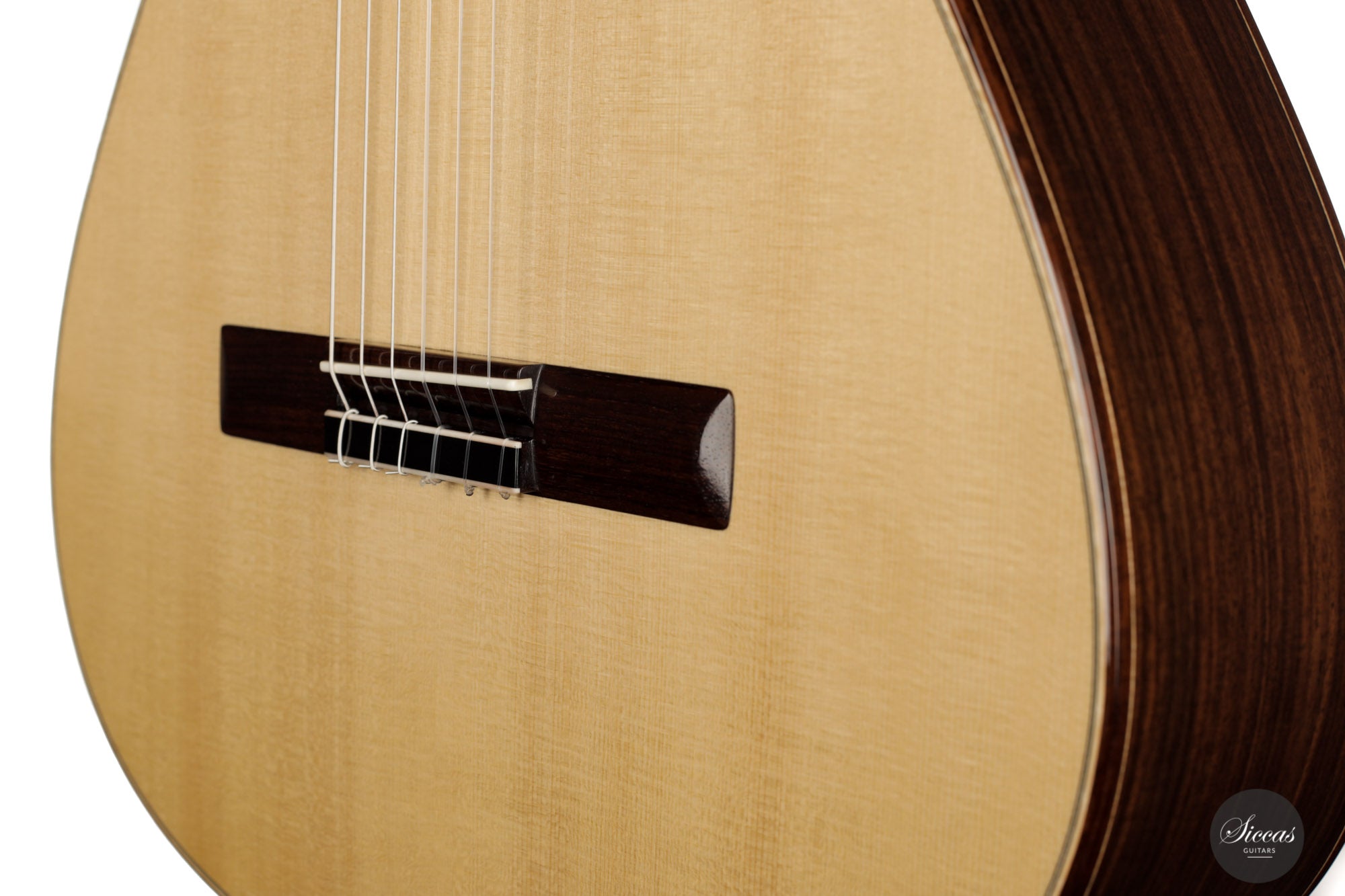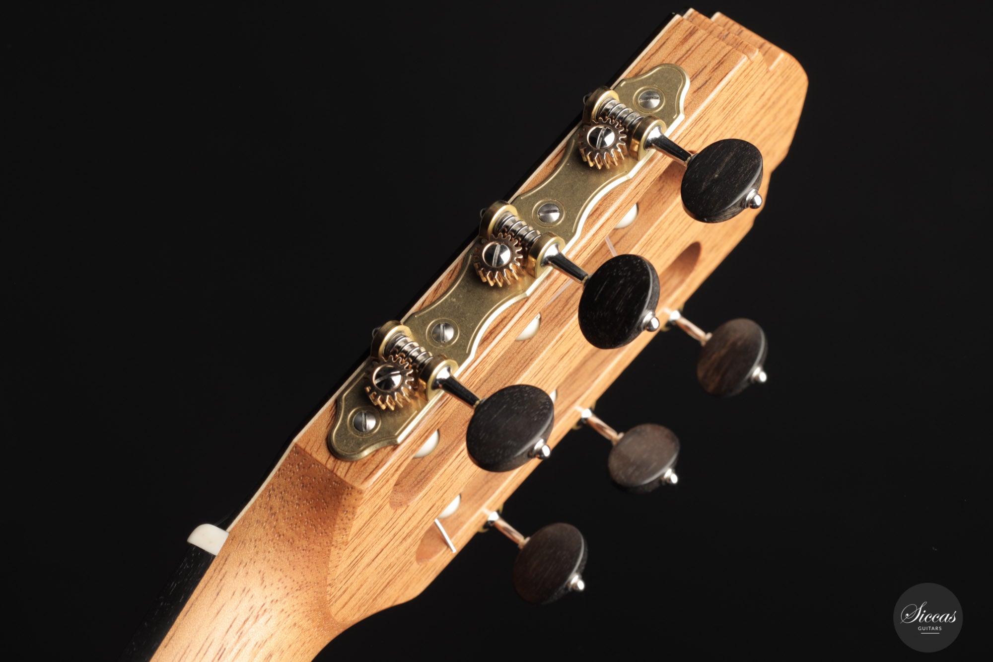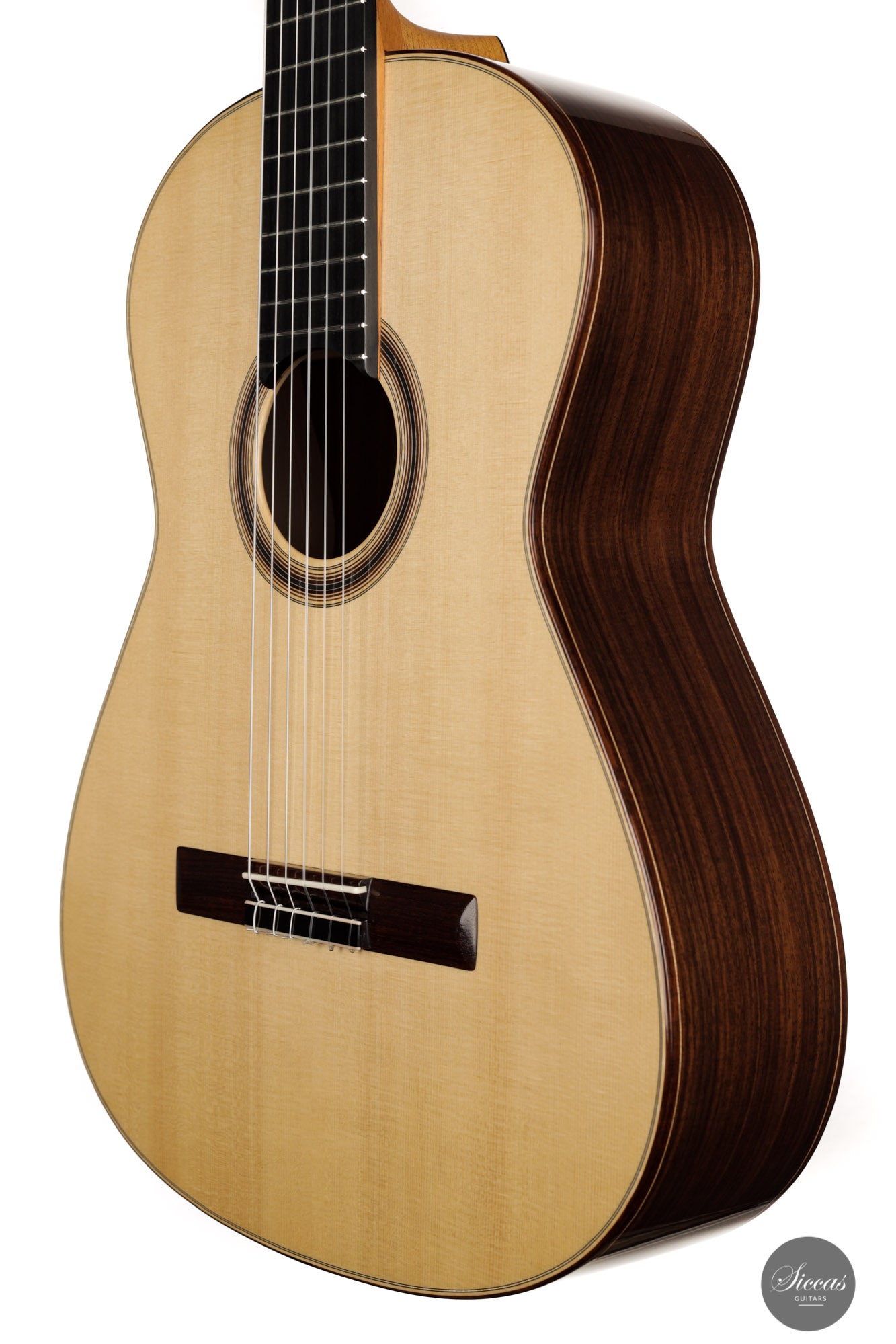 Many details such as the raised fingerboard, the slight radius of the fretboard, and the sober and thoughtful decoration show the modern commitment of this craftsman. Both the power of expression and the malleability of the tone are the main strengths of this guitar. It is truly an instrument that can impress in a concert hall and offers the guitarist complete freedom in terms of timbre, tone color, and dynamics. In addition, the compromise between responsiveness, sustain, and richness of tone is very well achieved. And finally, this instrument seduces and convinces even the most demanding guitarist with its impeccable playing comfort.