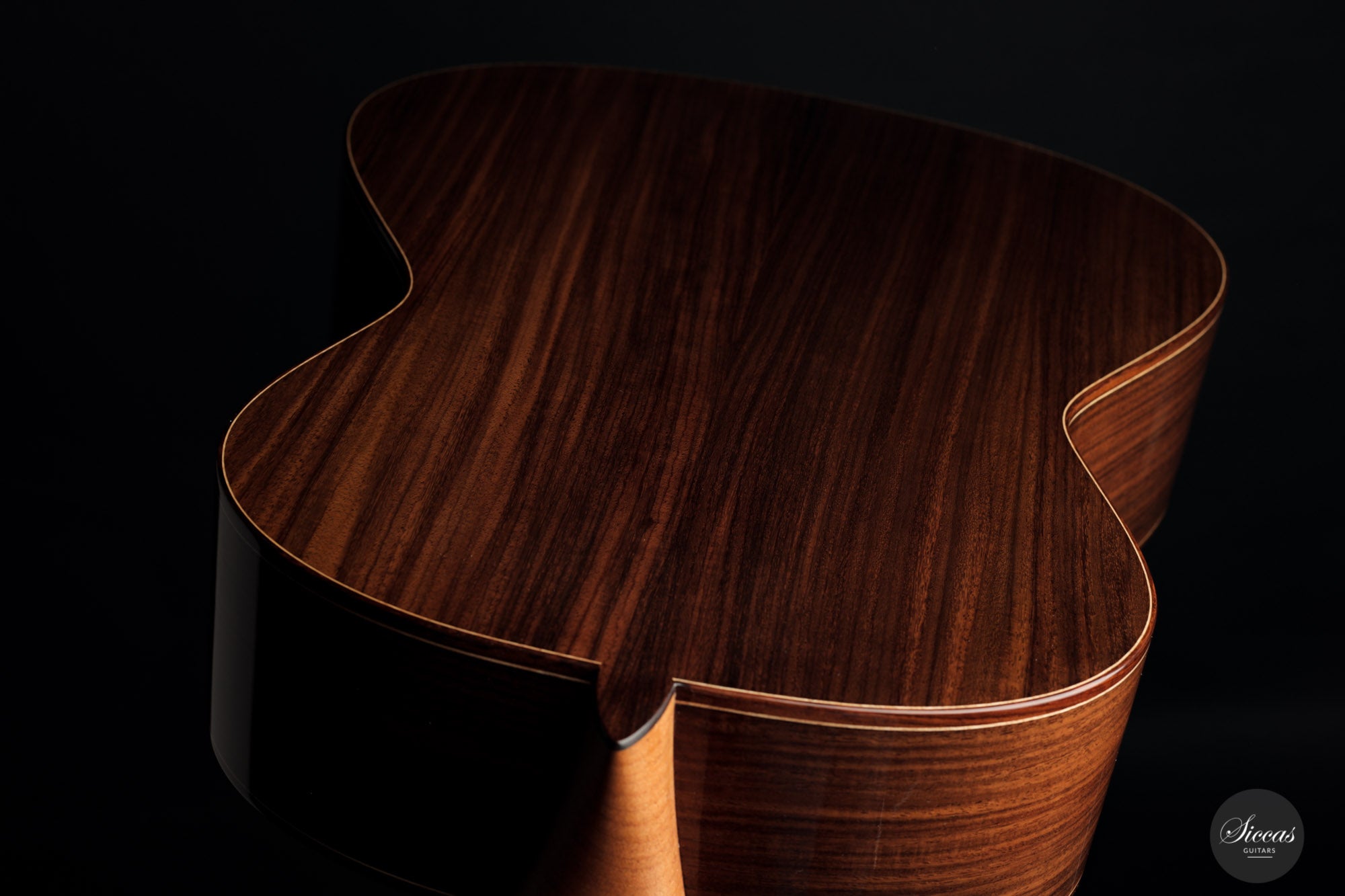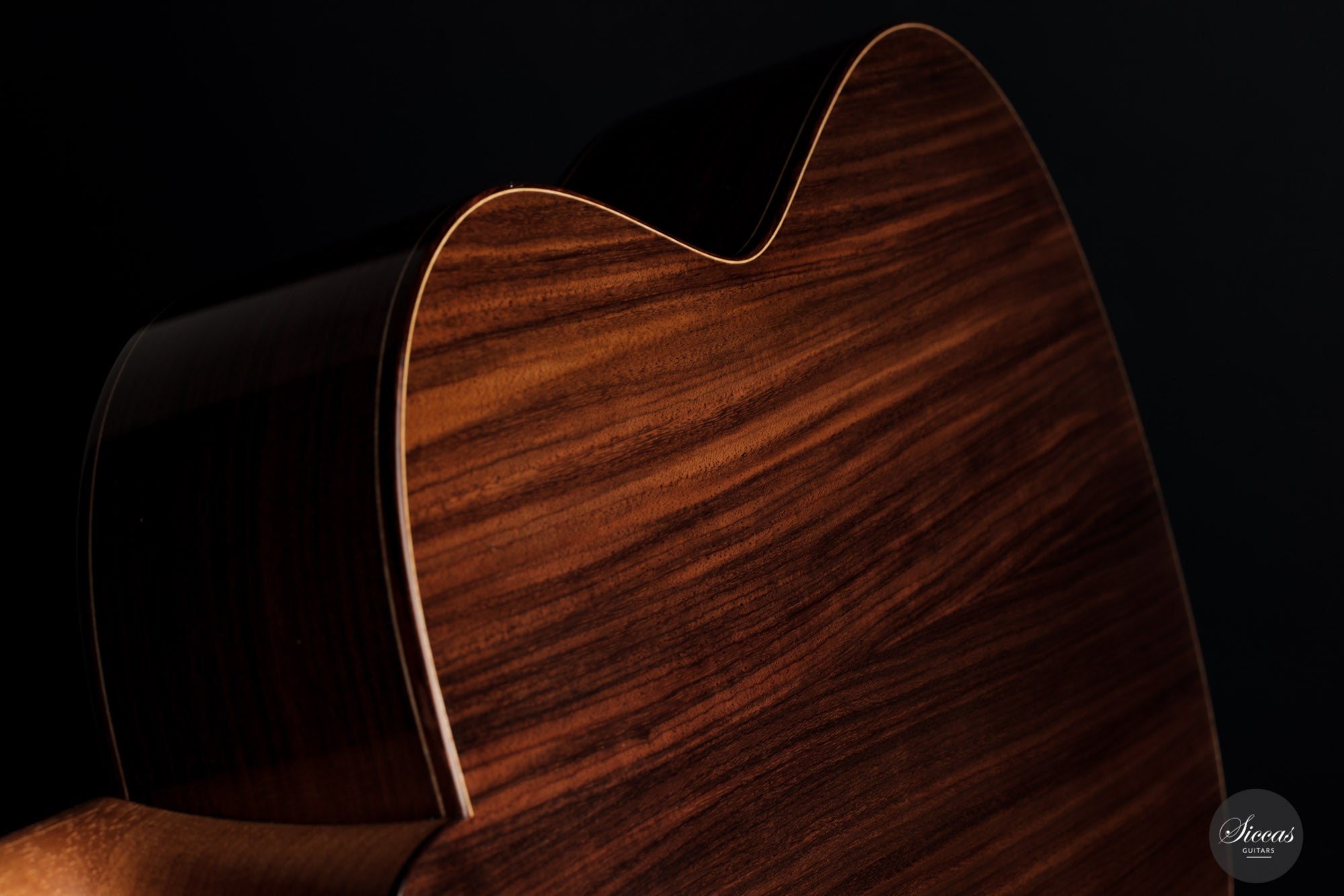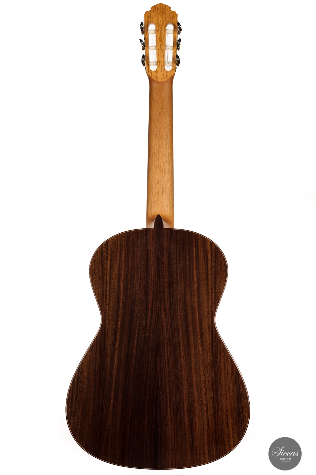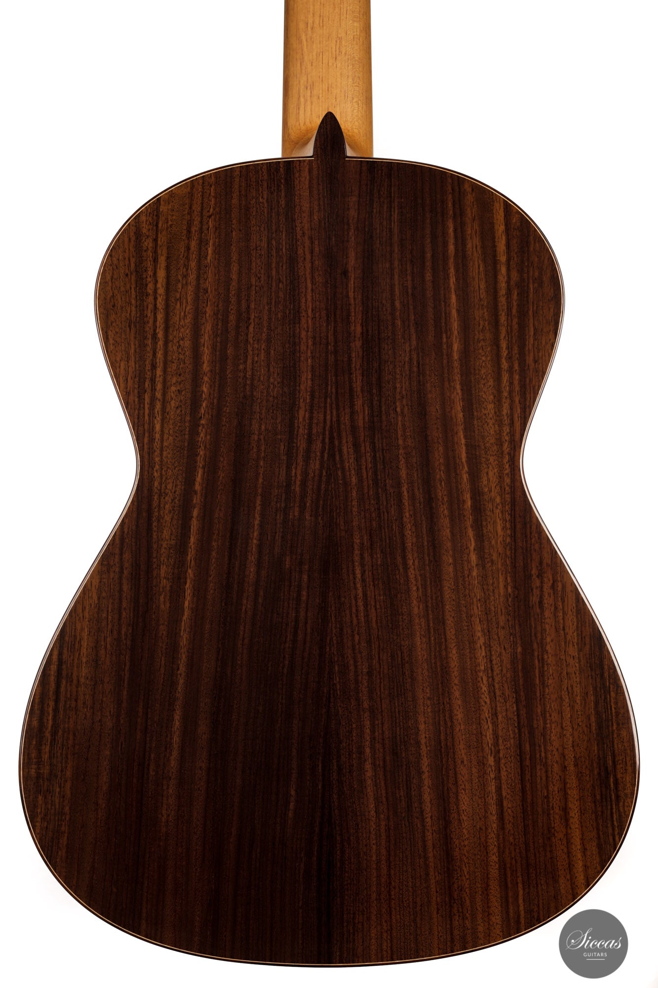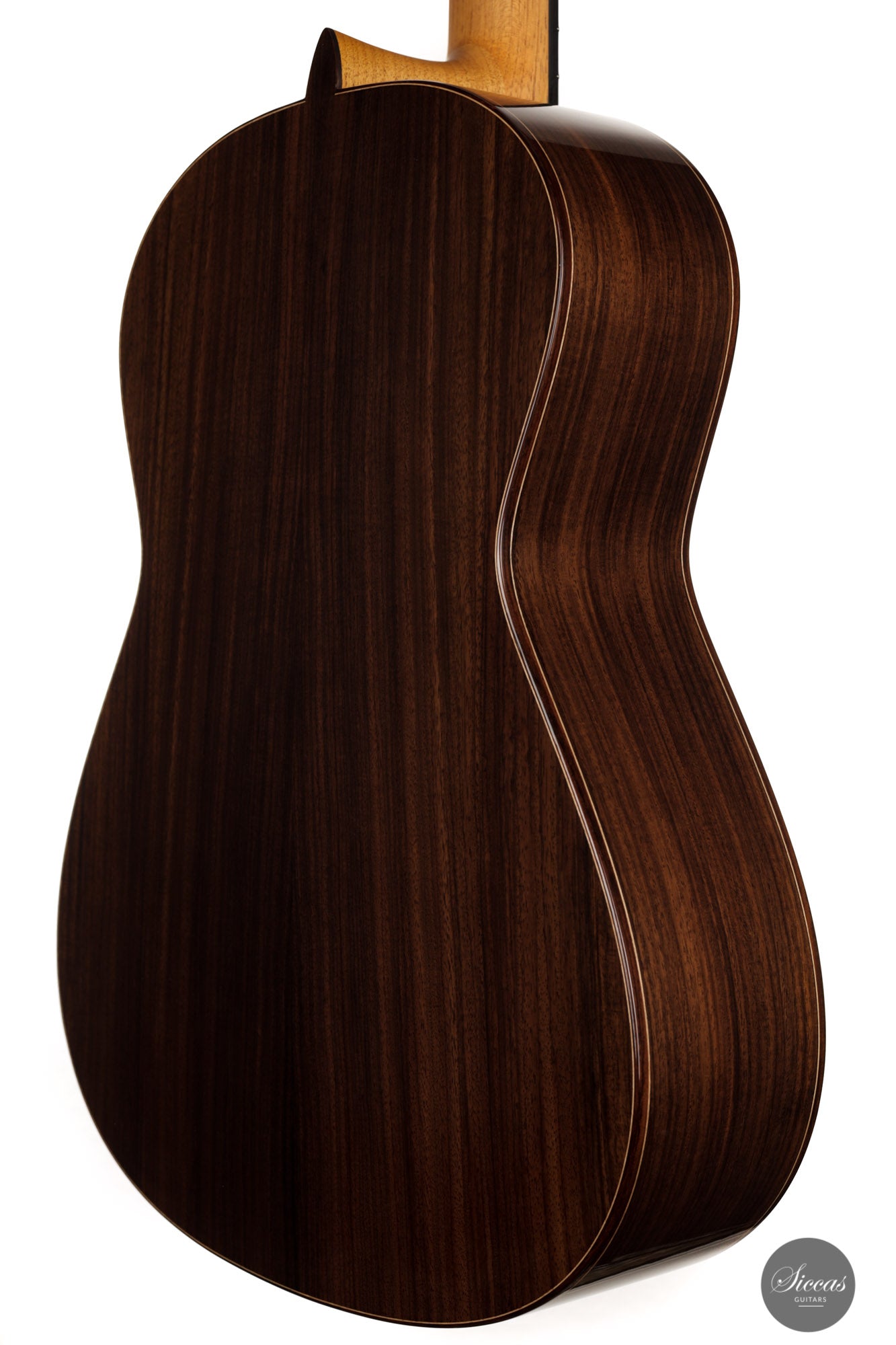 Many details such as the raised fingerboard, the slight radius of the fretboard, and the sober and thoughtful decoration show the modern commitment of this craftsman. Both the power of expression and the malleability of the tone are the main strengths of this guitar. It is truly an instrument that can impress in a concert hall and offers the guitarist complete freedom in terms of timbre, tone color, and dynamics. In addition, the compromise between responsiveness, sustain, and richness of tone is very well achieved. And finally, this instrument seduces and convinces even the most demanding guitarist with its impeccable playing comfort.