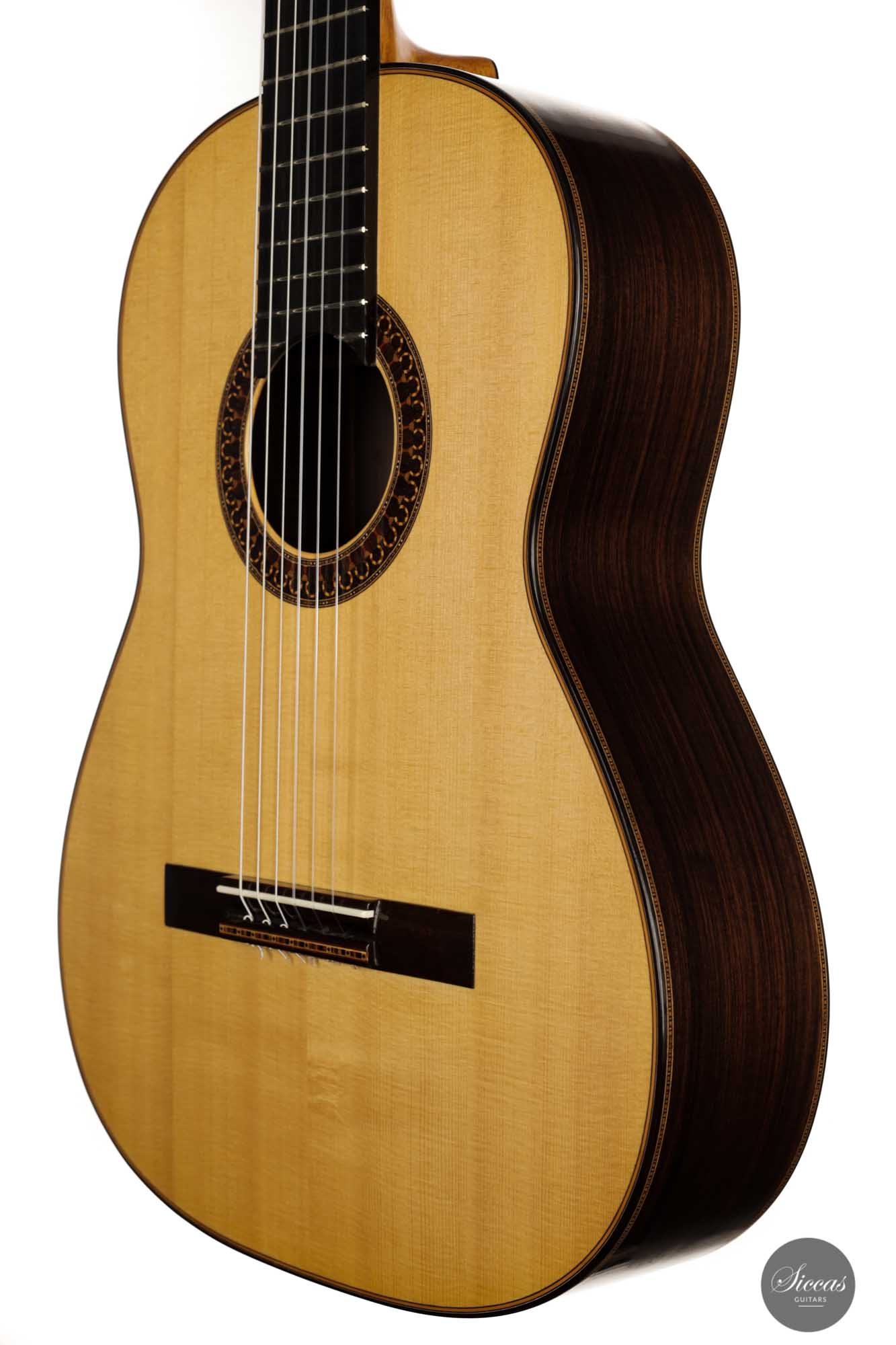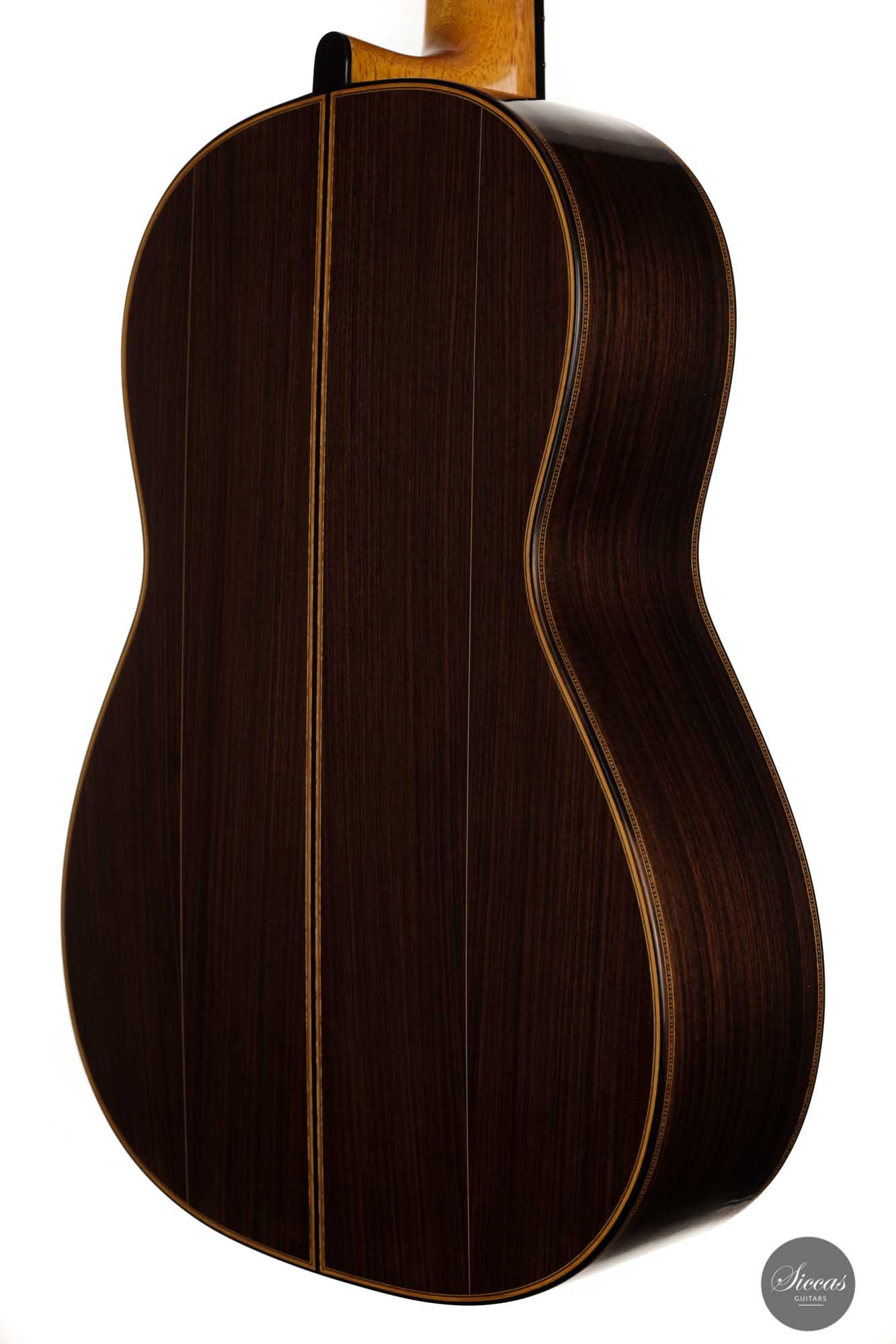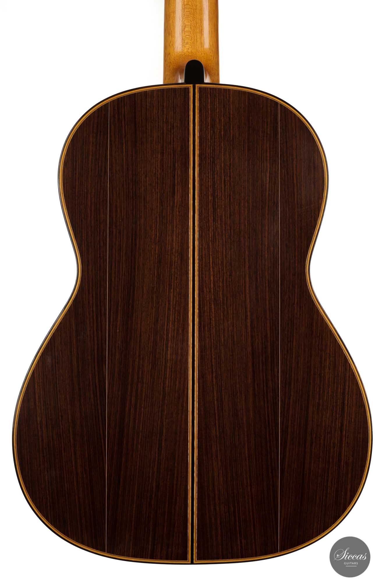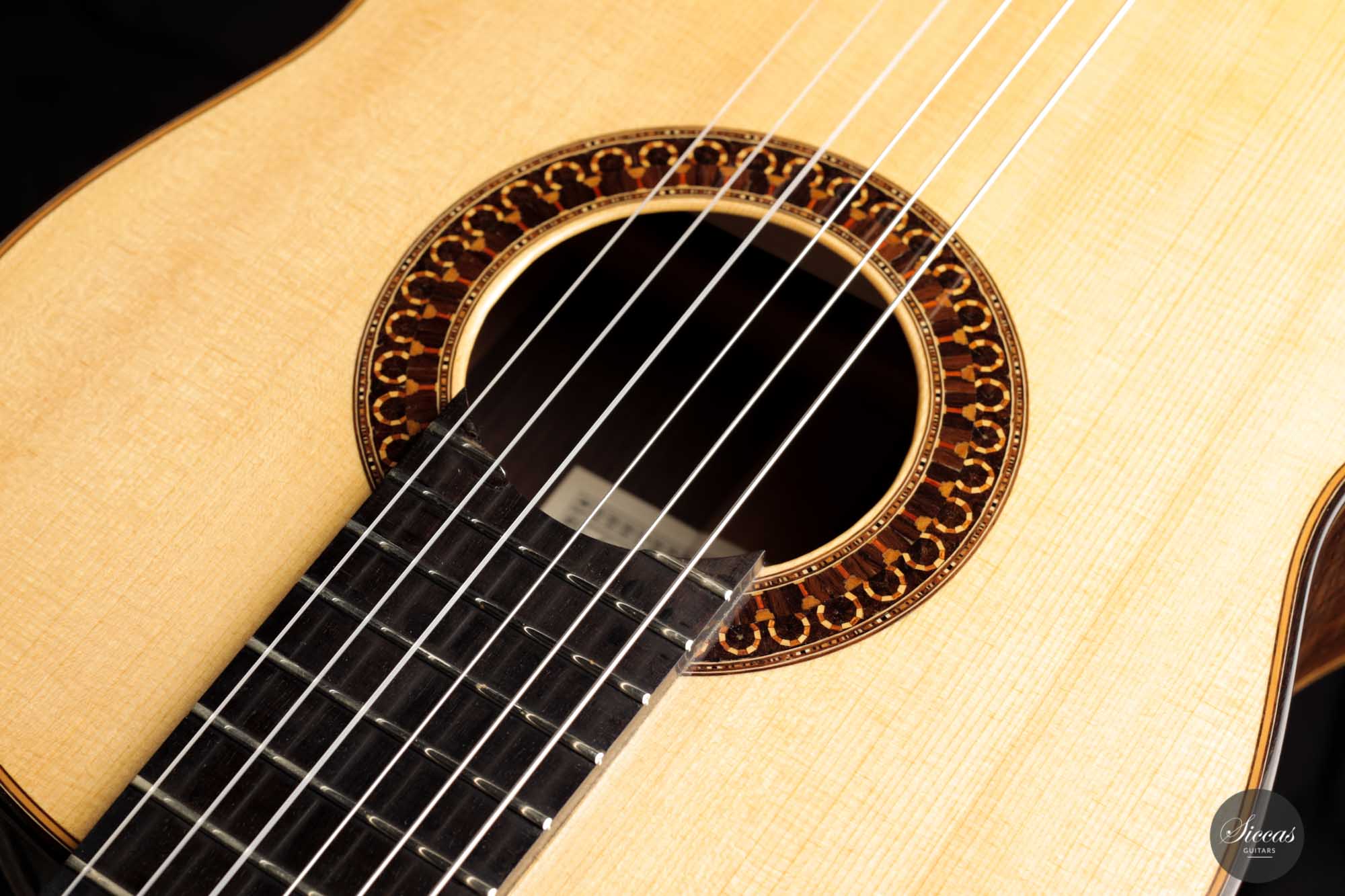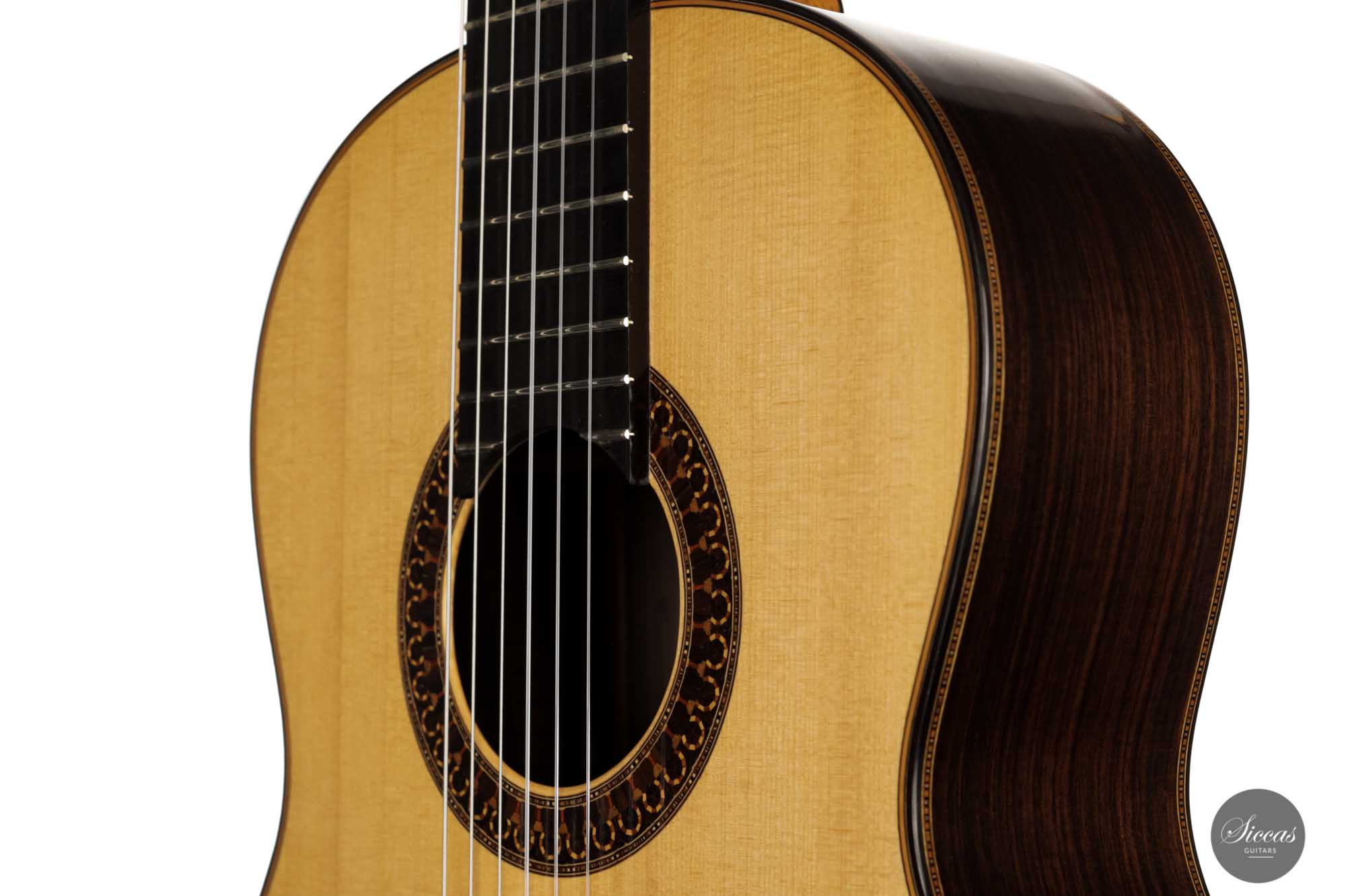 This wonderful guitar numbered 856 and called "Sol de Invierno", or winter sun in English, is an absolutely wonderful instrument. Built in 2013, during José Luis Romanillos's "Guijosa Period" (1993-2015), it was signed under the soundboard by both father and son. With its four-piece Indian rosewood back, open mature sound, and elegant decoration, it is a rare masterpiece of the late master. Finally, its condition is absolutely stunning as it shows only rare superficial marks, making it a highly collectible guitar in addition to being a fantastic concert instrument.