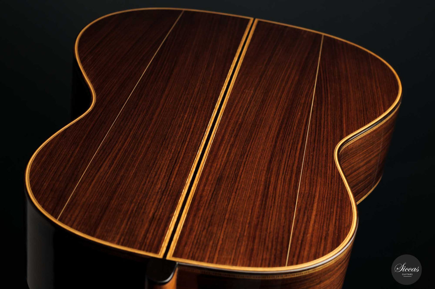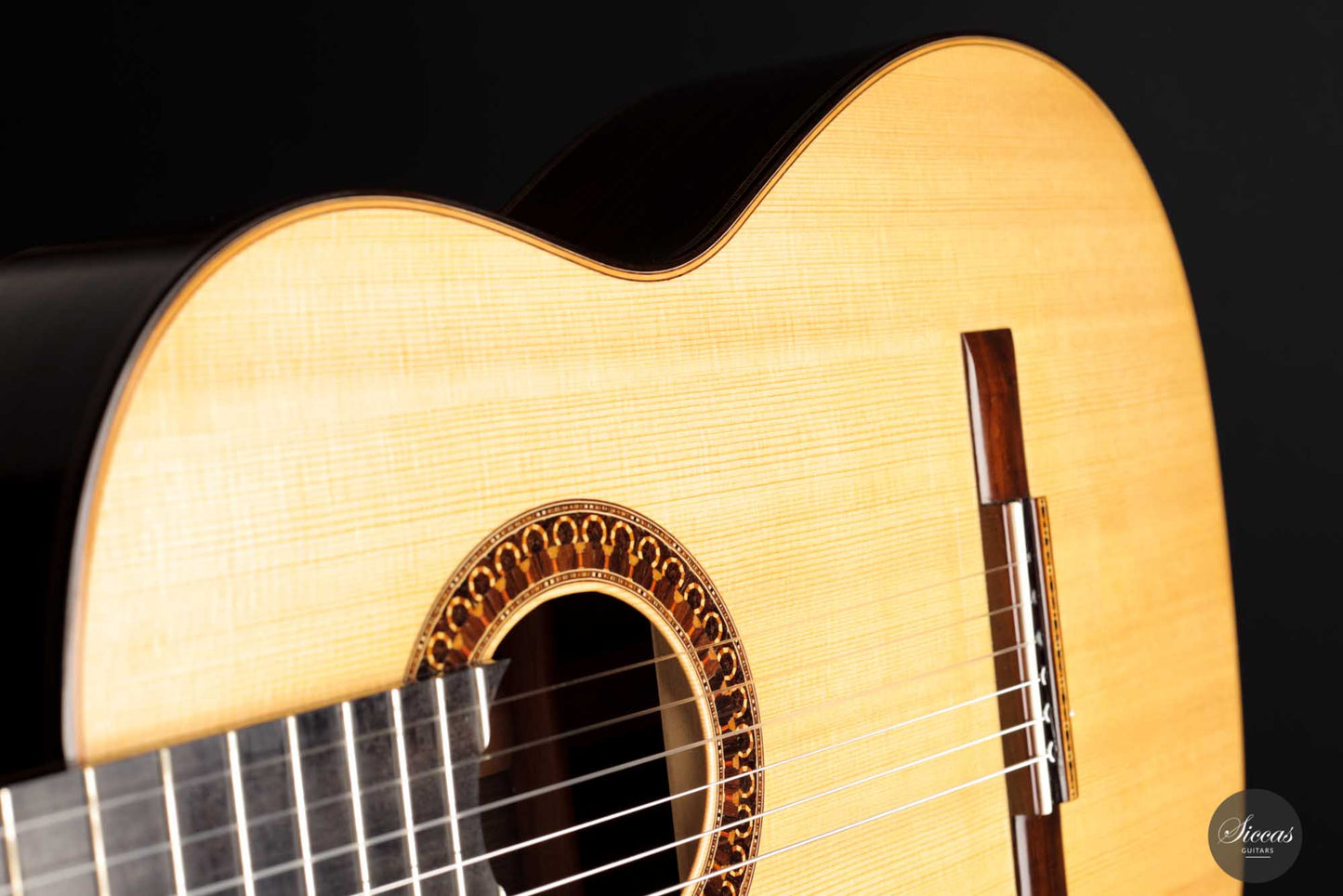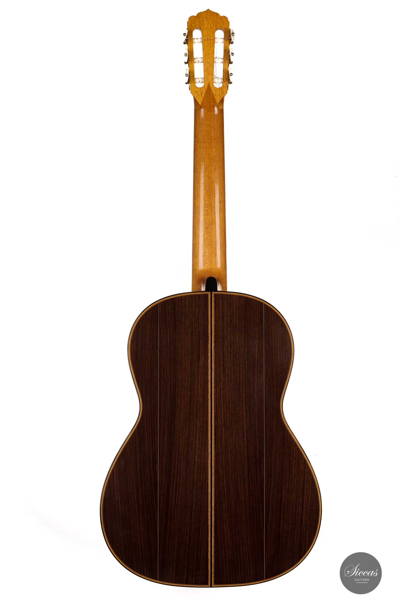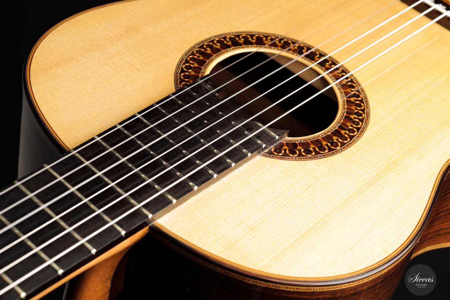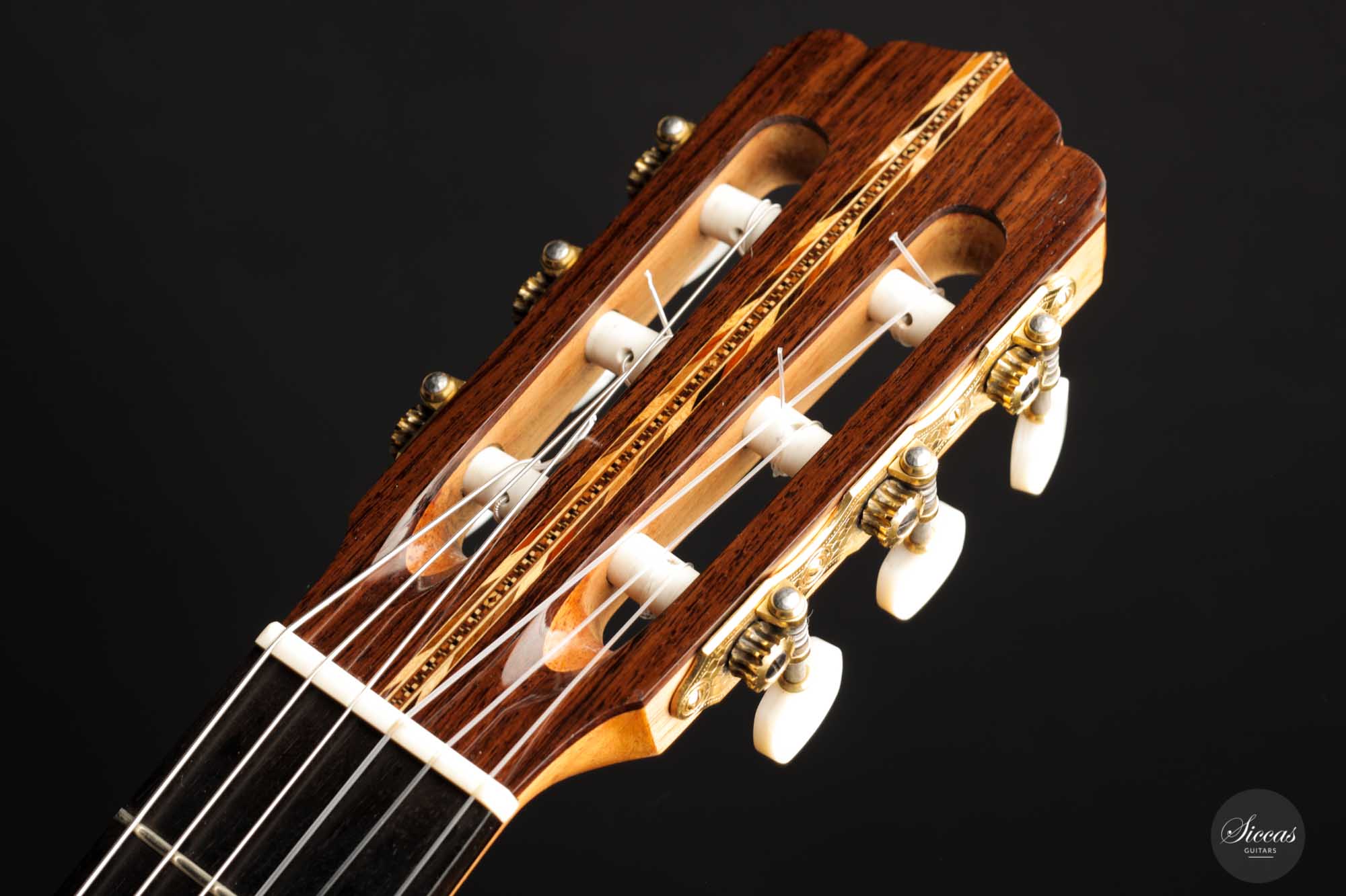 This wonderful guitar numbered 856 and called "Sol de Invierno", or winter sun in English, is an absolutely wonderful instrument. Built in 2013, during José Luis Romanillos's "Guijosa Period" (1993-2015), it was signed under the soundboard by both father and son. With its four-piece Indian rosewood back, open mature sound, and elegant decoration, it is a rare masterpiece of the late master. Finally, its condition is absolutely stunning as it shows only rare superficial marks, making it a highly collectible guitar in addition to being a fantastic concert instrument.