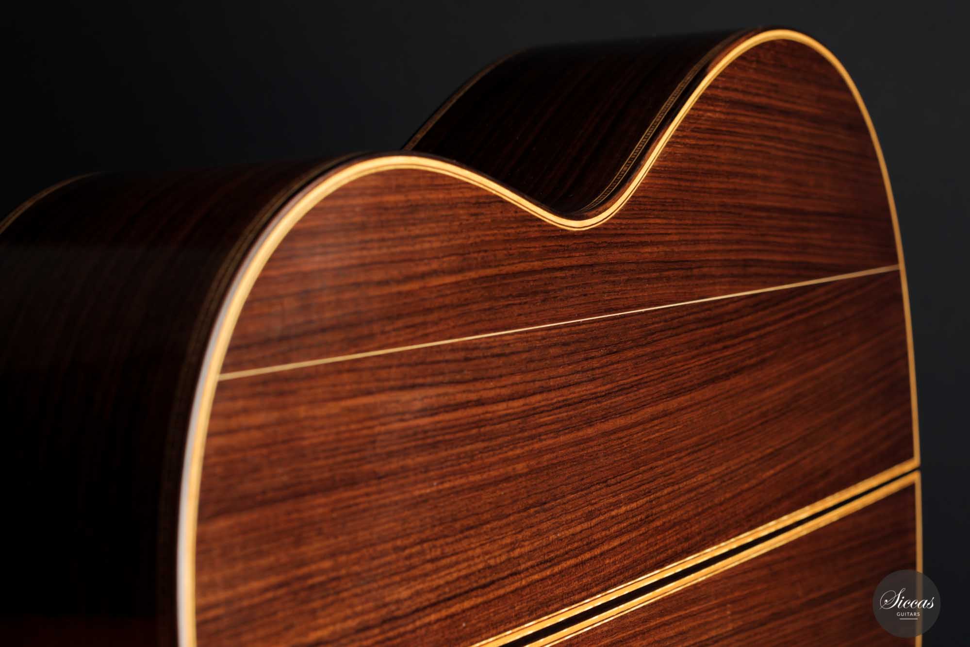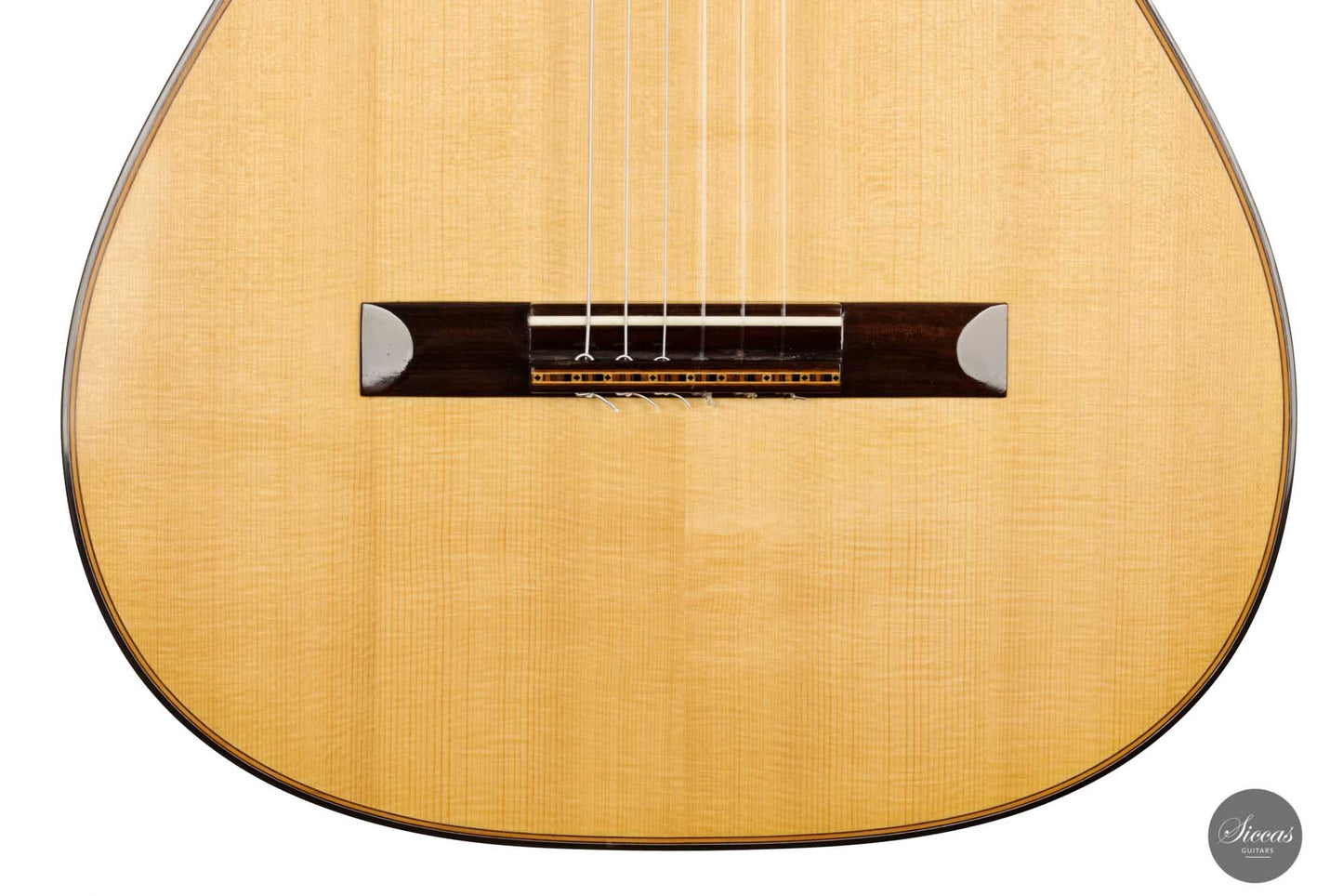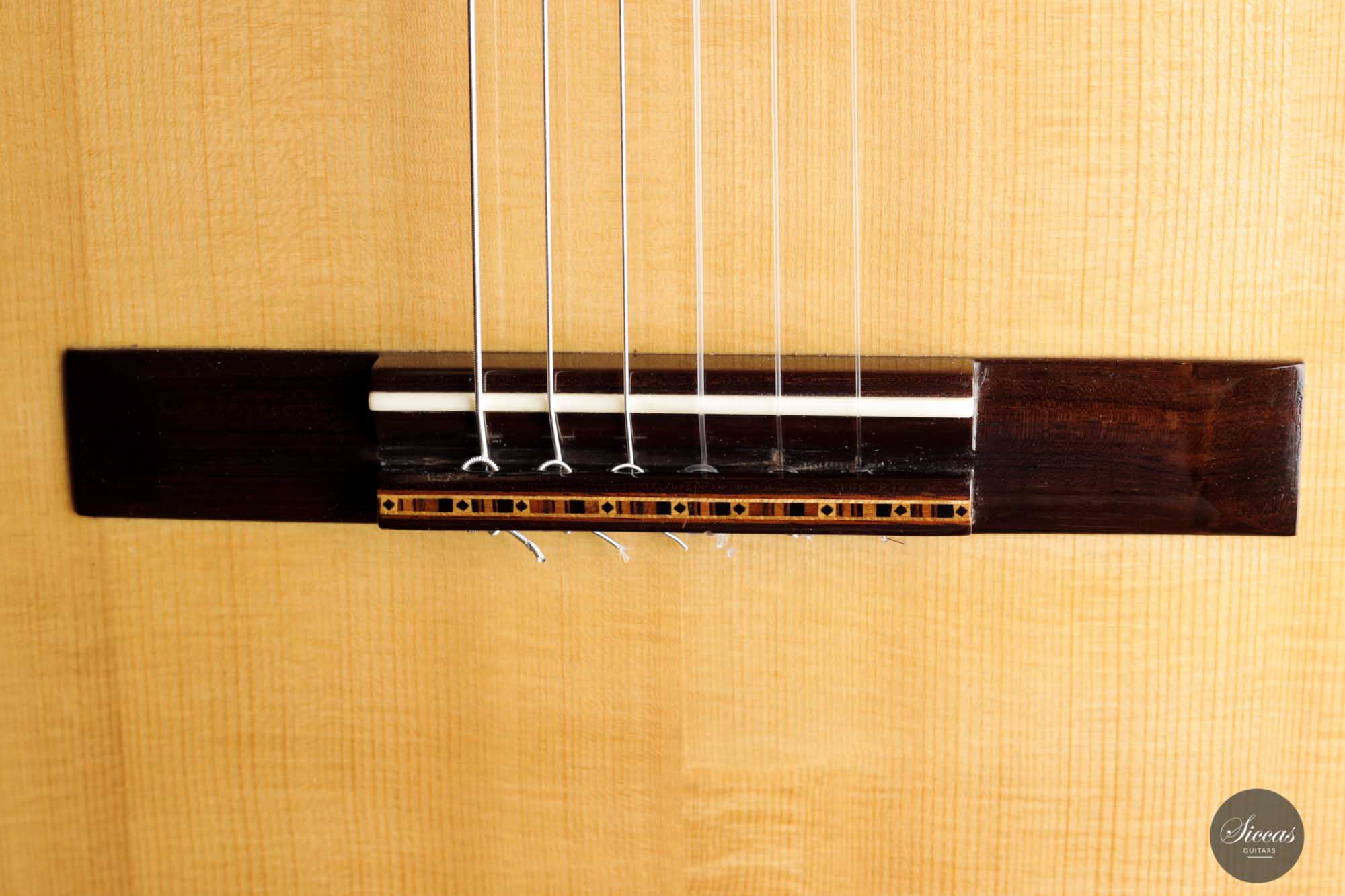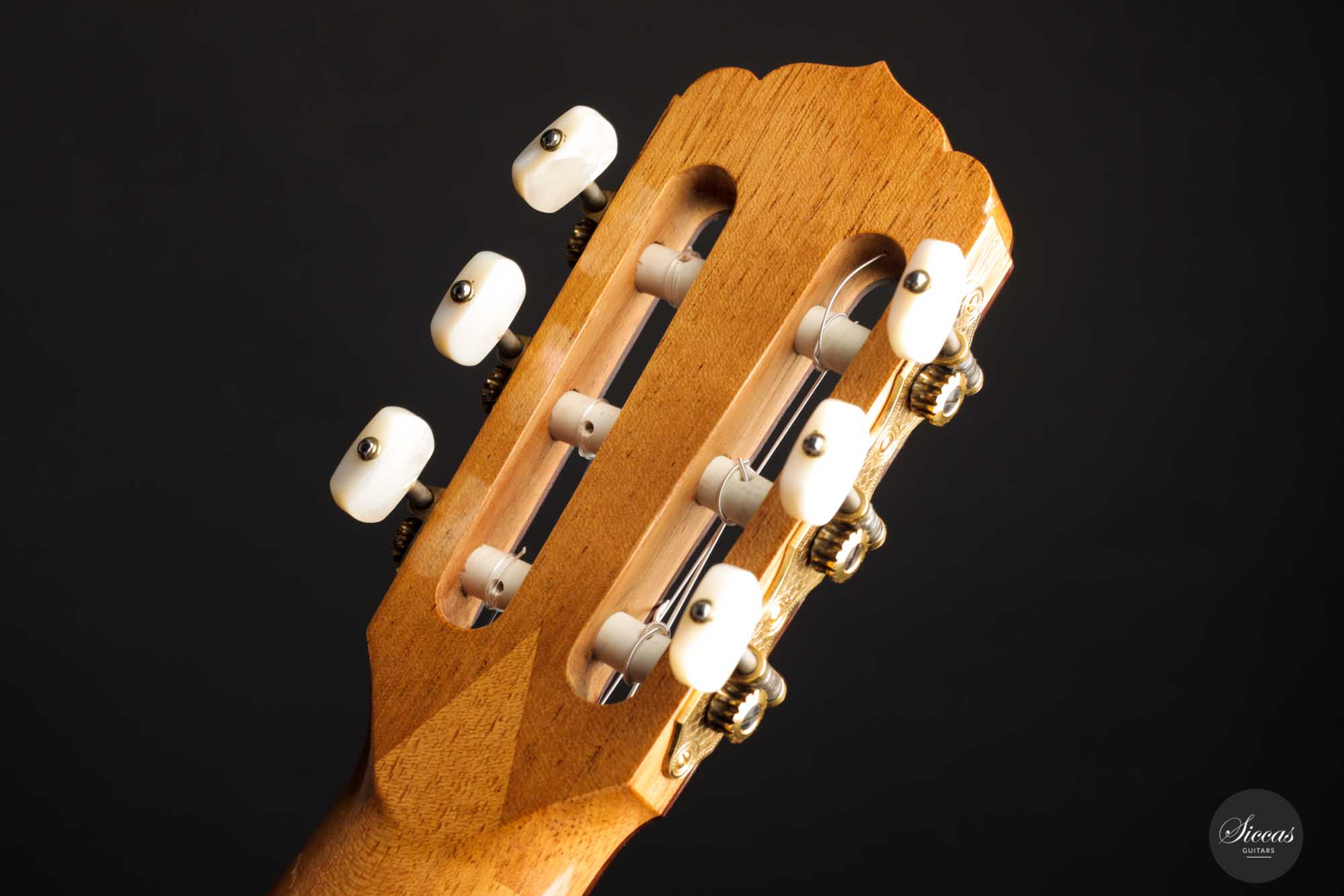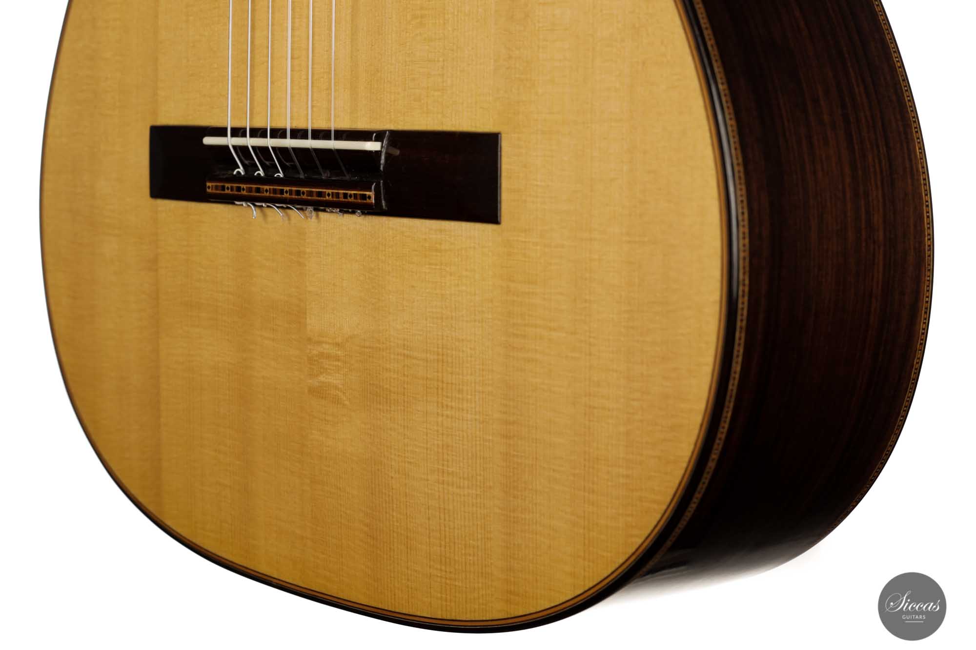 This wonderful guitar numbered 856 and called "Sol de Invierno", or winter sun in English, is an absolutely wonderful instrument. Built in 2013, during José Luis Romanillos's "Guijosa Period" (1993-2015), it was signed under the soundboard by both father and son. With its four-piece Indian rosewood back, open mature sound, and elegant decoration, it is a rare masterpiece of the late master. Finally, its condition is absolutely stunning as it shows only rare superficial marks, making it a highly collectible guitar in addition to being a fantastic concert instrument.