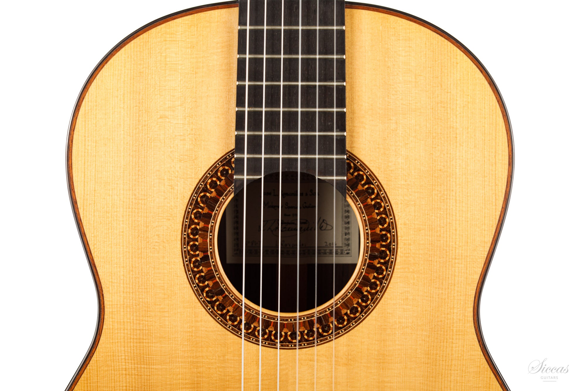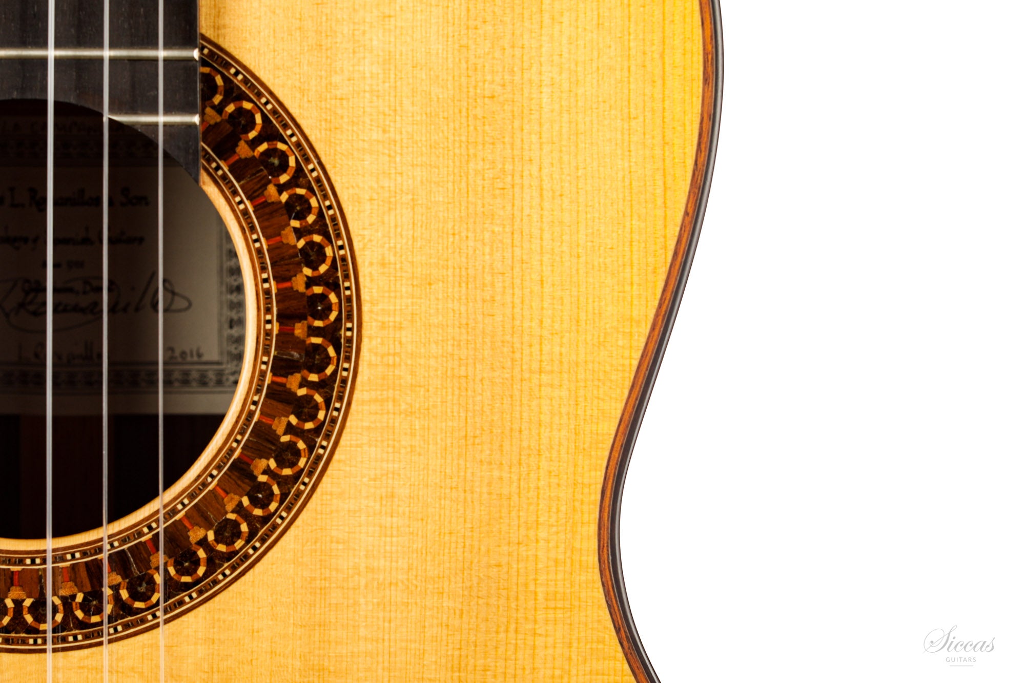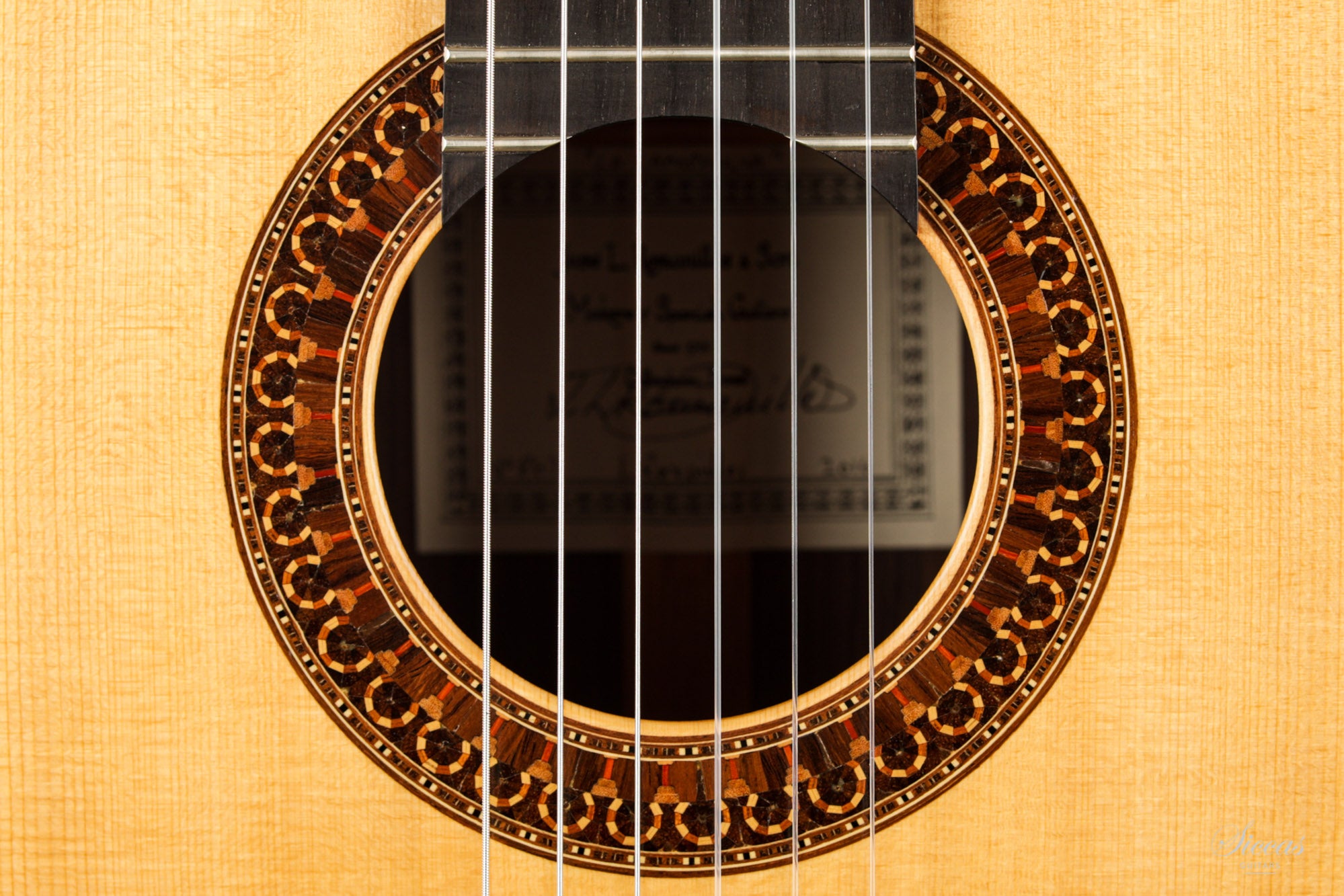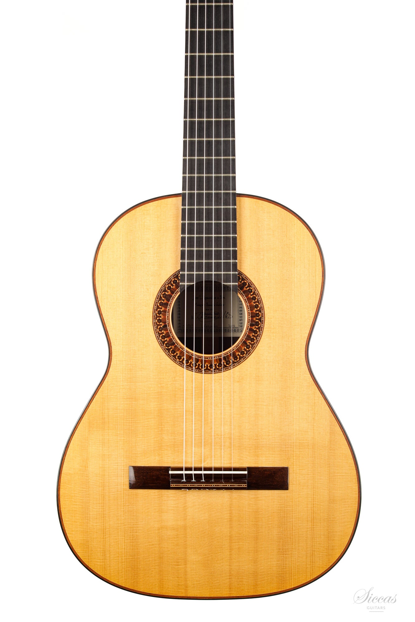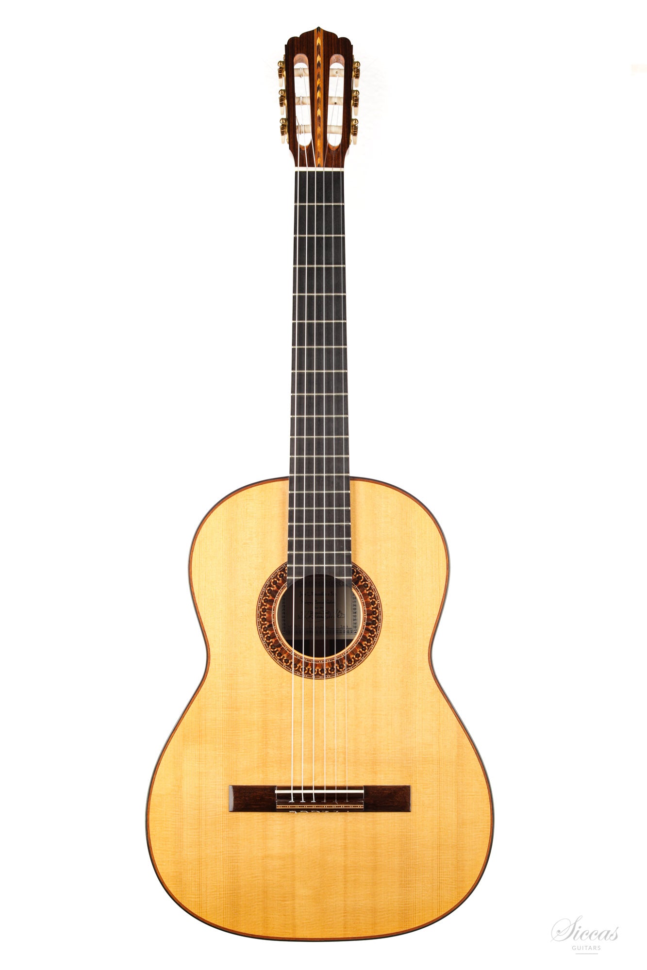 This guitar is named "La Campanula", reminiscent of the beautiful little purple Bellflower. Built in 2016 and numbered 867, it is signed on the label as well as inside the soundboard by both father and son. It is a superb concert model, richly inlaid and featuring the legendary rosette inspired by the mosque of Cordoba. The back is constructed of four pieces of Indian rosewood. The top is also shaped by four pieces, the reason was to select spruce from the most precious and best quarter sawn parts from the raw material. The latter has taken on a magnificent honey colour over the last four years and has few playing marks. A thin, superficial split of about five centimetres, parallel to the joint on the lower left bout has been perfectly stabilized. It is almost not visible and has absolutely no effect on the sound of the instrument.