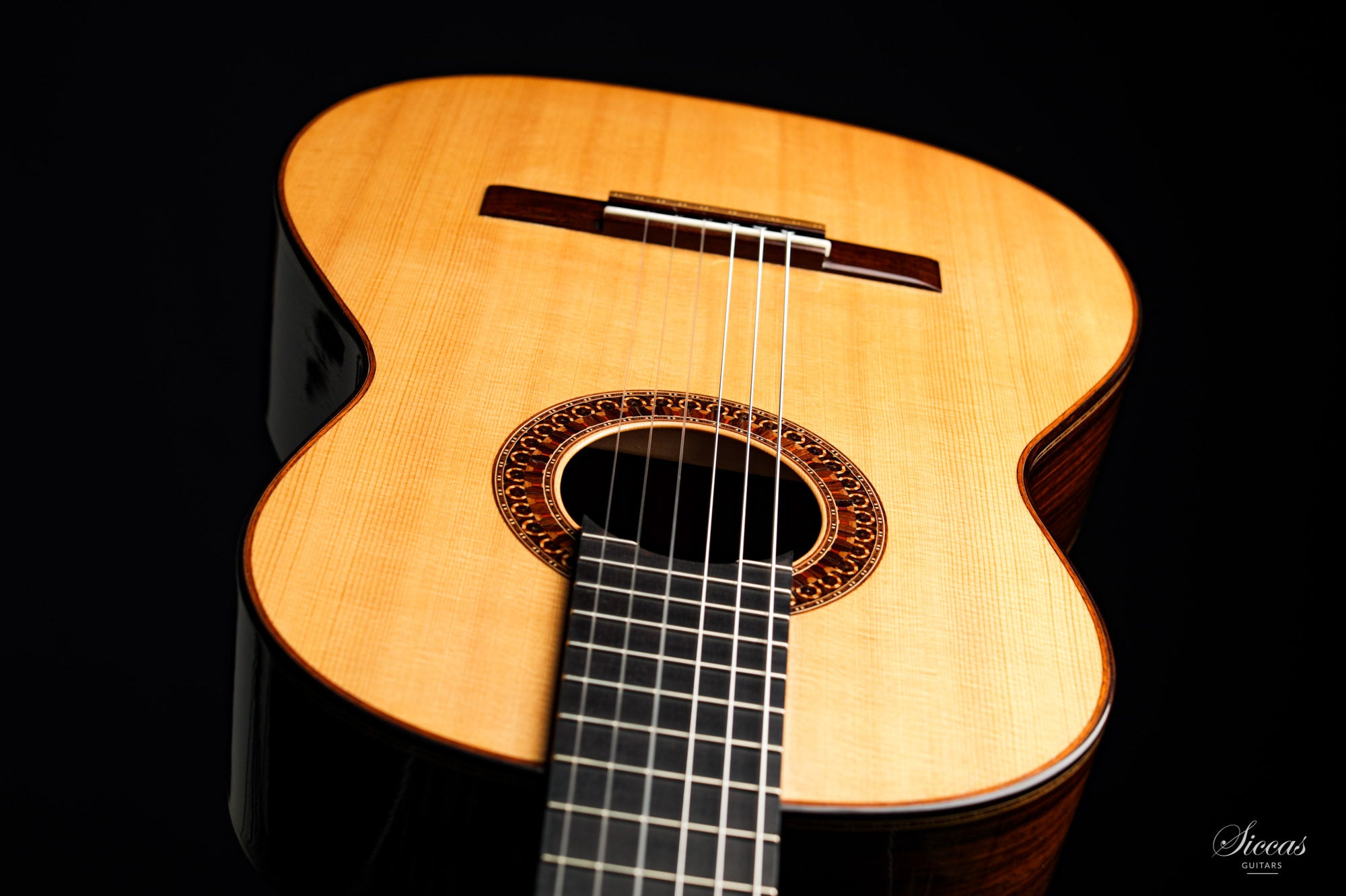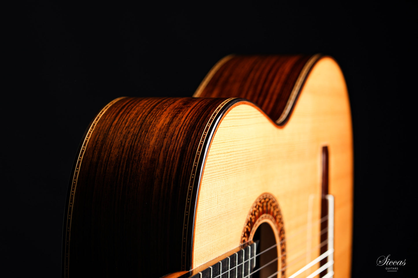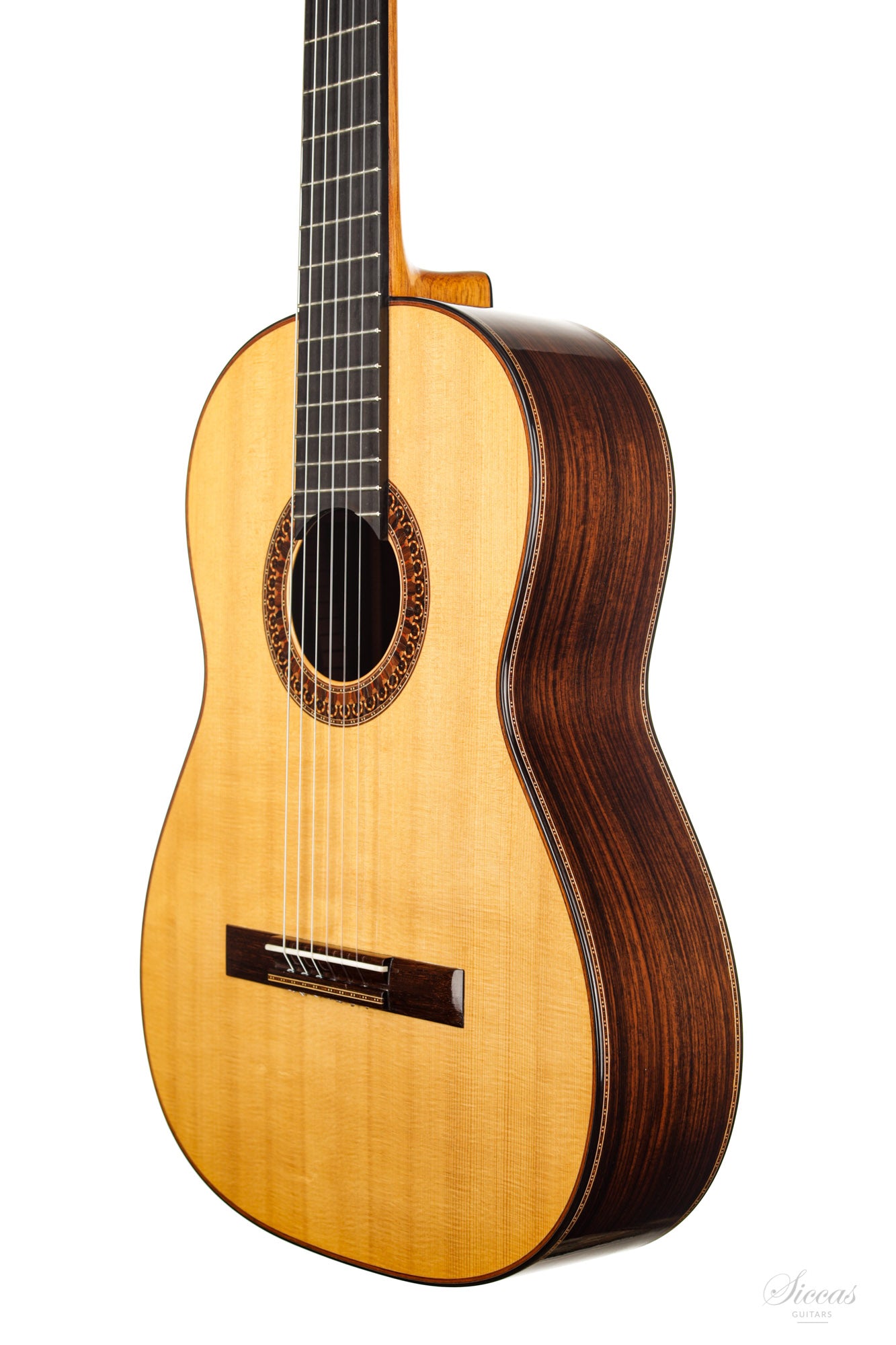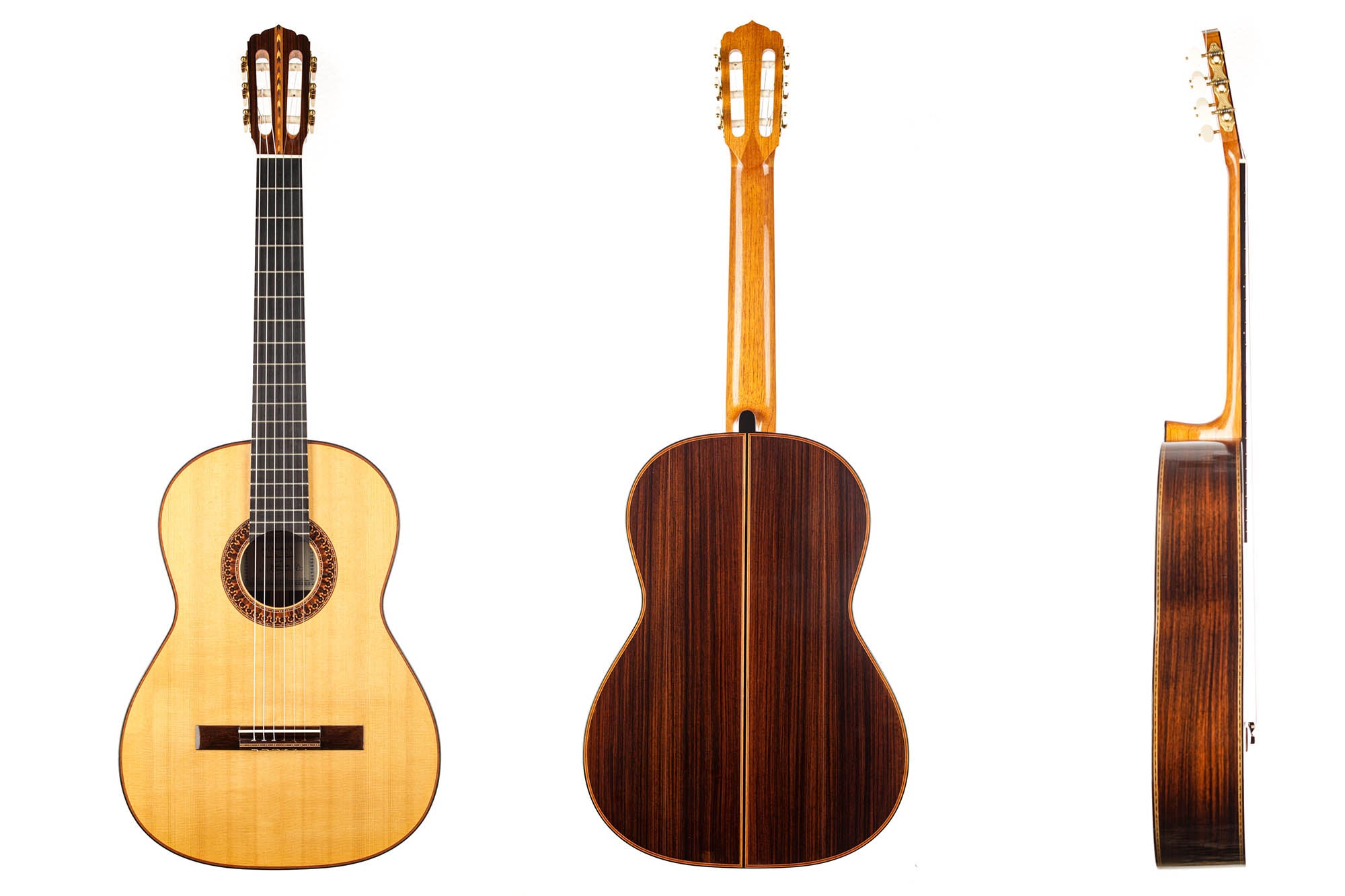 This guitar is named "La Campanula", reminiscent of the beautiful little purple Bellflower. Built in 2016 and numbered 867, it is signed on the label as well as inside the soundboard by both father and son. It is a superb concert model, richly inlaid and featuring the legendary rosette inspired by the mosque of Cordoba. The back is constructed of four pieces of Indian rosewood. The top is also shaped by four pieces, the reason was to select spruce from the most precious and best quarter sawn parts from the raw material. The latter has taken on a magnificent honey colour over the last four years and has few playing marks. A thin, superficial split of about five centimetres, parallel to the joint on the lower left bout has been perfectly stabilized. It is almost not visible and has absolutely no effect on the sound of the instrument.