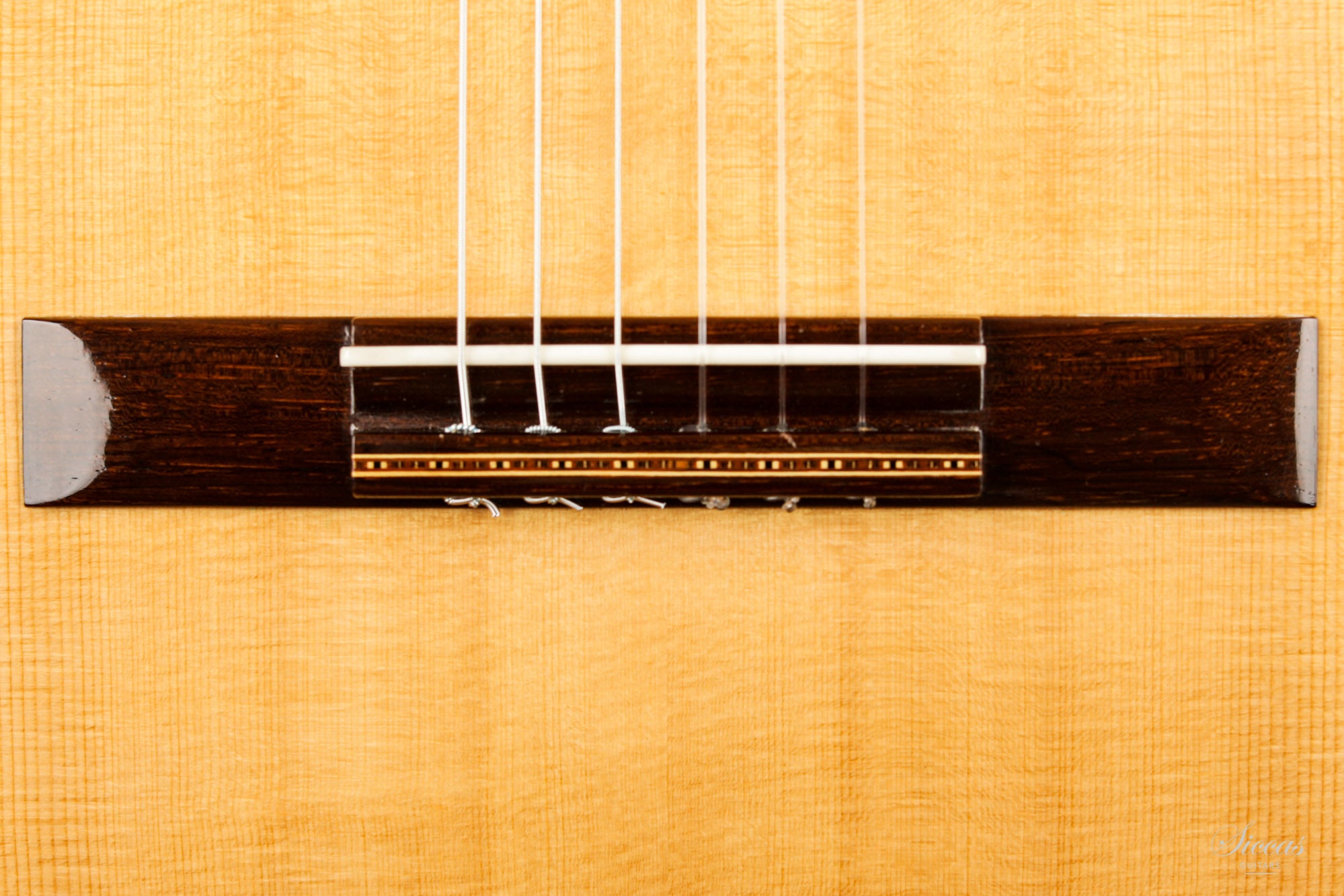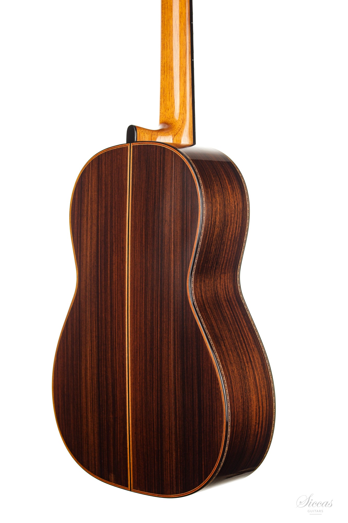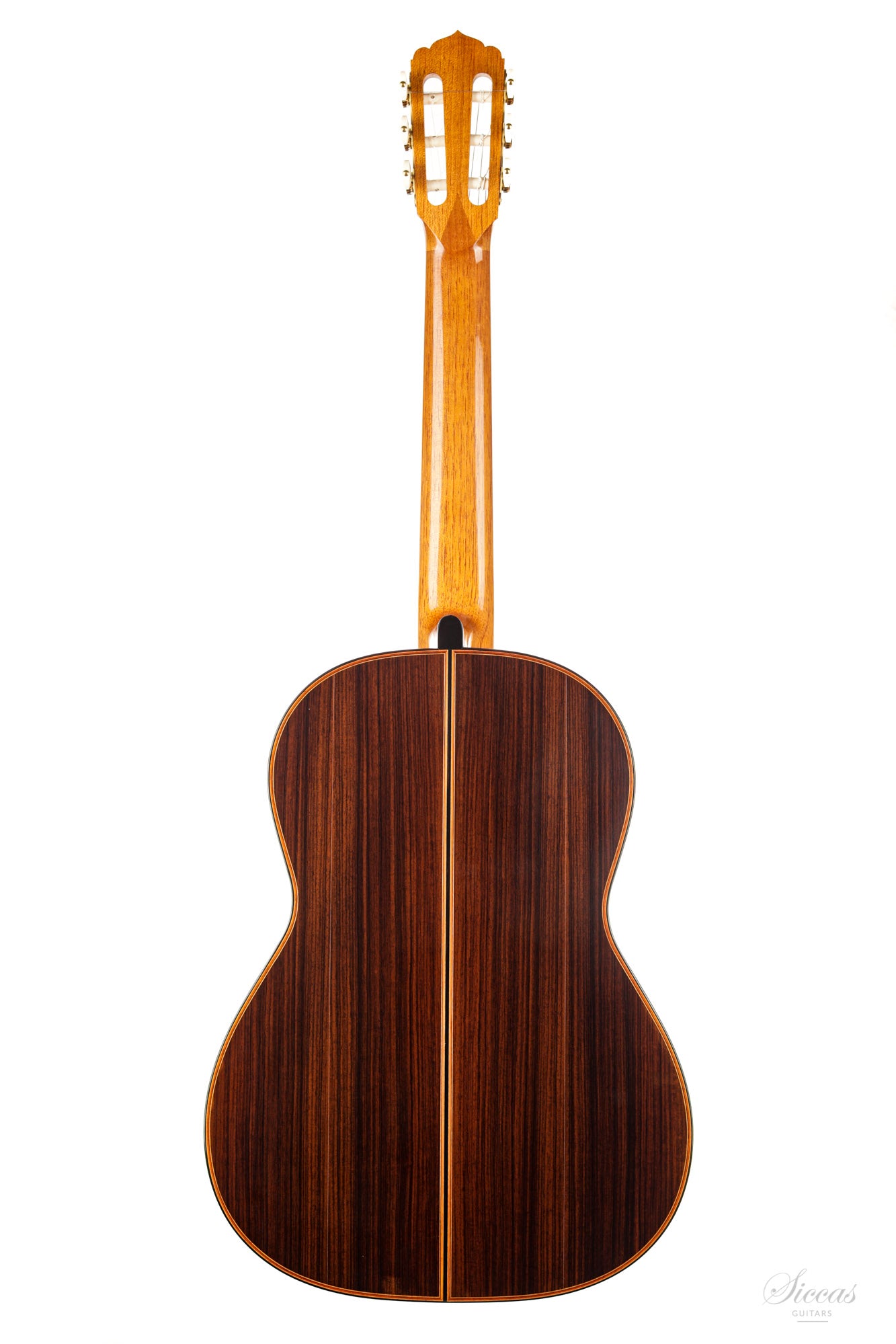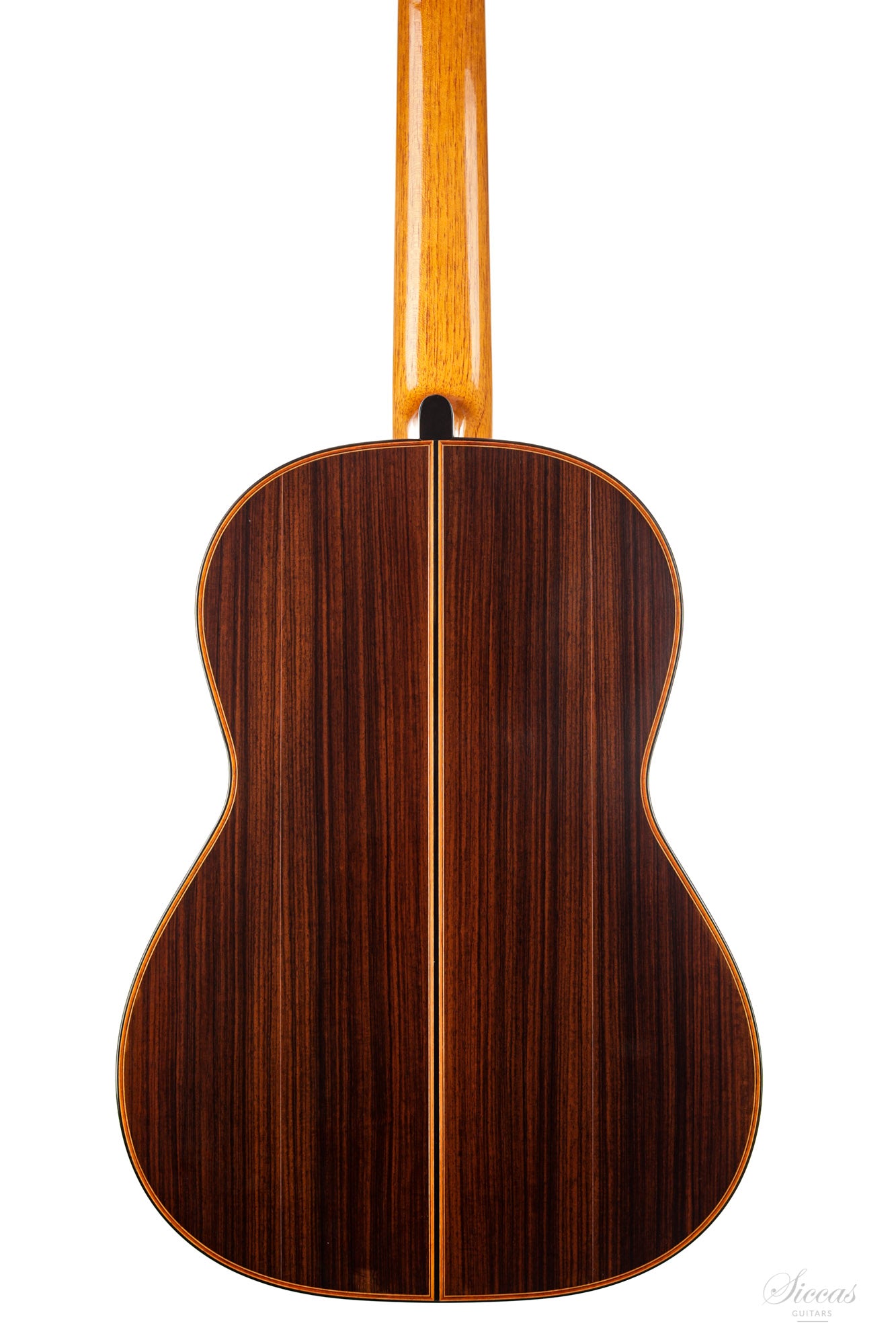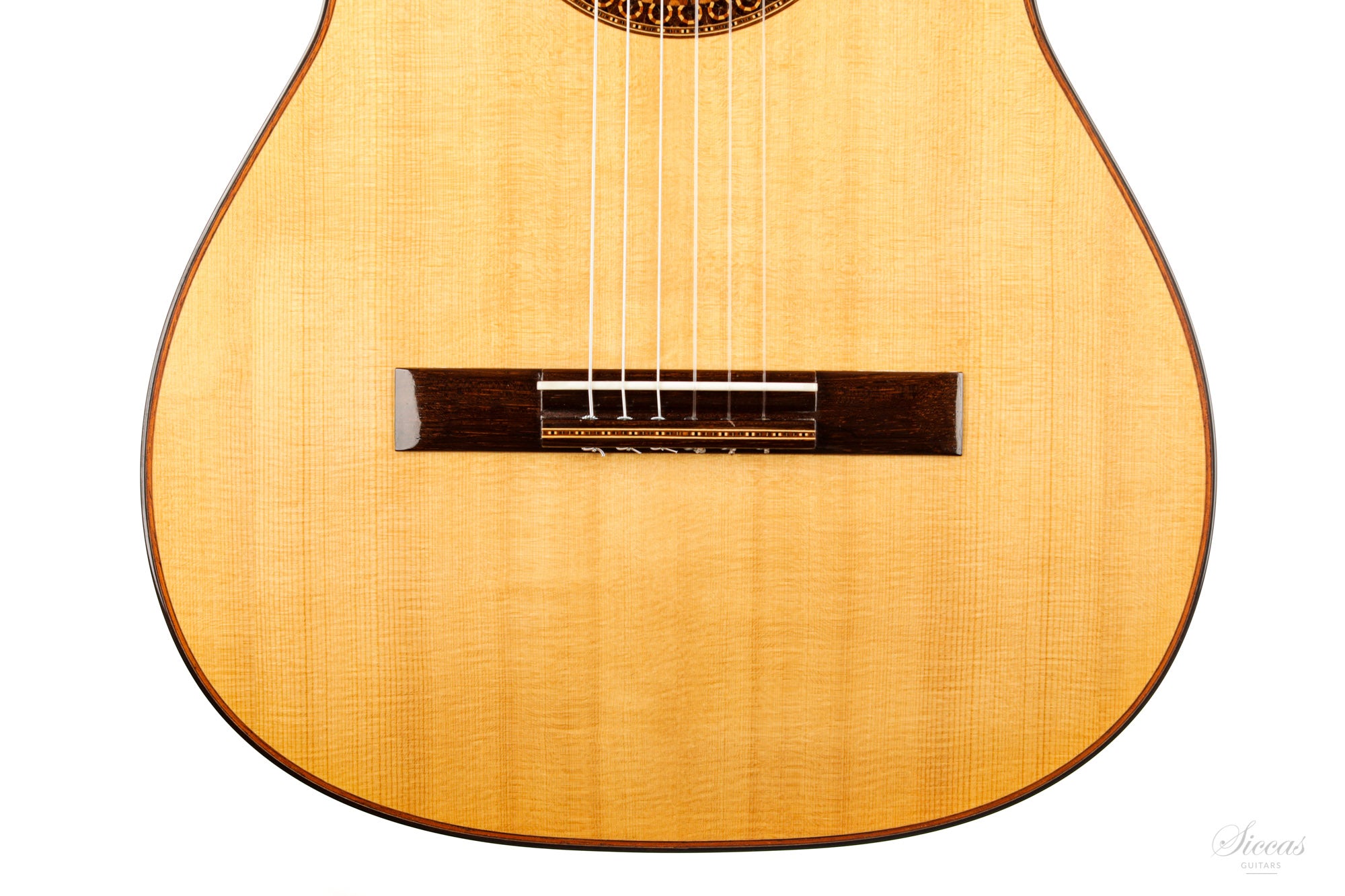 This guitar is named "La Campanula", reminiscent of the beautiful little purple Bellflower. Built in 2016 and numbered 867, it is signed on the label as well as inside the soundboard by both father and son. It is a superb concert model, richly inlaid and featuring the legendary rosette inspired by the mosque of Cordoba. The back is constructed of four pieces of Indian rosewood. The top is also shaped by four pieces, the reason was to select spruce from the most precious and best quarter sawn parts from the raw material. The latter has taken on a magnificent honey colour over the last four years and has few playing marks. A thin, superficial split of about five centimetres, parallel to the joint on the lower left bout has been perfectly stabilized. It is almost not visible and has absolutely no effect on the sound of the instrument.