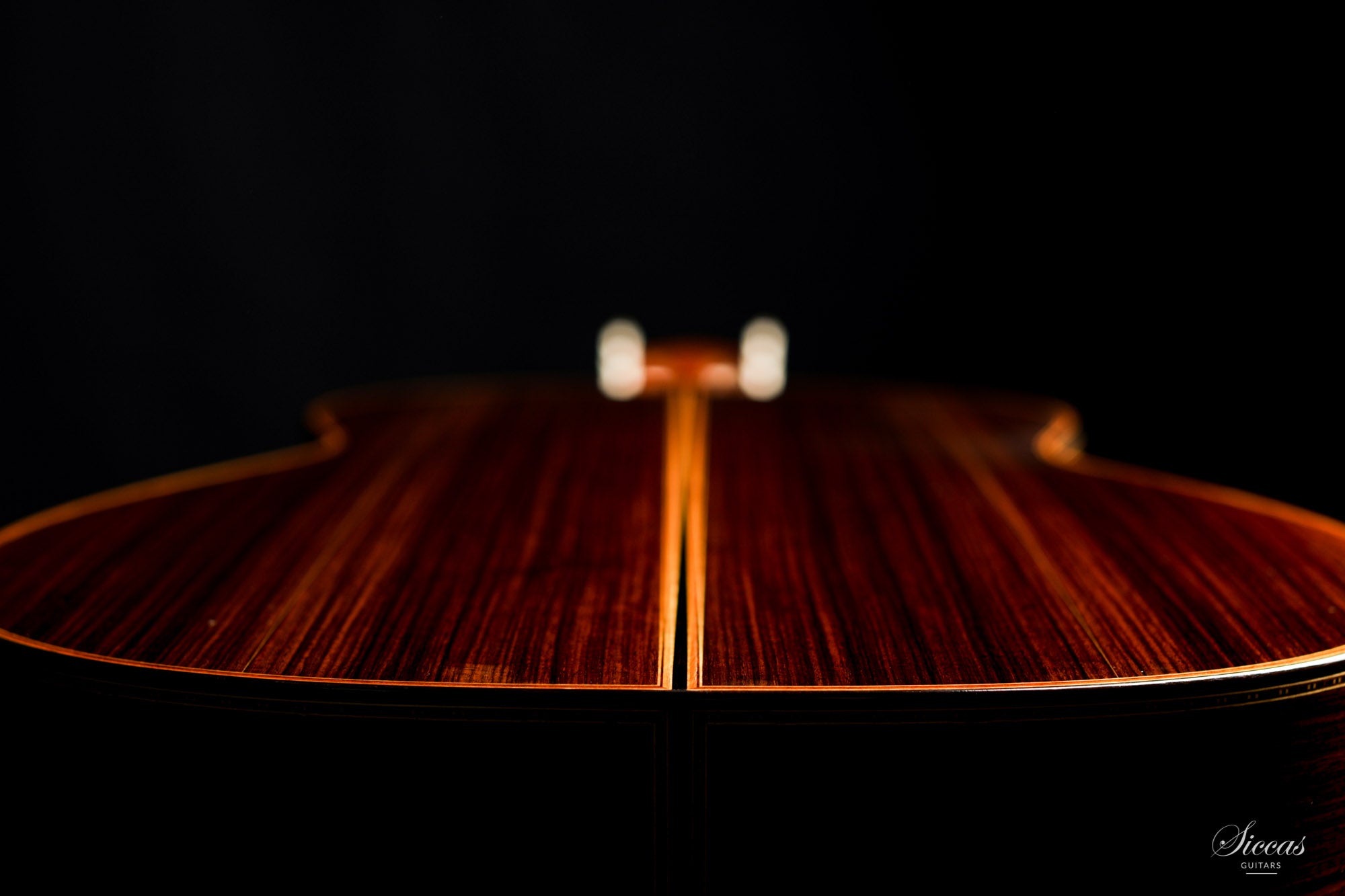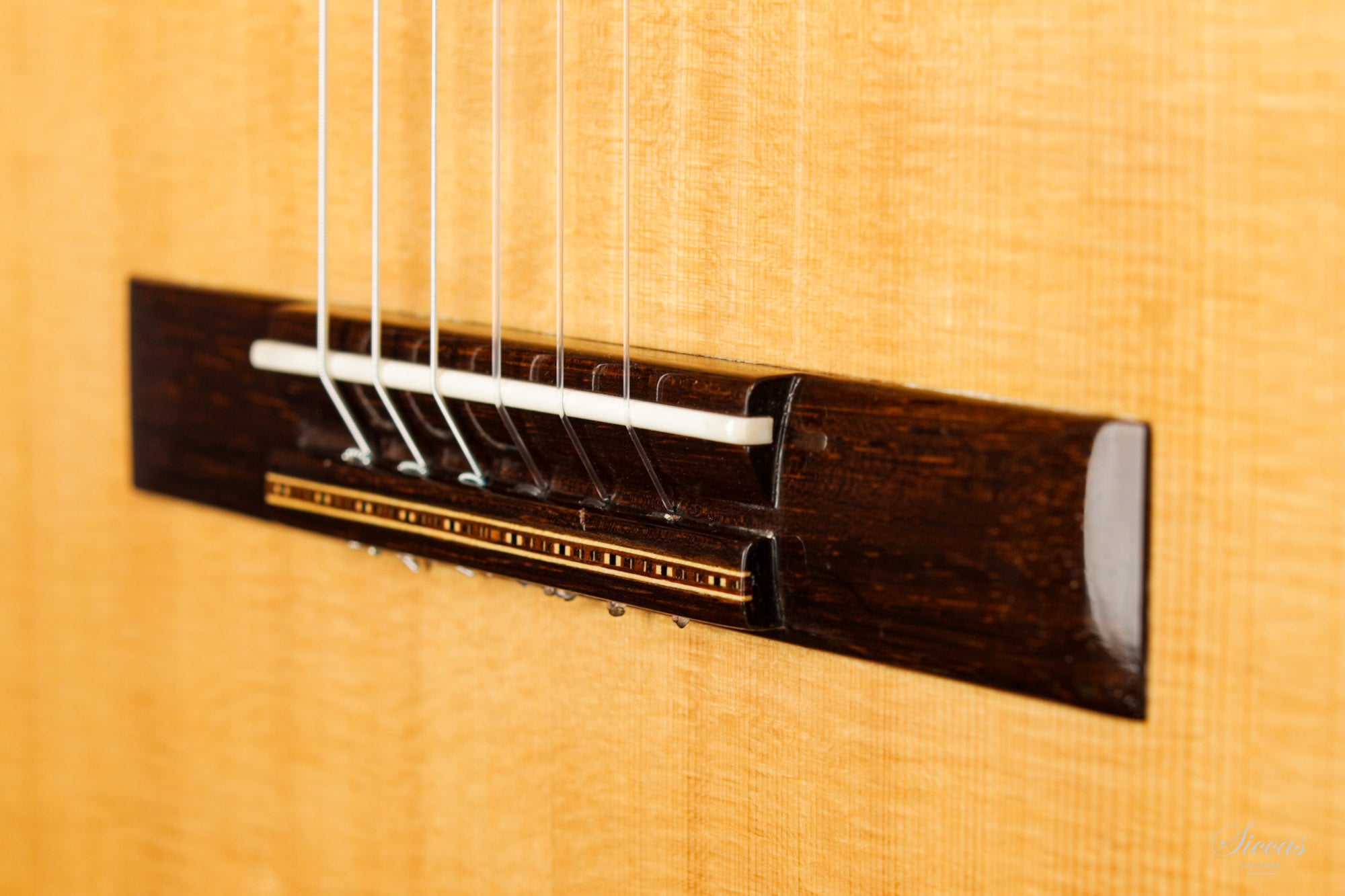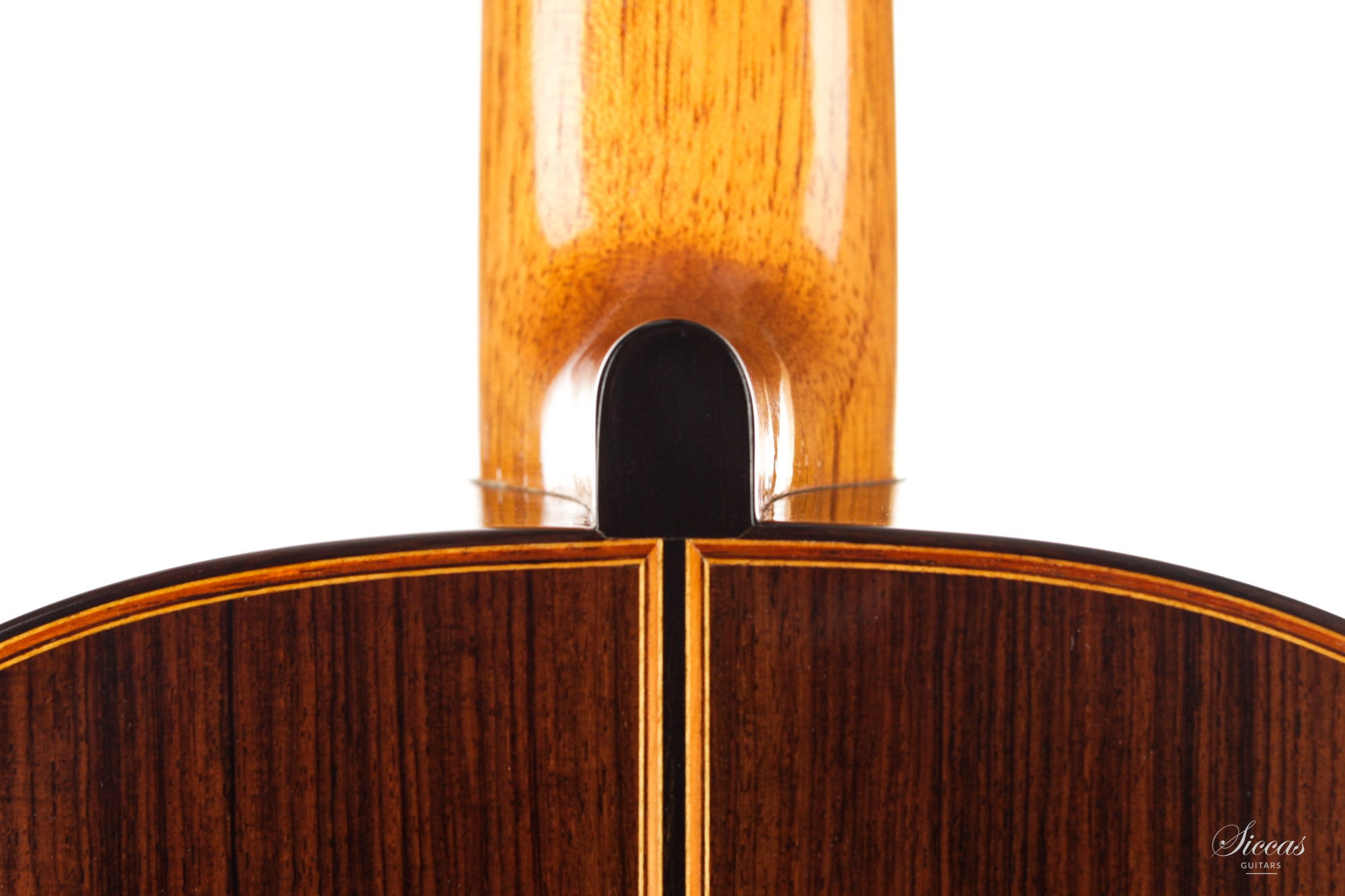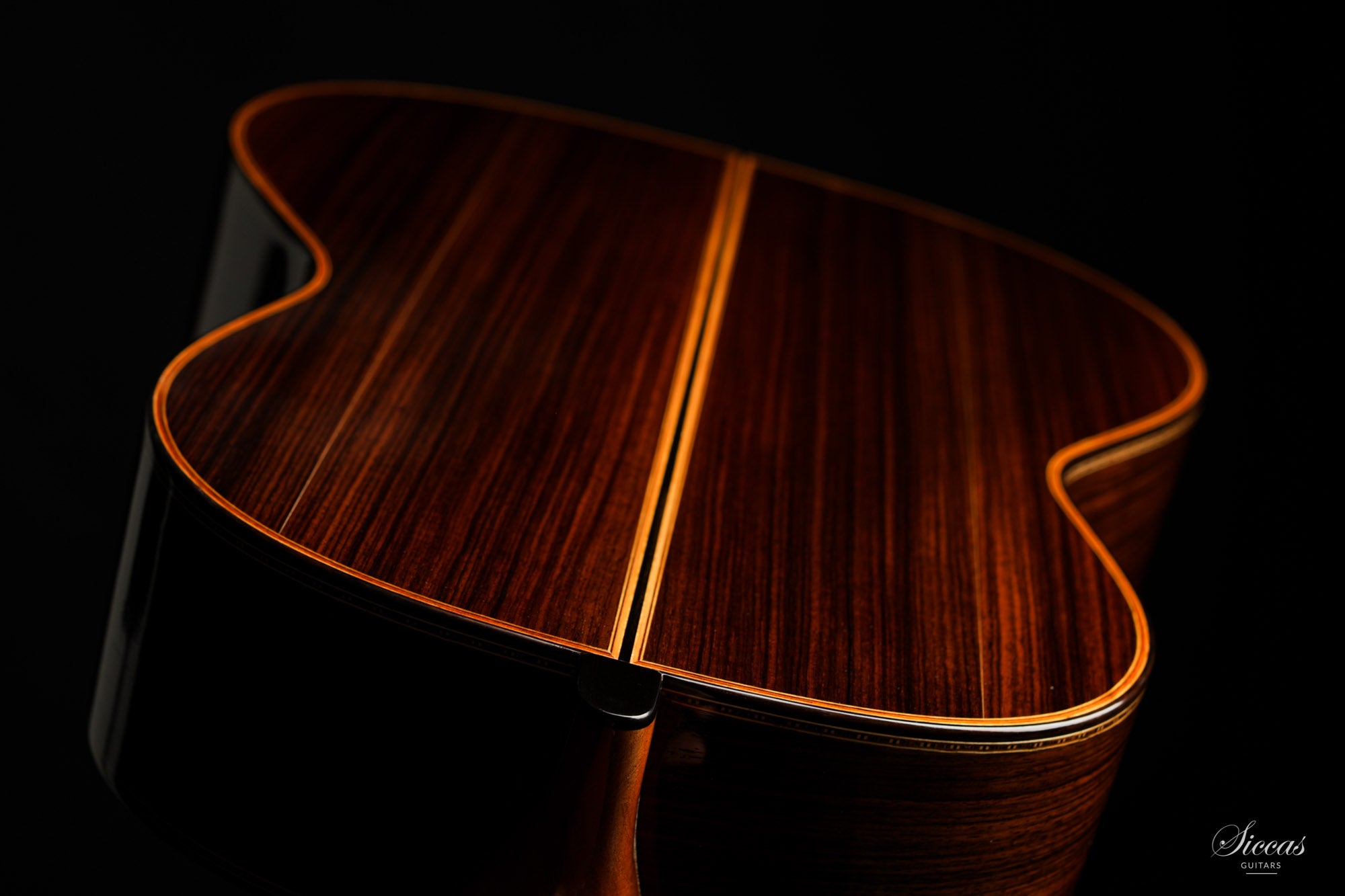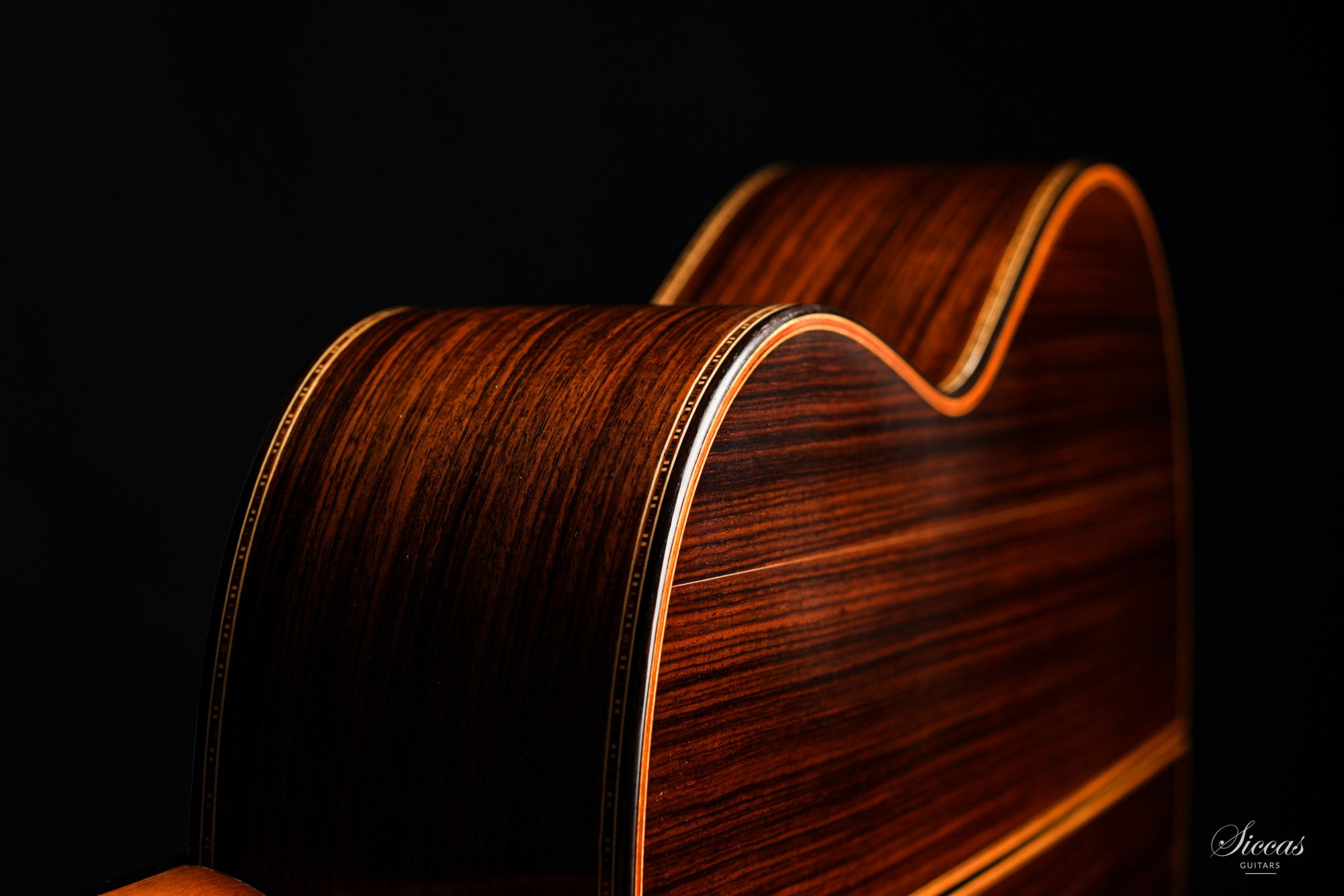 This guitar is named "La Campanula", reminiscent of the beautiful little purple Bellflower. Built in 2016 and numbered 867, it is signed on the label as well as inside the soundboard by both father and son. It is a superb concert model, richly inlaid and featuring the legendary rosette inspired by the mosque of Cordoba. The back is constructed of four pieces of Indian rosewood. The top is also shaped by four pieces, the reason was to select spruce from the most precious and best quarter sawn parts from the raw material. The latter has taken on a magnificent honey colour over the last four years and has few playing marks. A thin, superficial split of about five centimetres, parallel to the joint on the lower left bout has been perfectly stabilized. It is almost not visible and has absolutely no effect on the sound of the instrument.