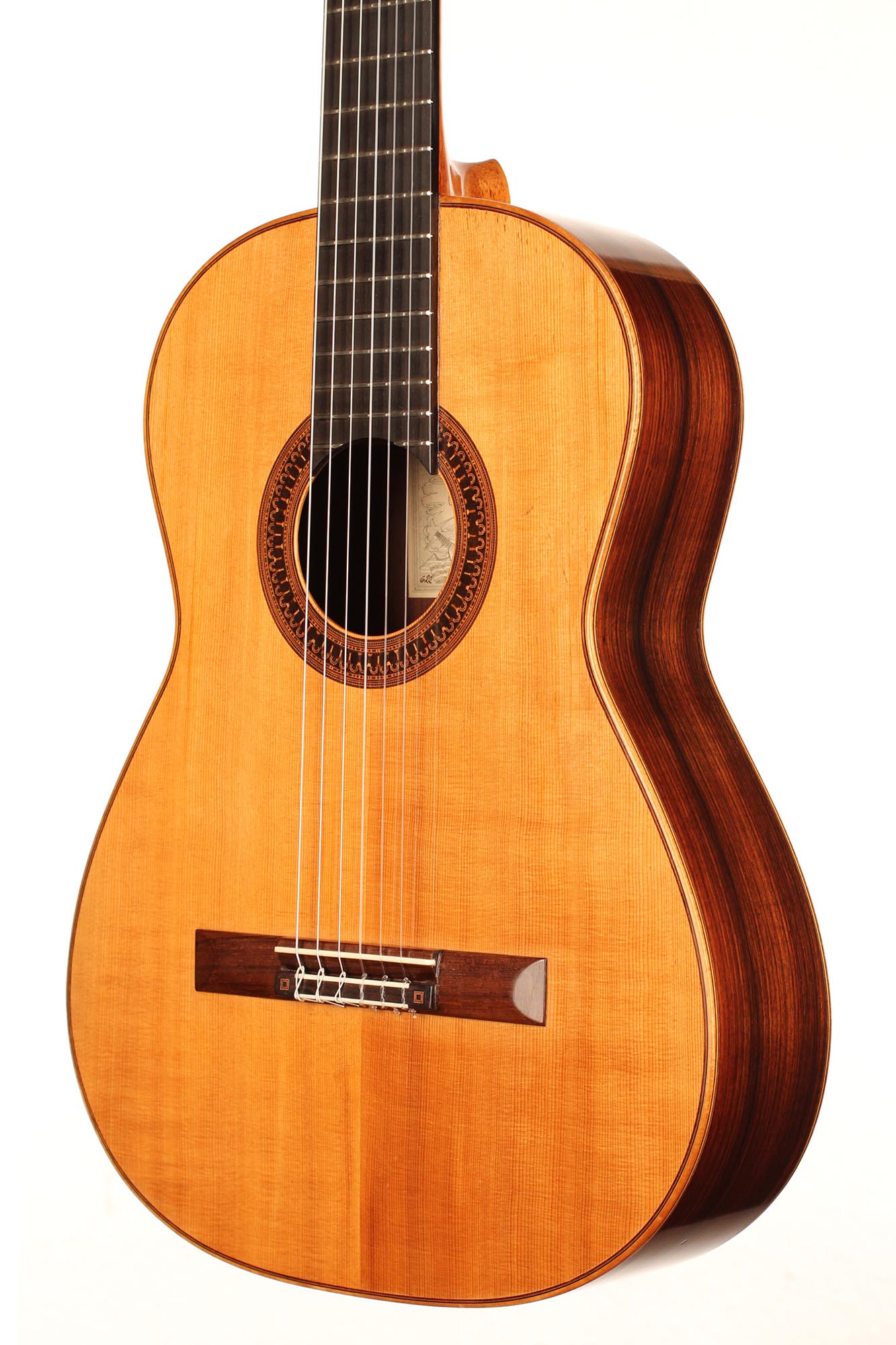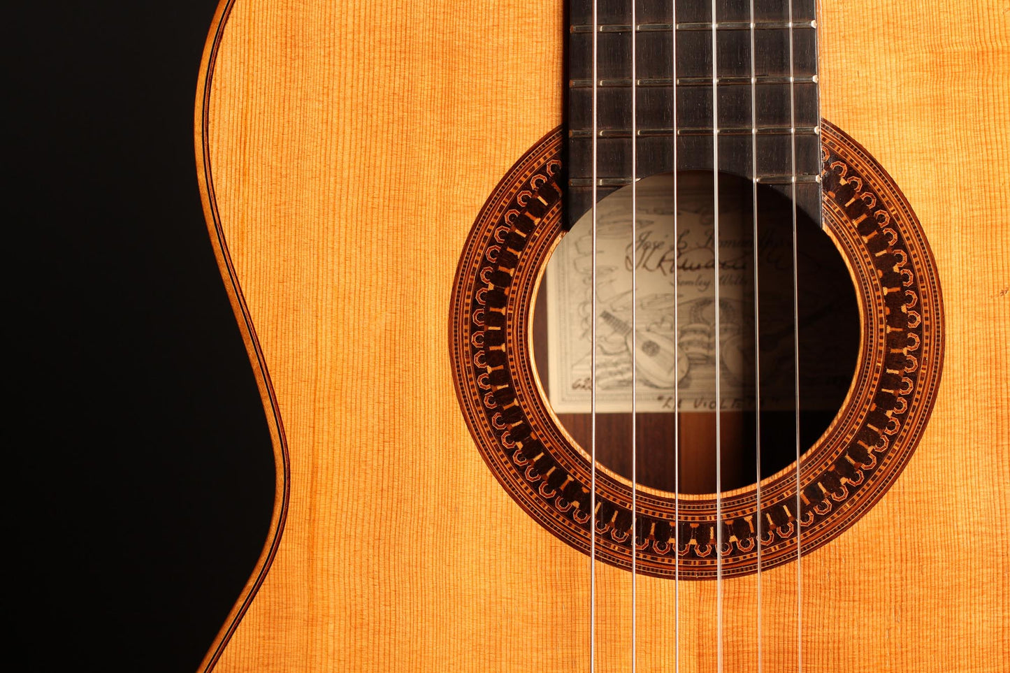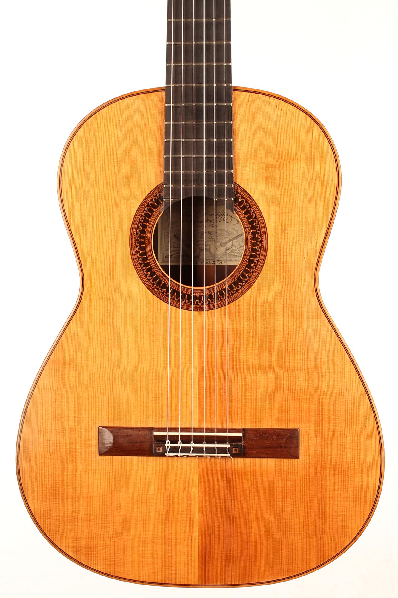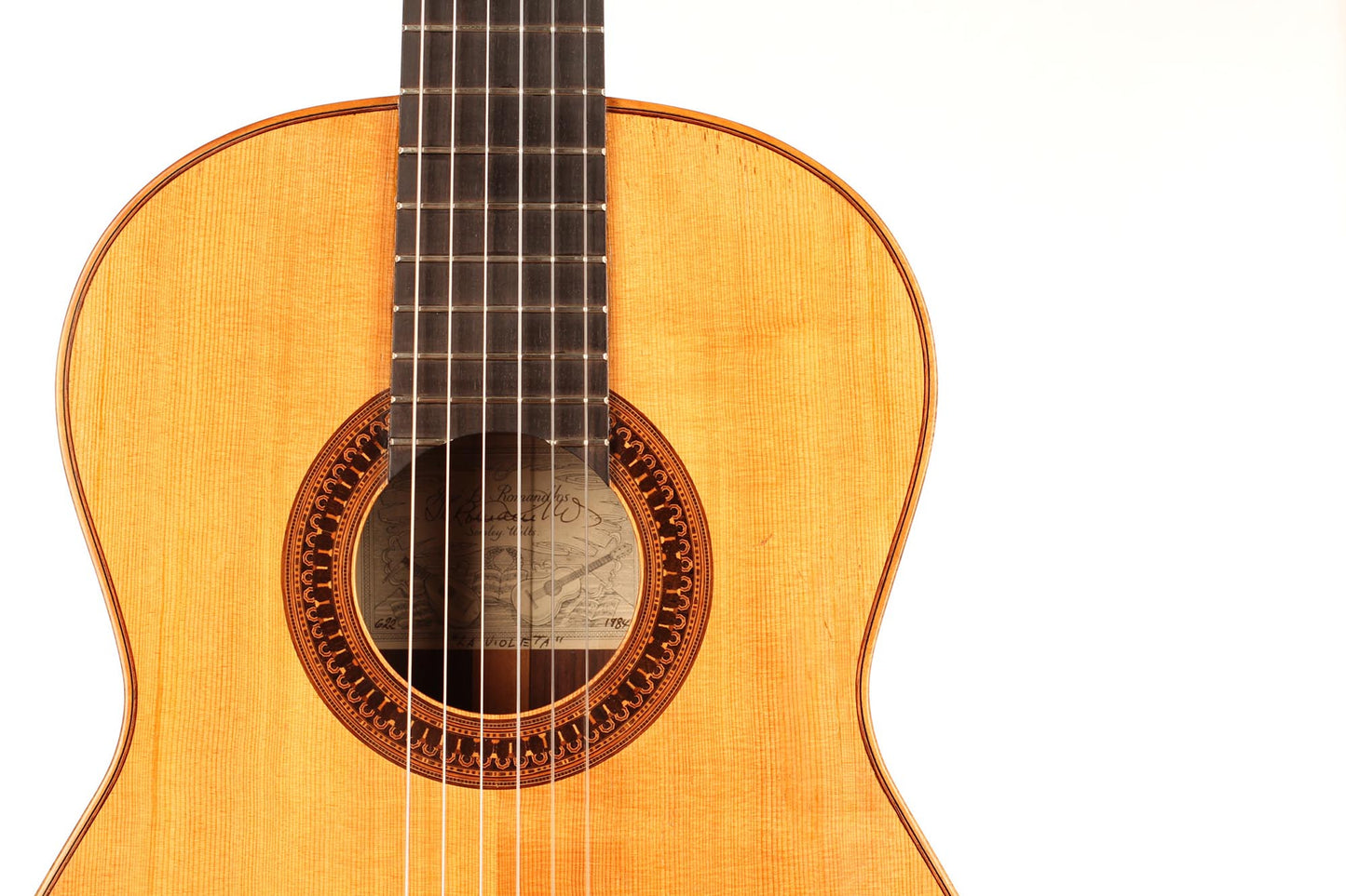 This beautiful instrument was built by José Luis Romanillos in 1984 and is called “La Violeta”. It is an unbelievable instrument for both its sound and aesthetic qualities. This guitar is a very true and sincere instrument. The separation of the voices is perfect and the sustain is fantastic. This guitar not only is a great piece of art and history but also a beautifully sounding instrument with a wide range of colours. The condition is very good, with only a few very well-repaired and stable hair-line cracks on the top. All parts original.