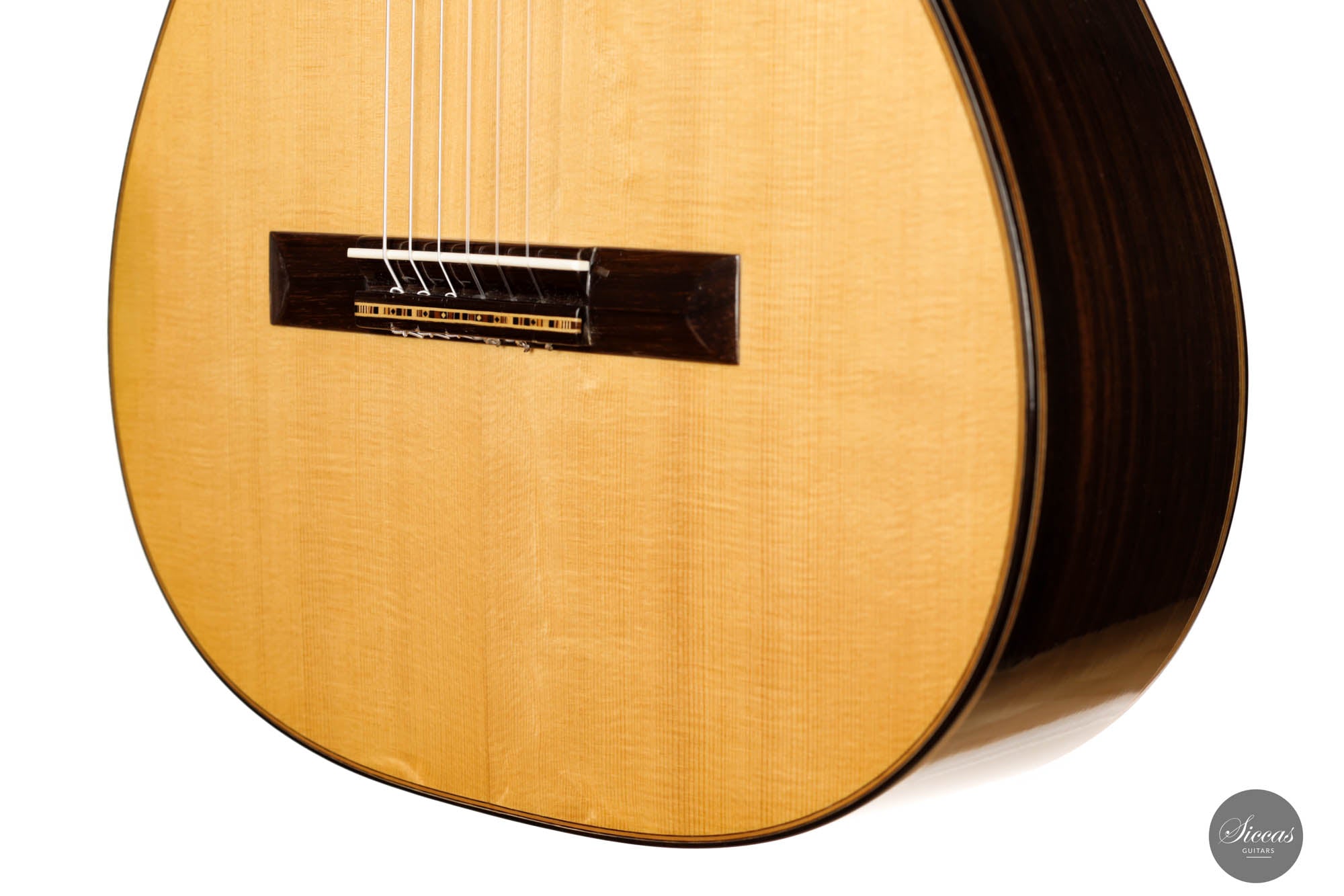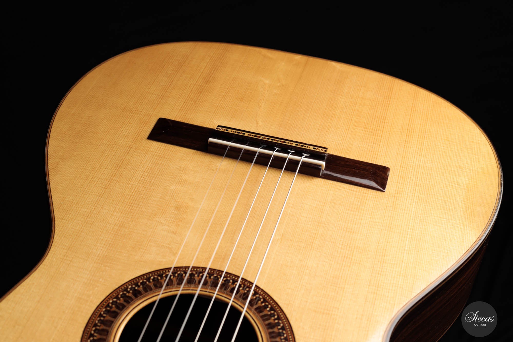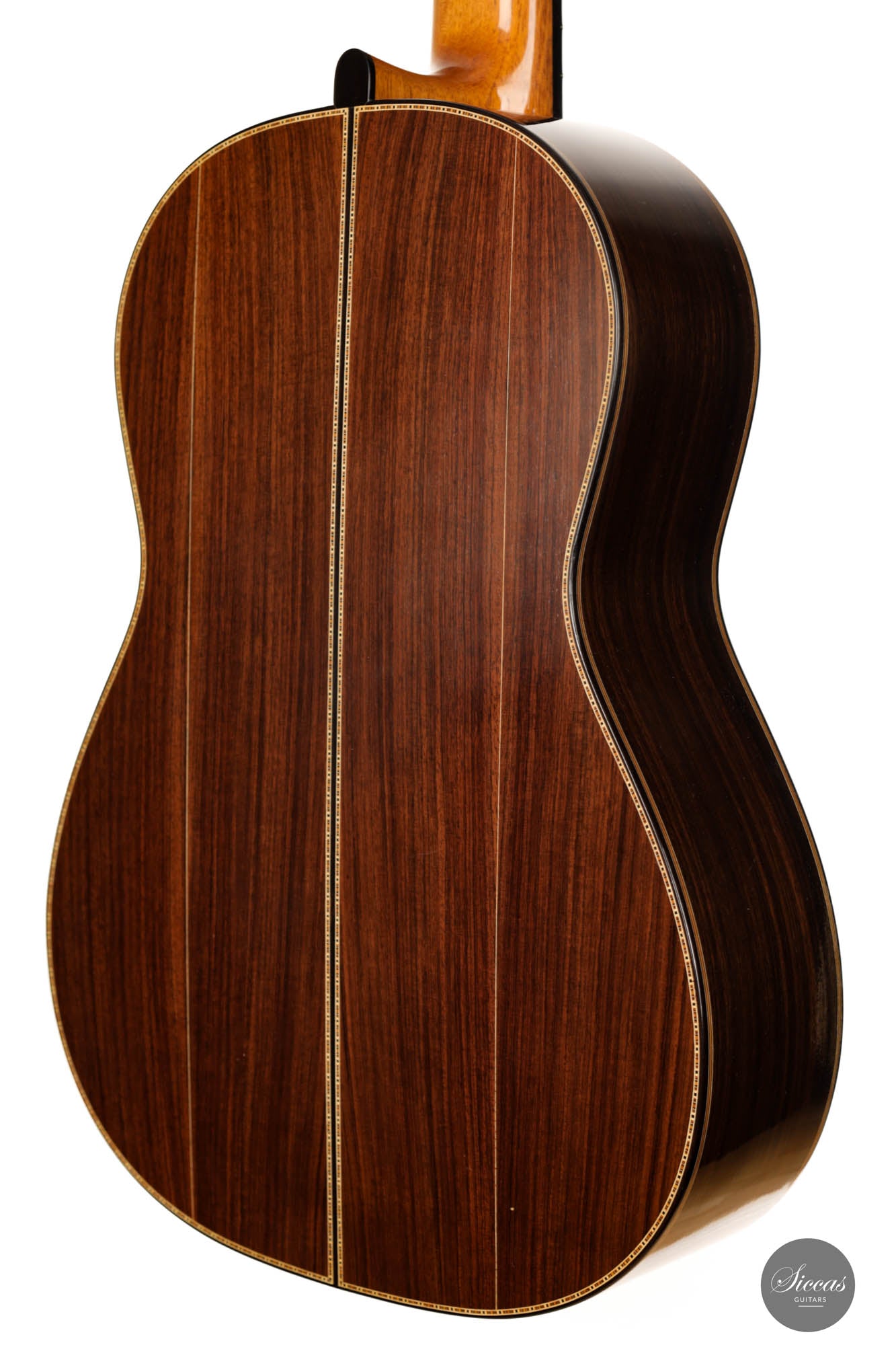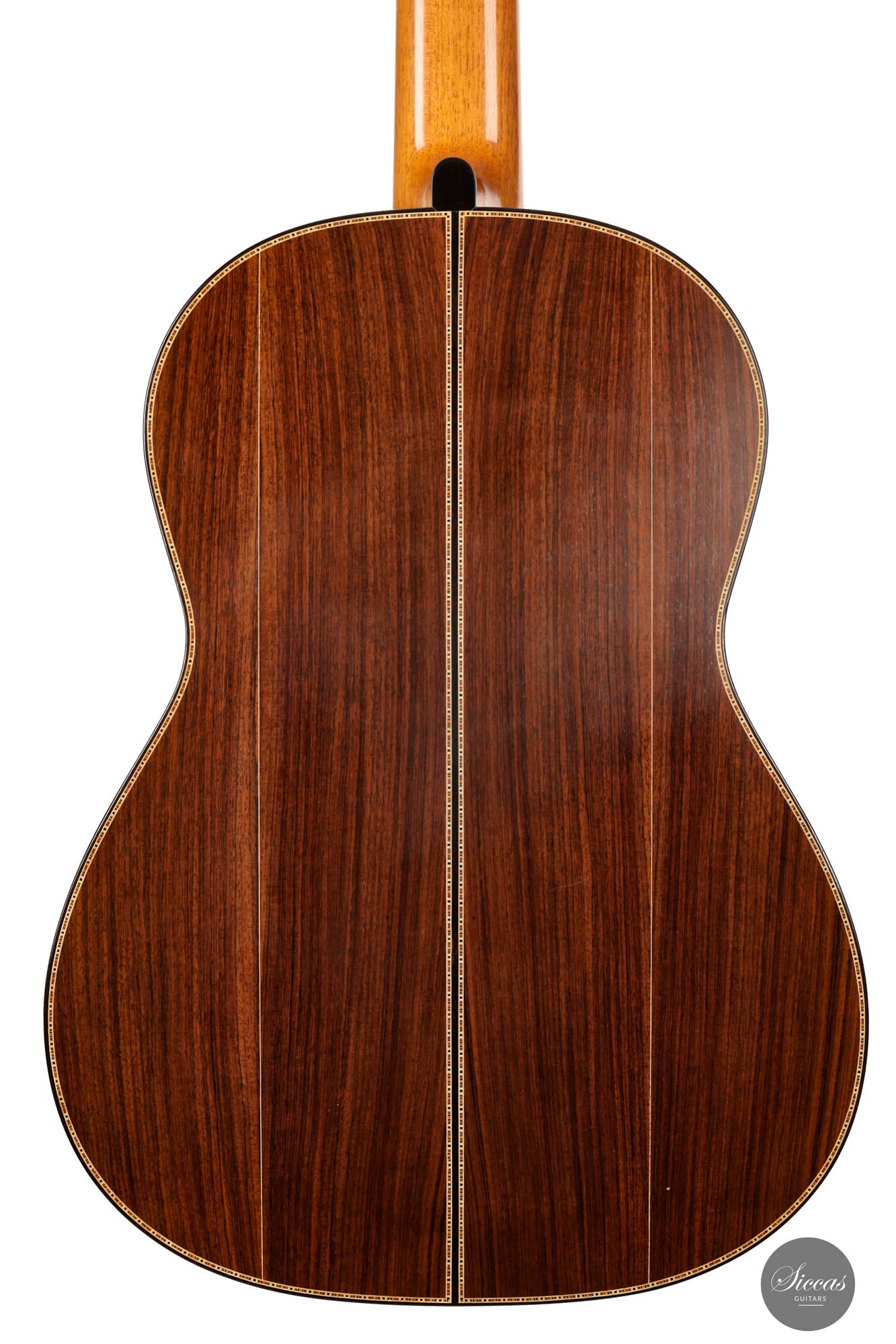 Expertly hand-built in Gillingham, Dorset, this José L. Romanillos & Son masterpiece features a vibrant European spruce soundboard harmoniously paired with four elegantly positioned pieces of Indian rosewood for its back and sides. The instrument's four-piece back boasts a stunning purfling and a central strip, with its original condition demonstrating meticulous maintenance over the years.