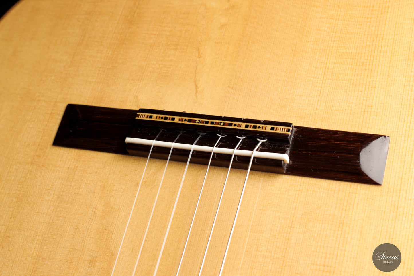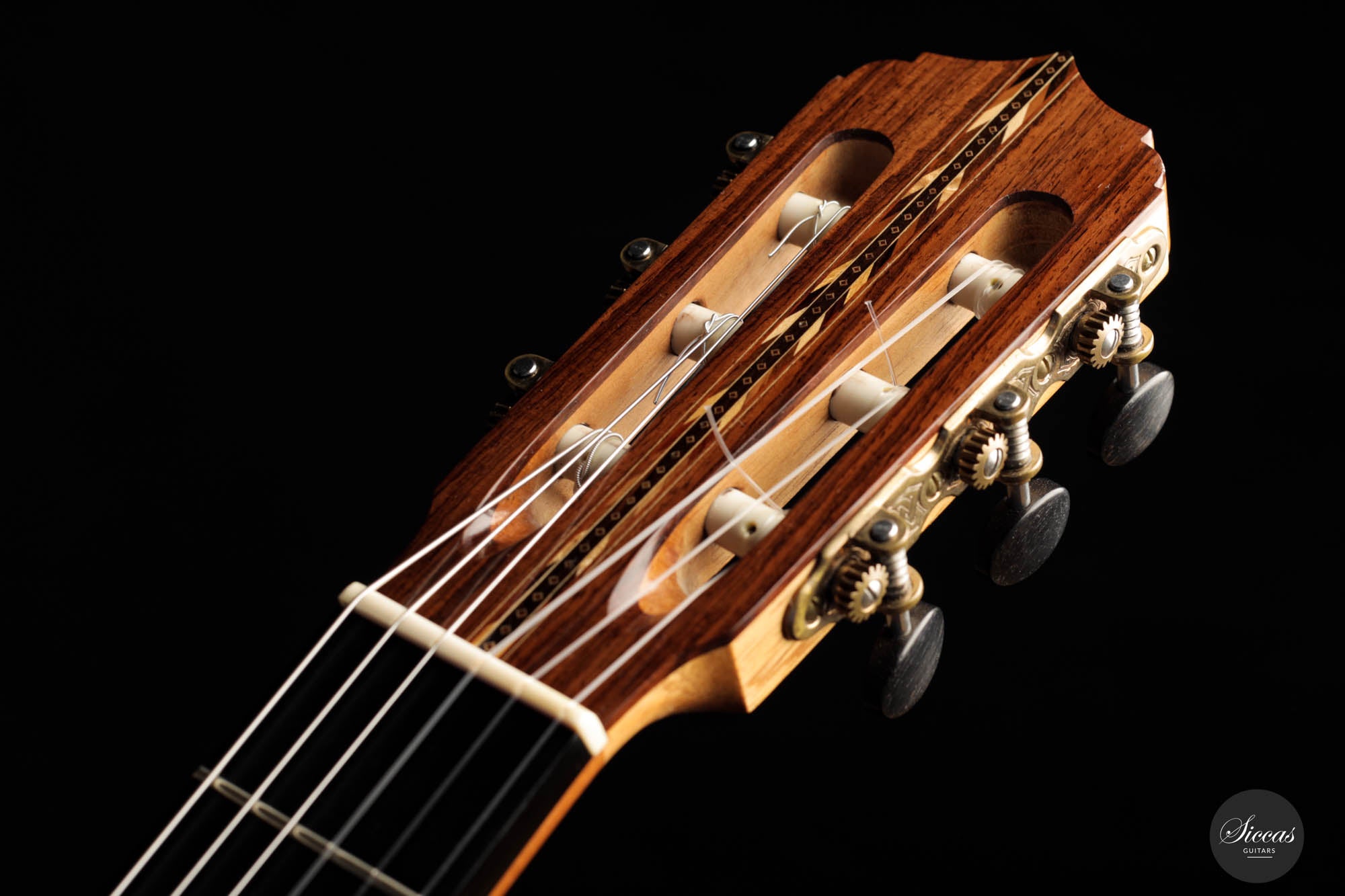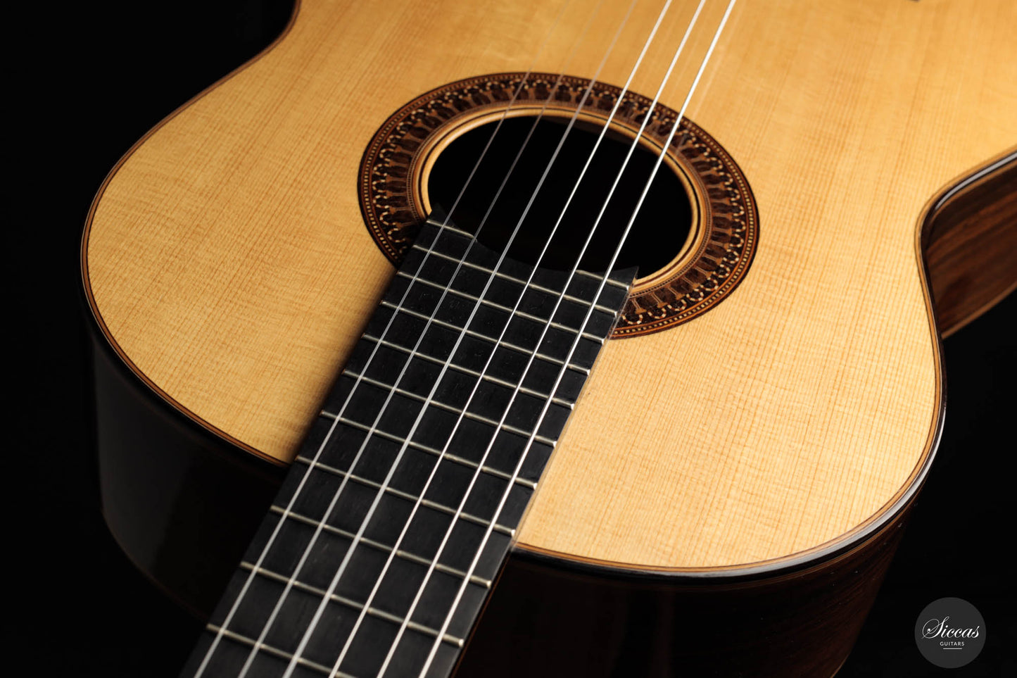 Expertly hand-built in Gillingham, Dorset, this José L. Romanillos & Son masterpiece features a vibrant European spruce soundboard harmoniously paired with four elegantly positioned pieces of Indian rosewood for its back and sides. The instrument's four-piece back boasts a stunning purfling and a central strip, with its original condition demonstrating meticulous maintenance over the years.
