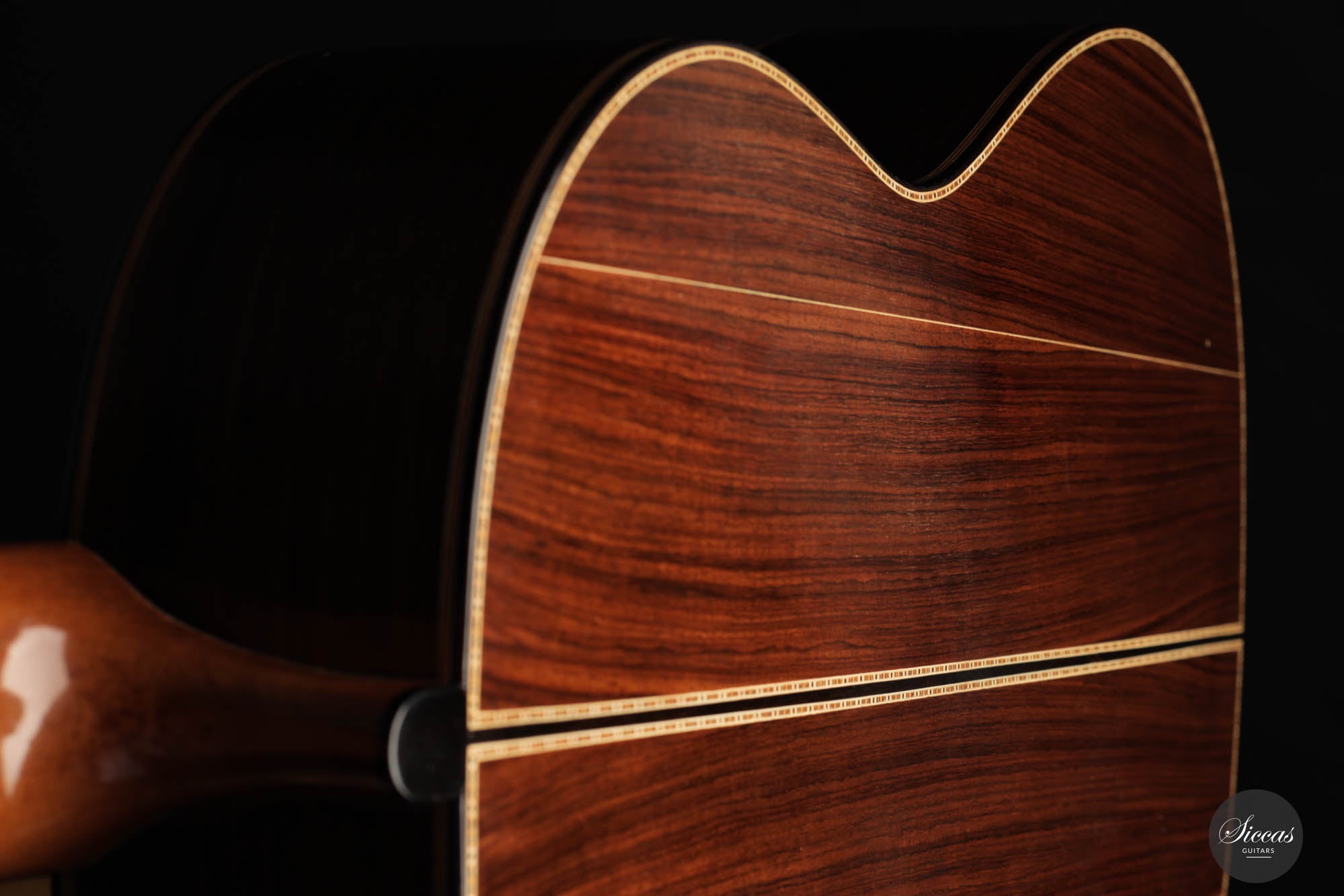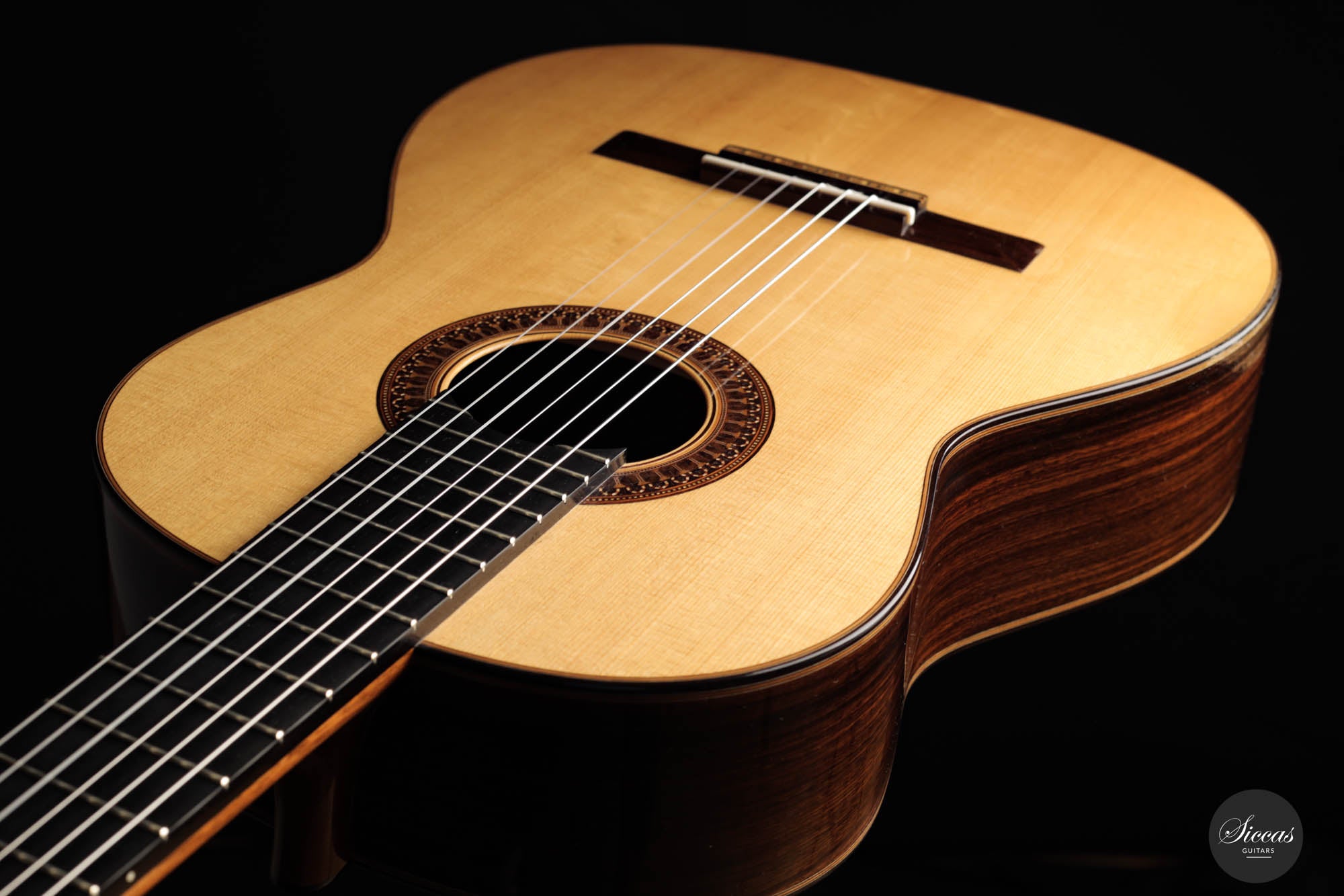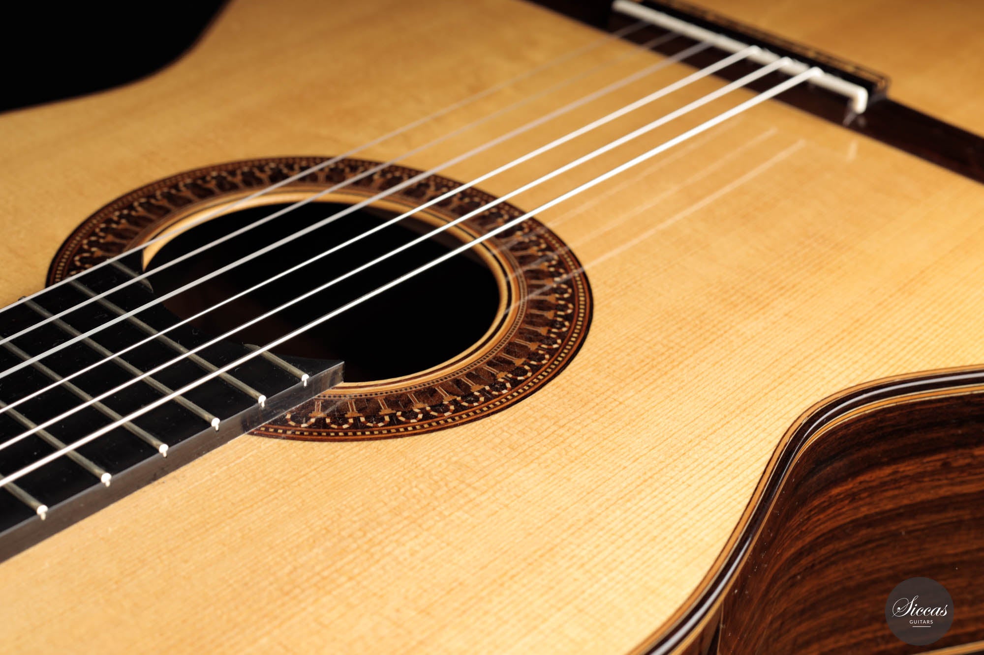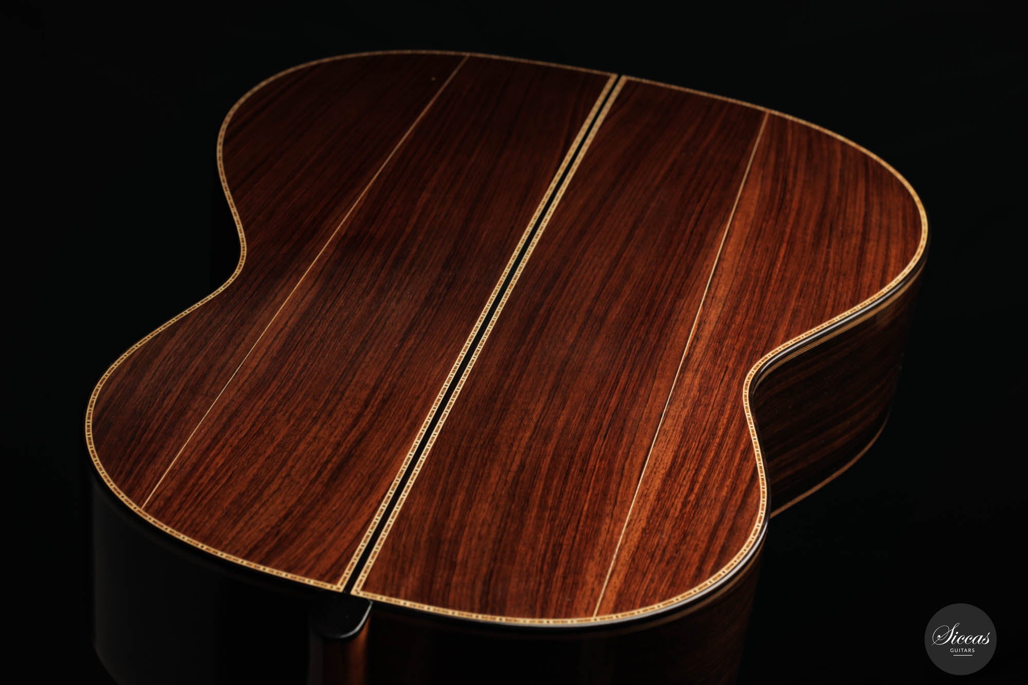 Expertly hand-built in Gillingham, Dorset, this José L. Romanillos & Son masterpiece features a vibrant European spruce soundboard harmoniously paired with four elegantly positioned pieces of Indian rosewood for its back and sides. The instrument's four-piece back boasts a stunning purfling and a central strip, with its original condition demonstrating meticulous maintenance over the years.