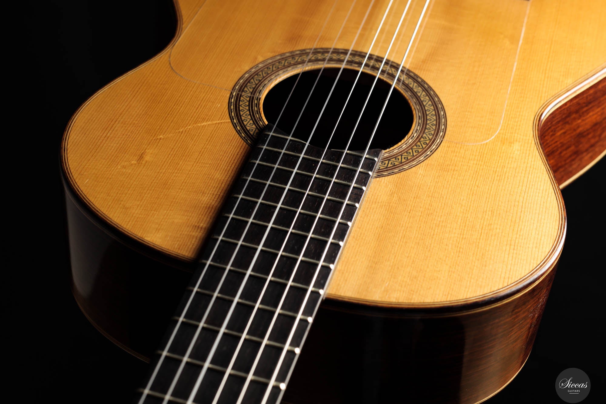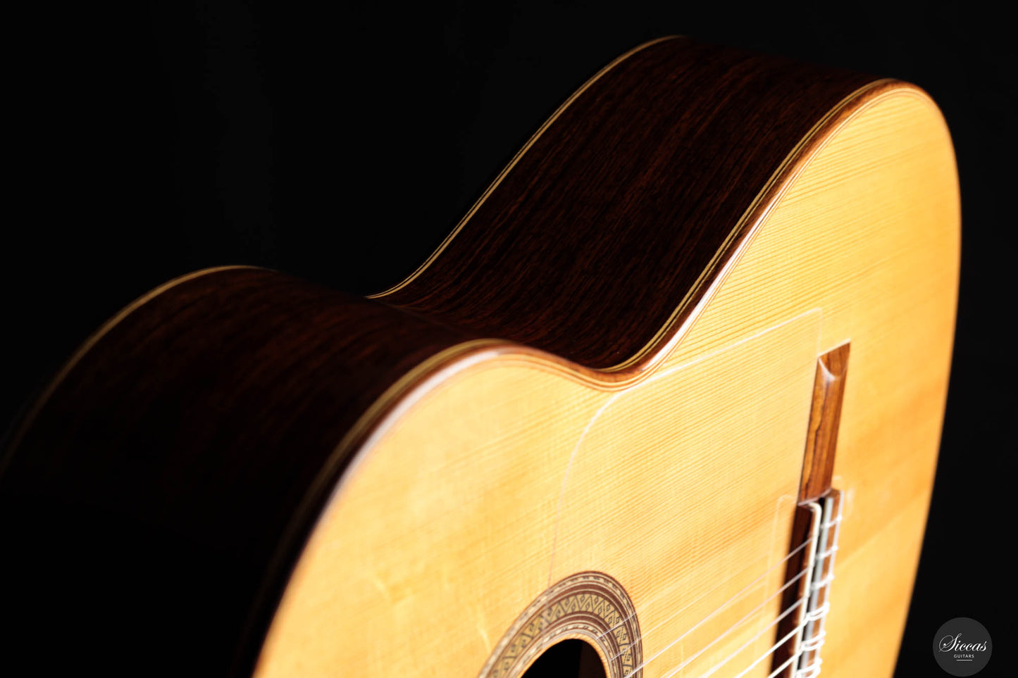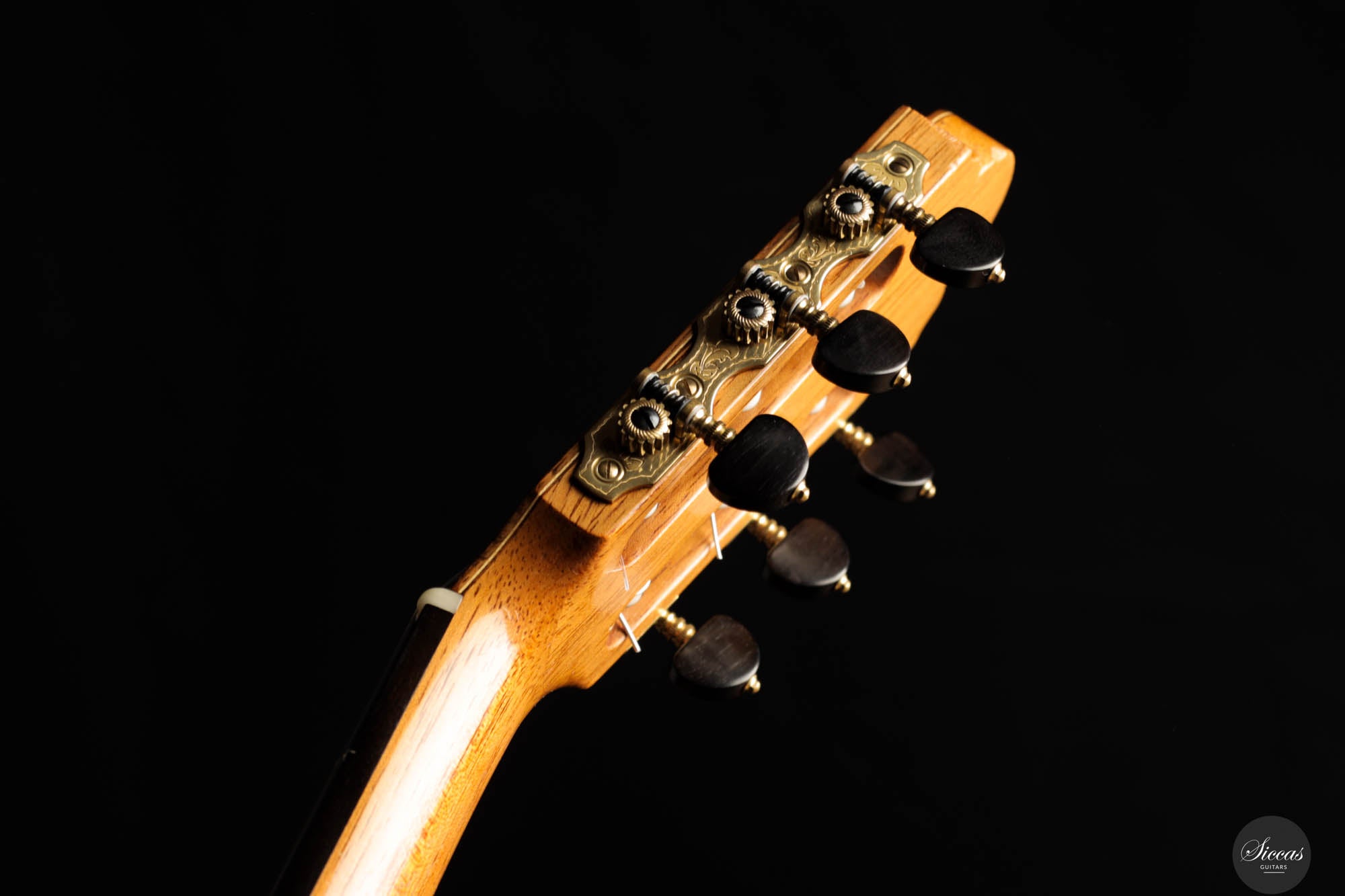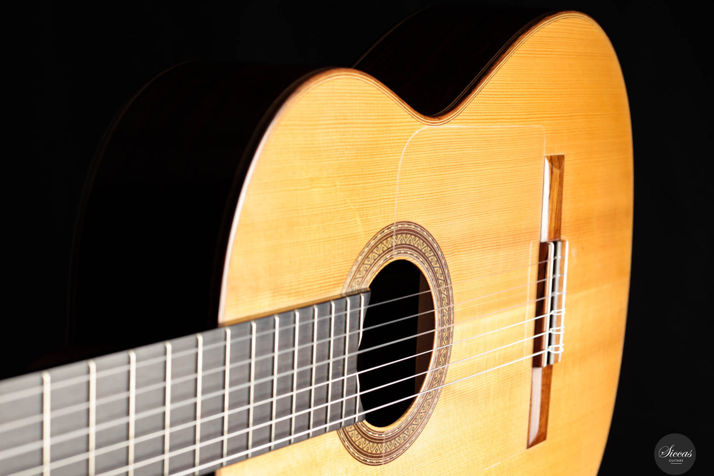 This “flamenca negra”, numbered 681, has a finely grained spruce top and Indian rosewood back and sides. Its low body resonance around E/F sets it apart from other flamenco guitars, showcasing round deep basses and not-so-short sustain. Naturally, it has a fast response and an overall bright tone, offering nevertheless many colour possibilities. This instrument is in very good condition with several but shallow playing wear and no structural issues, an indication of both well-executed craftsmanship and diligent maintenance. This ensures that the instrument not only retains its aesthetic appeal but also its sound quality and playability over time.Regular care extends the life of the instrument