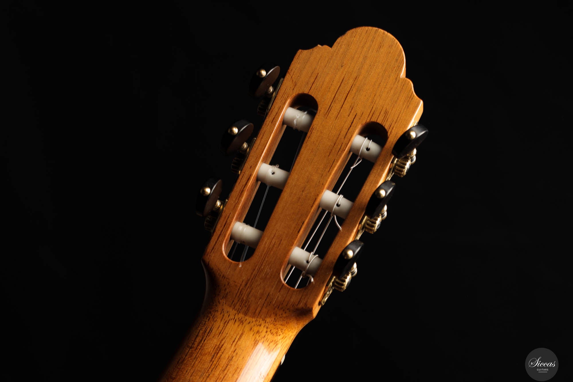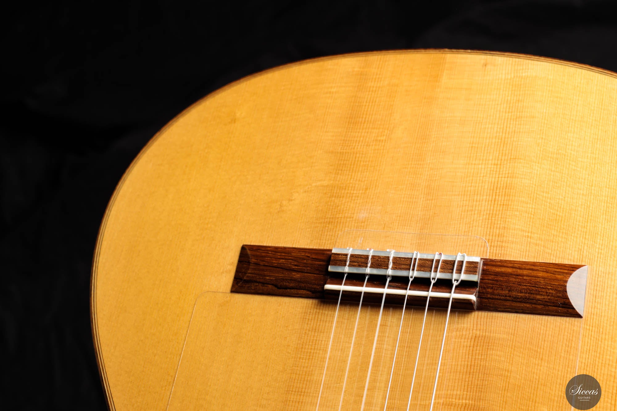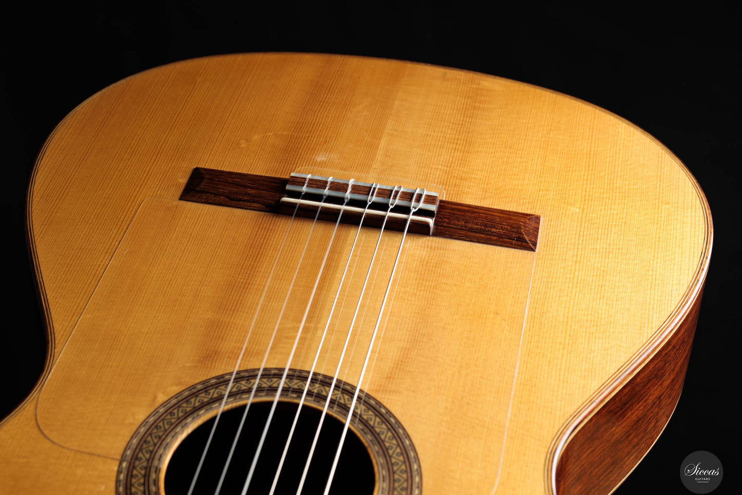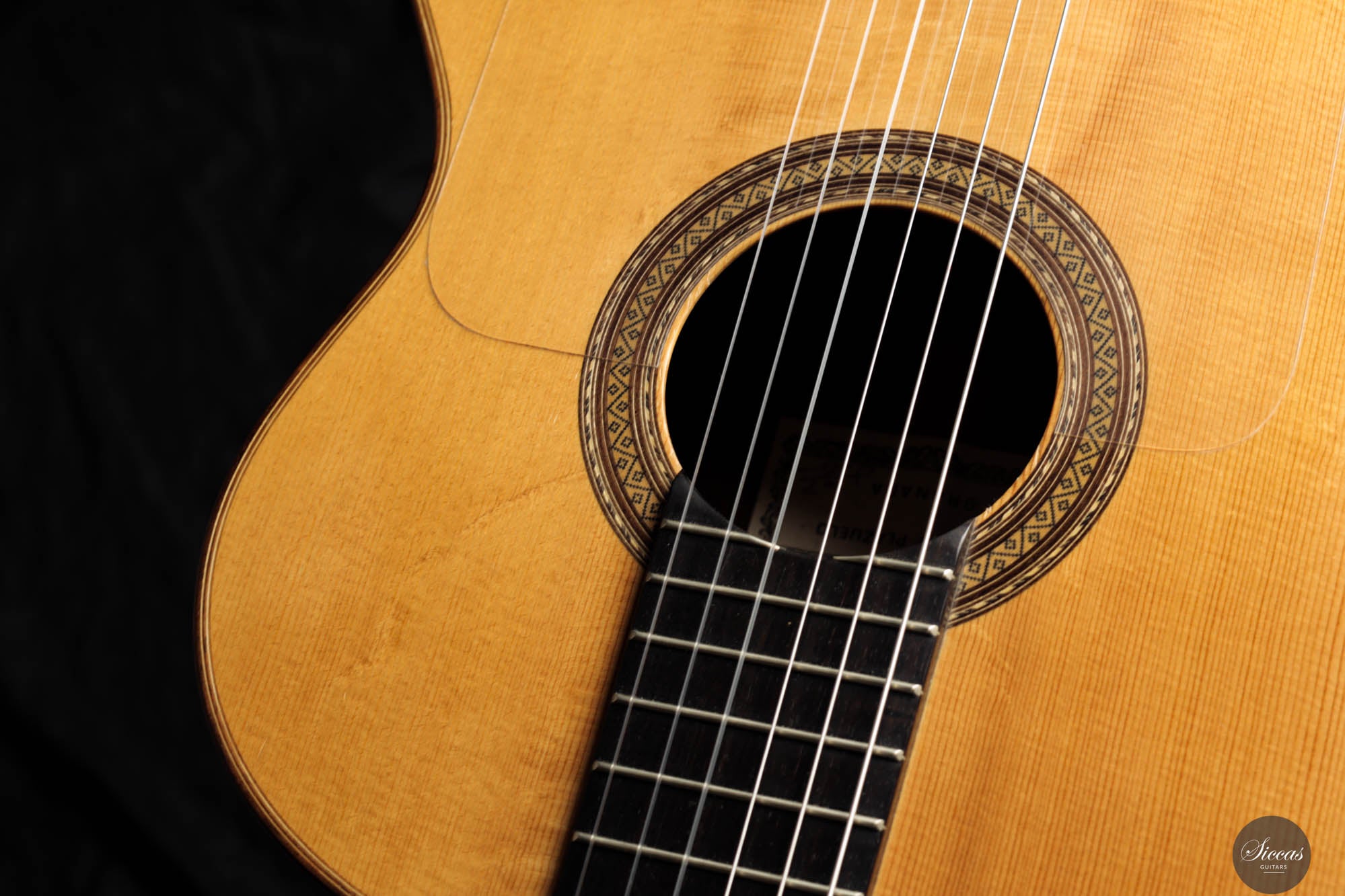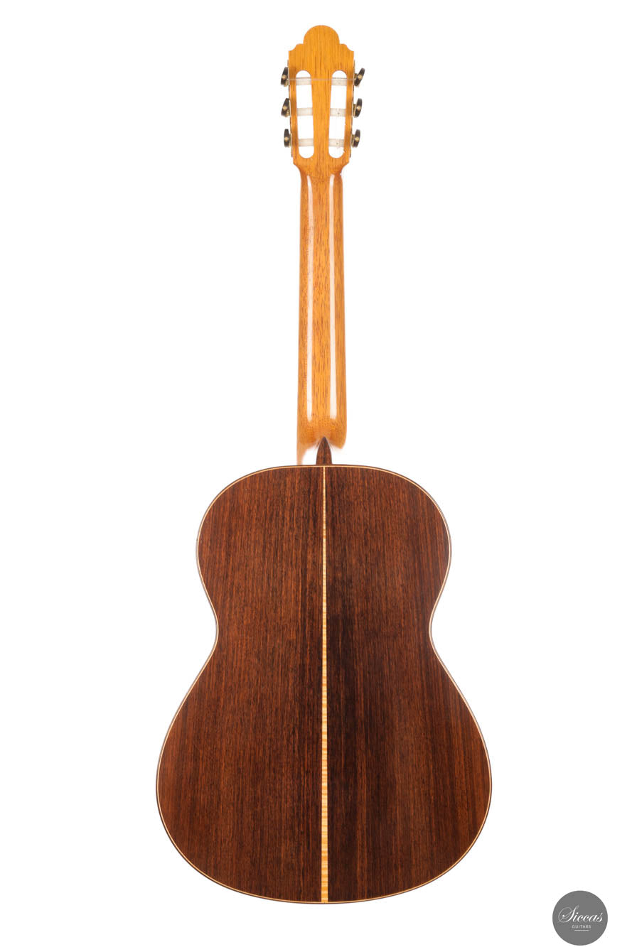 This “flamenca negra”, numbered 681, has a finely grained spruce top and Indian rosewood back and sides. Its low body resonance around E/F sets it apart from other flamenco guitars, showcasing round deep basses and not-so-short sustain. Naturally, it has a fast response and an overall bright tone, offering nevertheless many colour possibilities. This instrument is in very good condition with several but shallow playing wear and no structural issues, an indication of both well-executed craftsmanship and diligent maintenance. This ensures that the instrument not only retains its aesthetic appeal but also its sound quality and playability over time.Regular care extends the life of the instrument