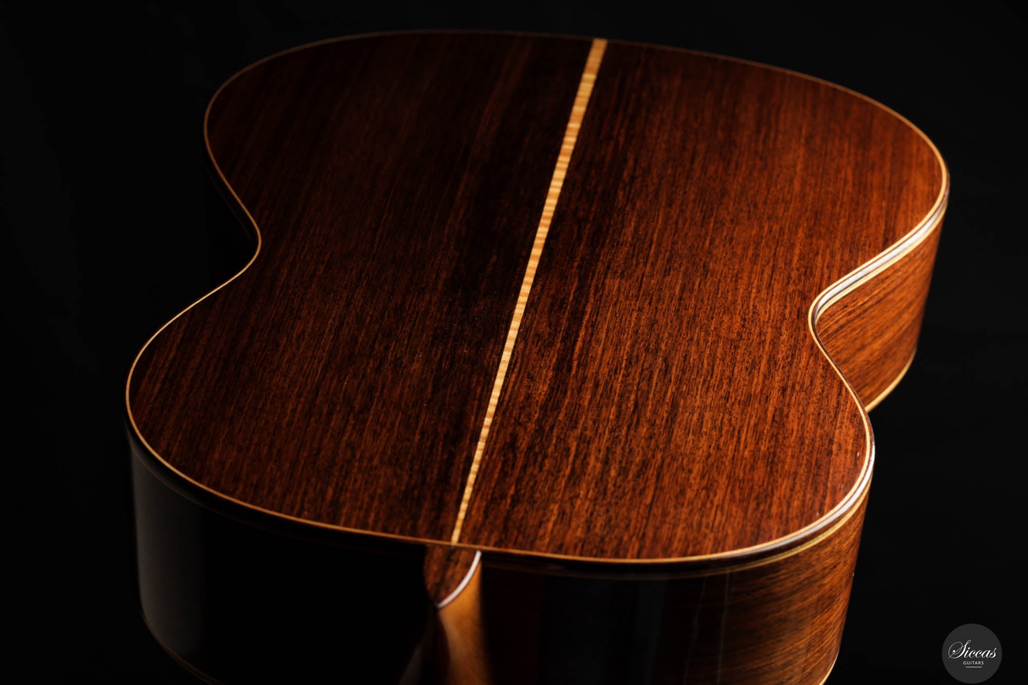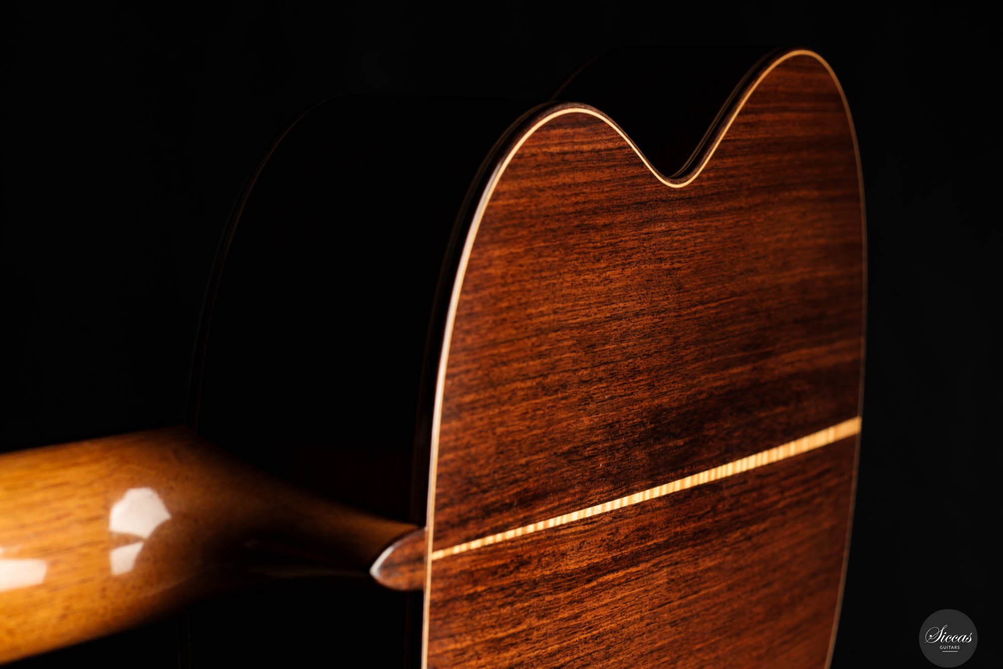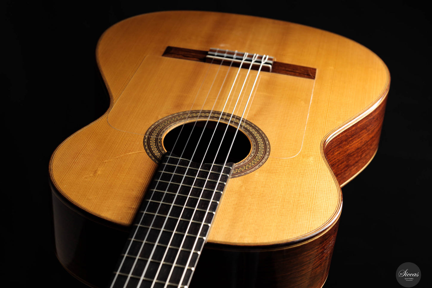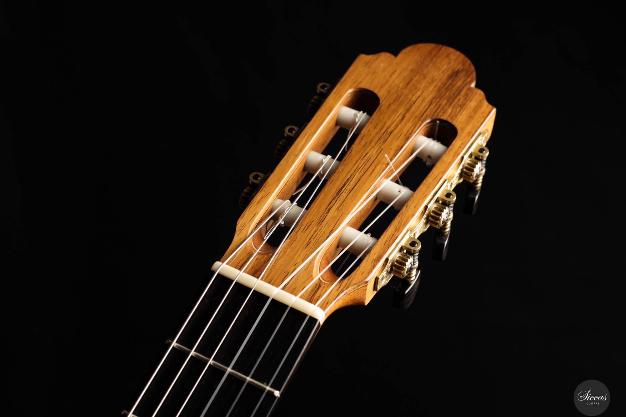 This “flamenca negra”, numbered 681, has a finely grained spruce top and Indian rosewood back and sides. Its low body resonance around E/F sets it apart from other flamenco guitars, showcasing round deep basses and not-so-short sustain. Naturally, it has a fast response and an overall bright tone, offering nevertheless many colour possibilities. This instrument is in very good condition with several but shallow playing wear and no structural issues, an indication of both well-executed craftsmanship and diligent maintenance. This ensures that the instrument not only retains its aesthetic appeal but also its sound quality and playability over time.Regular care extends the life of the instrument