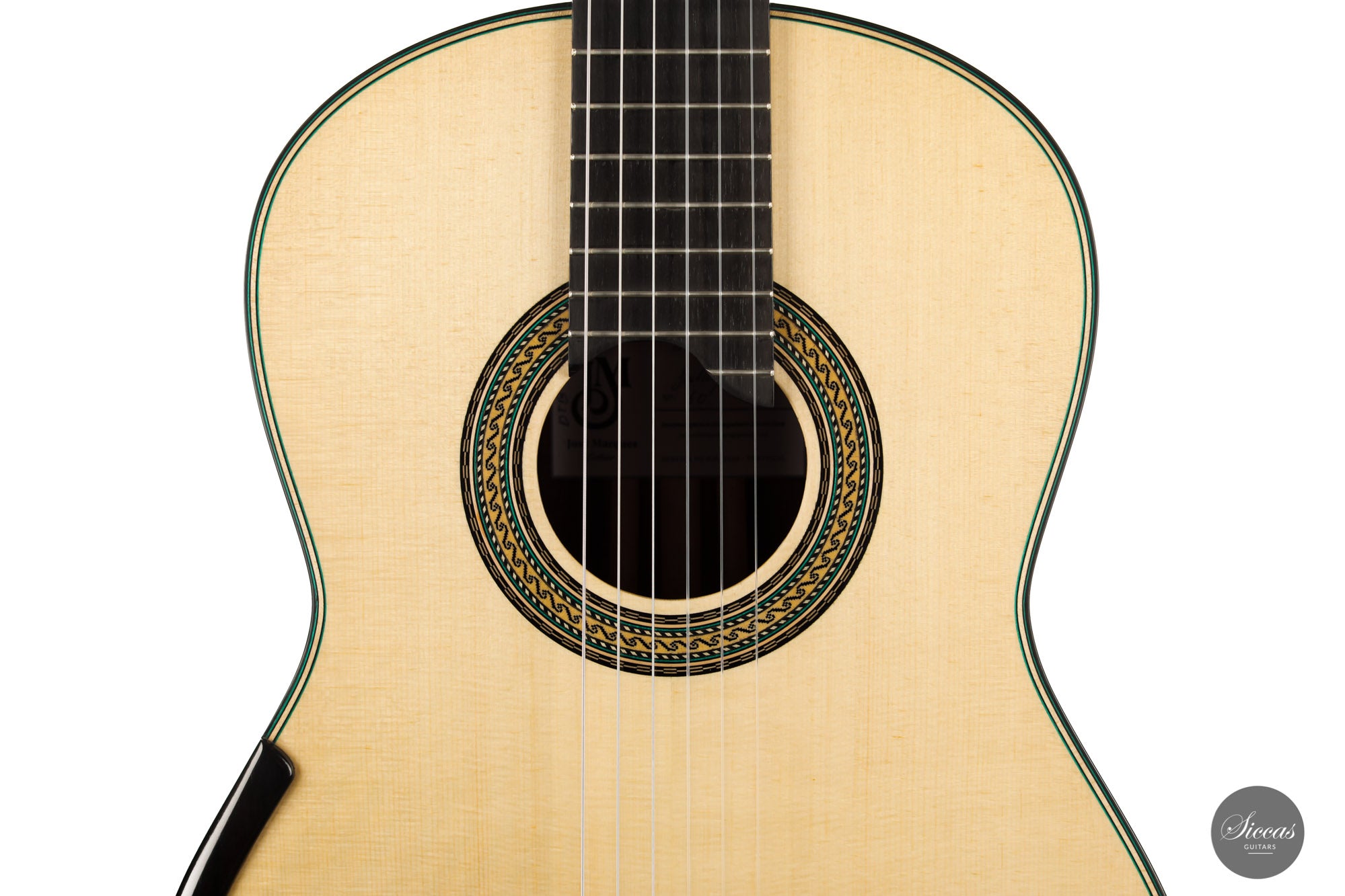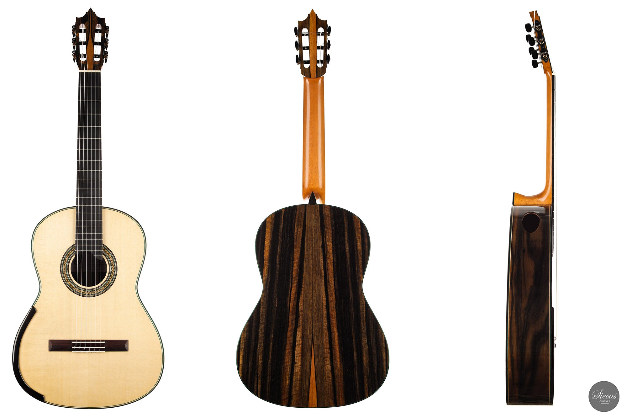 This concert guitar with its modern construction has a very interesting concept: a double top made entirely of wood, consisting of spruce and balsa, offering power, richness, and responsiveness without the use of composite materials. The ebony back and sides are the perfect resonator for this very light top, projecting the sound efficiently towards the audience. The playability is excellent and the volume of sound is very impressive. This Marques is an excellent concert guitar with double top construction at a very attractive price.