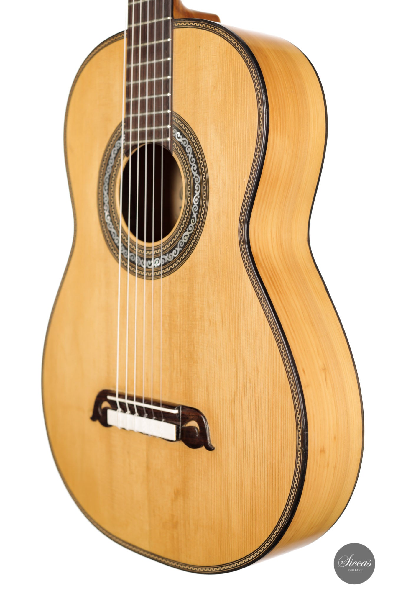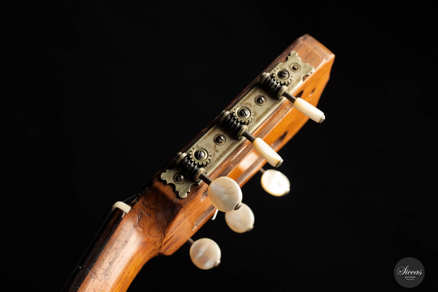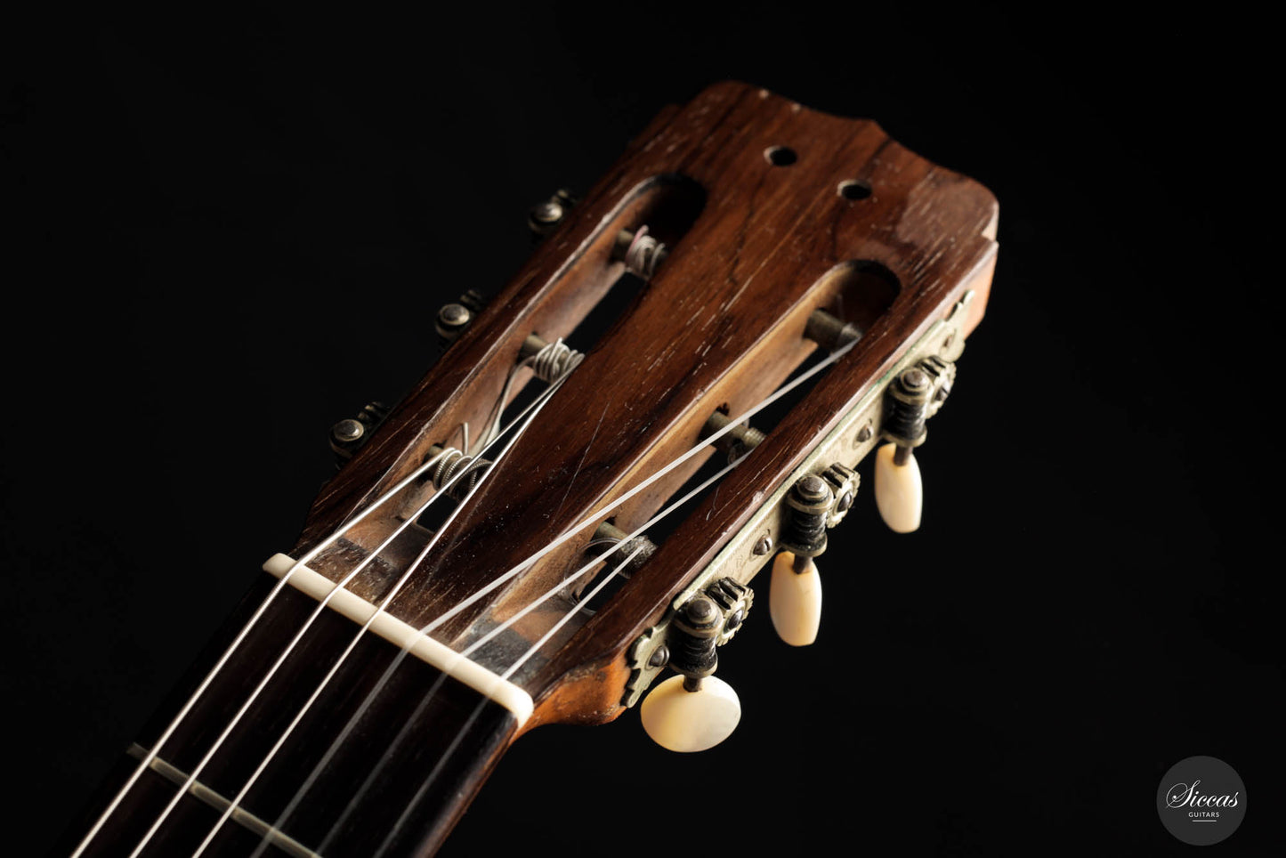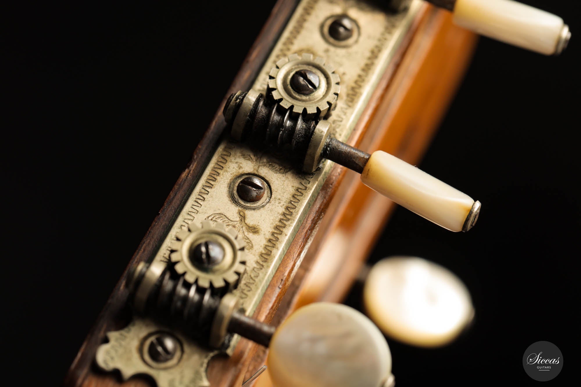 This wonderful 'tablao' guitar was made around 1895. With its rich decoration, wide rosette, elaborate purfling, and particularly carved bridge, it was one of the top models at the time. Its condition is amazing and admirable considering its age. The top has only one repaired crack running along the middle brace, back and sides are in splendid condition, and there is one repair to the back of the head. The varnish was probably refreshed or redone, all French polished with shellac in the traditional way. The beautiful tuning machines still work perfectly and have lovely mother of pearl buttons.