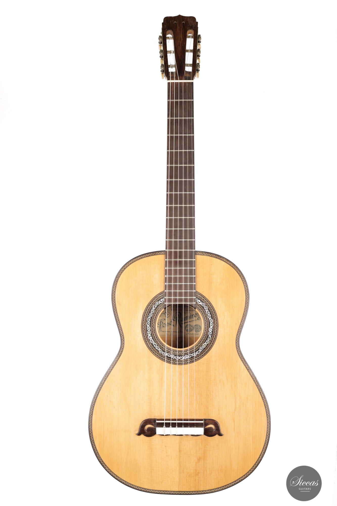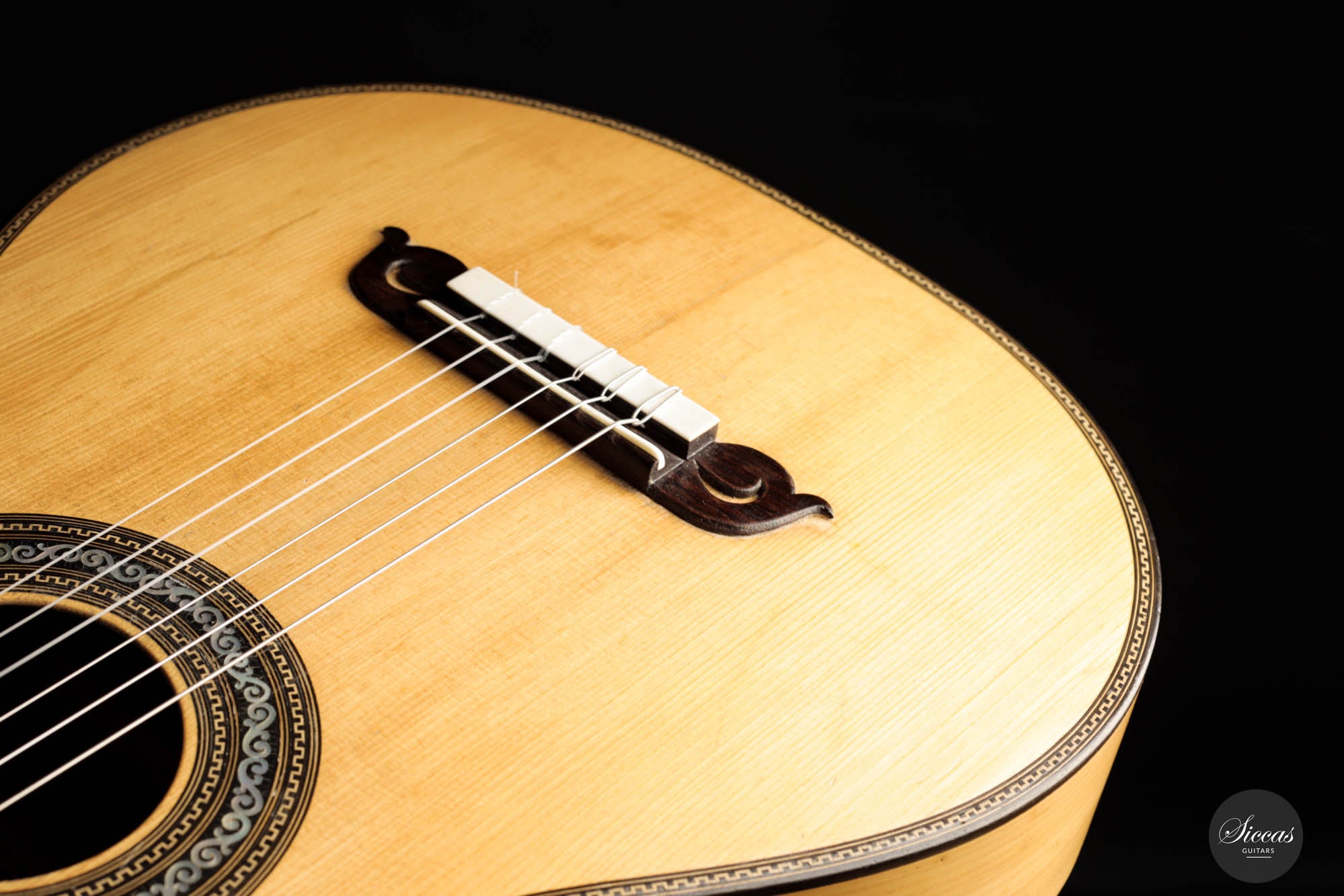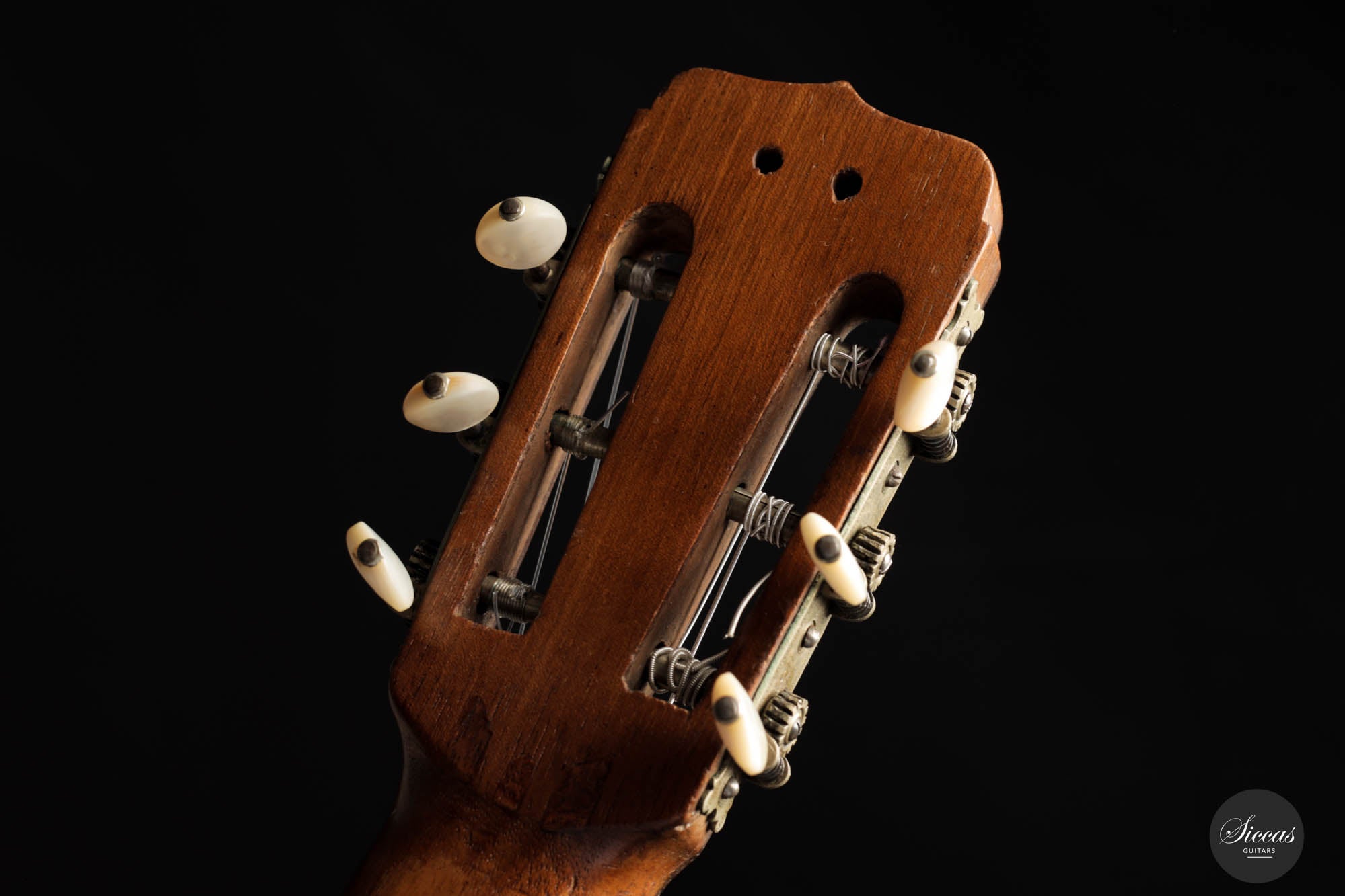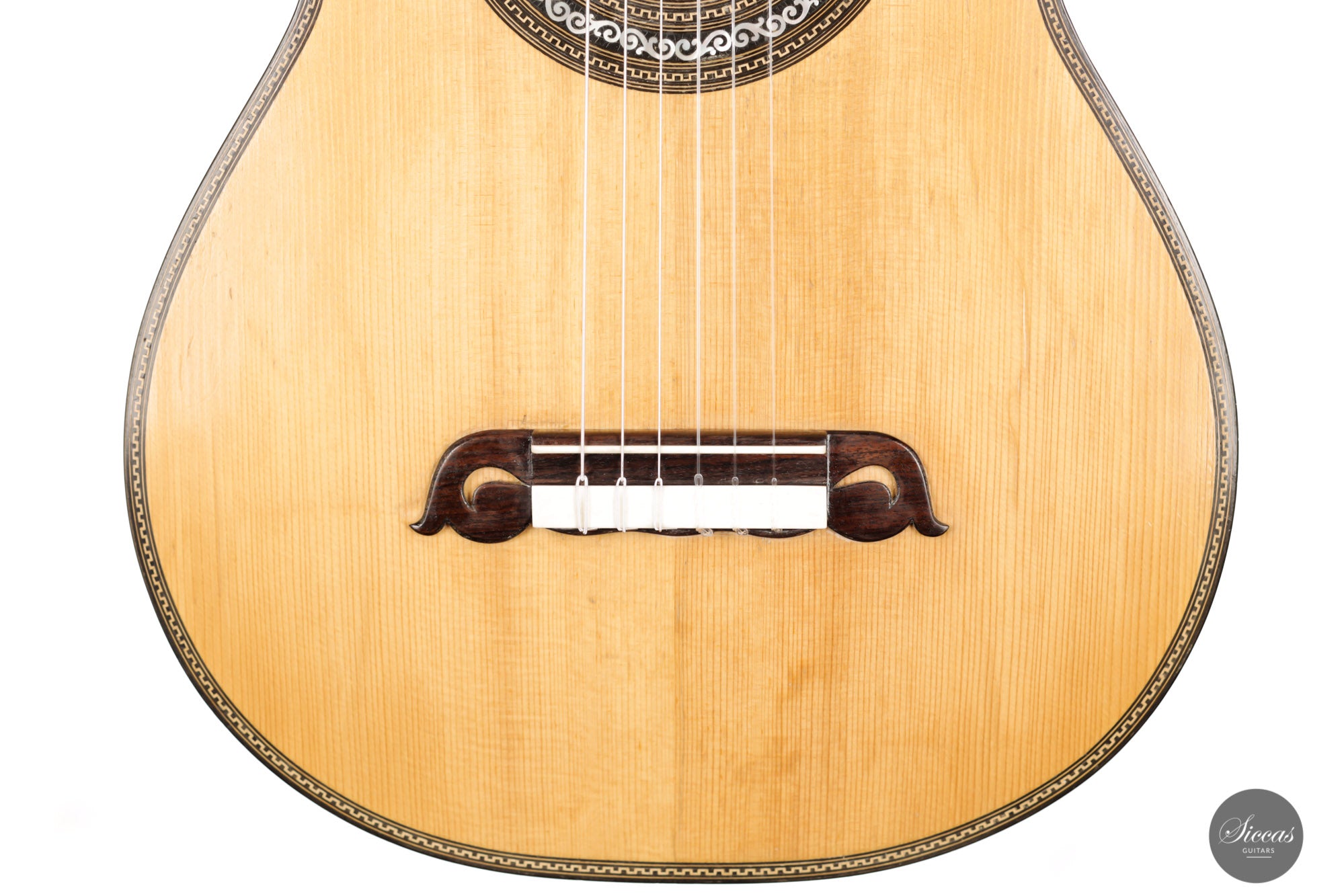 This wonderful 'tablao' guitar was made around 1895. With its rich decoration, wide rosette, elaborate purfling, and particularly carved bridge, it was one of the top models at the time. Its condition is amazing and admirable considering its age. The top has only one repaired crack running along the middle brace, back and sides are in splendid condition, and there is one repair to the back of the head. The varnish was probably refreshed or redone, all French polished with shellac in the traditional way. The beautiful tuning machines still work perfectly and have lovely mother of pearl buttons.