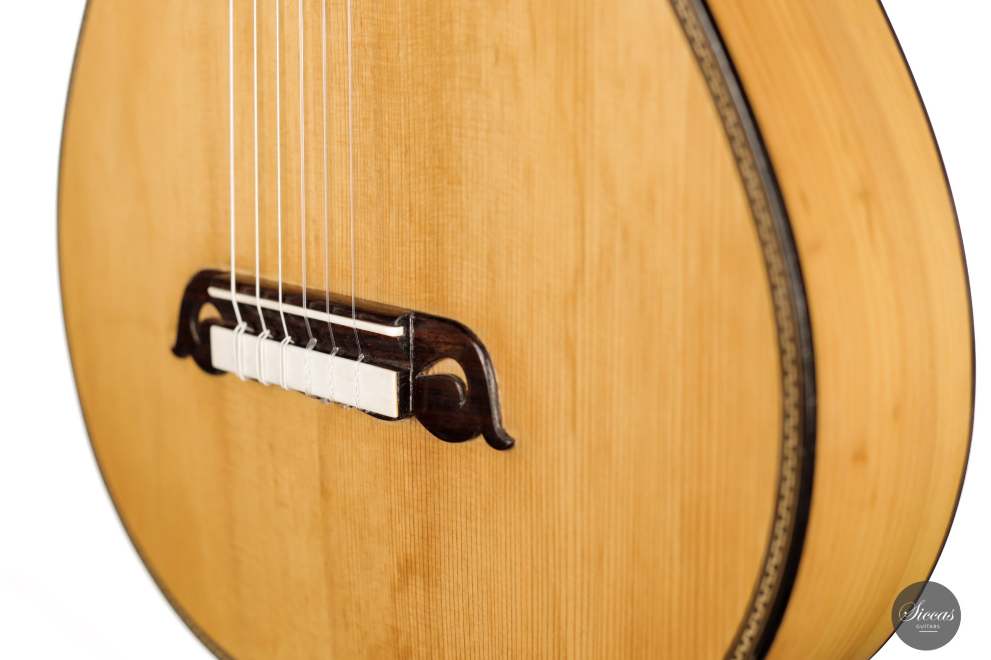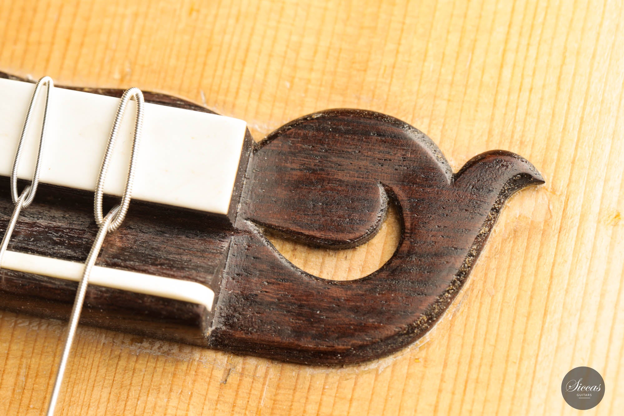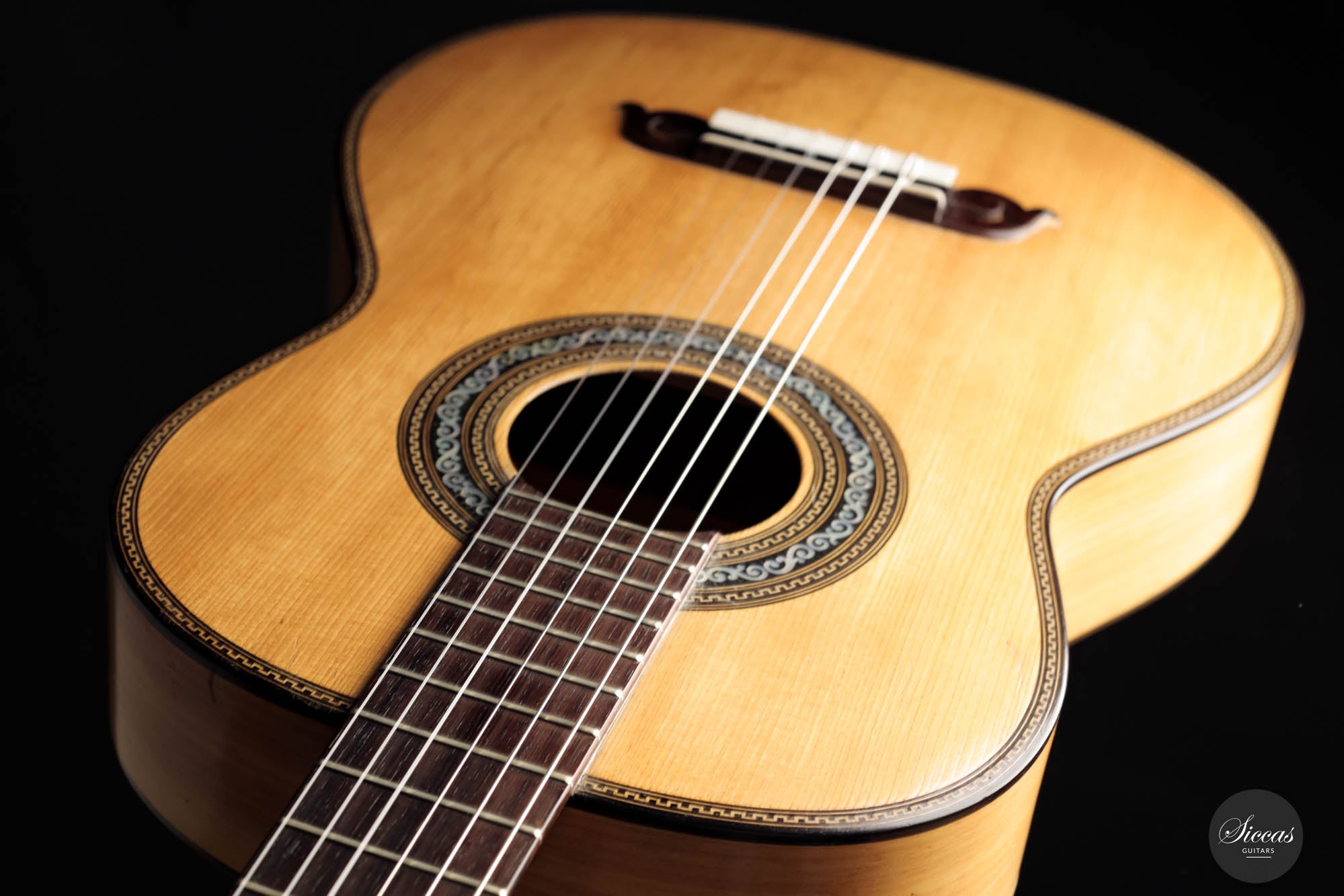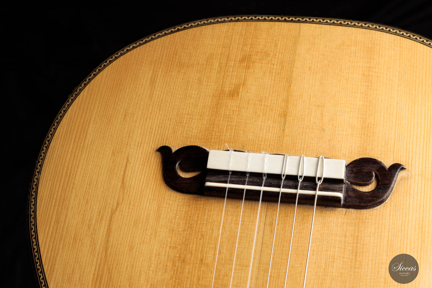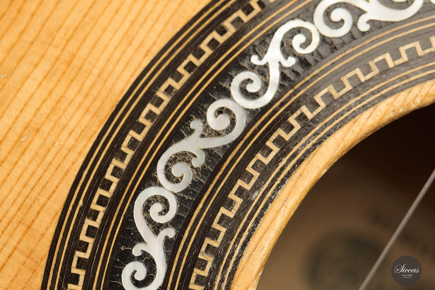 This wonderful 'tablao' guitar was made around 1895. With its rich decoration, wide rosette, elaborate purfling, and particularly carved bridge, it was one of the top models at the time. Its condition is amazing and admirable considering its age. The top has only one repaired crack running along the middle brace, back and sides are in splendid condition, and there is one repair to the back of the head. The varnish was probably refreshed or redone, all French polished with shellac in the traditional way. The beautiful tuning machines still work perfectly and have lovely mother of pearl buttons.
