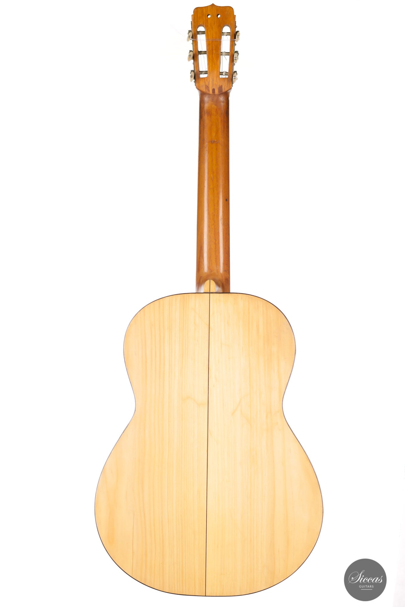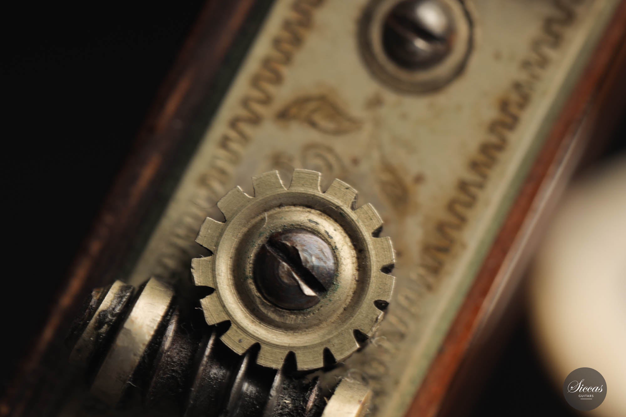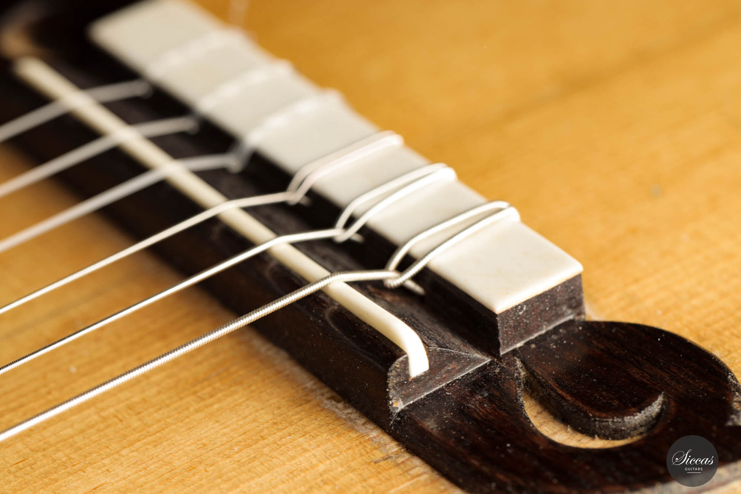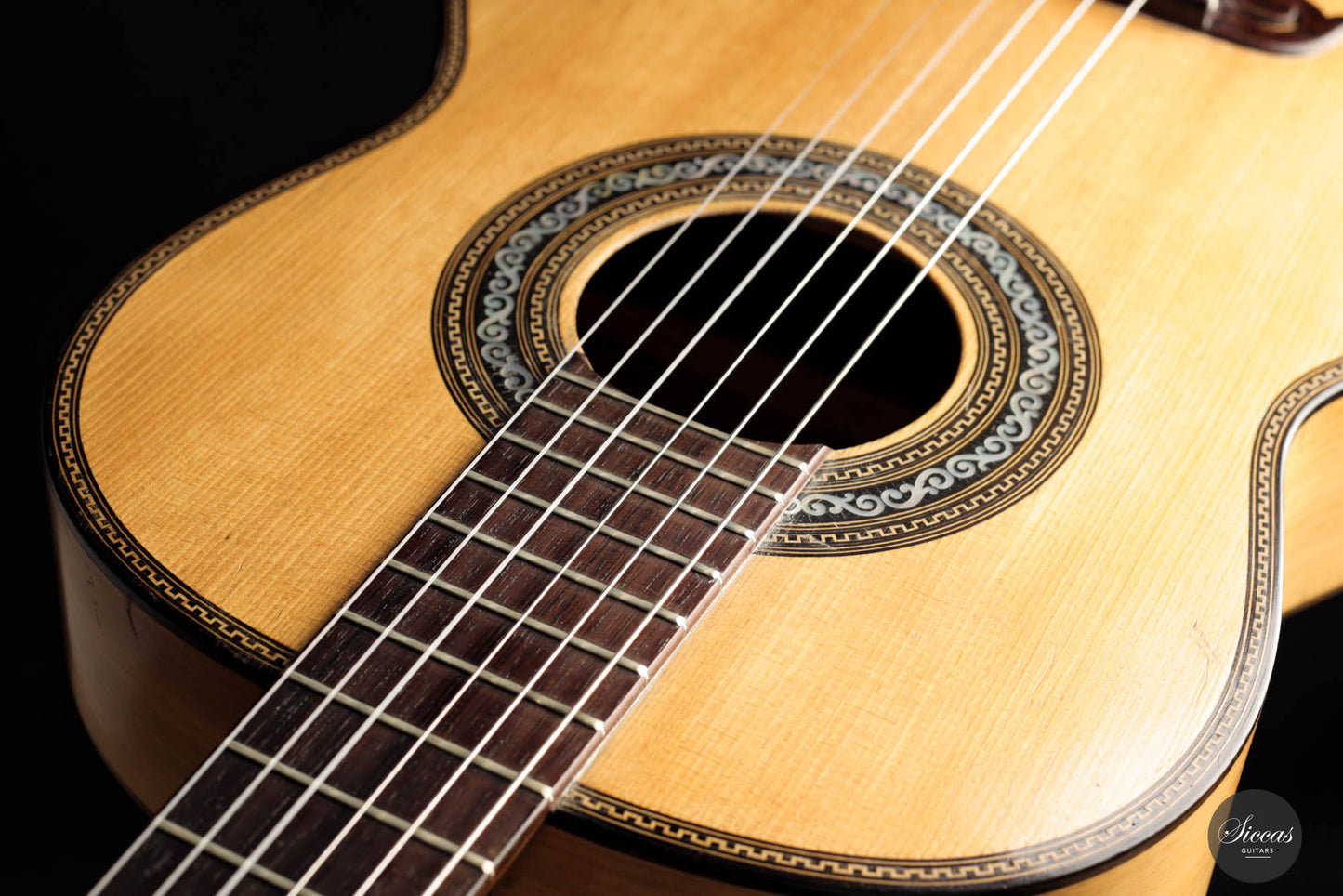 This wonderful 'tablao' guitar was made around 1895. With its rich decoration, wide rosette, elaborate purfling, and particularly carved bridge, it was one of the top models at the time. Its condition is amazing and admirable considering its age. The top has only one repaired crack running along the middle brace, back and sides are in splendid condition, and there is one repair to the back of the head. The varnish was probably refreshed or redone, all French polished with shellac in the traditional way. The beautiful tuning machines still work perfectly and have lovely mother of pearl buttons.