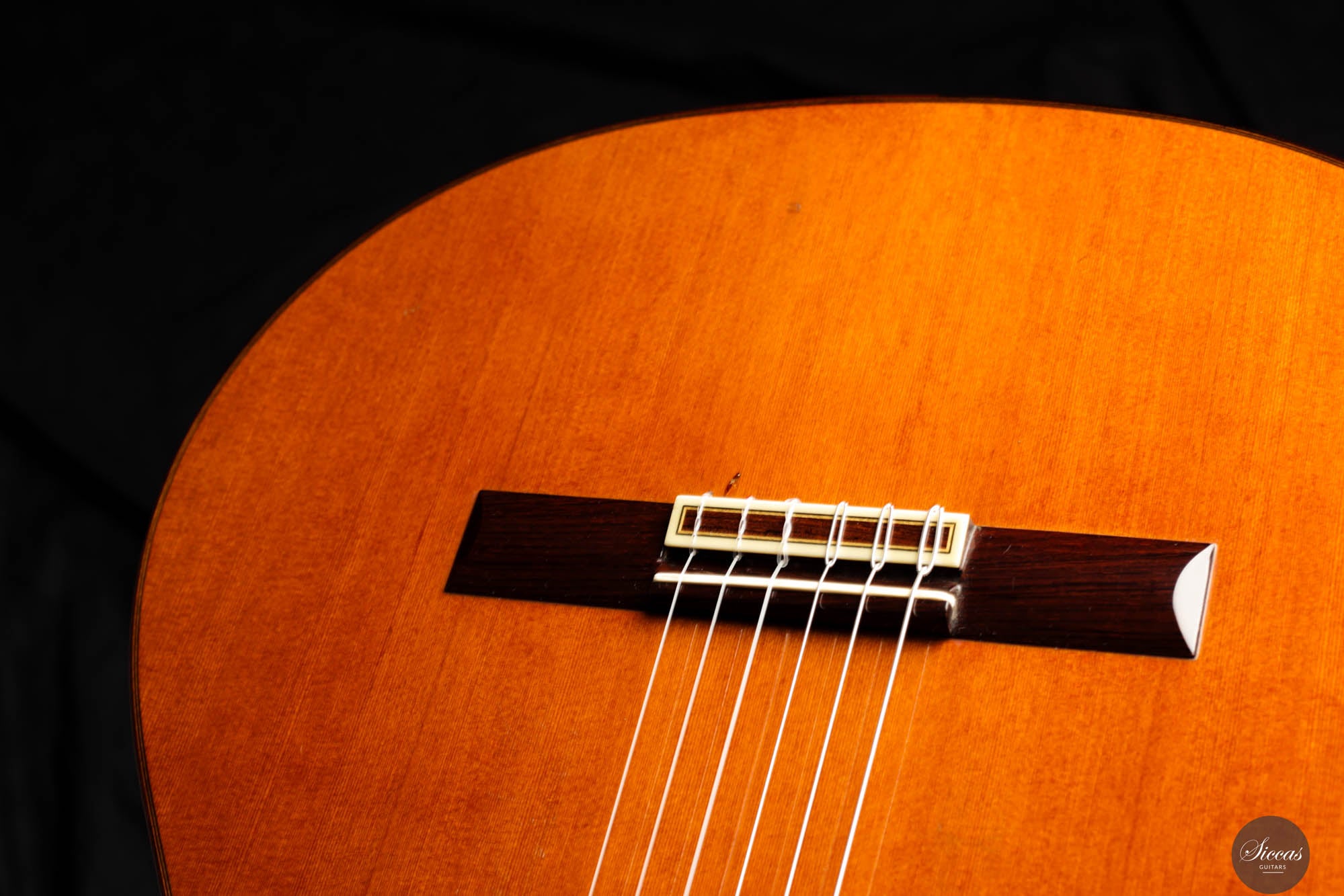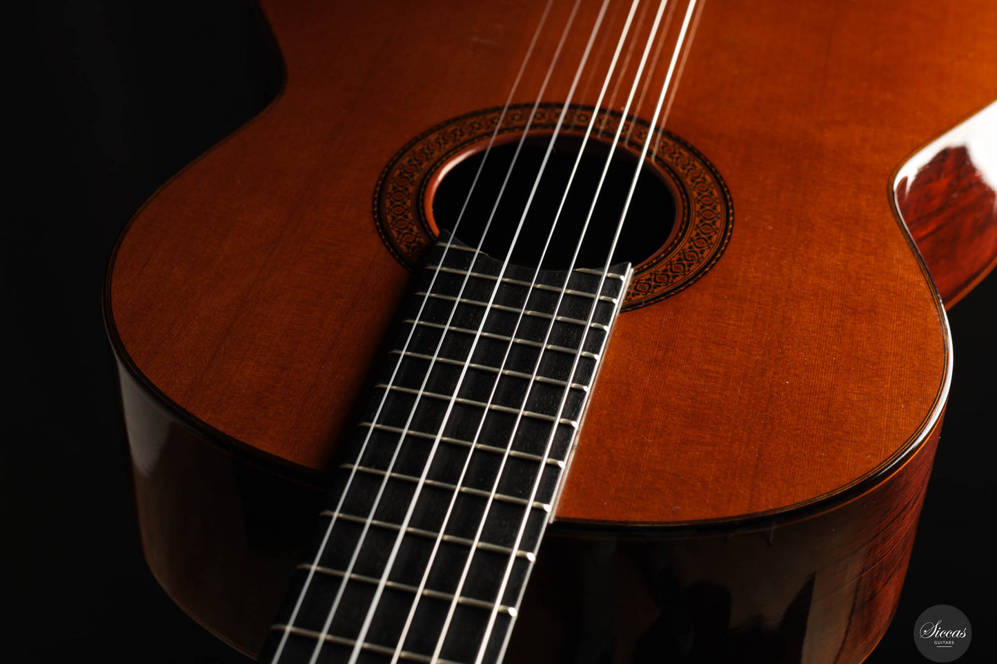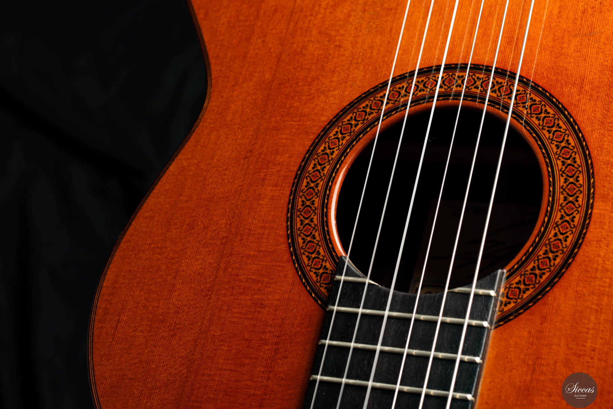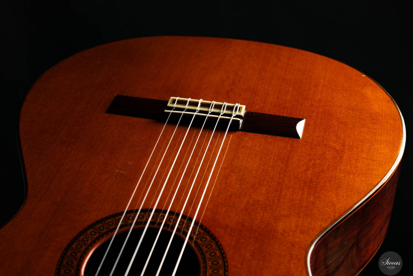 José Ramirez III (1922-1995) pioneered cedar tops for guitars. His instruments gained international fame in the 1960s through Andrés Segovia and his many students. In 1965, José Ramirez III began developing a new instrument built with a top made of Western Red Cedar (Thuja plicata) and double sides (rosewood and cypress). This revolutionary new way of building guitars and using this innovative type of wood spread very quickly in the guitar world. In addition, Andrés Segovia played several J. Ramirez III was his main concert instrument. He played four instruments over an extended period [1962 (but dated 1963), Spruce, 1965, 1967, 1969 (all three cedar).