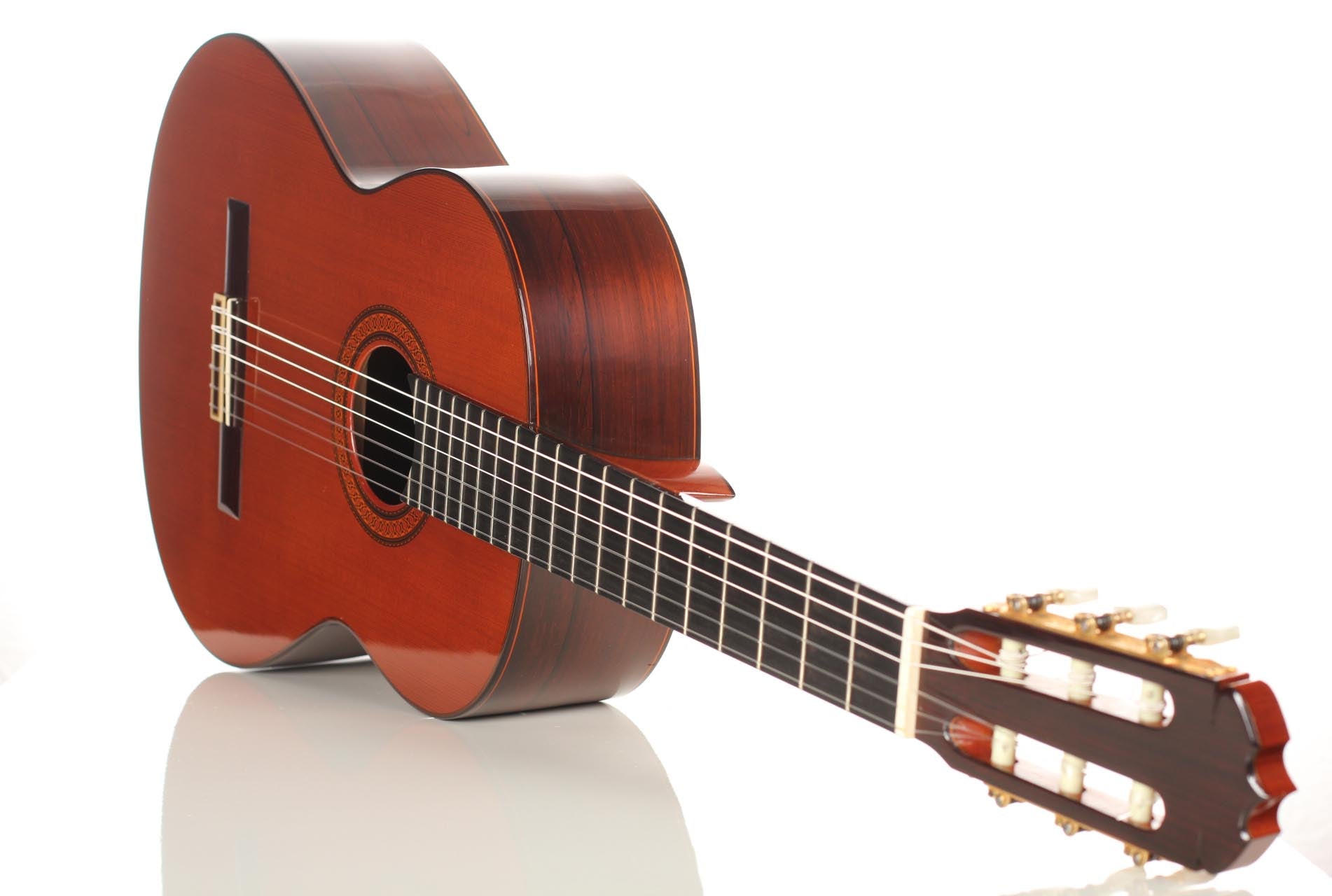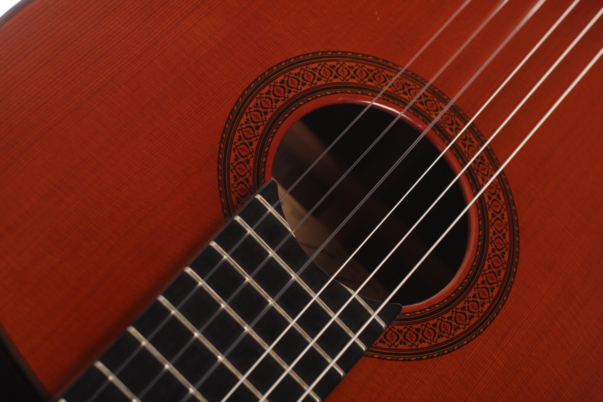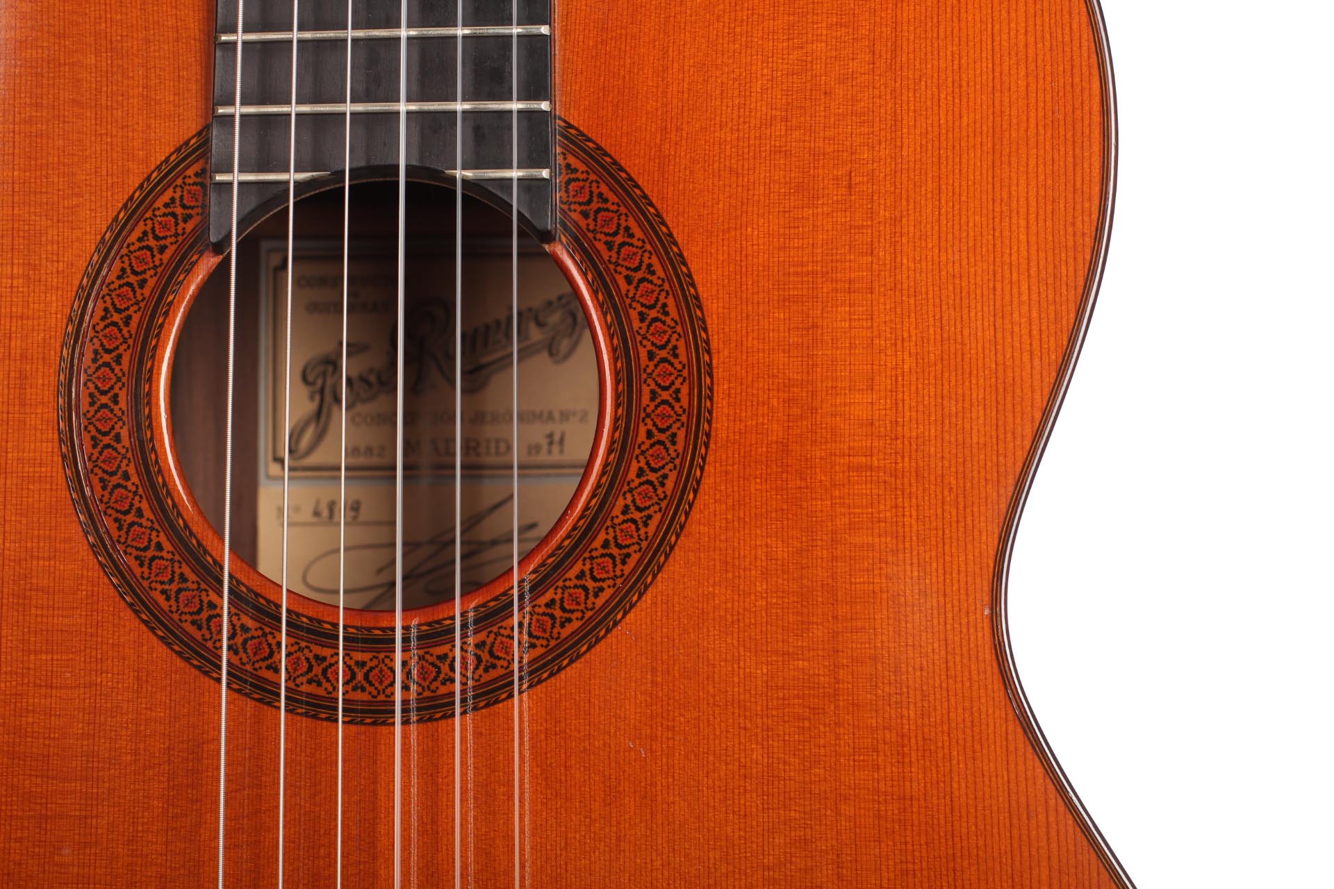 José Ramirez III’s guitars gained an international reputation during the 1960s through Andrés Segovia and his many students. Starting from 1965, J. Ramirez started to develop a new instrument built with a “Western Red Cedar” top and featuring doubled sides (rosewood and cypress). This revolutionary new way to build guitars and the use of this new material spread in the guitar world very quickly, as Andrés Segovia played several J. Ramirez III as his main concert instruments. Segovia played four instruments for a lengthy period of time [1962 (but dated 1963), spruce, 1965, 1967, 1969 (all three cedar)], and Christopher Parkening, his American student, is still enthusiastically speaking about the 1967 “Bach guitar” built by M. Tezanos. The generally used scale length of the Ramirez guitars of this time was 66,5 cm and the fretboard was slightly arched.