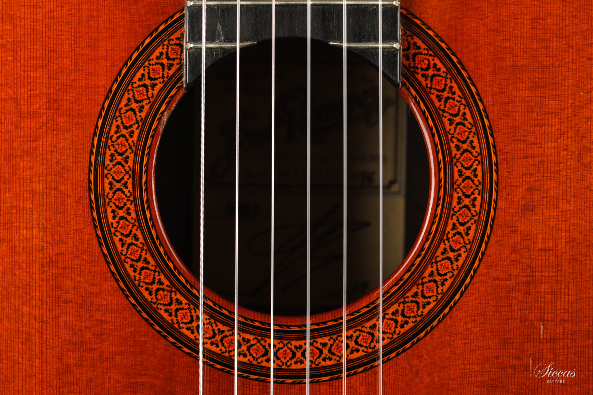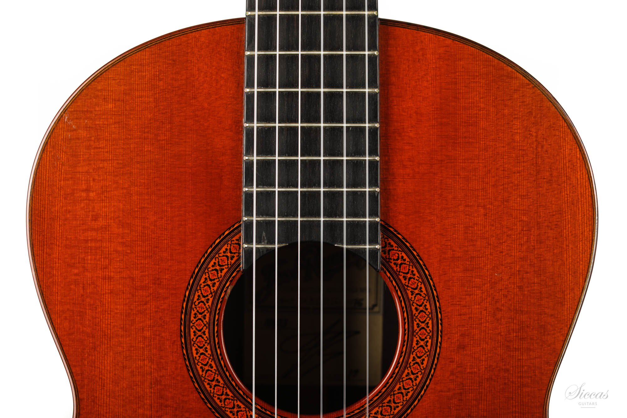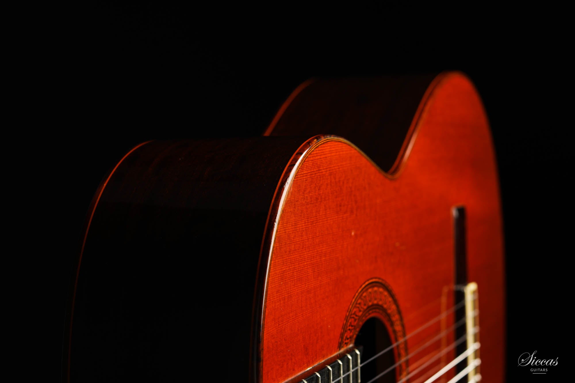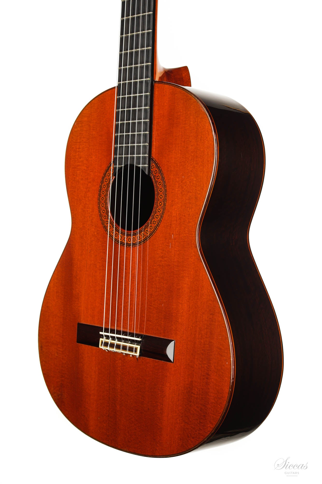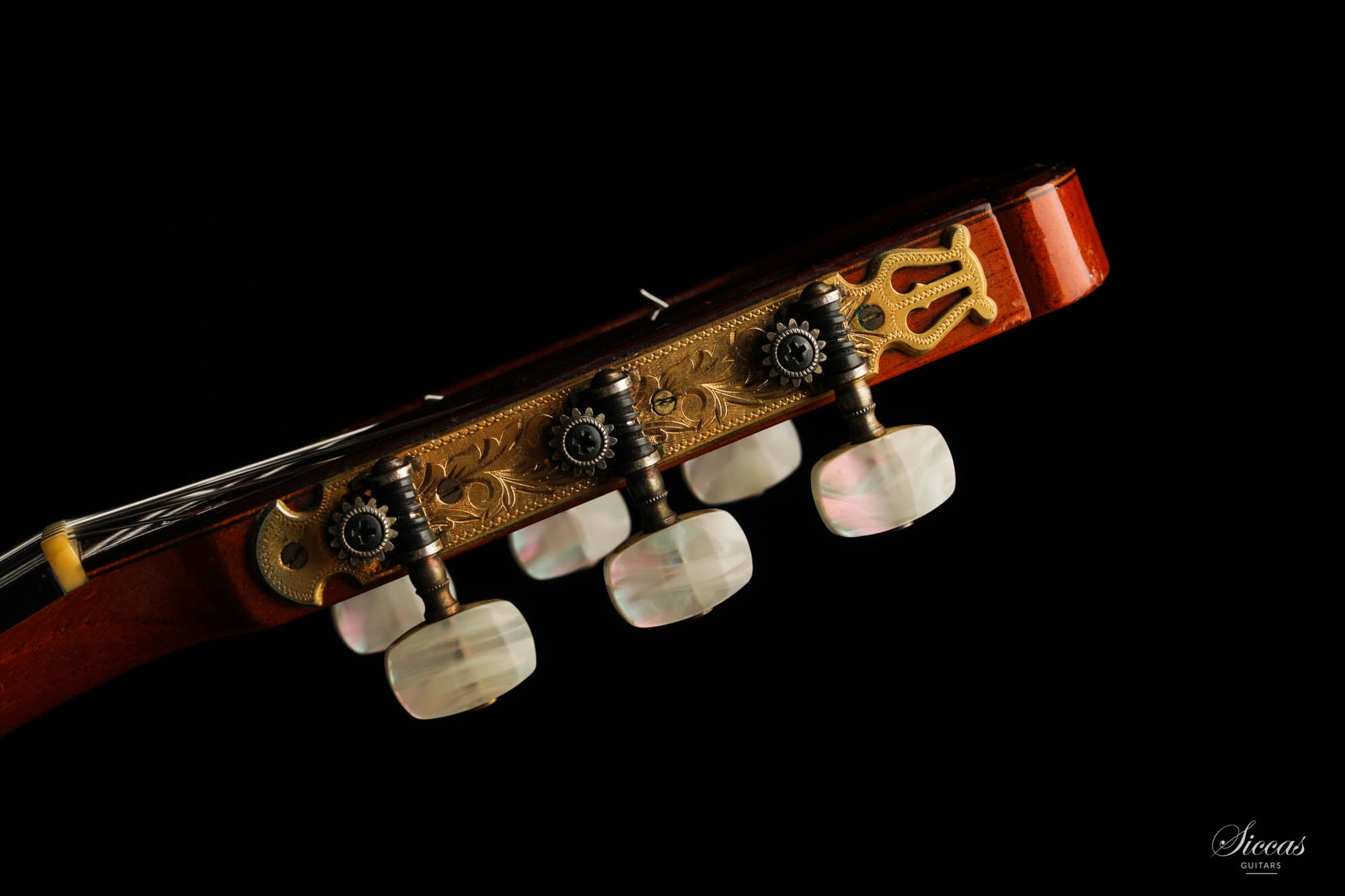 An extraordinary feature of this special 1A model is the usage of mahogany for back and sides. This transforms the Ramirez typical tone into a softer and earthier timbre. The tonal basis of this instrument is created by broad, powerful, solid basses. Paired with singing, lyrical Spanish trebles it becomes a sovereign concert guitar with the traditional sound of Madrid.