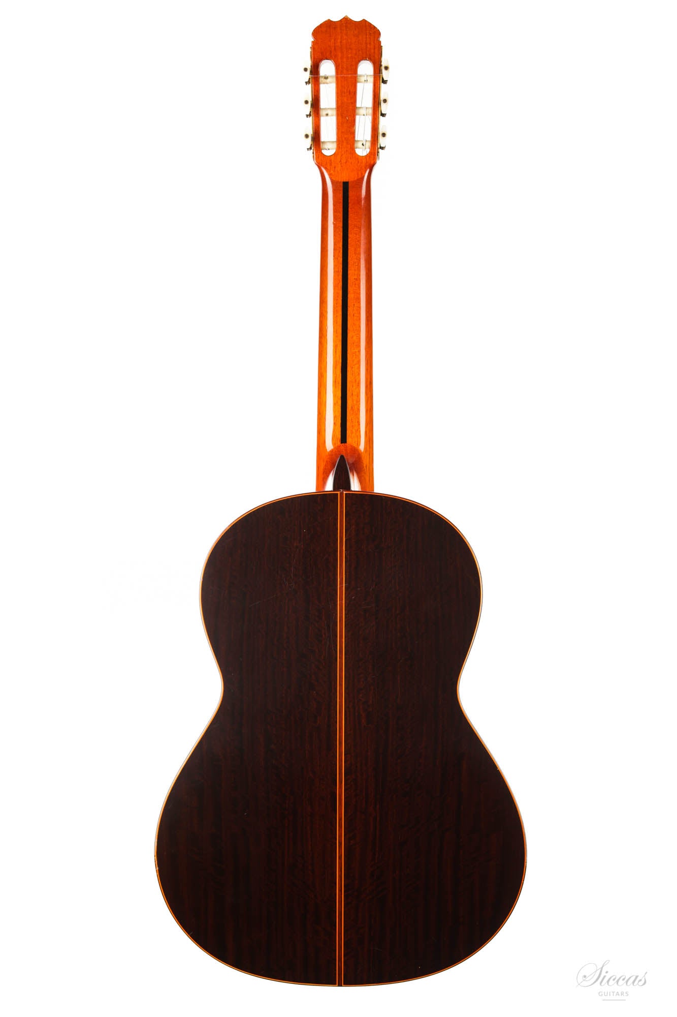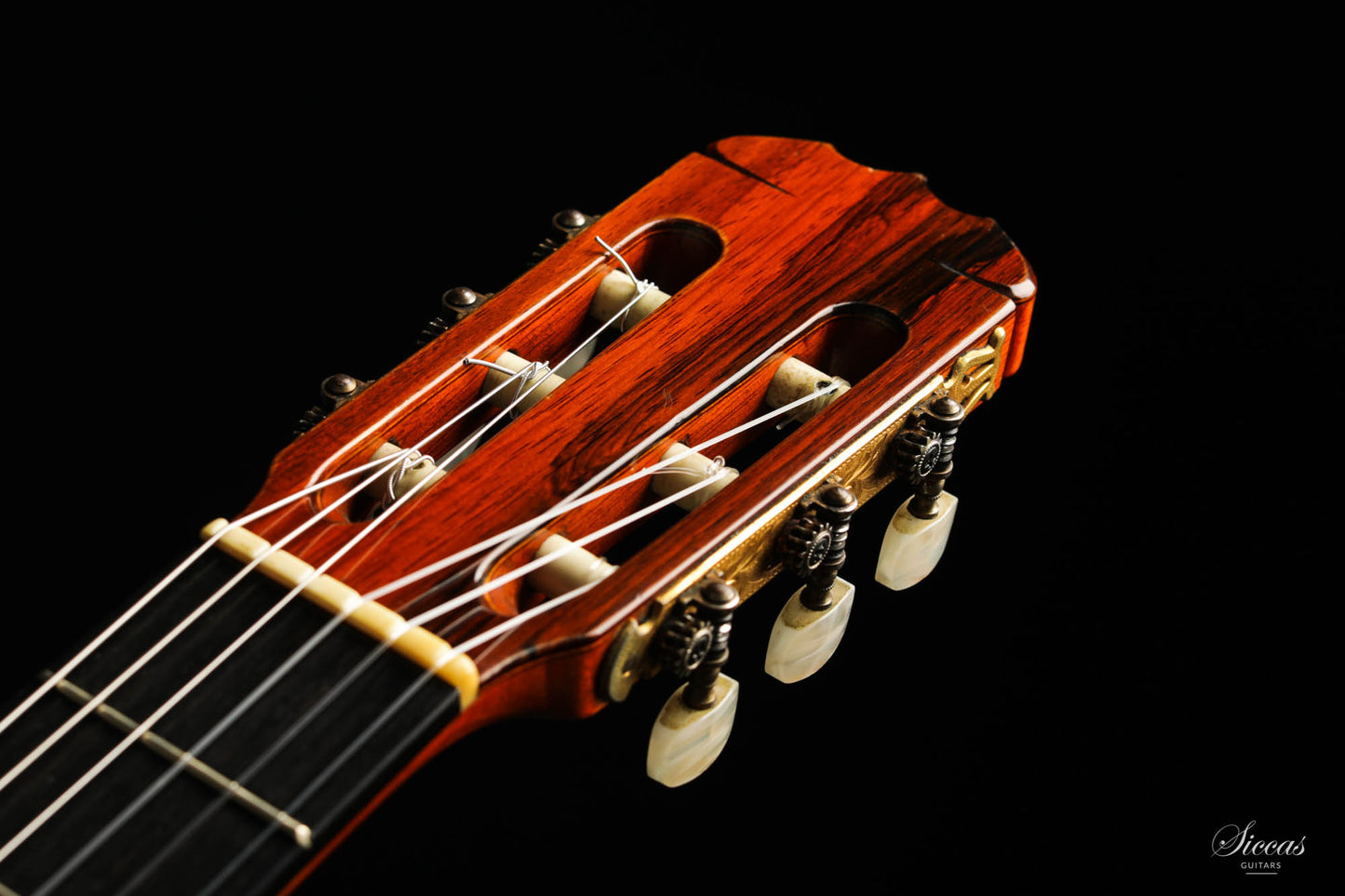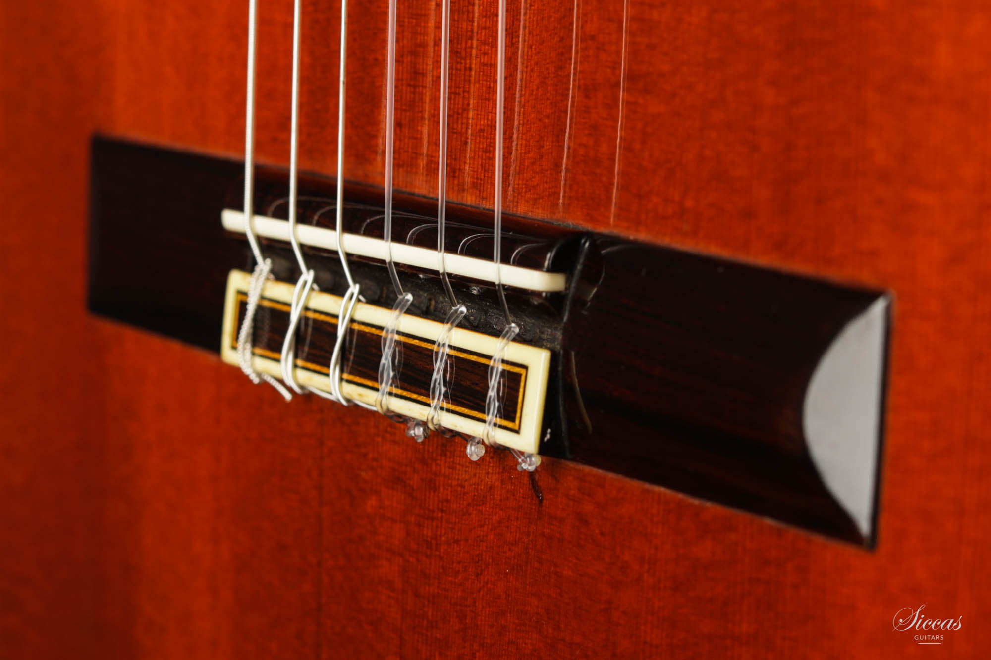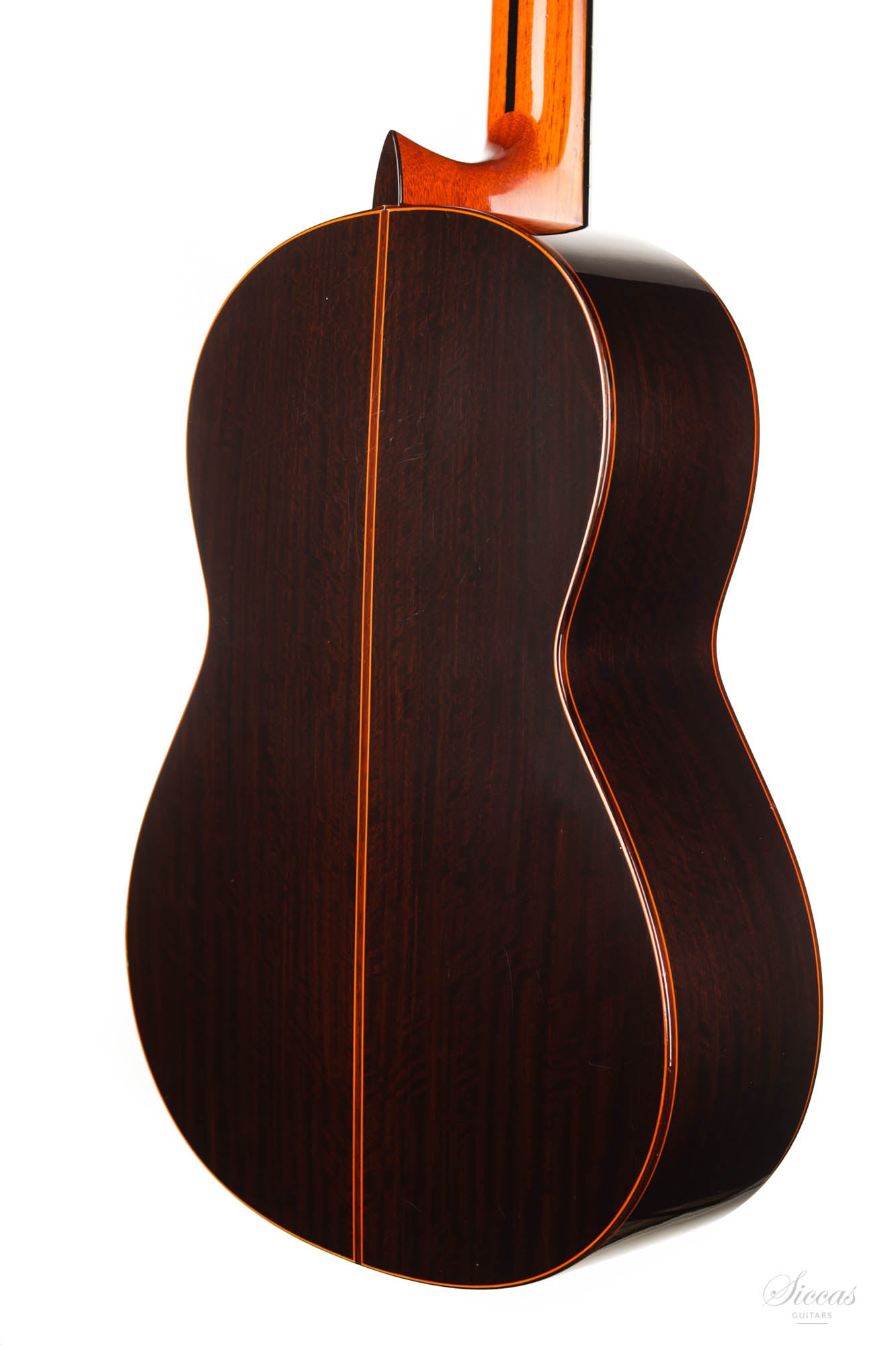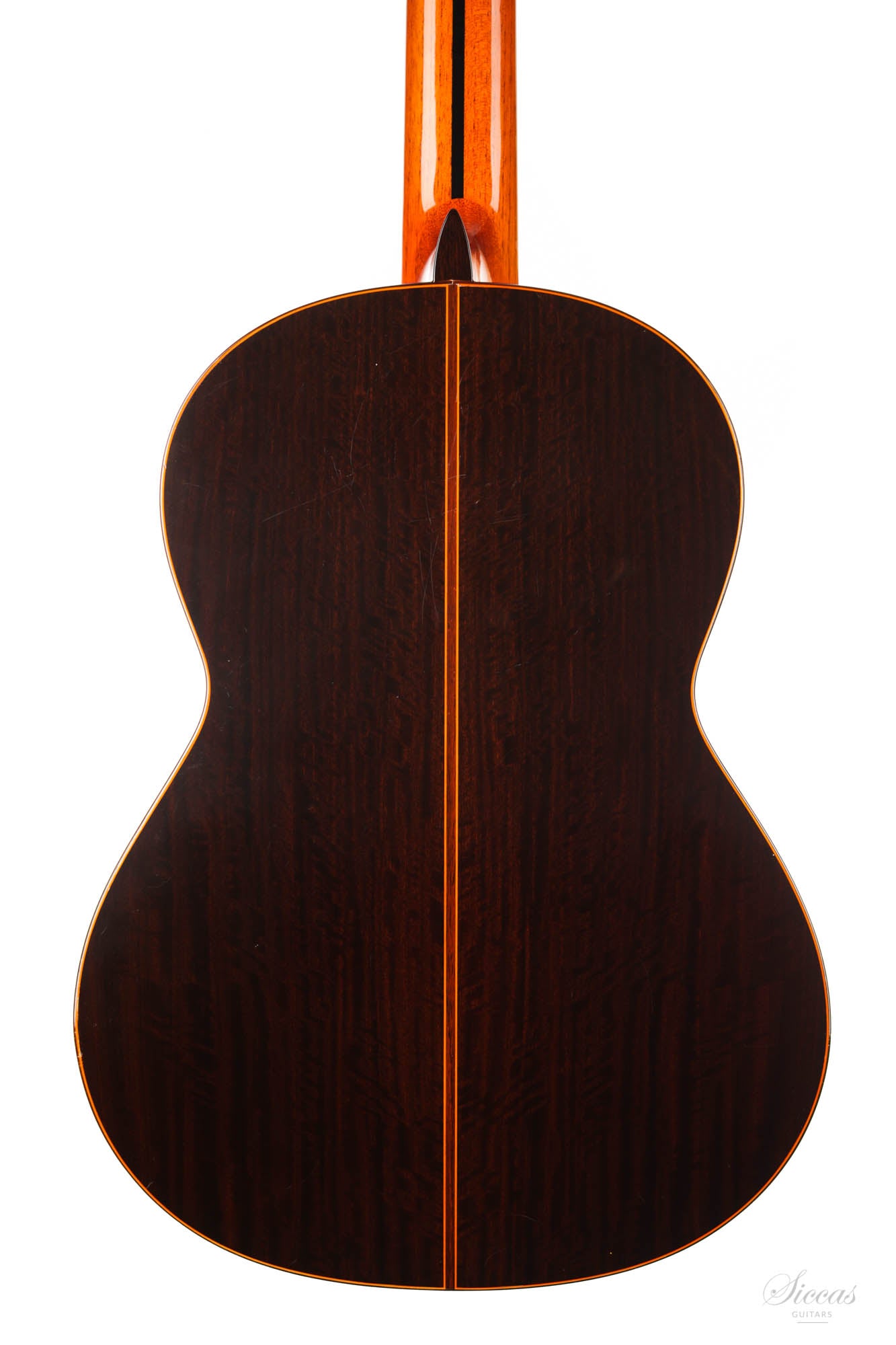 An extraordinary feature of this special 1A model is the usage of mahogany for back and sides. This transforms the Ramirez typical tone into a softer and earthier timbre. The tonal basis of this instrument is created by broad, powerful, solid basses. Paired with singing, lyrical Spanish trebles it becomes a sovereign concert guitar with the traditional sound of Madrid.