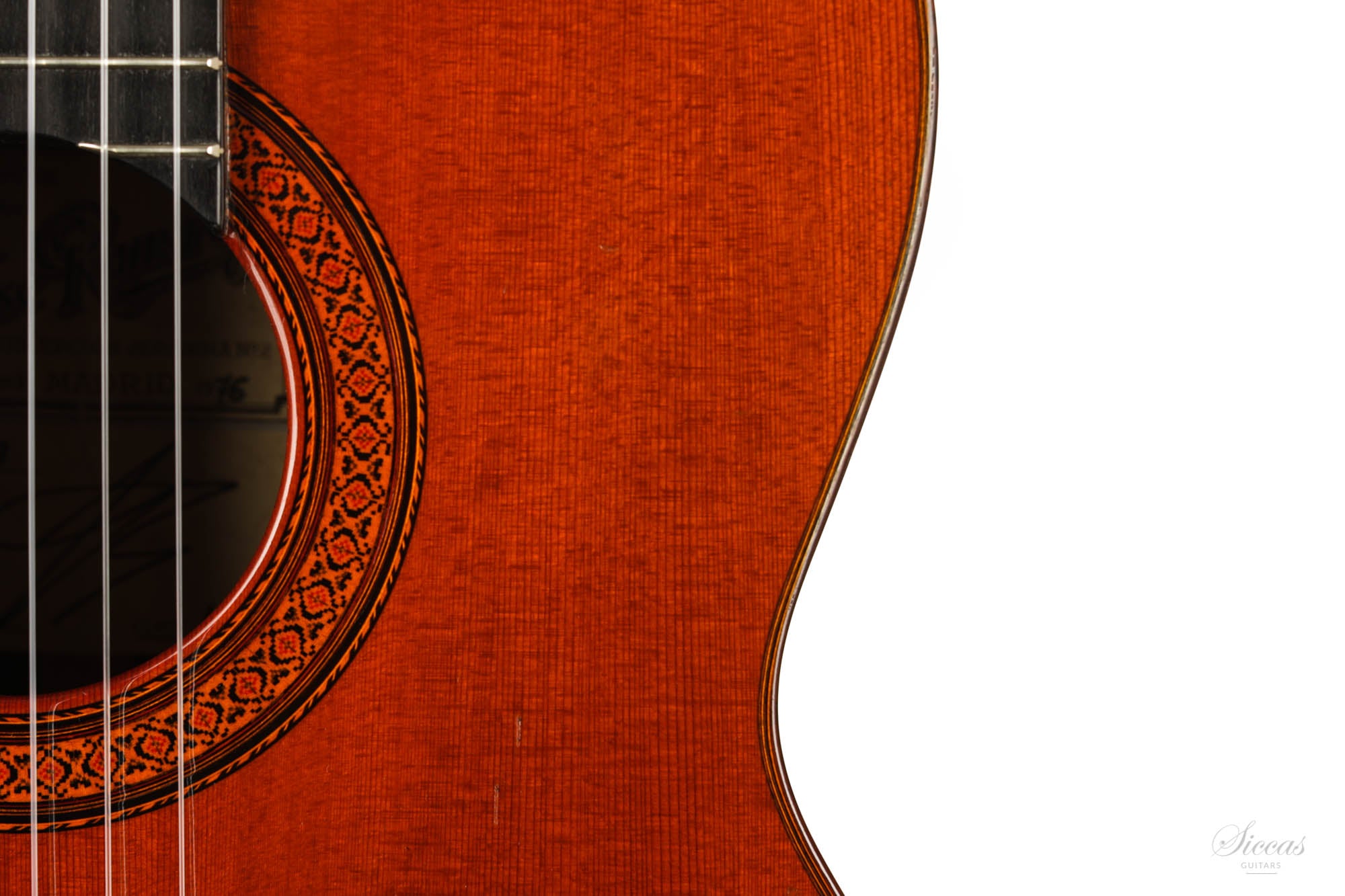 Julian Moraga Rodriguez built this guitar in 1976 in Ramirez's workshop. The guitar does have some playing wear on the top, but not exceptionally much, considering that this beautiful guitar has been played for over 40 years. There are 4 cracks on the top, which have been professionally repaired with cleats inside and are now perfectly stable.