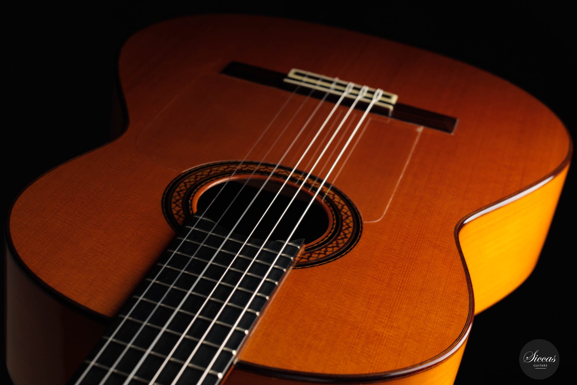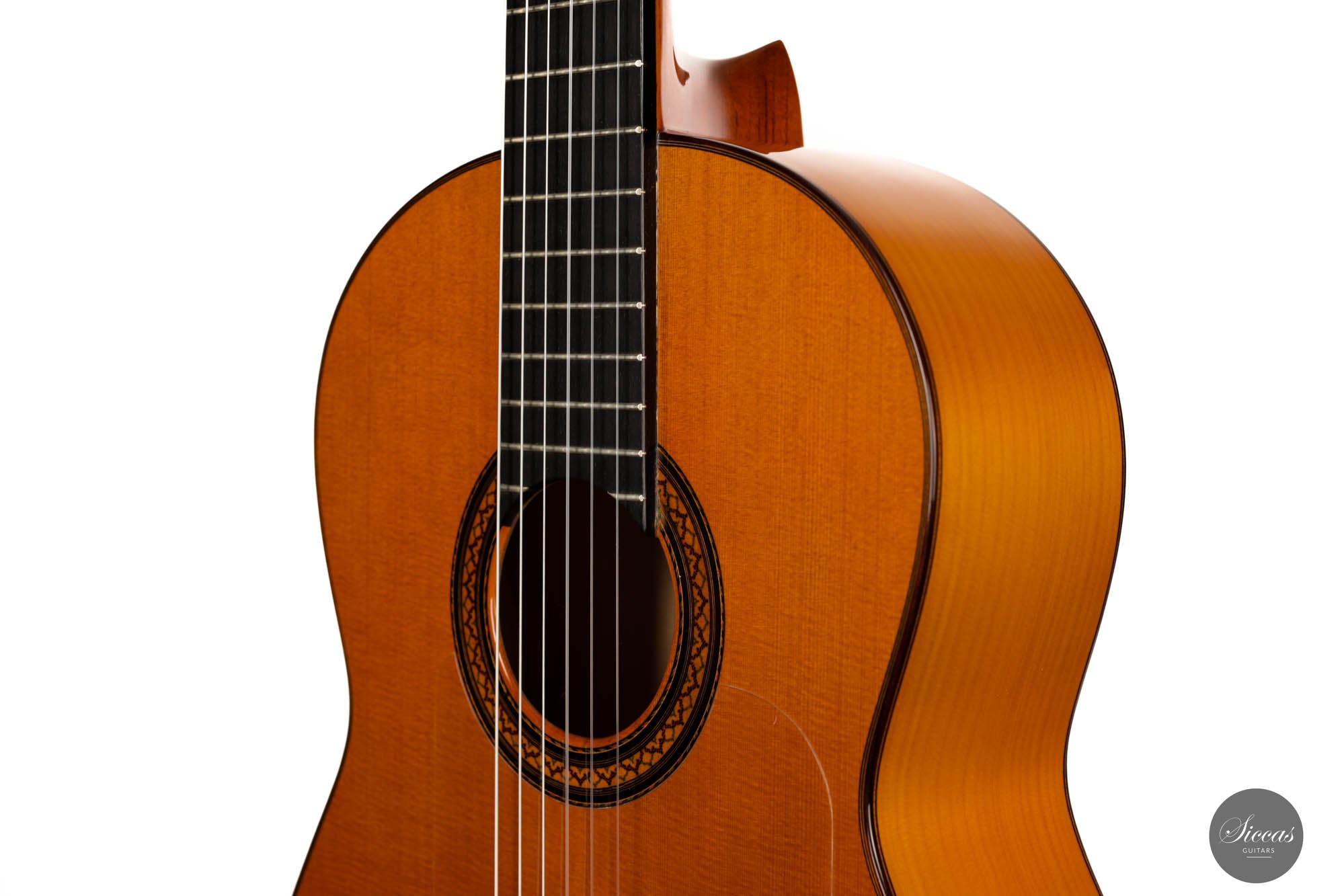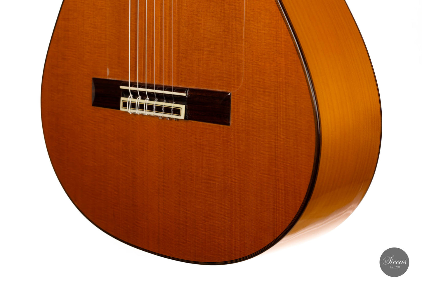 José Ramirez III (1922-1995) was a pioneer of cedar tops for guitars. His instruments gained international fame in the 1960s through Andrés Segovia and his many students. Starting in 1965, José Ramirez III began developing a new instrument built with a top made of Western Red Cedar (Thuja plicata) and featuring double sides (rosewood and cypress). This revolutionary new way of building guitars and the use of this innovative type of wood spread very quickly in the guitar world. In addition, Andrés Segovia played several J. Ramirez III as his main concert instrument. He played four instruments over an extended period of time [1962 (but dated 1963), Spruce, 1965, 1967, 1969 (all three cedar)].