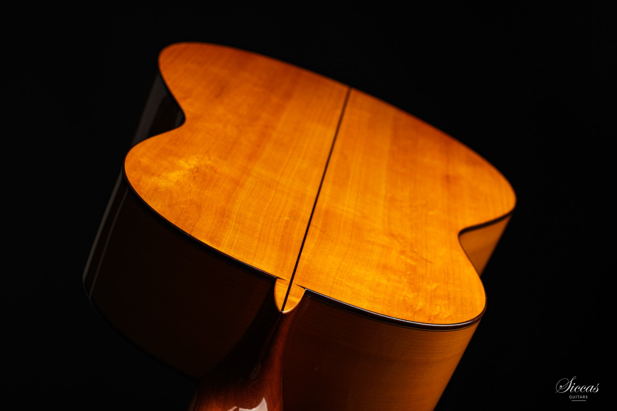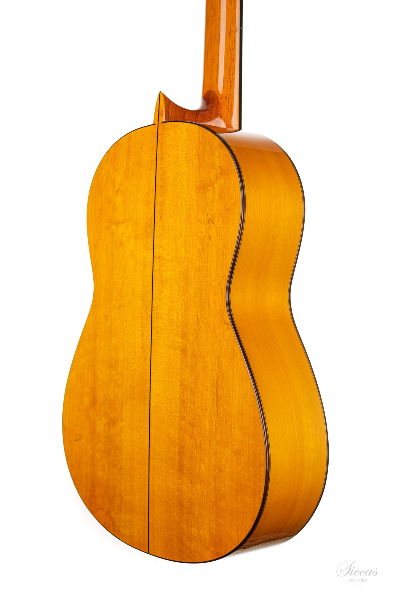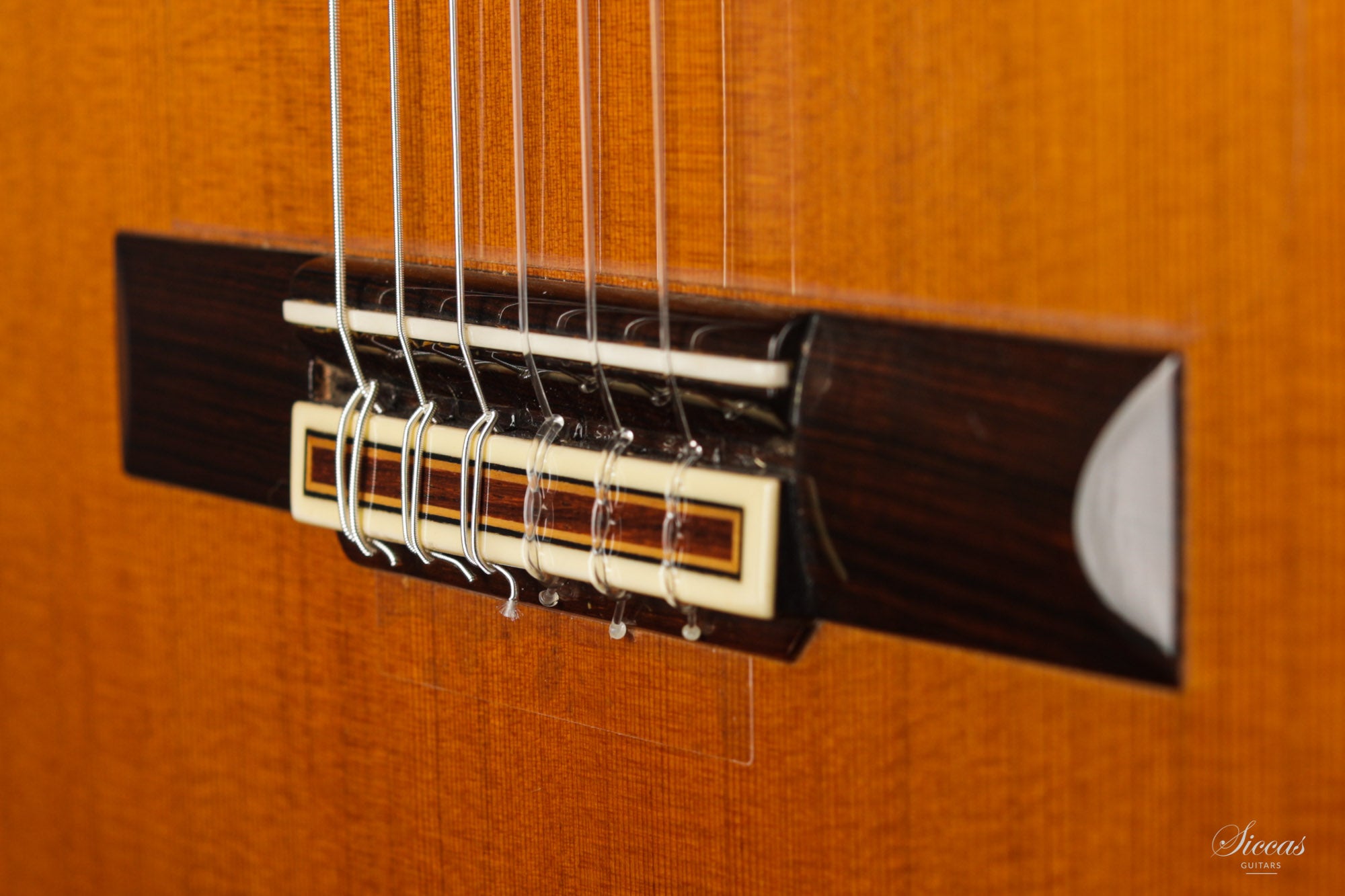 This guitar has a fantastic “Spanish” sound. It is super-responsive, has a warm and colourful tone, a great balance and a notable volume. The ambivalence between the cedar’s mellowness and the cypress’ spontaneity gives to the guitar an incredible range of colours and exceptional dynamic possibilities. There are very-well repaired cracks on the lower bout of the back and one on the back of the head. This guitar was not only used for flamenco music but also as classical guitar in the past. A hard-shell case is included.
