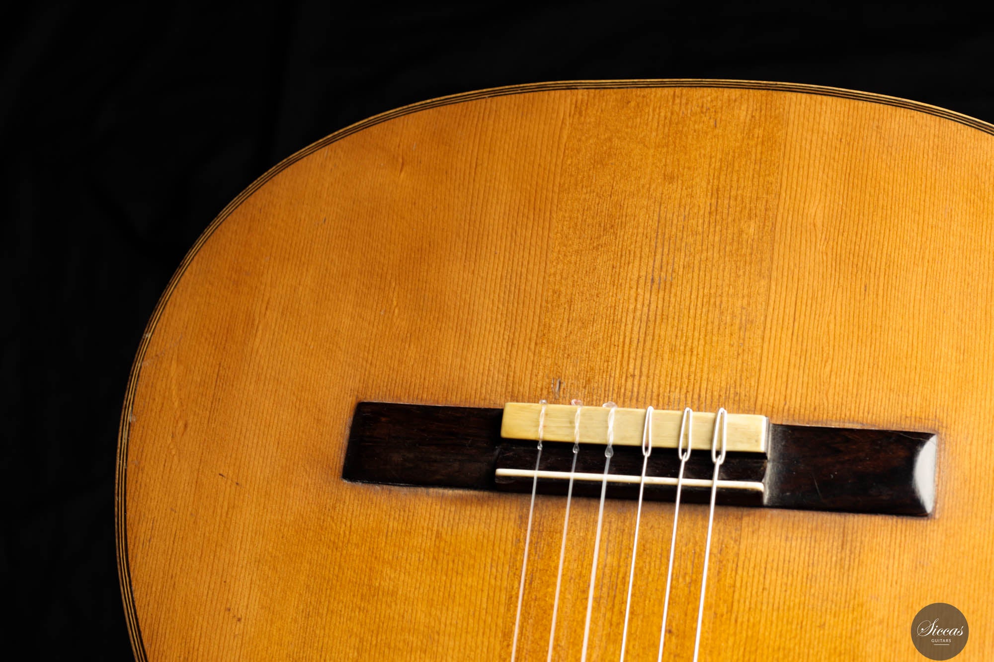 This remarkable 1909 guitar by the legendary Jose Ramirez I is a true masterpiece, showcasing over a century of craftsmanship and musical history. Despite being 115 years old, the guitar remains in outstanding condition, with only minor signs of aging, including a small crack, an opening on the binding due to expanded bracing, and a thin crack on the bridge. Impressively, the soundboard remains crack-free, preserving the integrity of the instrument. This rare and highly collectible piece offers an intimate sound and playing experience, with a smooth tonal palette that transports musicians back in time. The guitar serves as a musical time machine, blending history with a timeless, nostalgic sound.