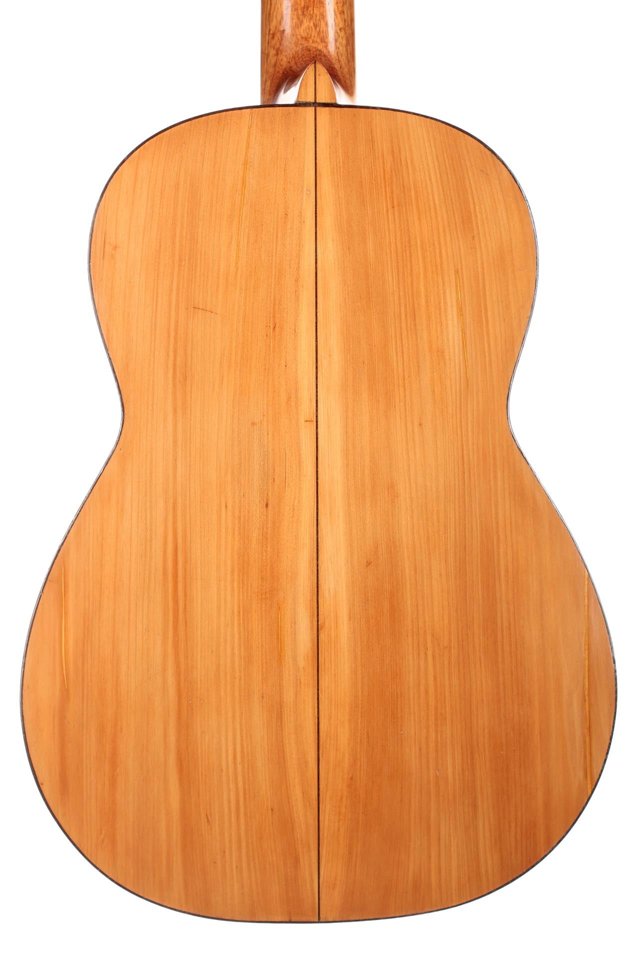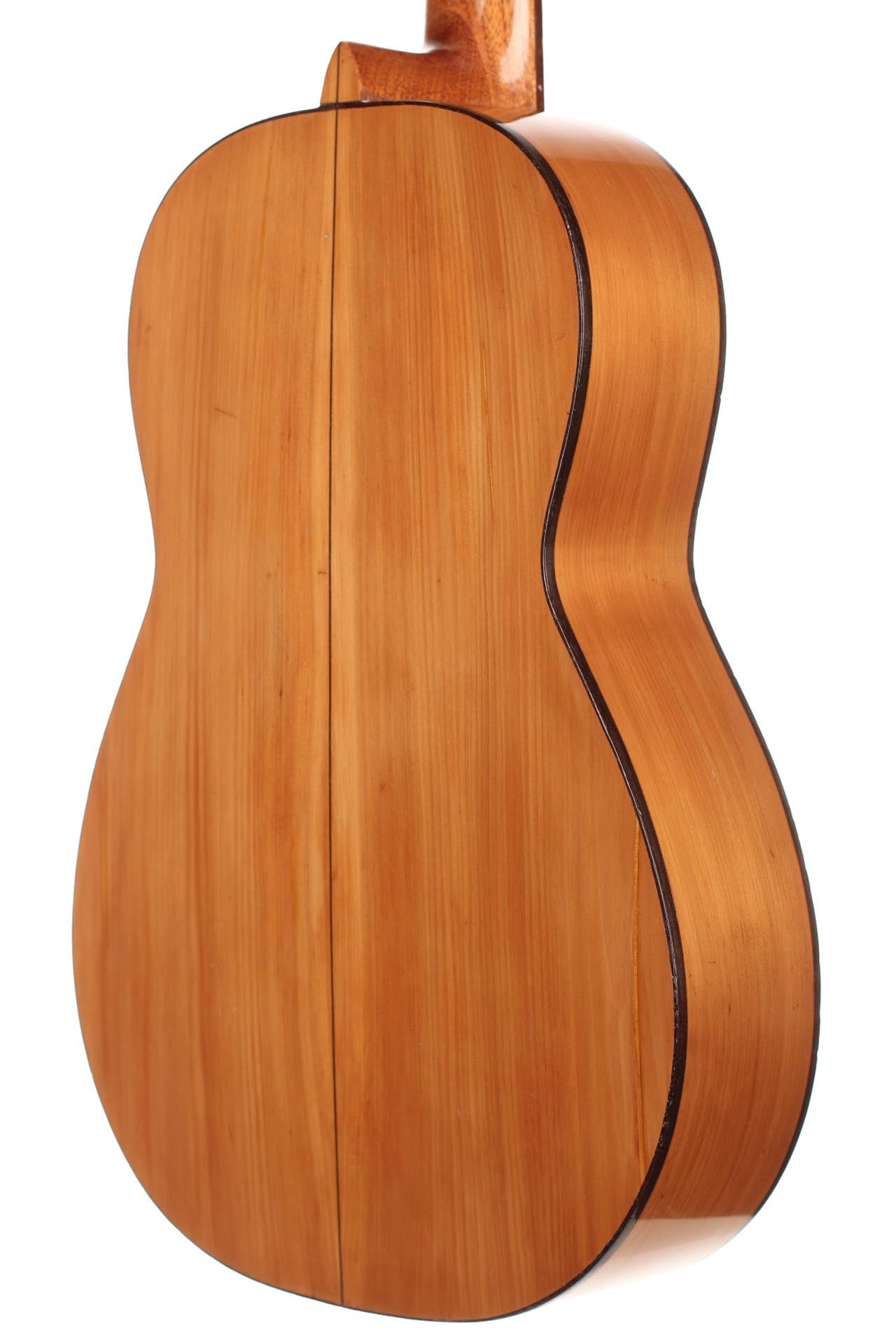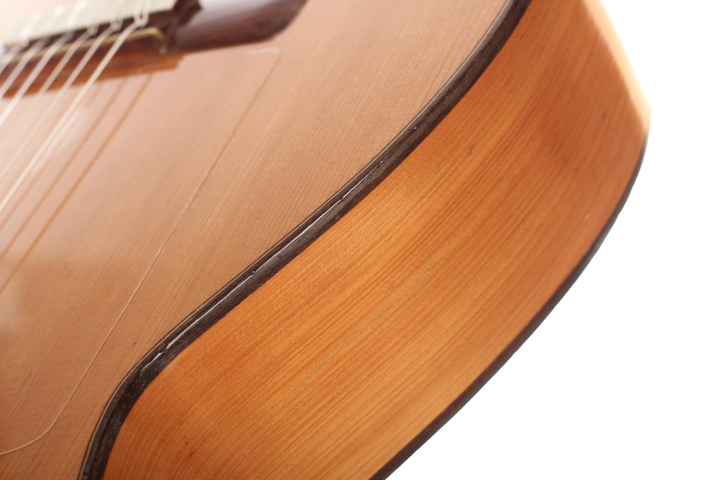 This very light flamenco guitar was built in 1935 in Madrid by José Ramirez II. It has a spruce top and Spanish cypress back and sides. It is a very responsive small bodied instrument with a direct response and playful colours. The tuning pegs are very good, the guitar is easy to tune and light to handle. This is a very special guitar with a bright, silvery and voluminous tone. The guitar is in overall very good condition for its age. A hard-shell case is included.