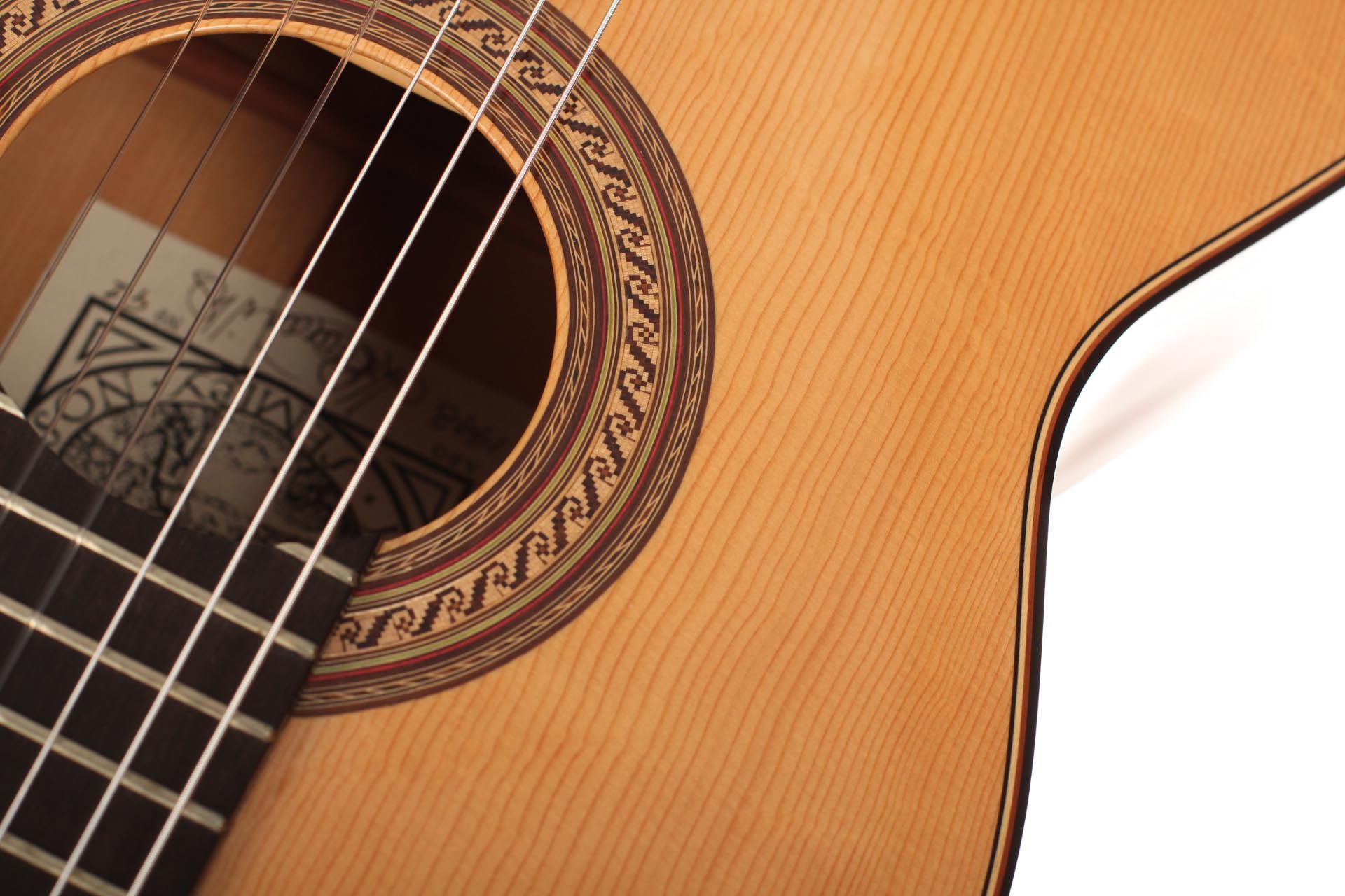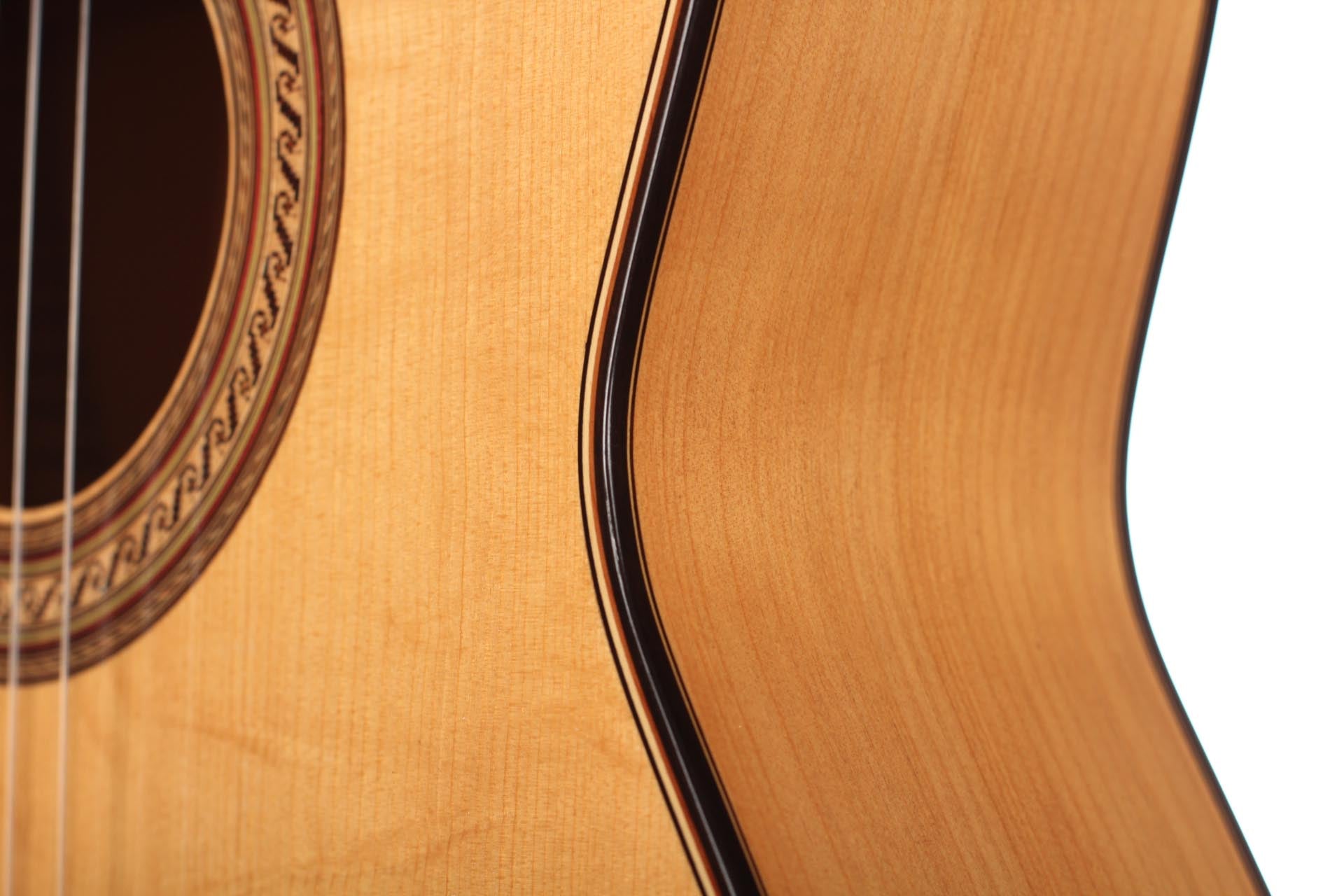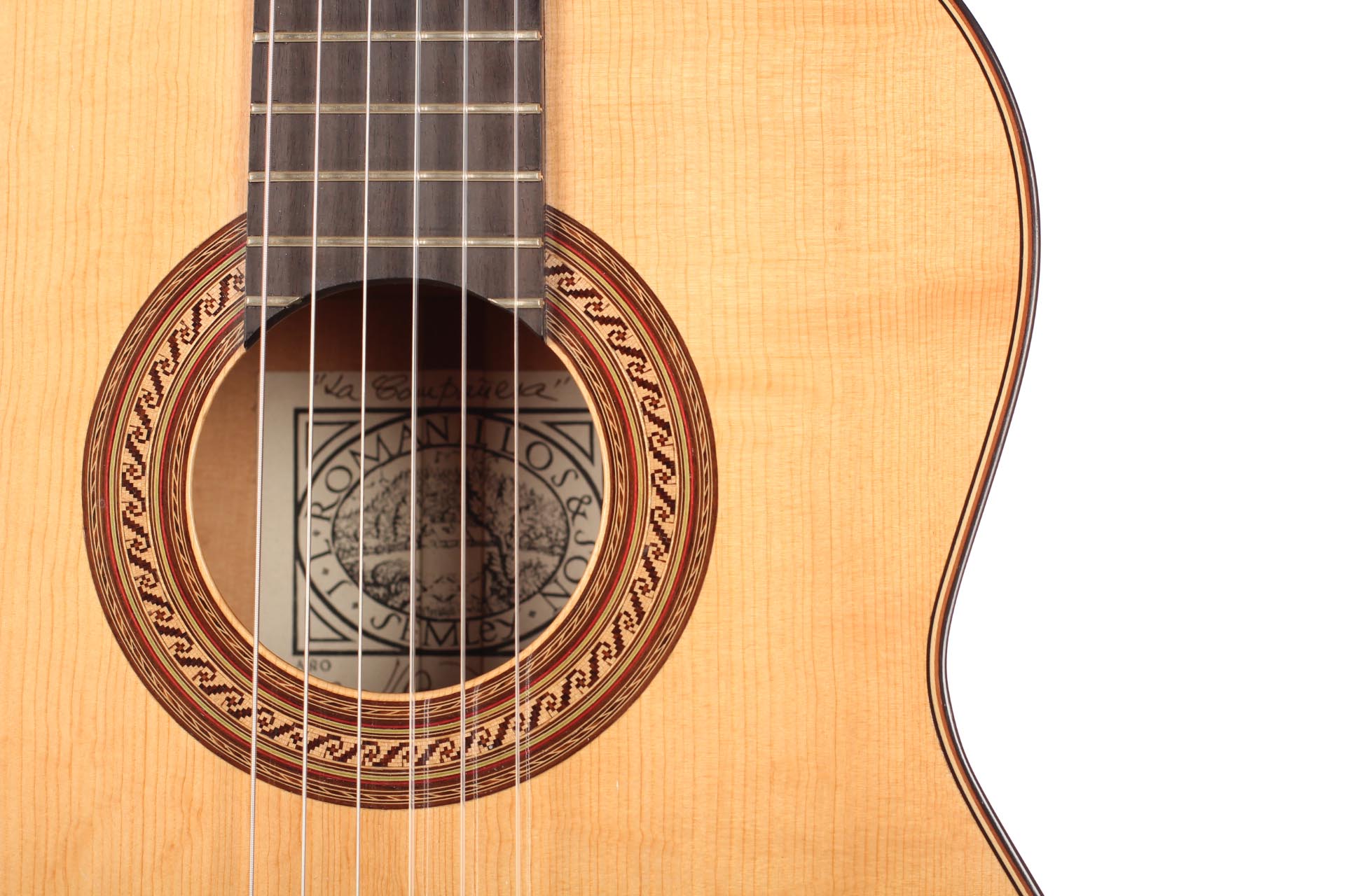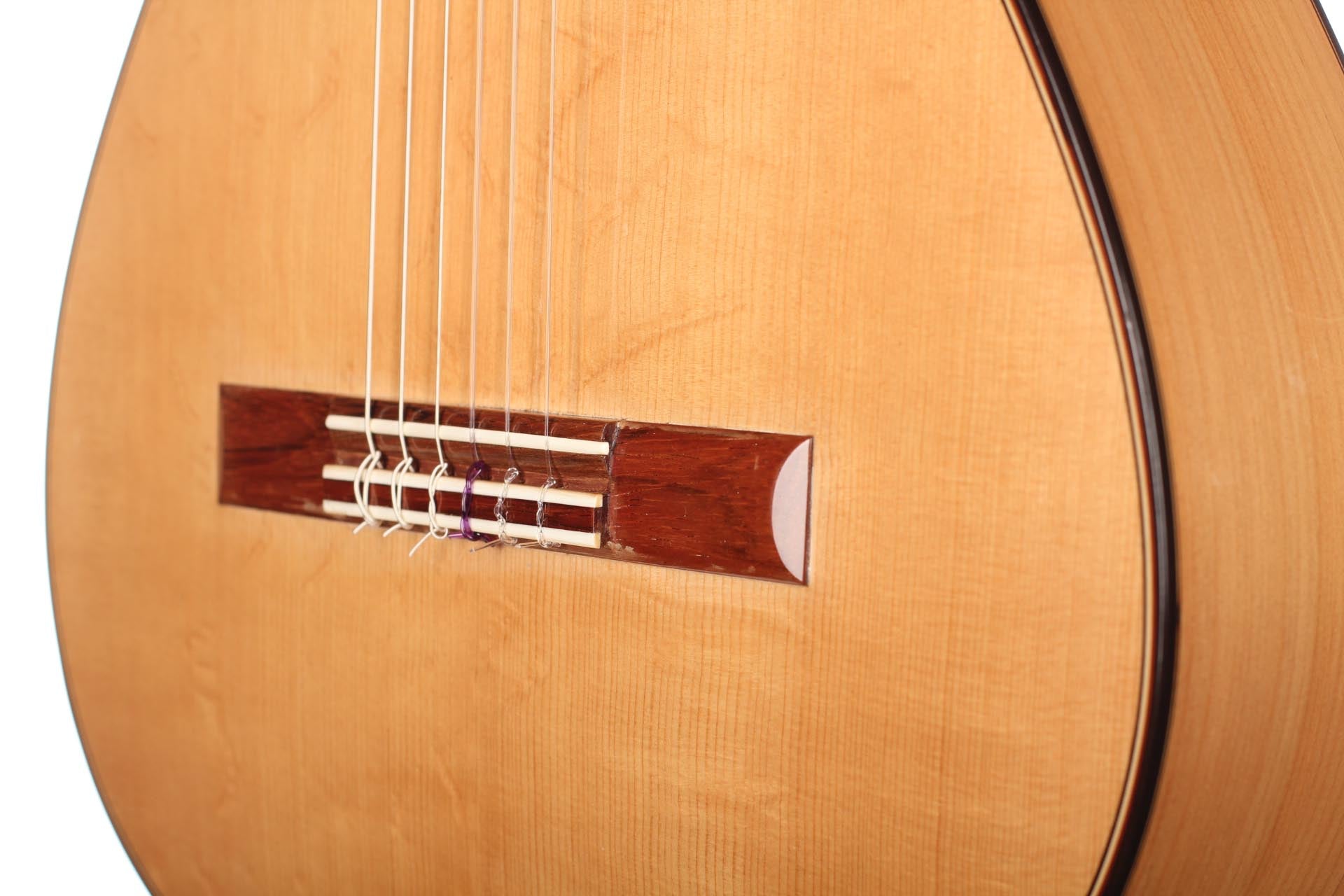 This guitar, named “La Compañera”, was built in 1993 by José Luis Romanillos and is wearing the number 91. It was made for Pepe Romero which is documented in pencil in the inside of the top. The guitar’s fine spruce top is featuring extensive “Bear claws”. Back and sides are made of thoroughly selected cypress and the guitar is in almost perfect condition. It is has no cracks nor repairs and has its original French polish finish. This instrument has an incredibly rich and delicate sound. It opens endless colours and expression possibilities that emphasize musical dynamics. It is really a guitar to play thoroughly and take the time to discover. The cypress back and sides give a great spontaneity to the top’s response. The long and clear sustain of the singing first string is an undeniable proof of the immense skills, craftmanship and wood knowledge of Romanillos. We are absolutely delighted and honoured to offer this prodigious masterpiece in our showroom and are sure that any guitarist would be seduced from the first note on.