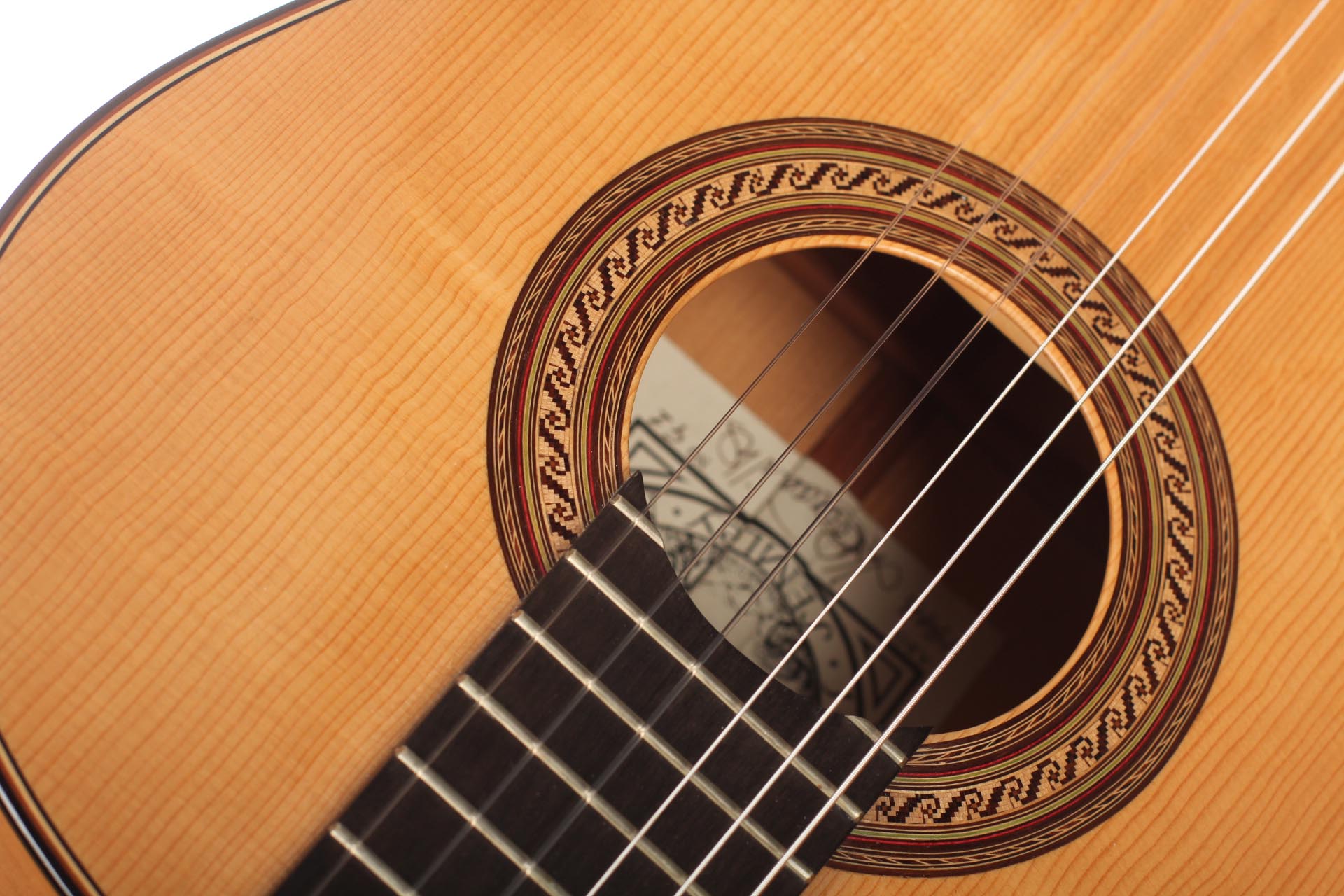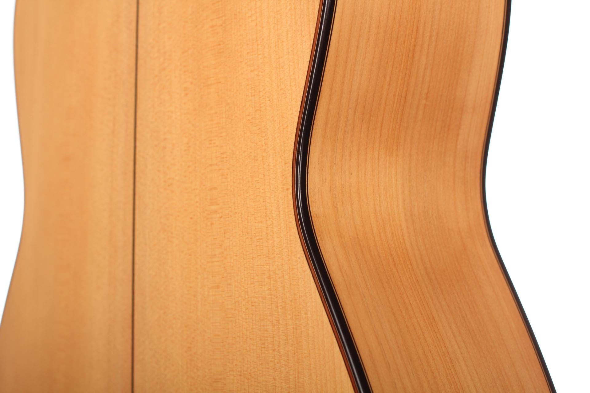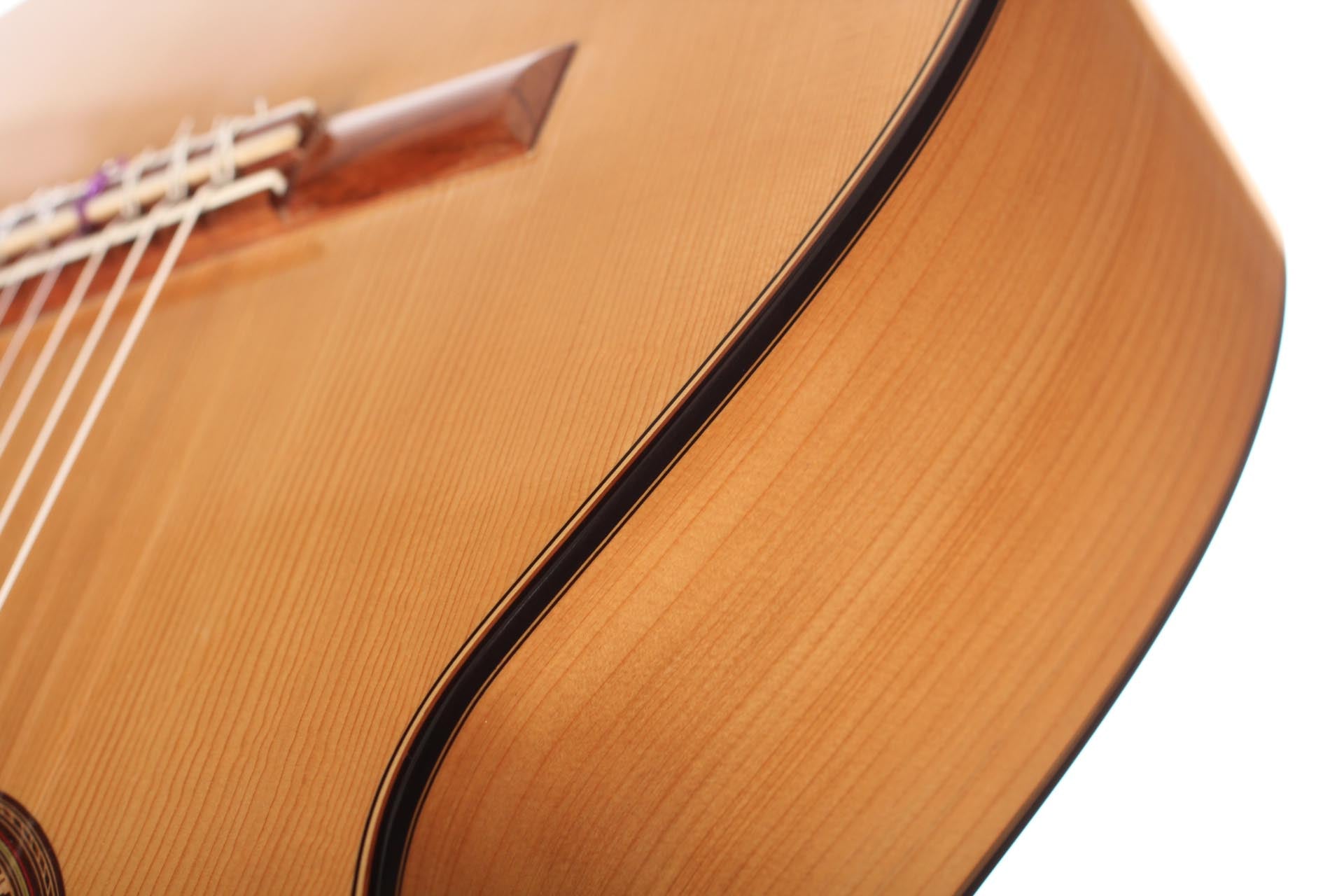 This guitar, named “La Compañera”, was built in 1993 by José Luis Romanillos and is wearing the number 91. It was made for Pepe Romero which is documented in pencil in the inside of the top. The guitar’s fine spruce top is featuring extensive “Bear claws”. Back and sides are made of thoroughly selected cypress and the guitar is in almost perfect condition. It is has no cracks nor repairs and has its original French polish finish. This instrument has an incredibly rich and delicate sound. It opens endless colours and expression possibilities that emphasize musical dynamics. It is really a guitar to play thoroughly and take the time to discover. The cypress back and sides give a great spontaneity to the top’s response. The long and clear sustain of the singing first string is an undeniable proof of the immense skills, craftmanship and wood knowledge of Romanillos. We are absolutely delighted and honoured to offer this prodigious masterpiece in our showroom and are sure that any guitarist would be seduced from the first note on.